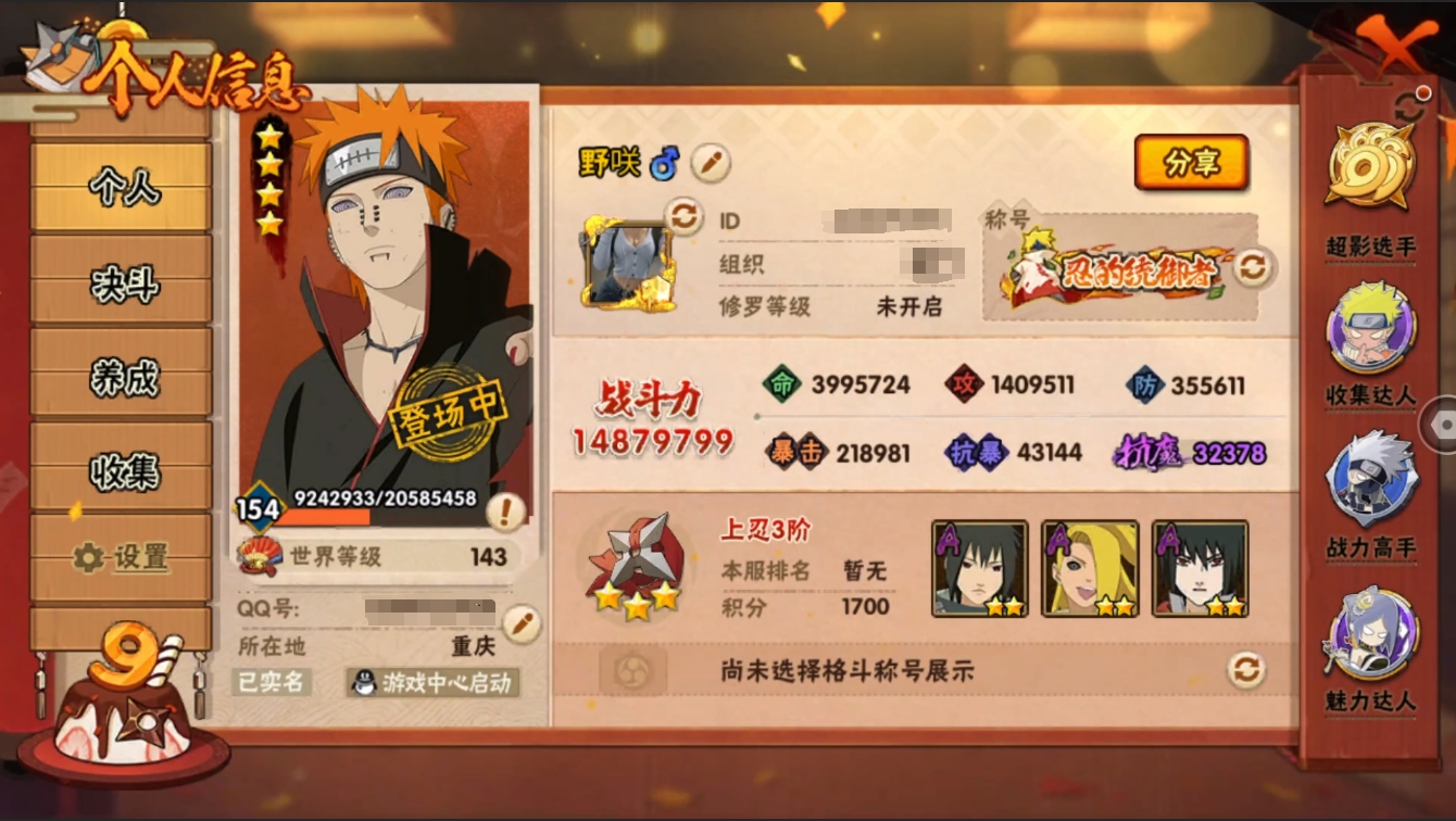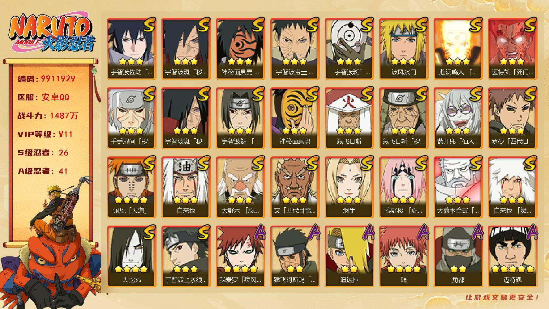 [14497835]【编号25438可秒换绑】【店长推荐捡漏号】26s级忍者数-41a级忍者数 【s级忍者】:猿飞日斩「秽土转生」3星,千手扉间「秽土转生」3星,宇智波斑「秽土转生」3星,宇智波斑「秽土转生·解」3星,大野木「忍界大战」3星,春野樱「忍界大战」3星,宇智波带土「忍界大战」3星,宇智波鼬「须佐能乎」3星,宇智波止水「须佐能乎」3星,艾「四代目雷影」3星,罗砂「四代目风影」3星,自来也3星,自来也「舞之豪杰」3星,大蛇丸4星,纲手3星,猿飞日斩3星,波风水门3星,药师兜「仙人模式」3星,神秘面具男3星,神秘面具男「红夜之刃」3星,漩涡鸣人「九喇嘛连结」3星,迈特凯「死门」3星,佩恩「天道」4星,宇智波佐助「永恒万花筒」3星,宇智波斑 「白面具」3星宇智波斑「白面具」,大筒木金式3星 【a级忍者】:艾「青年」2星,长门「青年」2星,波风水门「青年」2星,达鲁伊「博人传」2星,迪达拉2星,迪达拉「秽土转生」2星,大蛇丸「晓」2星,奇拉比2星,奇拉比「忍界大战」2星,飞段3星,飞段「死司凭血」4星,干柿鬼鲛5星,漩涡博人「桃式显现」2星,漩涡鸣人「仙人模式」2星,漩涡鸣人「九尾查克拉」2星,迈特凯5星,旗木卡卡西「万花筒写轮眼」2星,我爱罗「疾风传」4星,我爱罗「忍界大战」2星,蝎4星,小南2星,小南「漂泊浪客」2星,角都2星,猿飞阿斯玛5星,猿飞阿斯玛「秽土转生」2星,宇智波止水2星,宇智波鼬2星,宇智波佐助「须佐能乎」2星,宇智波佐助「万花筒写轮眼」2星,药师兜「半蛇斗篷」2星,照美冥「五代目水影」2星,日向宁次「忍界大战」2星,日向雏田「最终章」2星,长十郎「六代目水影」2星,佩恩·六道「漂泊浪客」2星,猿飞木叶丸「博人传」2星,春野樱「百豪」2星,秋道丁次「忍界大战」2星,千代「近松十人卫」2星,不缘2星,宇智波泉奈2星
