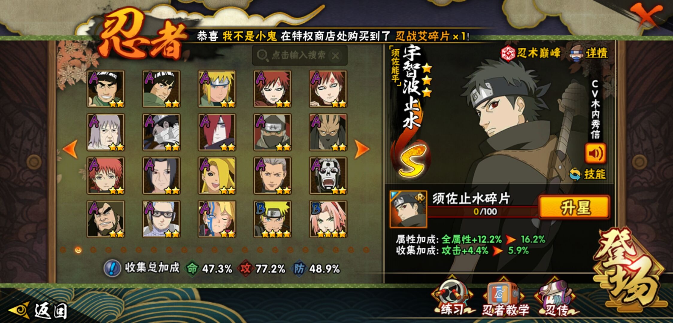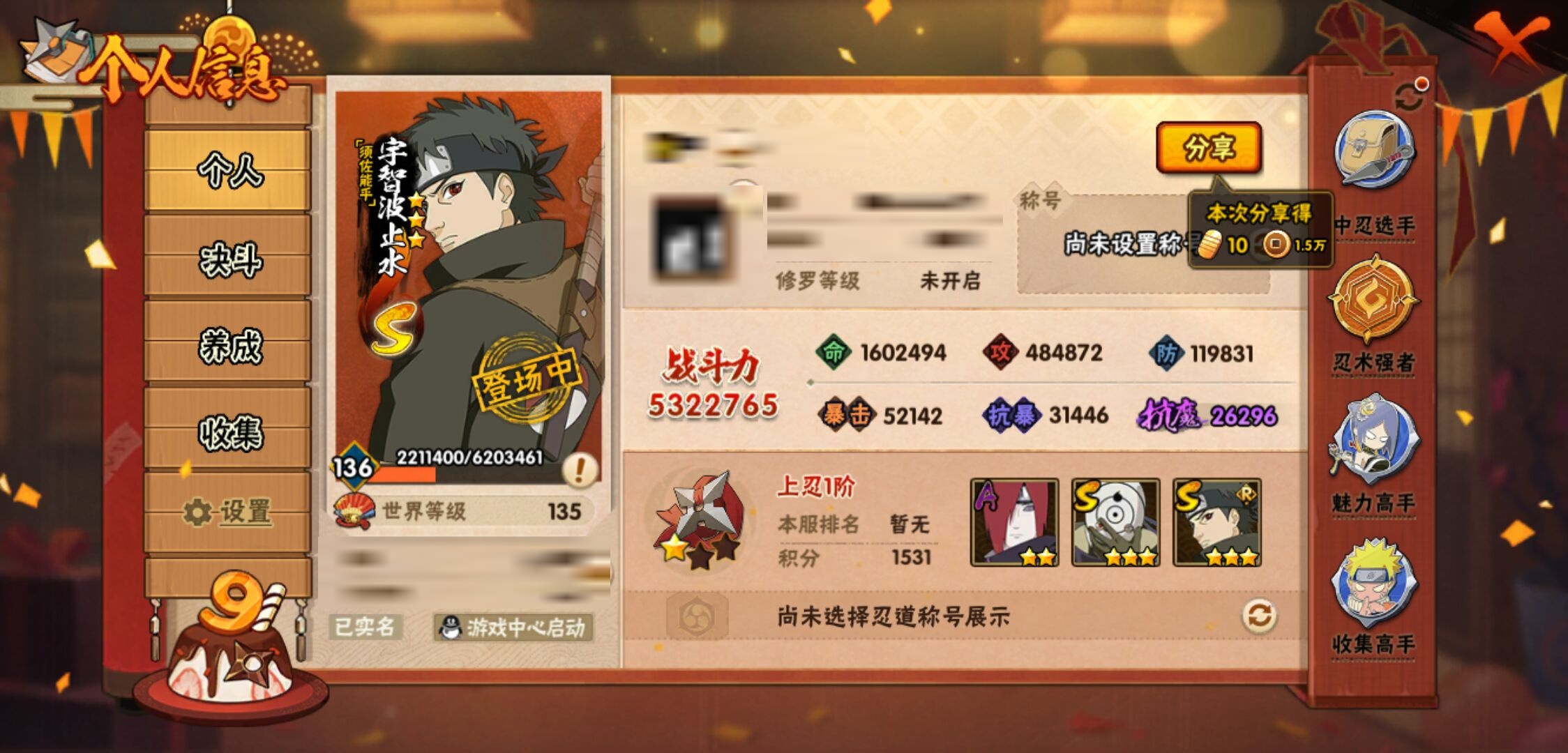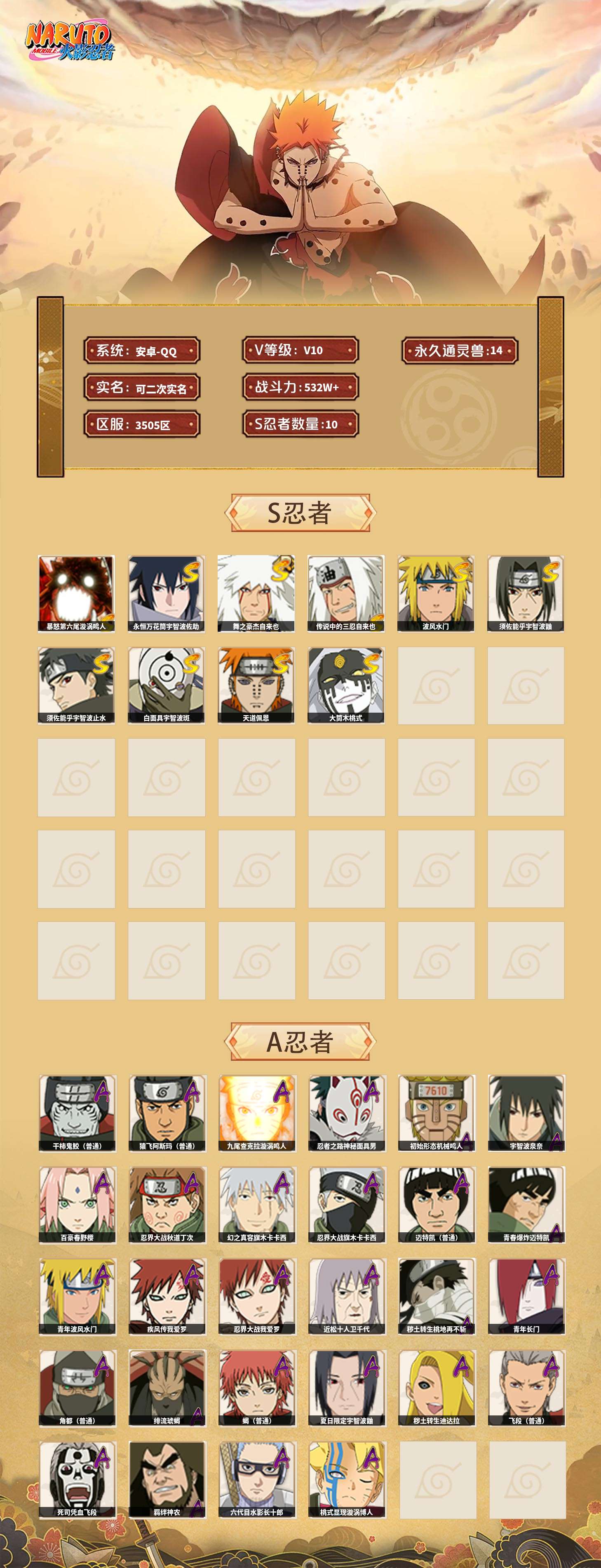 【火影忍者】【lyhy9188】战斗力:532w;段位:上忍1阶;本服排名:1825;vip:v10级;s忍:10个;a忍:28个;通灵兽:14个,s忍:暴怒第六尾漩涡鸣人|永恒万花筒宇智波佐助|舞之豪杰自来也|传说中的三忍自来也|波风水门|须佐能乎宇智波鼬|须佐能乎宇智波止水|白面具宇智波斑|天道佩恩|大筒木桃式__a忍:干柿鬼鲛(普通) 4星|猿飞阿斯玛(普通) 3星|忍者之路神秘面具男|初始形态机械鸣人|九尾查克拉漩涡鸣人 3星|宇智波泉奈|百豪春野樱|忍界大战秋道丁次|幻之真容旗木卡卡西|忍界大战旗木卡卡西|迈特凯(普通)|青春爆炸迈特凯|青年波风水门|疾风传我爱罗|忍界大战我爱罗|近松十人卫千代|秽土转生桃地再不斩|青年长门|角都(普通)|绯流琥蝎|蝎(普通)|夏日限定宇智波鼬|秽土转生迪达拉|飞段(普通)|死司凭血飞段|羁绊神农|六代目水影长十郎|桃式显现漩涡博人__通灵兽:忍犬(普通)|蓝蛇|蛤蟆吉|忍龟|镰鼬|砂之守鹤|猿魔|山椒鱼|蛞蝓(普通)|蜃|蛤蟆仙人|鲛鲨|蛤蟆健|乌鸦(普通)