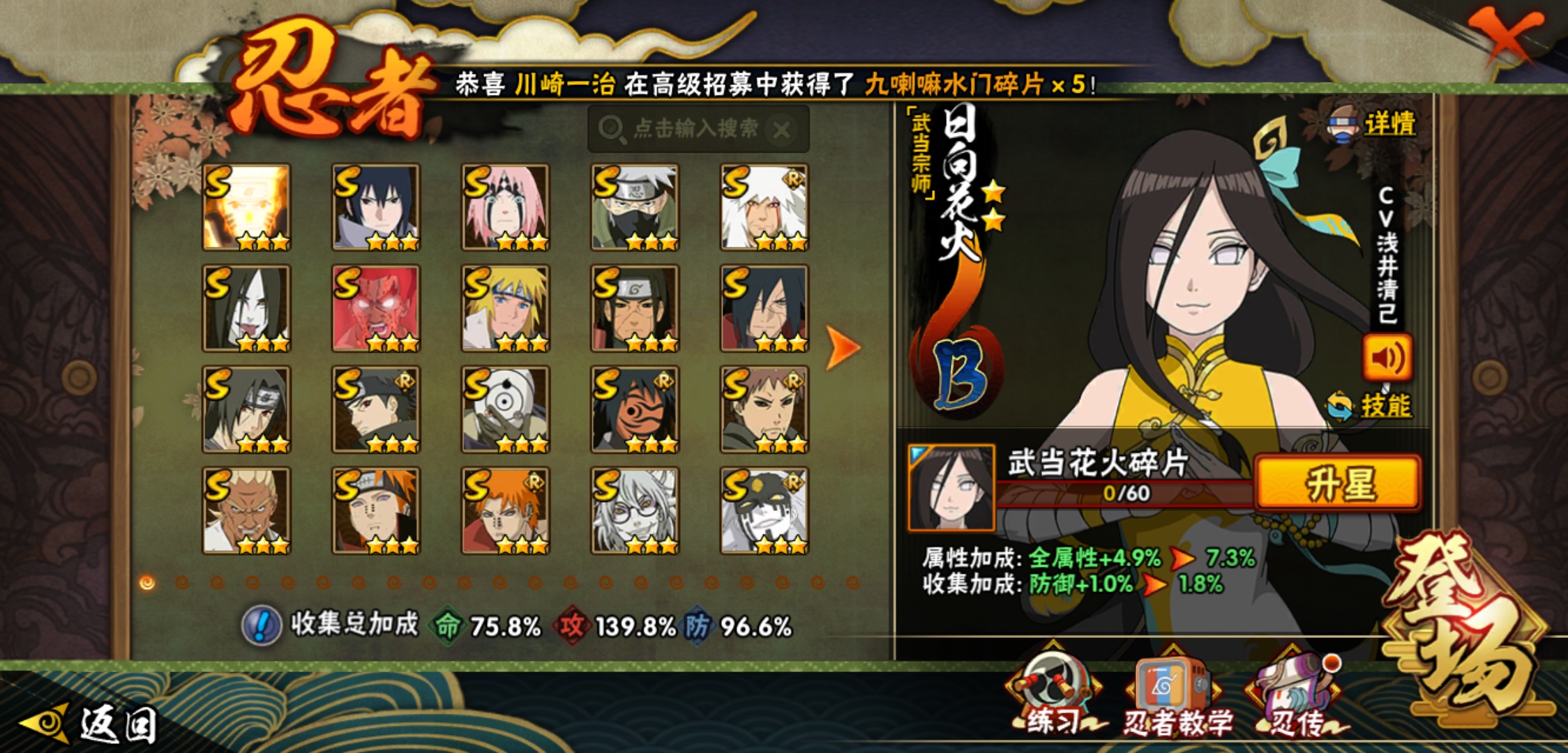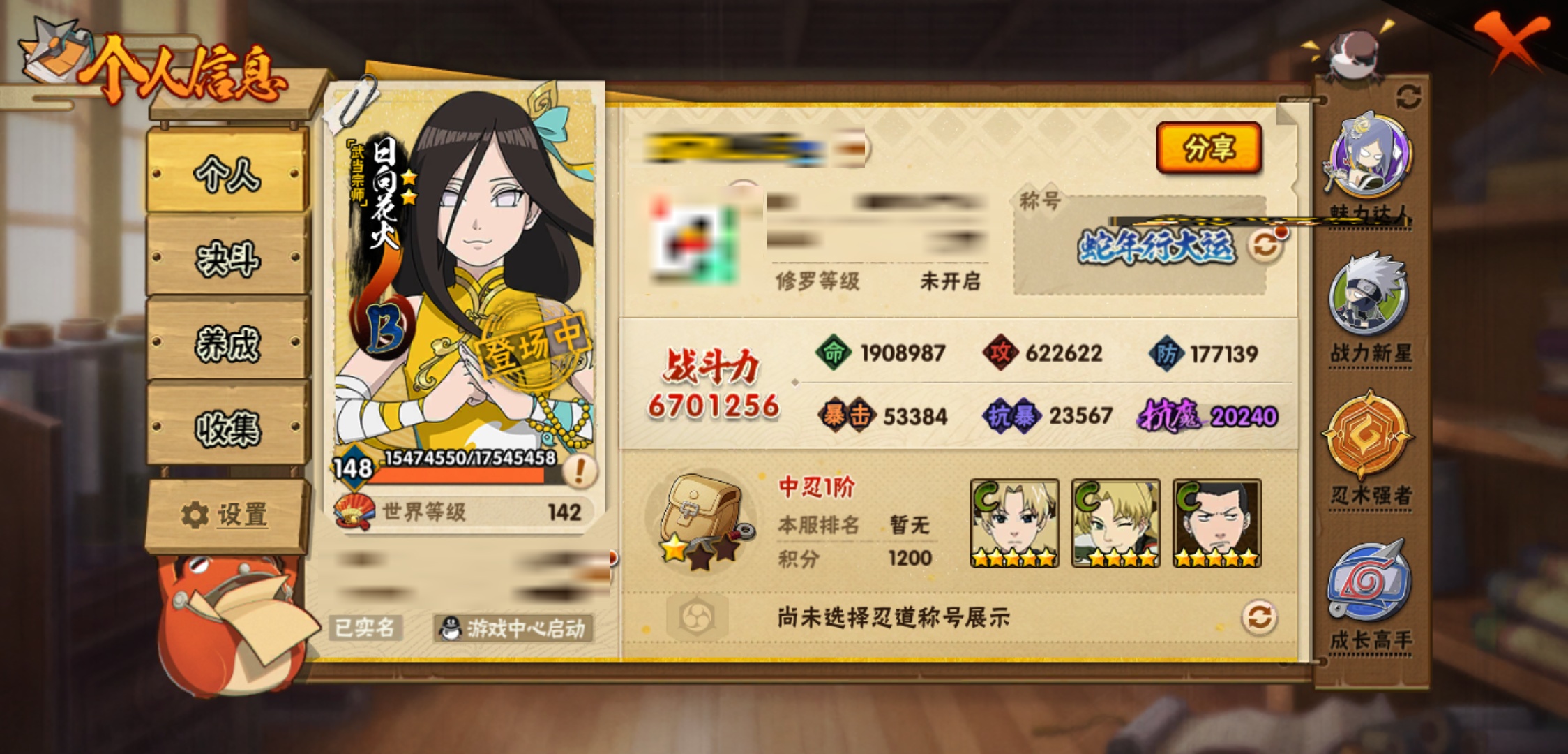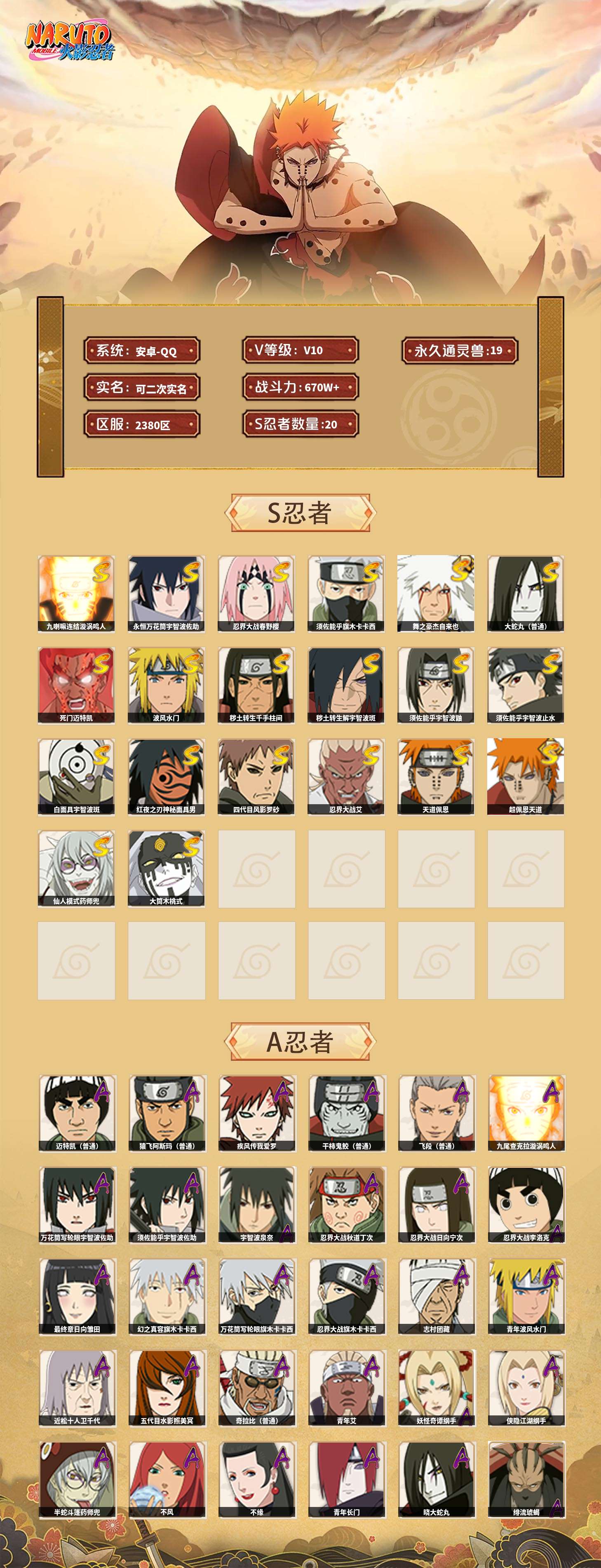 【火影忍者】【lyhy9067】战斗力:670w;段位:中忍1阶;本服排名:1251;vip:v10级;s忍:20个;a忍:39个;通灵兽:19个,s忍:九喇嘛连结漩涡鸣人|永恒万花筒宇智波佐助|忍界大战春野樱|须佐能乎旗木卡卡西|舞之豪杰自来也|大蛇丸(普通)|死门迈特凯|波风水门|秽土转生千手柱间|秽土转生解宇智波斑|须佐能乎宇智波鼬|须佐能乎宇智波止水|白面具宇智波斑|红夜之刃神秘面具男|四代目风影罗砂|忍界大战艾|天道佩恩|超佩恩天道|仙人模式药师兜|大筒木桃式__a忍:迈特凯(普通) 5星|猿飞阿斯玛(普通) 5星|疾风传我爱罗 4星|干柿鬼鲛(普通) 4星|飞段(普通) 3星|九尾查克拉漩涡鸣人|万花筒写轮眼宇智波佐助|须佐能乎宇智波佐助|宇智波泉奈|忍界大战秋道丁次|忍界大战日向宁次|忍界大战李洛克|最终章日向雏田|幻之真容旗木卡卡西|万花筒写轮眼旗木卡卡西|忍界大战旗木卡卡西|志村团藏|青年波风水门|近松十人卫千代|五代目水影照美冥|奇拉比(普通)|青年艾|妖怪奇谭纲手|侠隐江湖纲手|半蛇斗篷药师兜|不风|不缘|青年长门|晓大蛇丸|绯流琥蝎|蝎(普通)|宇智波鼬(普通)|迪达拉(普通)|秽土转生迪达拉|死司凭血飞段|桃式显现漩涡博人|五代目雷影达鲁伊|六代目水影长十郎|四代目土影黑土__通灵兽:忍犬(普通)|蓝蛇|砂之守鹤|蛤蟆吉|忍龟|镰鼬|猿魔|山椒鱼|蛞蝓(普通)|蜃|蛤蟆仙人|鲛鲨|蛤蟆健|乌鸦(普通)|蛤蟆龙|蛤蟆广|蛞蝓侠隐江湖|梦貘|鹰