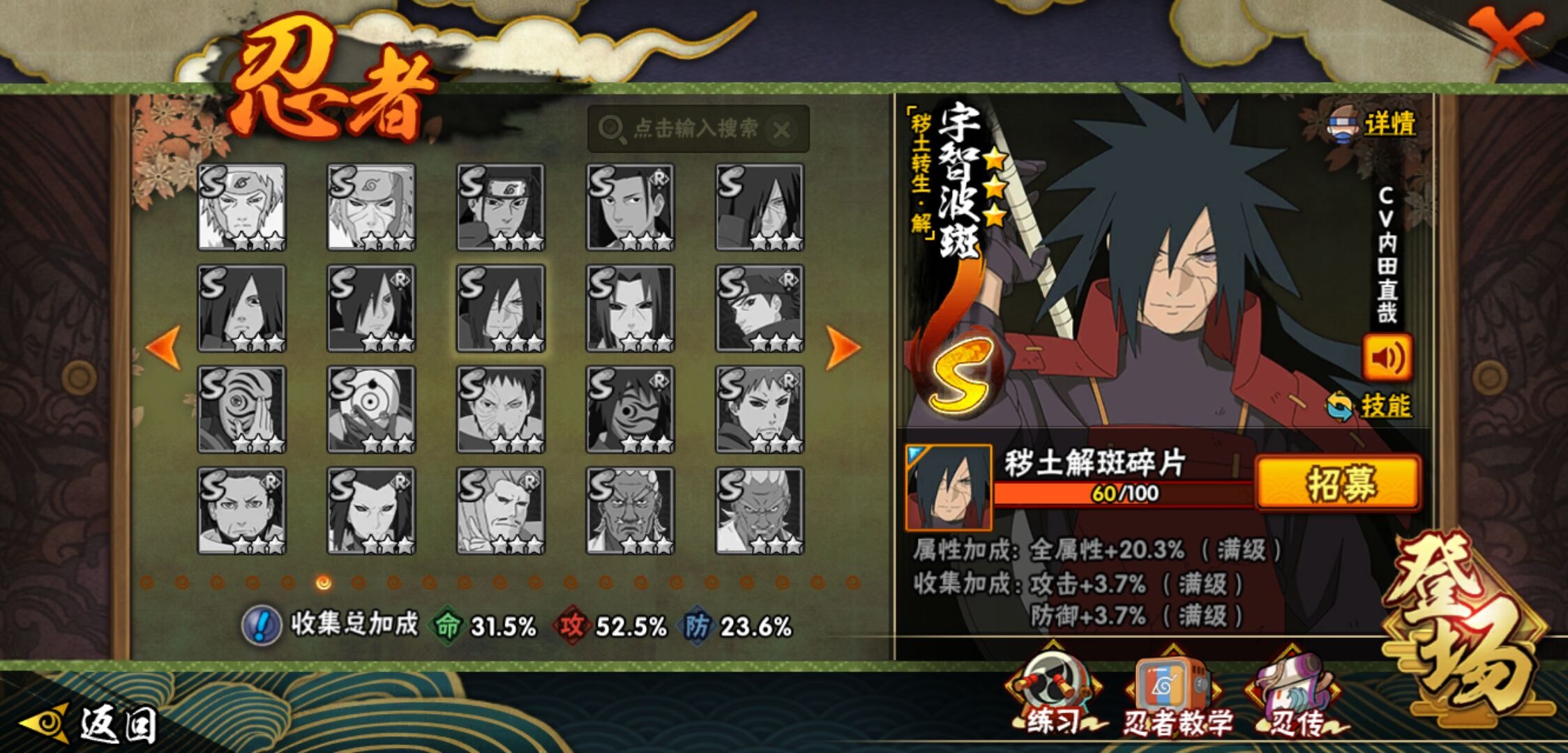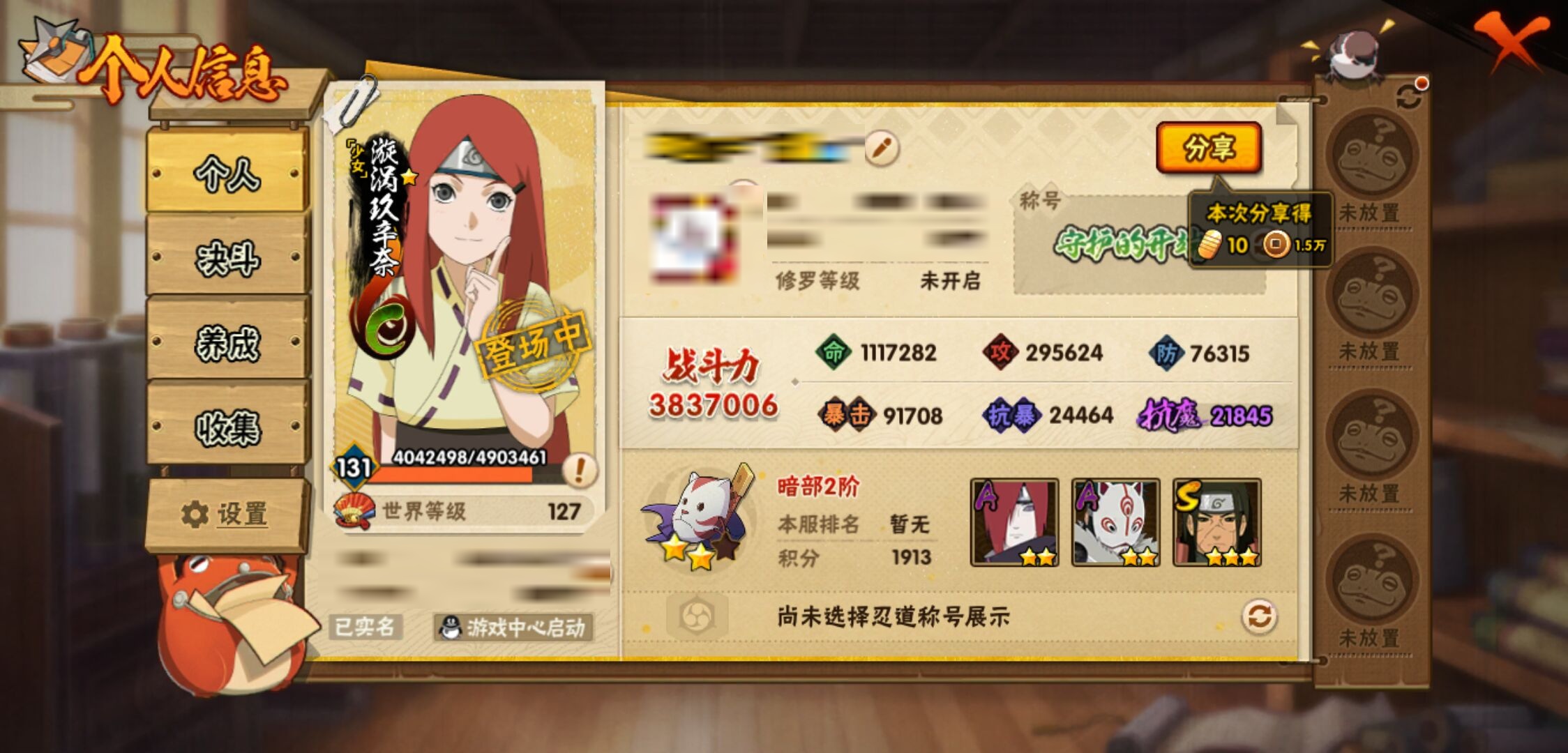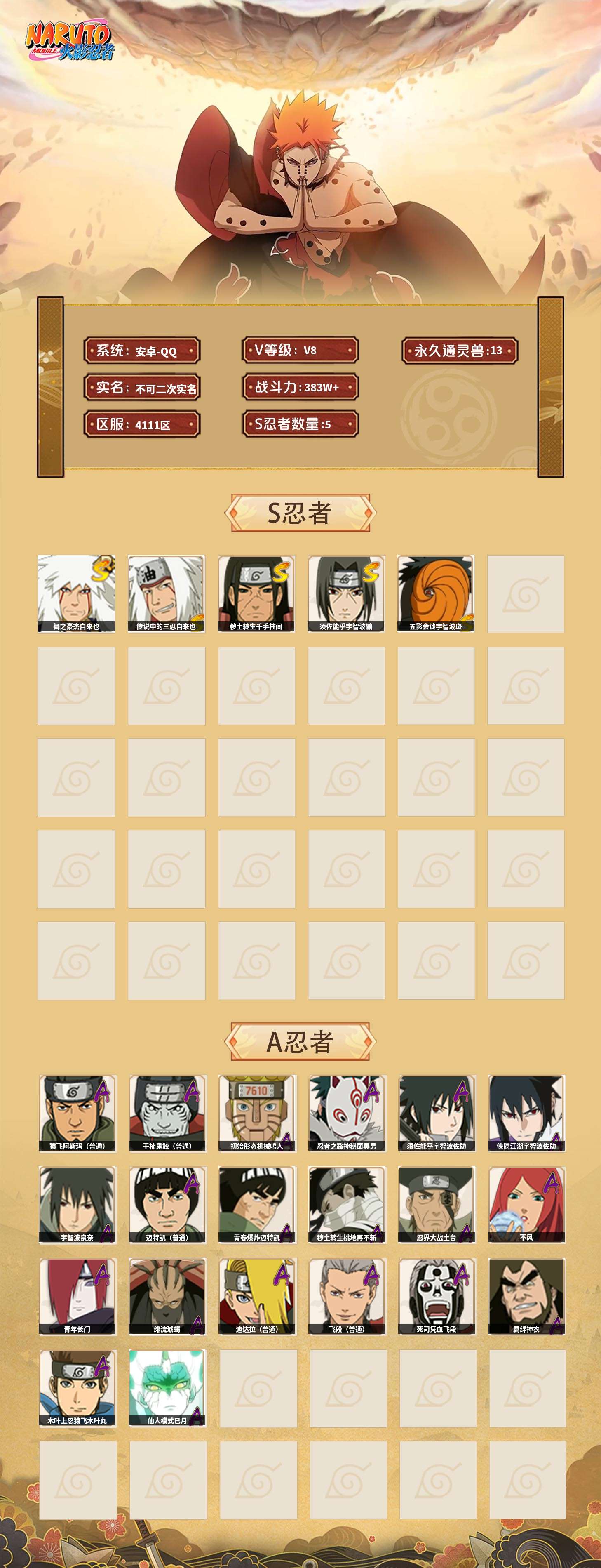 【火影忍者】【lyhy9212】战斗力:383w;段位:暗部2阶;本服排名:115;vip:v8级;s忍:5个;a忍:20个;通灵兽:13个,s忍:舞之豪杰自来也|传说中的三忍自来也|秽土转生千手柱间|须佐能乎宇智波鼬|五影会谈宇智波斑__a忍:猿飞阿斯玛(普通) 3星|干柿鬼鲛(普通) 3星|初始形态机械鸣人|忍者之路神秘面具男|须佐能乎宇智波佐助|侠隐江湖宇智波佐助|宇智波泉奈|迈特凯(普通)|青春爆炸迈特凯|秽土转生桃地再不斩|忍界大战土台|不风|青年长门|绯流琥蝎|迪达拉(普通)|飞段(普通)|死司凭血飞段|羁绊神农|木叶上忍猿飞木叶丸|仙人模式巳月__通灵兽:忍犬(普通)|蓝蛇|蛤蟆吉|忍龟|砂之守鹤|镰鼬|猿魔|山椒鱼|蜃|蛤蟆仙人|鲛鲨|蛤蟆健|乌鸦(普通)