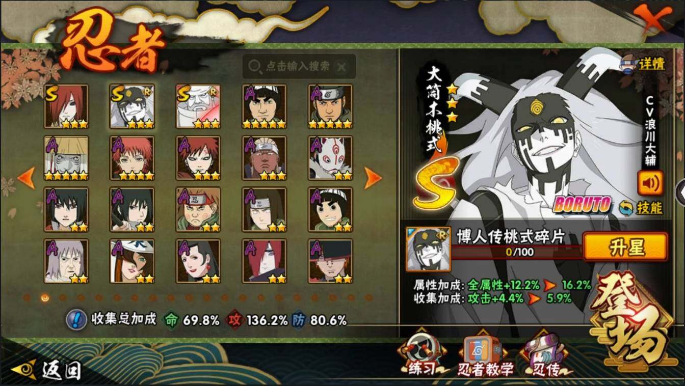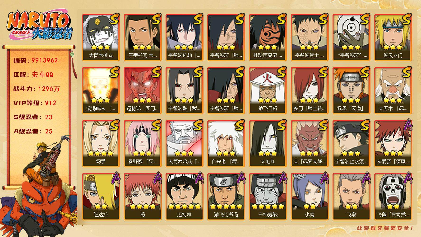 [14535799]【编号71894可秒换绑】【店长推荐捡漏号】23s级忍者数-25a级忍者数 【s级忍者】:长门「秽土转生」3星,宇智波鼬「秽土转生」3星,宇智波斑「秽土转生」3星,宇智波斑「秽土转生·解」3星,大野木「忍界大战」3星,春野樱「忍界大战」3星,宇智波带土「忍界大战」3星,艾「忍界大战」3星,宇智波止水「须佐能乎」3星,千手柱间「木叶创立」3星,自来也「舞之豪杰」3星,大蛇丸3星,纲手4星,猿飞日斩3星,波风水门3星,神秘面具男「红夜之刃」3星,漩涡鸣人「九喇嘛连结」3星,迈特凯「死门」3星,佩恩「天道」3星,宇智波佐助「永恒万花筒」3星,宇智波斑 「白面具」3星宇智波斑「白面具」,大筒木金式3星,大筒木桃式3星 【a级忍者】:艾「青年」3星,长门「青年」2星,迪达拉2星,飞段2星,飞段「死司凭血」2星,干柿鬼鲛5星,漩涡博人「桃式显现」2星,迈特凯5星,我爱罗「疾风传」3星,蝎4星,小南2星,小南「漂泊浪客」2星,猿飞阿斯玛5星,宇智波鼬2星,宇智波佐助「须佐能乎」2星,宇智波佐助「万花筒写轮眼」2星,照美冥「五代目水影」2星,日向宁次「忍界大战」2星,长十郎「六代目水影」2星,神秘面具男「忍者之路」2星,佩恩·六道「漂泊浪客」2星,李洛克「忍界大战」2星,秋道丁次「忍界大战」2星,千代「近松十人卫」2星,不缘2星