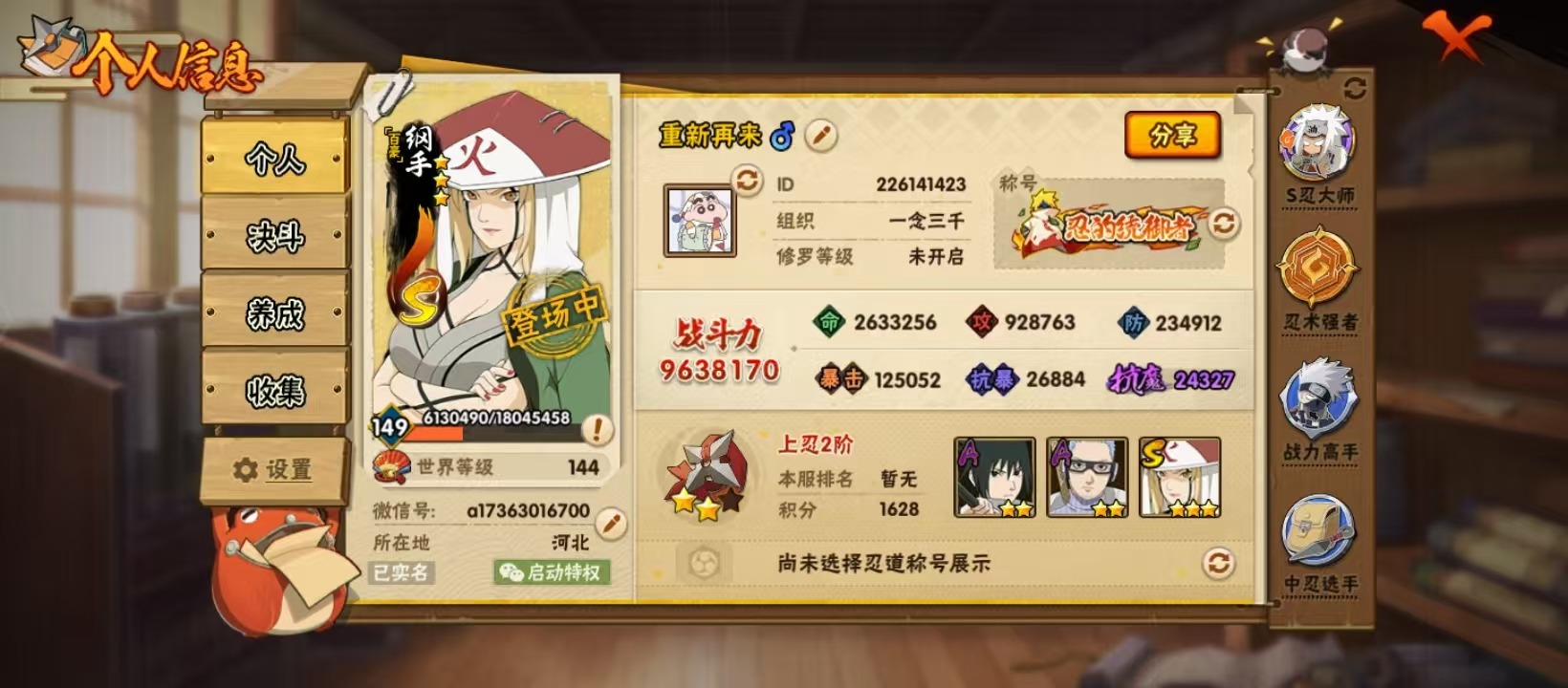[14537525]v12 24s忍 46a忍 18通灵 963.8w战力 可二次 可修改实名 【s级忍者】:宇智波斑「秽土转生·解」千手柱间·木叶创立宇智波佐助「永恒万花筒」神秘面具男 「红夜之刃」大筒木金式「博人传」漩涡鸣人 「九喇嘛连结」宇智波带土 「忍界大战」千手柱间「秽土转生」自来也 「舞之豪杰」旗木卡卡西「须佐能乎」宇智波鼬「秽土转生」佩恩·天道「超」宇智波斑「秽土转生」宇智波斑「白面具」纲手「百豪」波风水门「秽土转生」猿飞日斩「秽土转生」长门「秽土转生」鬼灯幻月「二代目水影」佩恩「天道」猿飞日斩波风水门大蛇丸纲手 【通灵兽】:熊猫