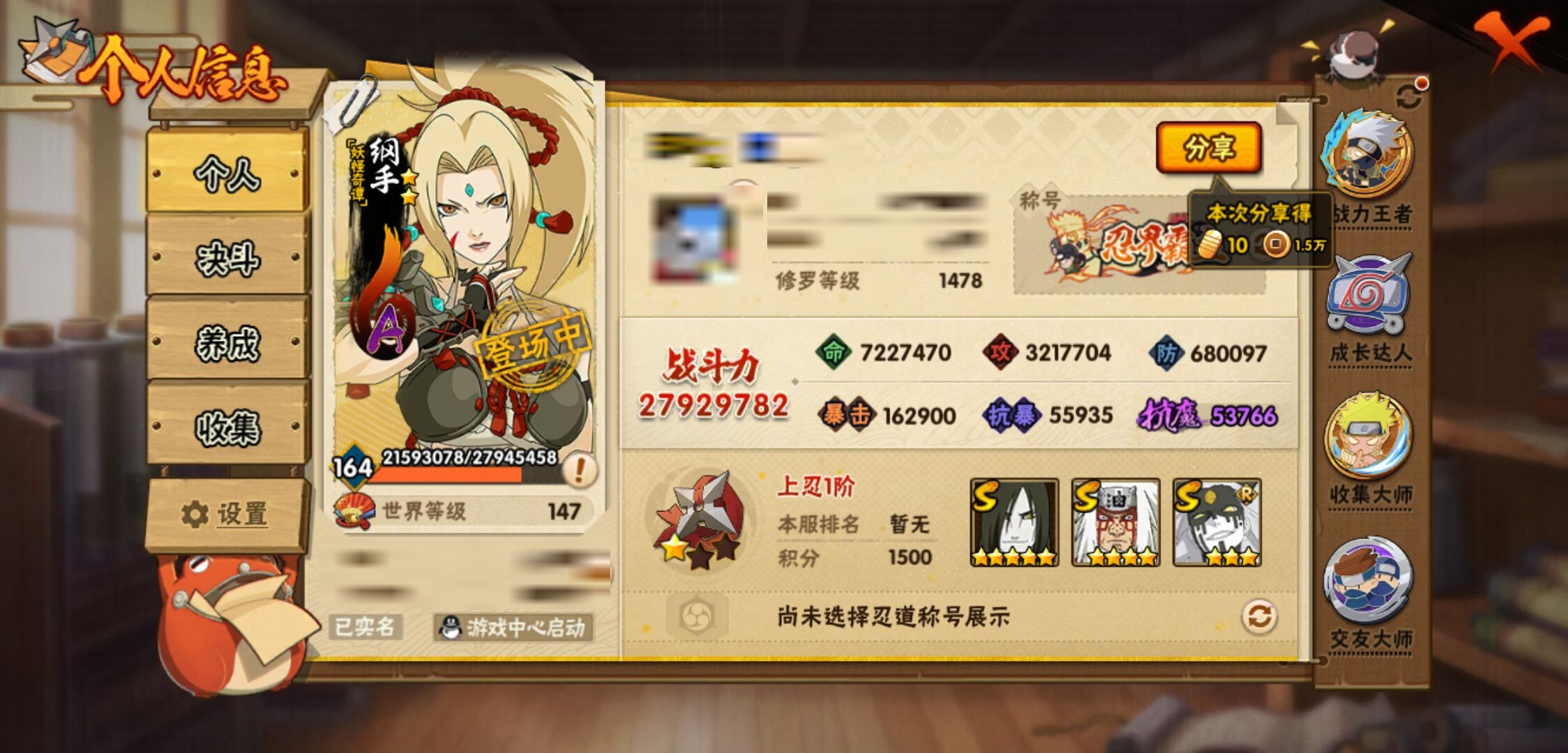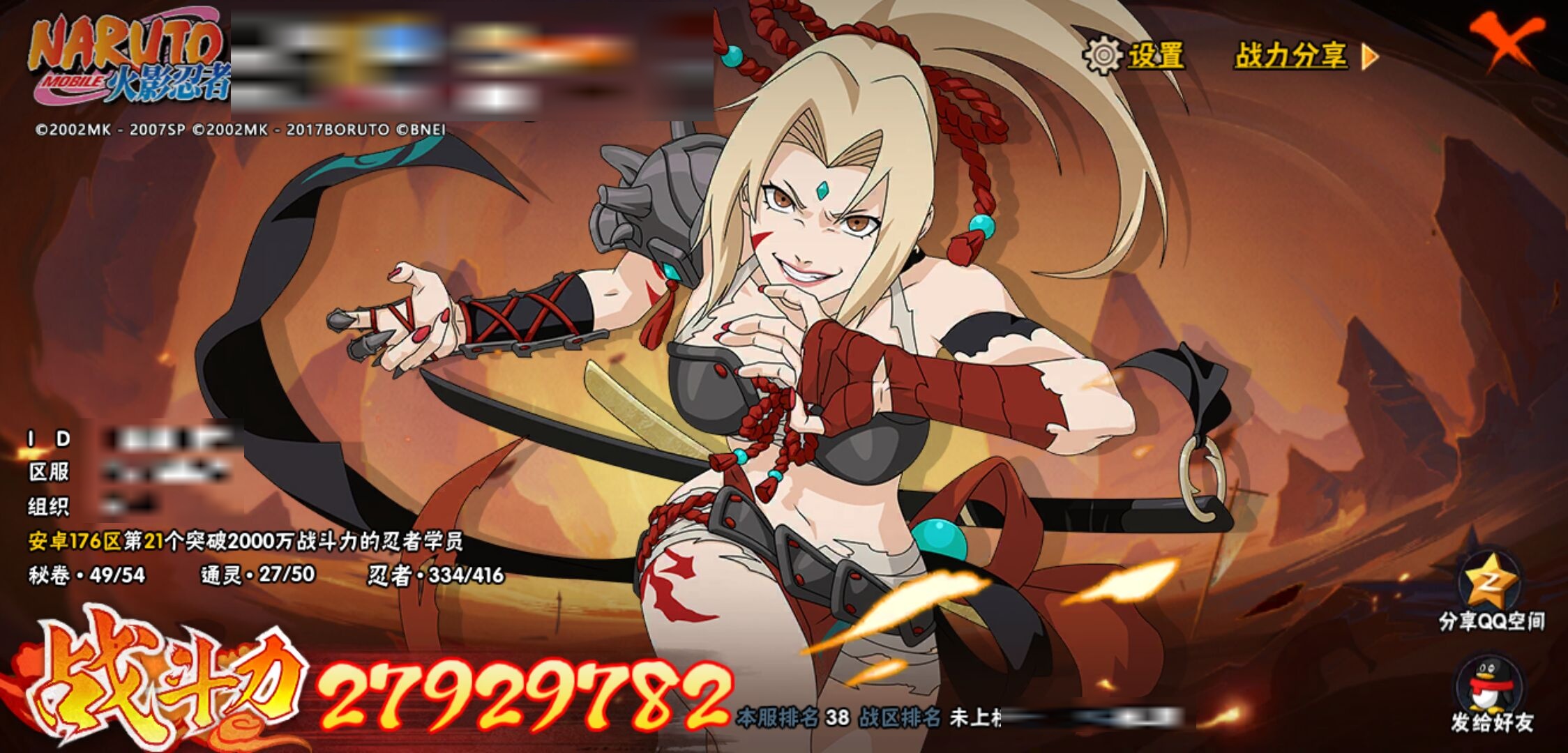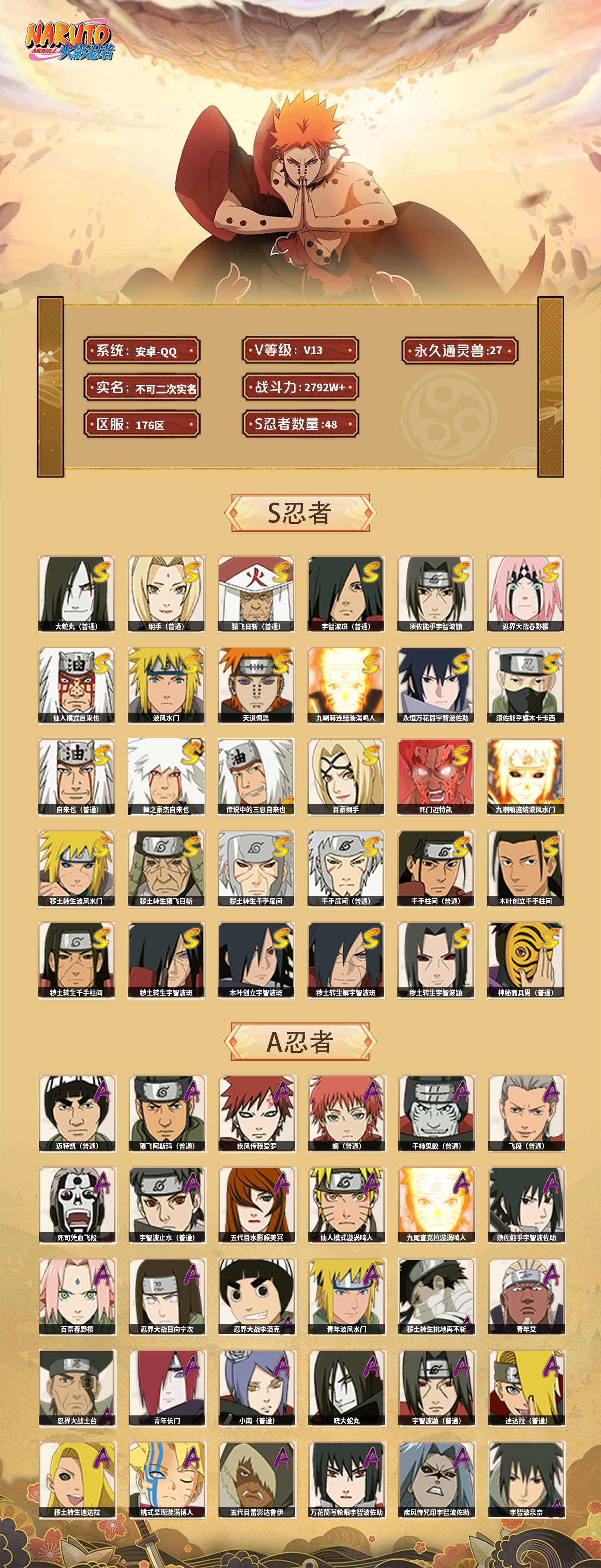 【火影忍者】【lyhy9251】战斗力:2792w;段位:上忍1阶;本服排名:38;vip:v13级;s忍:48个;a忍:66个;通灵兽:27个,s忍:大蛇丸(普通) 5星|纲手(普通) 5星|猿飞日斩(普通) 5星|宇智波斑(普通) 5星|须佐能乎宇智波鼬 5星|忍界大战春野樱 4星|仙人模式自来也 4星|波风水门 4星|天道佩恩 4星|九喇嘛连结漩涡鸣人|永恒万花筒宇智波佐助|须佐能乎旗木卡卡西|自来也(普通)|舞之豪杰自来也|传说中的三忍自来也|百豪纲手|死门迈特凯|九喇嘛连结波风水门|秽土转生波风水门|秽土转生猿飞日斩|秽土转生千手扉间|千手扉间(普通)|千手柱间(普通)|木叶创立千手柱间|秽土转生千手柱间|秽土转生宇智波斑|木叶创立宇智波斑|秽土转生解宇智波斑|秽土转生宇智波鼬|神秘面具男(普通)|白面具宇智波斑|忍界大战宇智波带土|红夜之刃神秘面具男|四代目风影罗砂|秽土转生三代目风影|四代目雷影艾|忍界大战艾|三代目雷影艾|秽土转生金角银角|三代目土影大野木|二代目土影无|秽土转生半藏|忍界大战大野木|超佩恩天道|秽土转生长门|仙人模式药师兜|大筒木桃式|博人传大筒木金式__a忍:迈特凯(普通) 5星|猿飞阿斯玛(普通) 5星|疾风传我爱罗 5星|蝎(普通) 5星|干柿鬼鲛(普通) 5星|飞段(普通) 5星|死司凭血飞段 5星|宇智波止水(普通) 4星|五代目水影照美冥 4星|仙人模式漩涡鸣人 3星|九尾查克拉漩涡鸣人 3星|须佐能乎宇智波佐助 3星|百豪春野樱 3星|忍界大战日向宁次 3星|忍界大战李洛克 3星|青年波风水门 3星|秽土转生桃地再不斩 3星|青年艾 3星|忍界大战土台 3星|青年长门 3星|小南(普通) 3星|晓大蛇丸 3星|宇智波鼬(普通) 3星|迪达拉(普通) 3星|秽土转生迪达拉 3星|桃式显现漩涡博人 3星|五代目雷影达鲁伊 3星|万花筒写轮眼宇智波佐助|疾风传咒印宇智波佐助|宇智波泉奈|忍界大战秋道丁次|最终章日向雏田|幻之真容旗木卡卡西|万花筒写轮眼旗木卡卡西|青春爆炸迈特凯|秽土转生猿飞阿斯玛|七夕限定猿飞阿斯玛|地陆|志村团藏|火影继承人猿飞日斩|新春限定波风水门|忍界大战我爱罗|近松十人卫千代|夏日泳装照美冥|侠隐江湖照美冥|漂泊武士桃地再不斩|桃地再不斩|忍界大战奇拉比|奇拉比(普通)|妖怪奇谭纲手|半蛇斗篷药师兜|不风|不缘|不动|新春限定小南|晓创生角都|角都(普通)|地怨虞角都|绯流琥蝎|新春限定宇智波鼬|暴怒宇智波带土|加藤断|侠隐江湖大野木|木叶上忍猿飞木叶丸|六代目水影长十郎|四代目土影黑土__通灵兽:忍犬(普通)|蓝蛇|蛤蟆吉|忍龟|镰鼬|猿魔|山椒鱼|蜃|蛞蝓(普通)|蛤蟆仙人|鲛鲨|蛤蟆健|乌鸦(普通)|蛤蟆龙|蛤蟆广|梦貘|鹰|蜘蛛|熊猫|二尾又旅|螃蟹|砂之守鹤|四尾孙悟空|怒鬼无臂|怒鬼(普通)|怒鬼爪|辛牙