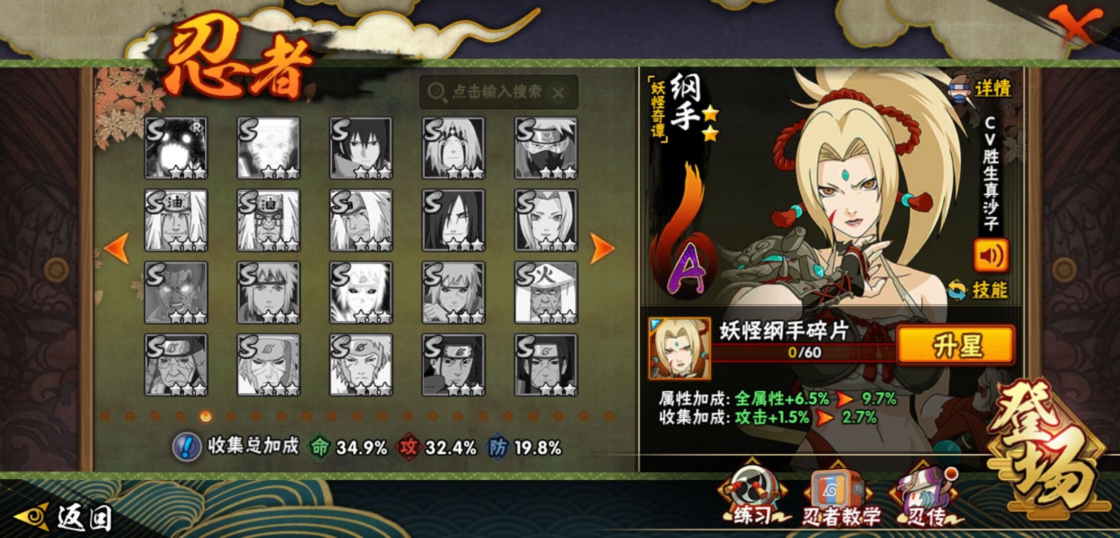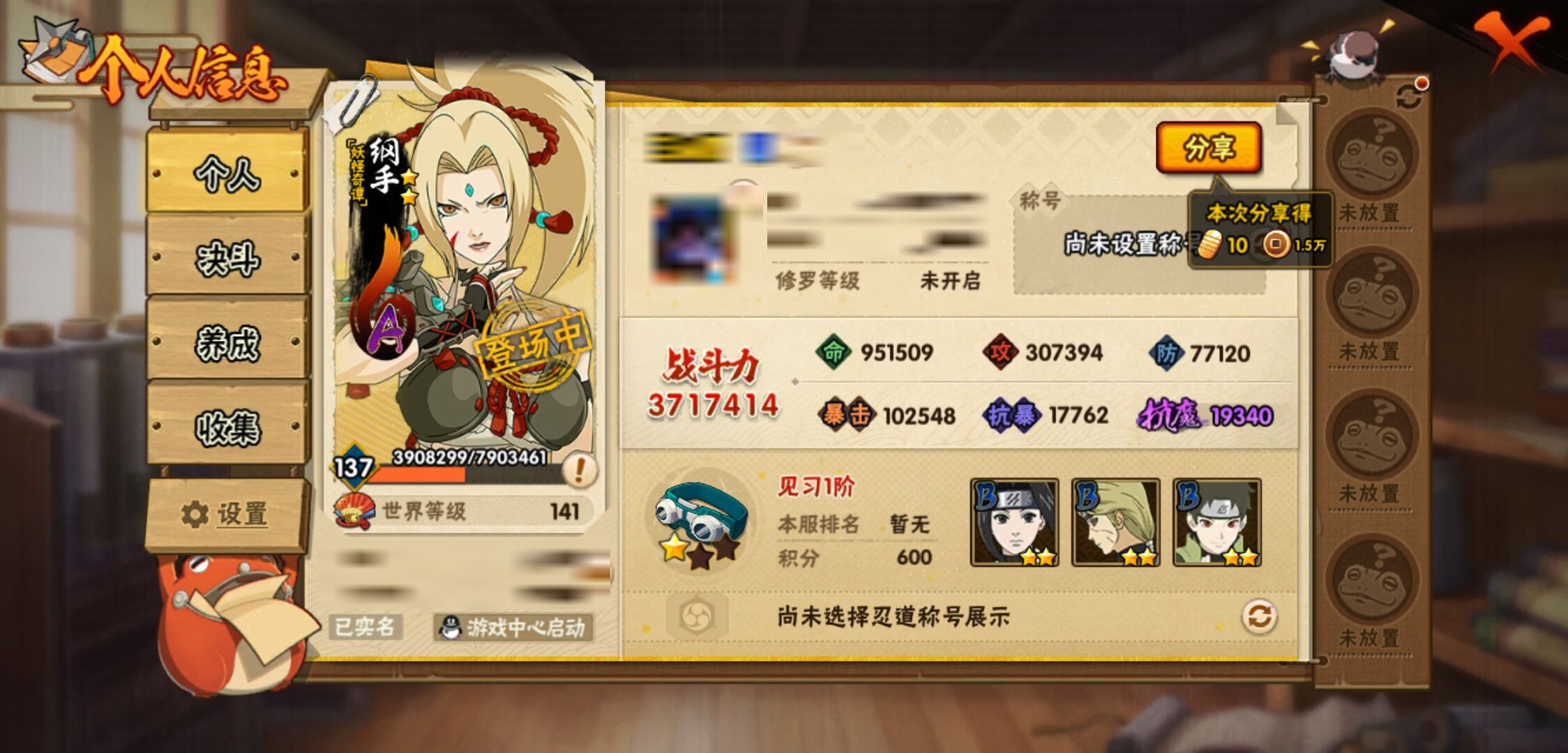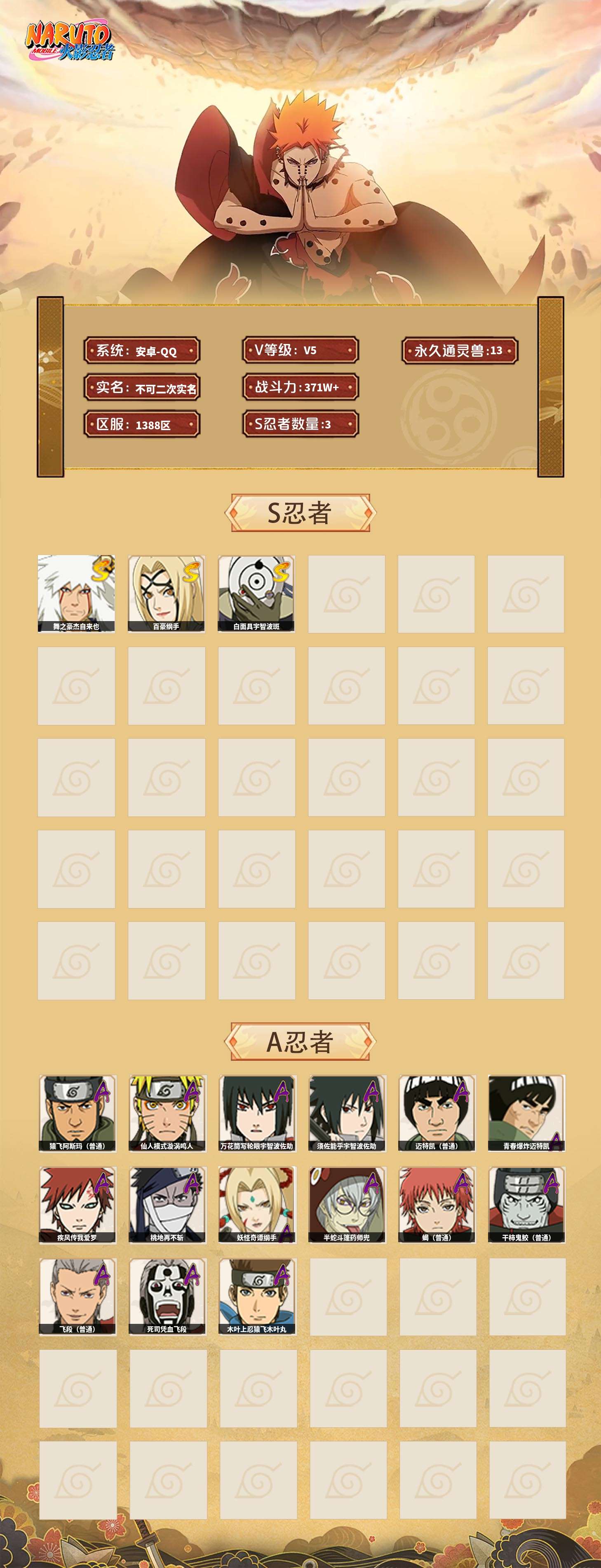 【火影忍者】【lyhy9241】战斗力:371w;段位:见习1阶;本服排名:1331;vip:v5级;s忍:3个;a忍:15个;通灵兽:13个,s忍:舞之豪杰自来也|百豪纲手|白面具宇智波斑__a忍:猿飞阿斯玛(普通) 3星|仙人模式漩涡鸣人|万花筒写轮眼宇智波佐助|须佐能乎宇智波佐助|迈特凯(普通)|青春爆炸迈特凯|疾风传我爱罗|桃地再不斩|妖怪奇谭纲手|半蛇斗篷药师兜|蝎(普通)|干柿鬼鲛(普通)|飞段(普通)|死司凭血飞段|木叶上忍猿飞木叶丸__通灵兽:忍犬(普通)|蓝蛇|蛤蟆吉|忍龟|镰鼬|猿魔|山椒鱼|蜃|蛤蟆仙人|鲛鲨|蛤蟆健|砂之守鹤|乌鸦(普通)