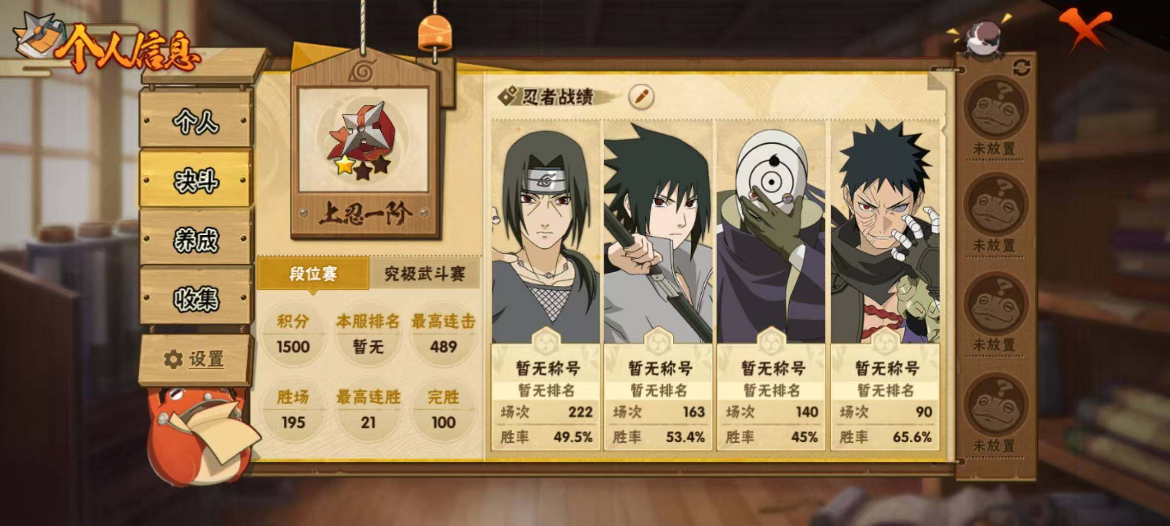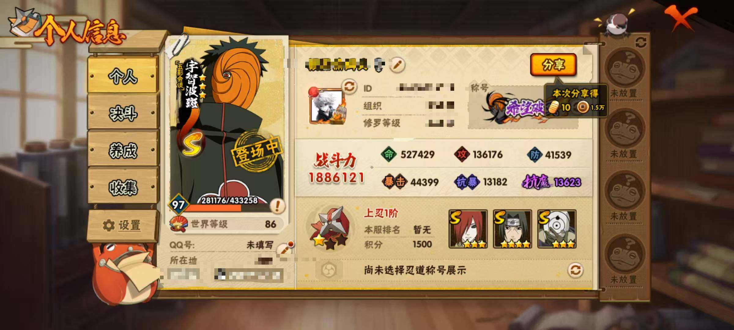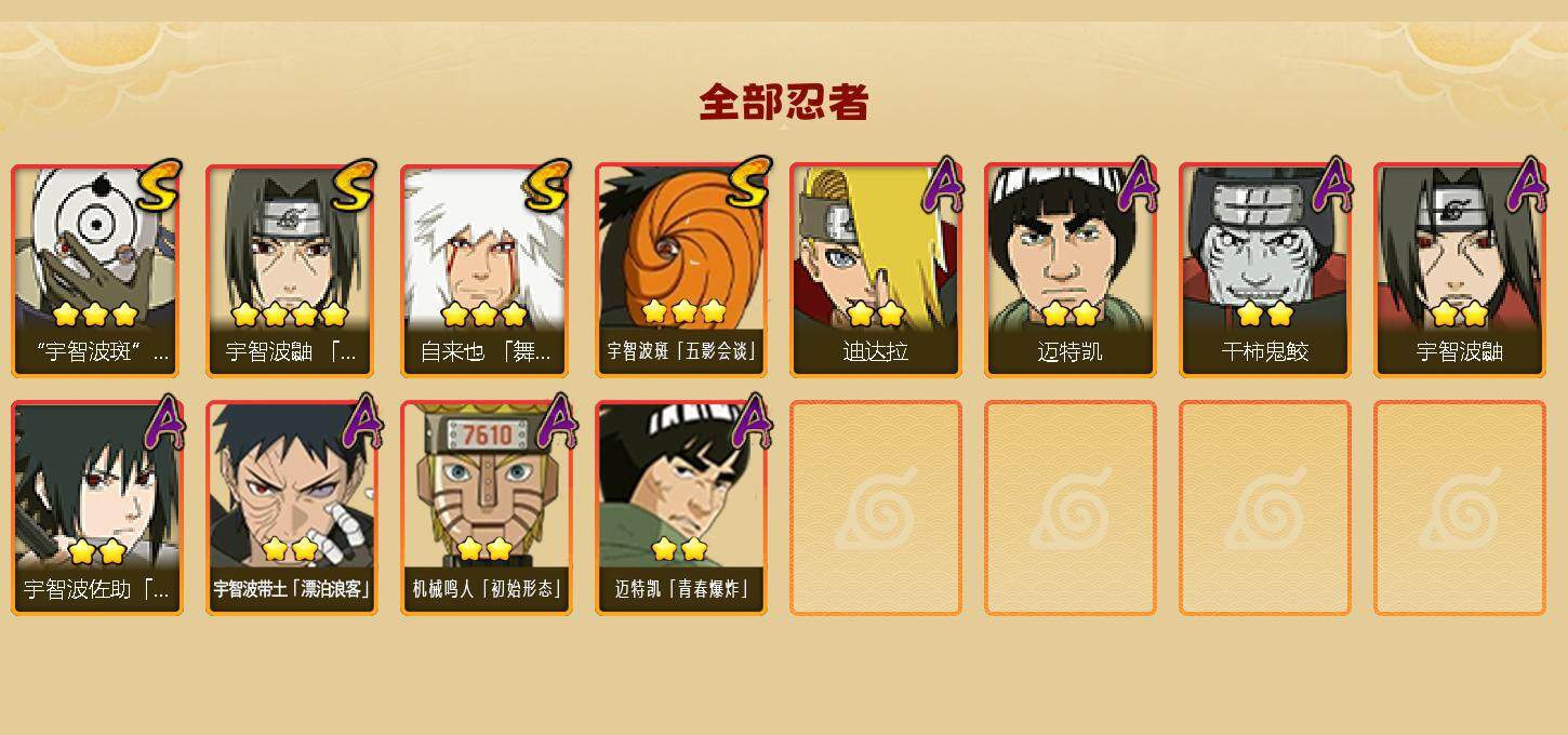 【hyyt31】v7/战力188w/s忍4/a忍8/通灵兽10/3星自来也「舞之豪杰」/3星宇智波斑「白面具」/2星宇智波带土「漂泊浪客」/2星迪达拉/2星干柿鬼鲛/2星宇智波鼬/2星迈特凯/2星迈特凯「青春爆炸」/2星宇智波佐助「须佐能乎」/3星宇智波斑「五影会谈」/2星机械鸣人「初始形态」/4星宇智波鼬「须佐能乎」