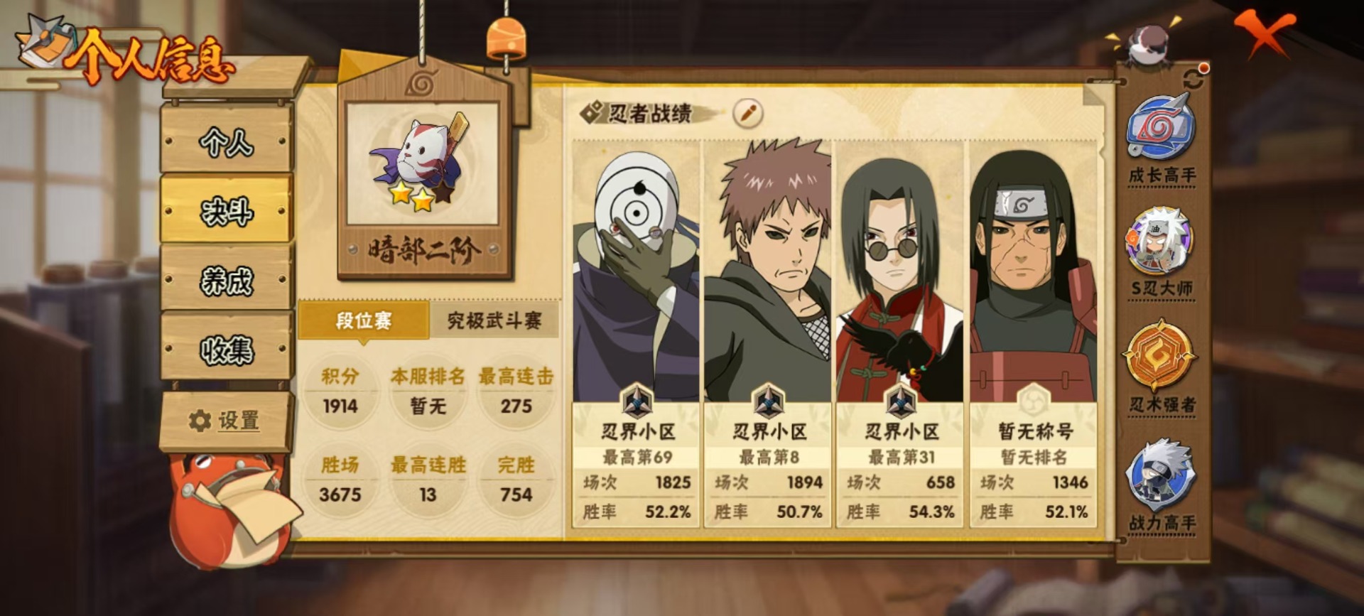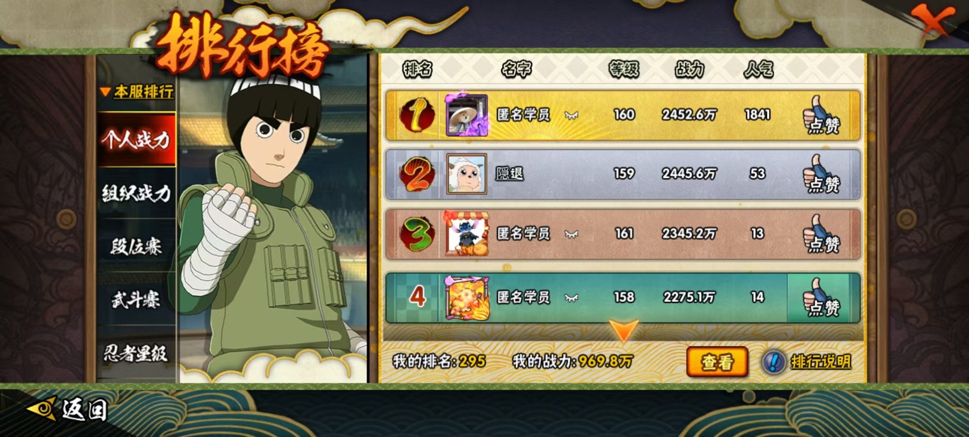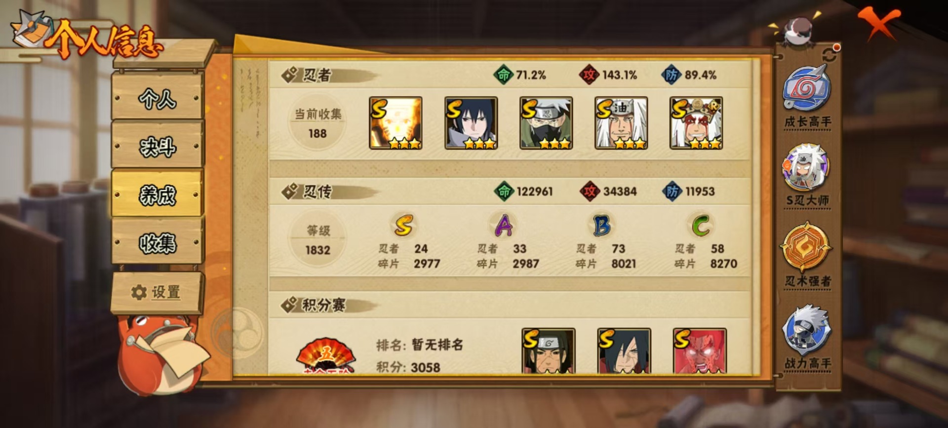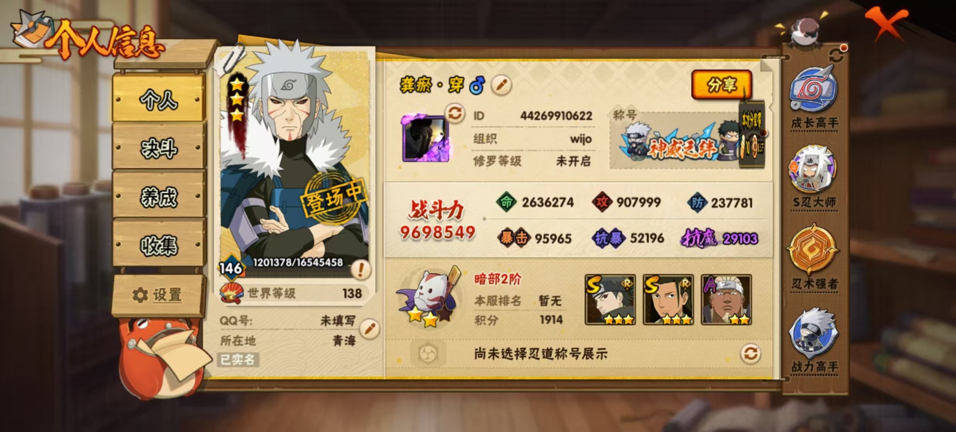 [14553257]v11 24s忍 32a忍 18通灵 969.8w战力 可二次 可修改实名 【s级忍者】:宇智波止水「须佐能乎」宇智波斑「秽土转生·解」千手柱间·木叶创立宇智波佐助「永恒万花筒」漩涡鸣人 「九喇嘛连结」大野木 「忍界大战」迈特凯「死门」宇智波斑 「木叶创立」宇智