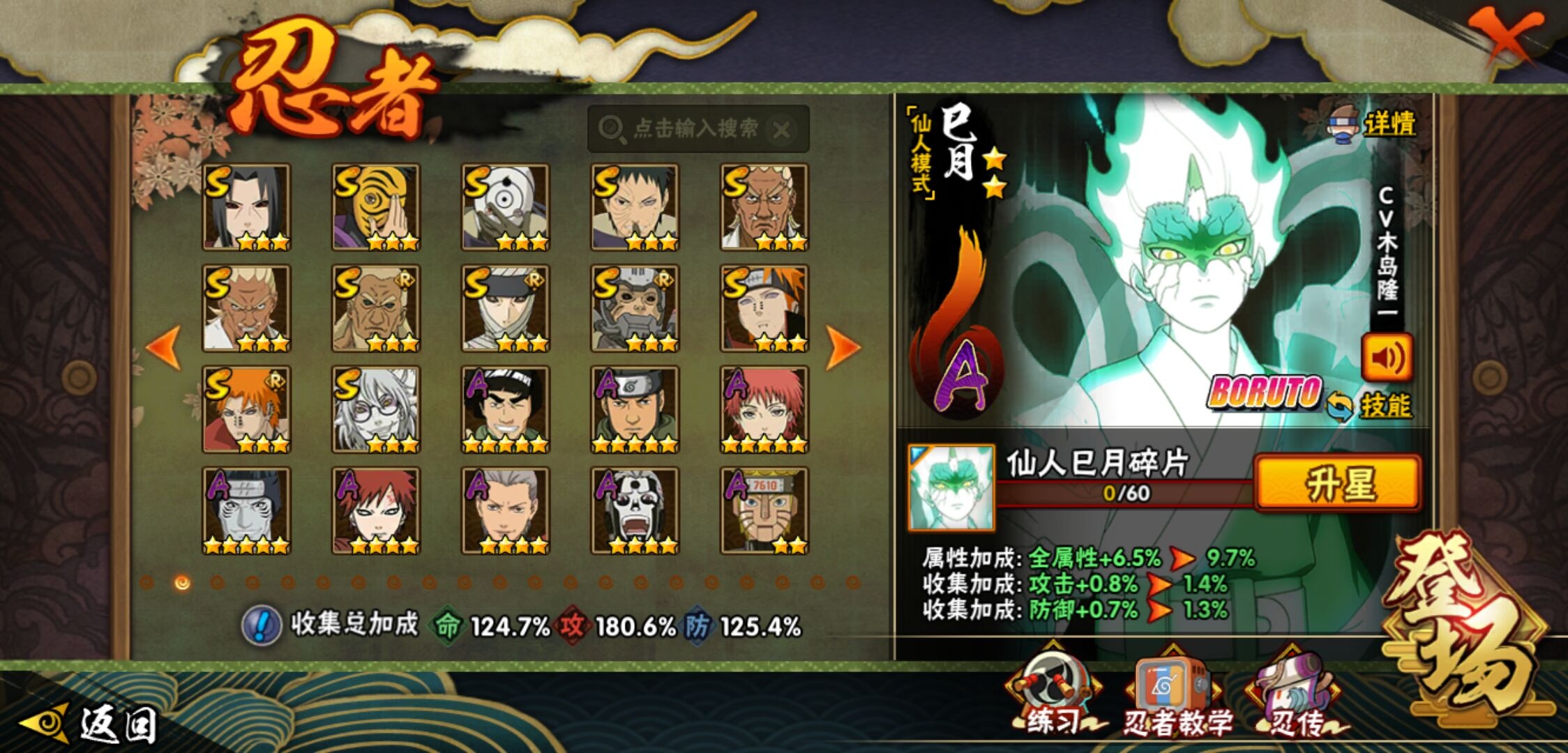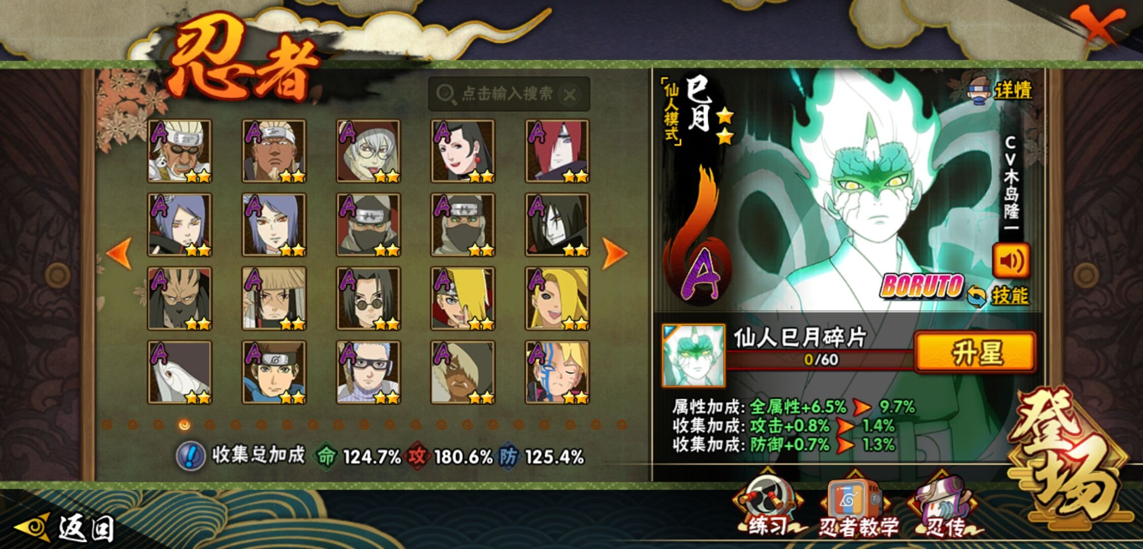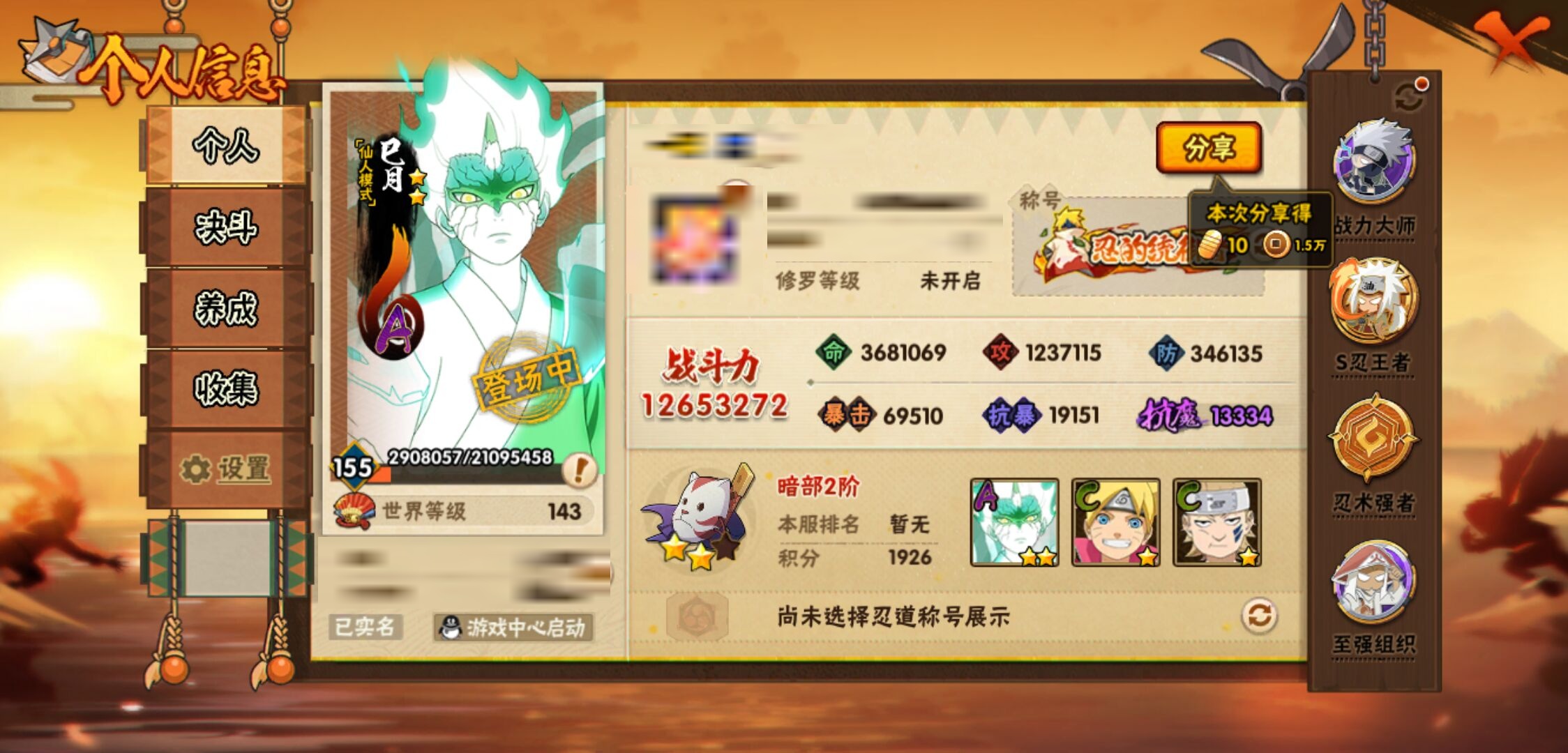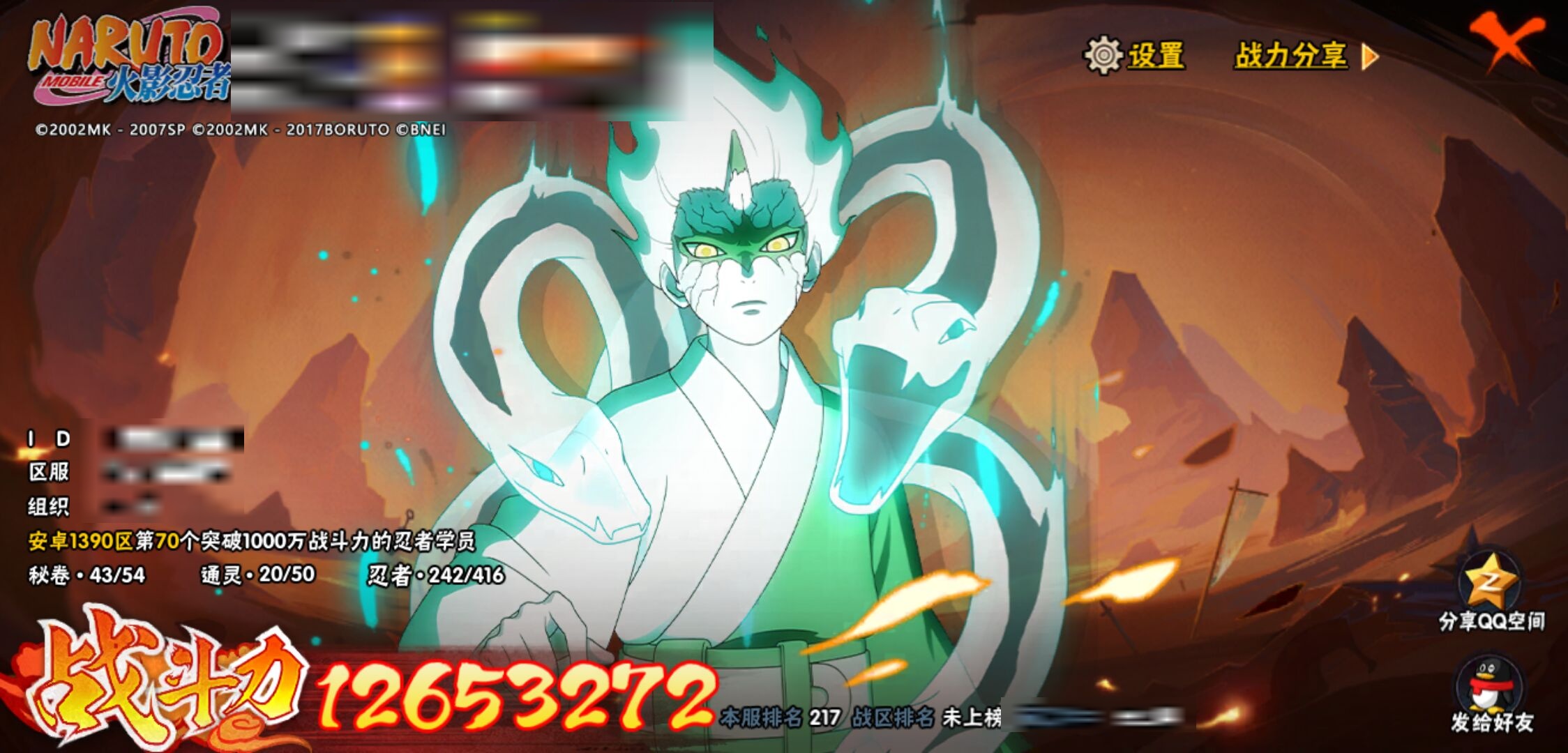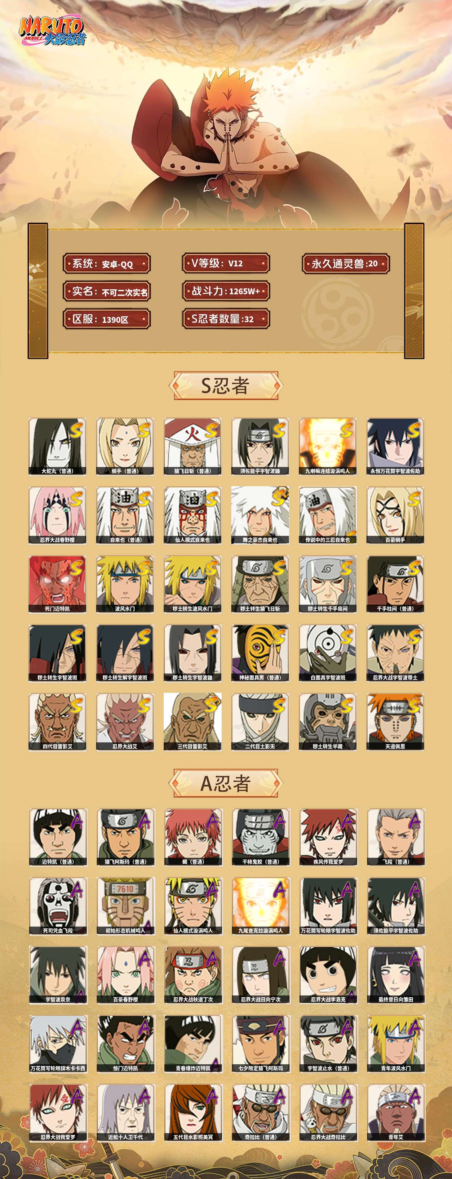 【火影忍者】【lyhy9269】战斗力:1265w;段位:暗部2阶;本服排名:217;vip:v12级;s忍:32个;a忍:50个;通灵兽:20个,s忍:大蛇丸(普通) 4星|纲手(普通) 4星|猿飞日斩(普通) 4星|须佐能乎宇智波鼬 4星|九喇嘛连结漩涡鸣人|永恒万花筒宇智波佐助|忍界大战春野樱|自来也(普通)|仙人模式自来也|舞之豪杰自来也|传说中的三忍自来也|百豪纲手|死门迈特凯|波风水门|秽土转生波风水门|秽土转生猿飞日斩|秽土转生千手扉间|千手柱间(普通)|秽土转生宇智波斑|秽土转生解宇智波斑|秽土转生宇智波鼬|神秘面具男(普通)|白面具宇智波斑|忍界大战宇智波带土|四代目雷影艾|忍界大战艾|三代目雷影艾|二代目土影无|秽土转生半藏|天道佩恩|超佩恩天道|仙人模式药师兜__a忍:迈特凯(普通) 5星|猿飞阿斯玛(普通) 5星|蝎(普通) 5星|干柿鬼鲛(普通) 5星|疾风传我爱罗 4星|飞段(普通) 4星|死司凭血飞段 4星|初始形态机械鸣人|仙人模式漩涡鸣人|九尾查克拉漩涡鸣人|万花筒写轮眼宇智波佐助|须佐能乎宇智波佐助|宇智波泉奈|百豪春野樱|忍界大战秋道丁次|忍界大战日向宁次|忍界大战李洛克|最终章日向雏田|万花筒写轮眼旗木卡卡西|惊门迈特凯|青春爆炸迈特凯|七夕限定猿飞阿斯玛|宇智波止水(普通)|青年波风水门|忍界大战我爱罗|近松十人卫千代|五代目水影照美冥|奇拉比(普通)|忍界大战奇拉比|青年艾|半蛇斗篷药师兜|不缘|青年长门|小南(普通)|夏日泳装小南|角都(普通)|地怨虞角都|晓大蛇丸|绯流琥蝎|宇智波鼬(普通)|新春限定宇智波鼬|迪达拉(普通)|秽土转生迪达拉|暴怒宇智波带土|木叶上忍猿飞木叶丸|六代目水影长十郎|五代目雷影达鲁伊|桃式显现漩涡博人|仙人模式巳月|四代目土影黑土__通灵兽:忍犬(普通)|蓝蛇|蛤蟆吉|忍龟|镰鼬|猿魔|山椒鱼|蜃|蛞蝓(普通)|蛤蟆仙人|鲛鲨|蛤蟆健|乌鸦(普通)|蛤蟆龙|砂之守鹤|蛤蟆广|怒鬼无臂|梦貘|鹰|蜘蛛