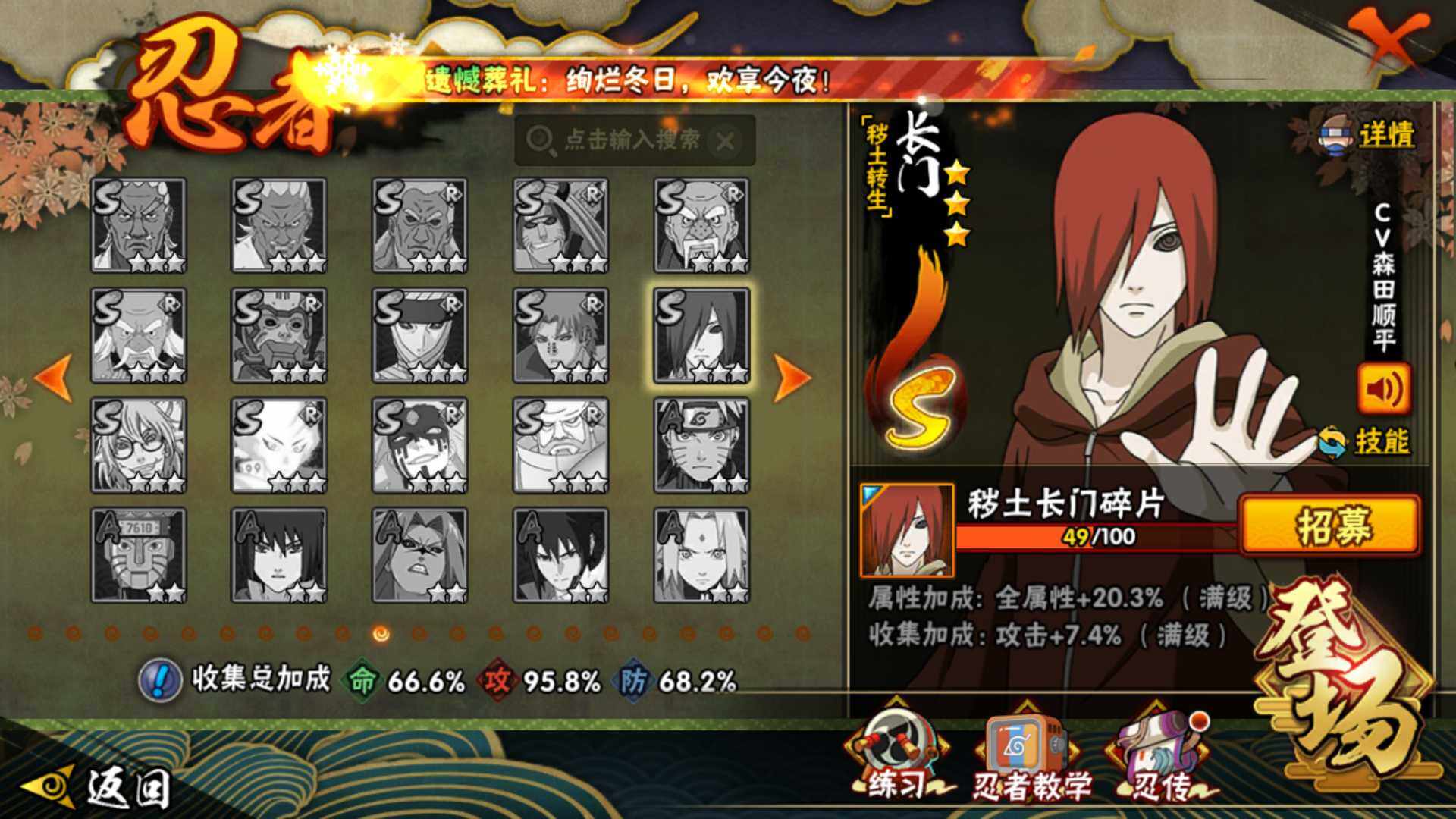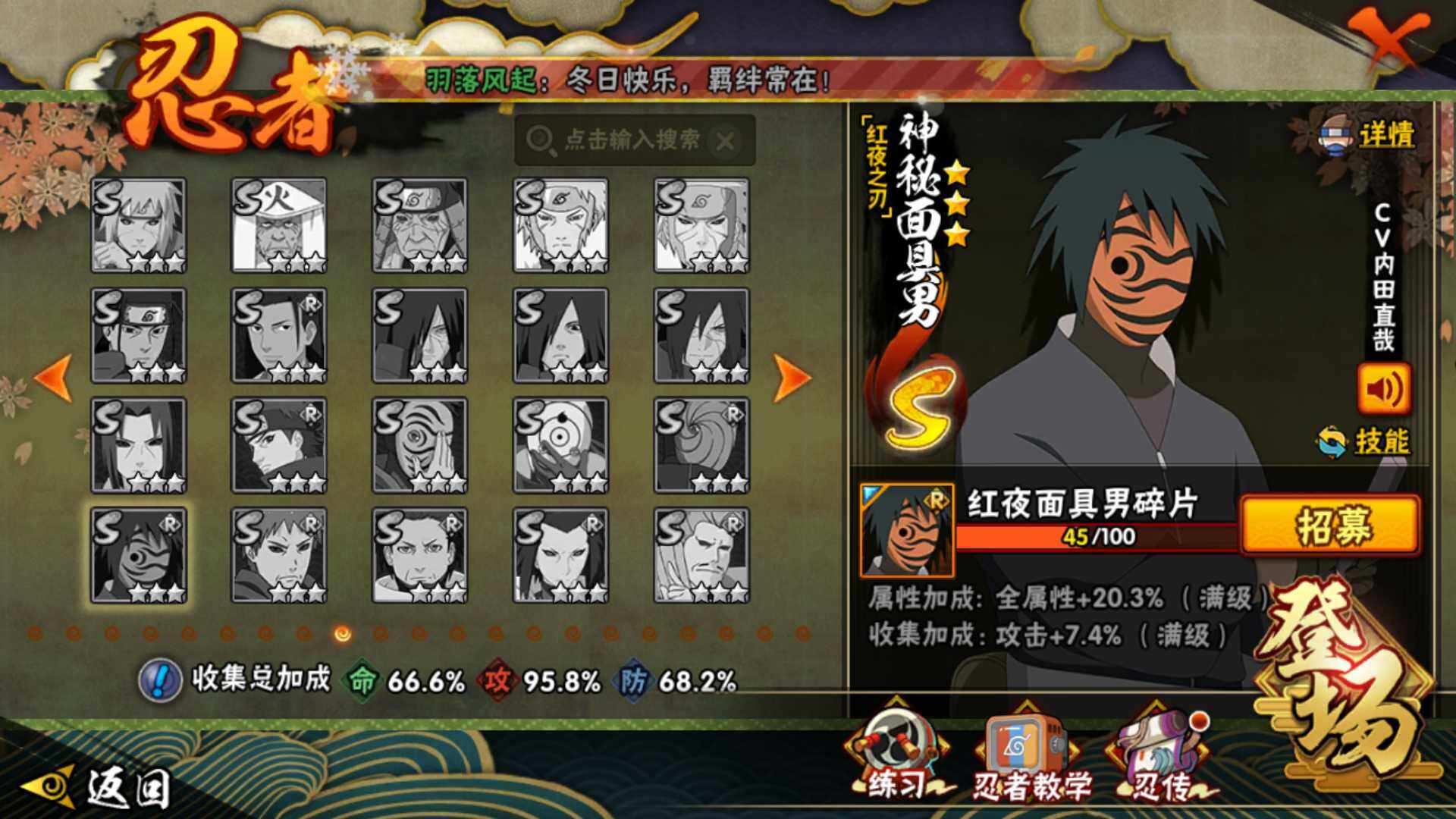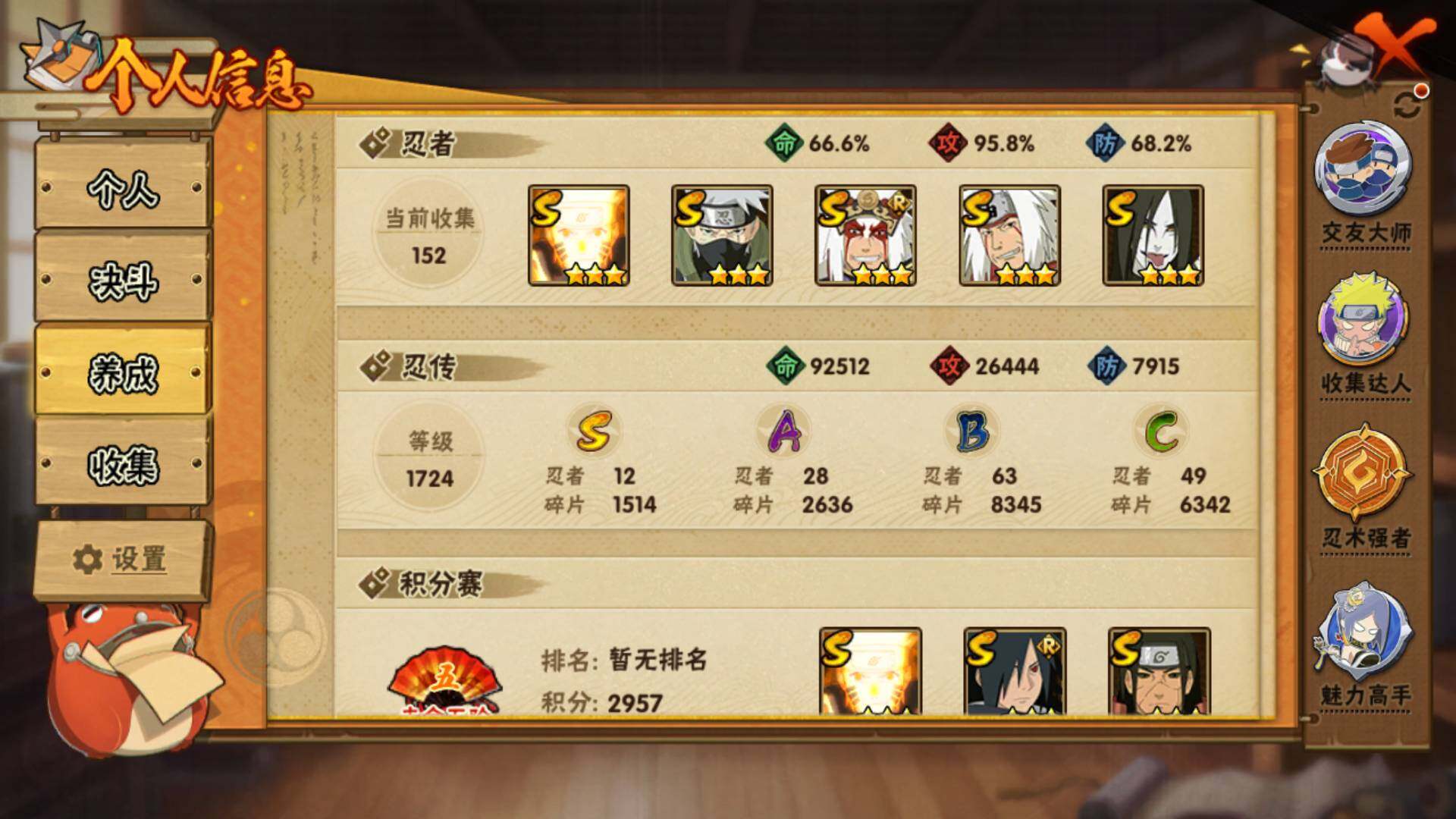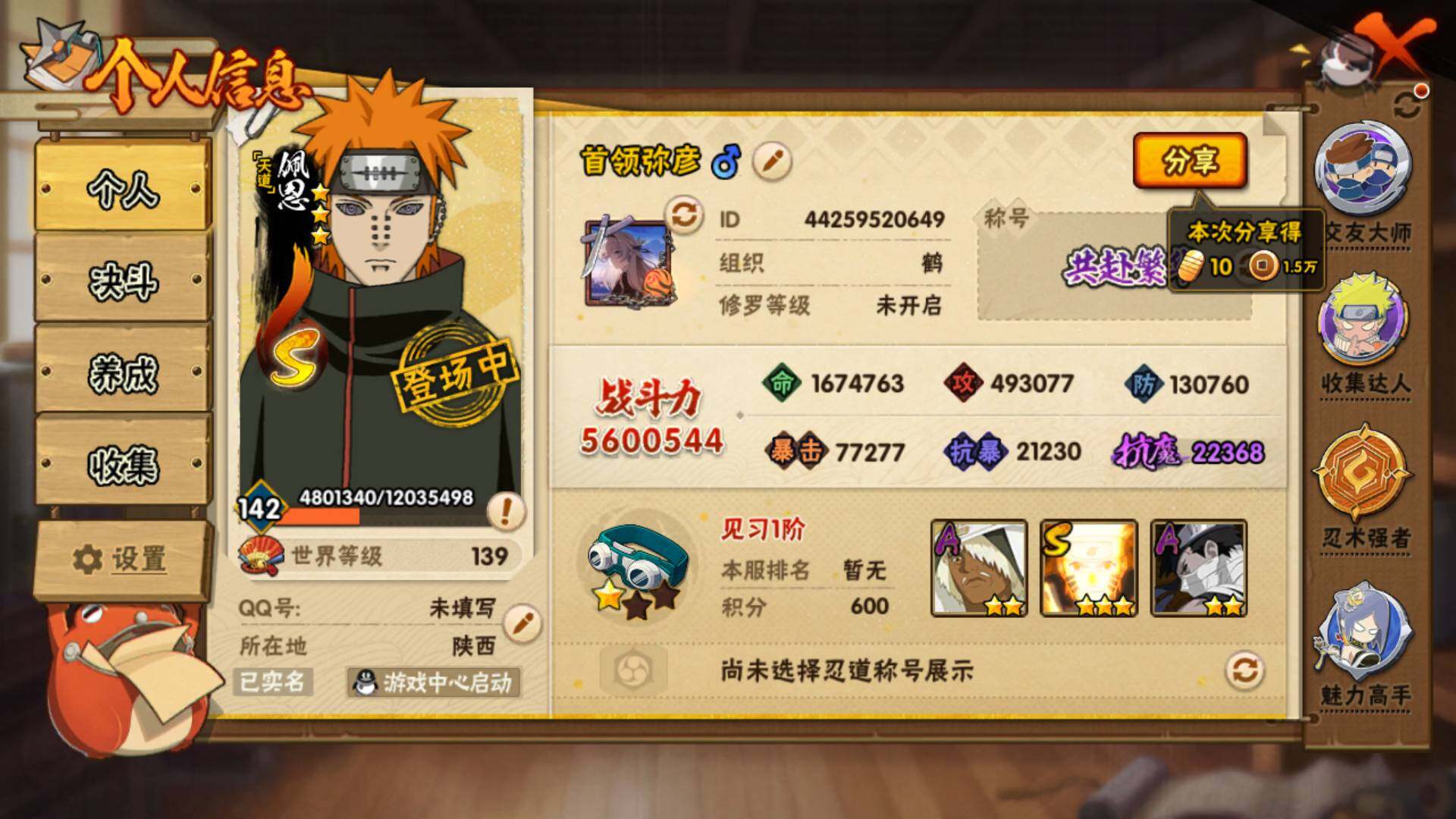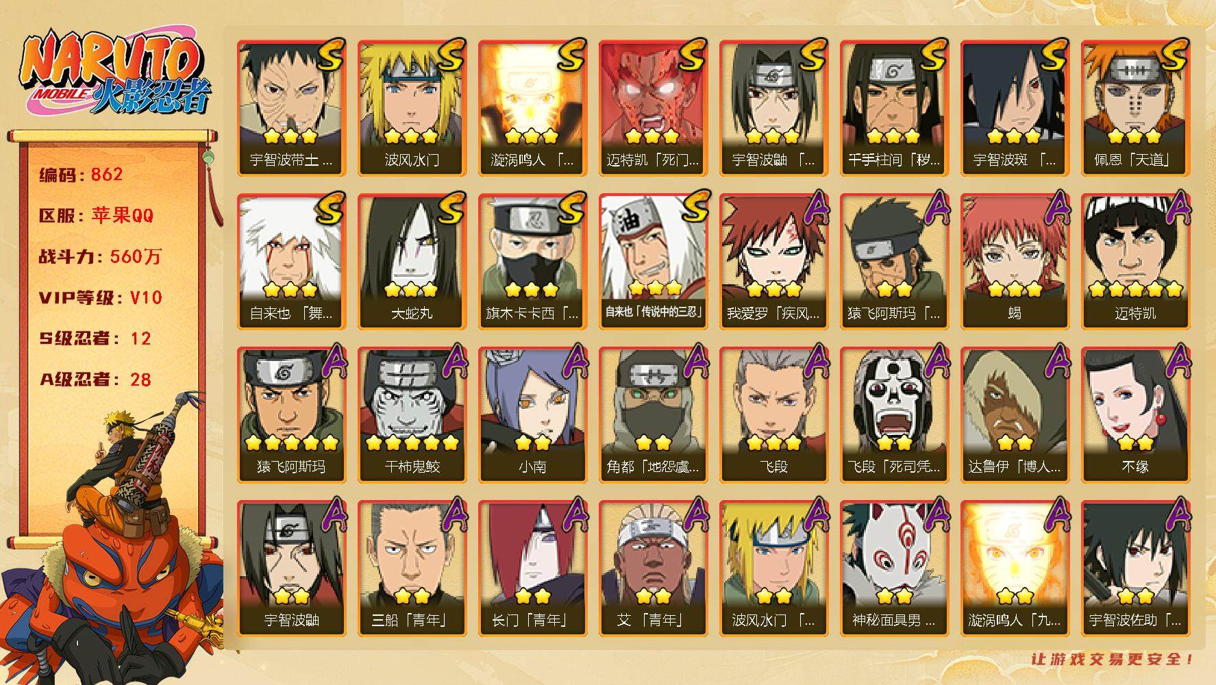 [14582280]v10560w战力,12s级忍者数-28a级忍者数,me1887 【s级忍者】:千手柱间「秽土转生」3星,宇智波带土「忍界大战」3星,宇智波鼬「须佐能乎」3星,旗木卡卡西「须佐能乎」3星,宇智波斑「木叶创立」3星,自来也「舞之豪杰」3星,大蛇丸3星,自来也「传说中的三忍」3星,波风水门3星,漩涡鸣人「九喇嘛连结」3星,迈特凯「死门」3星,佩恩「天道」3星 【a级忍者】:艾「青年」2星,三船「青年」2星,长门「青年」2星,波风水门「青年」2星,达鲁伊「博人传」2星,奇拉比「忍界大战」2星,飞段3星,飞段「死司凭血」2星,干柿鬼鲛5星,漩涡鸣人「九尾查克拉」2星,迈特凯5星,桃地再不斩「秽土转生」2星,我爱罗「疾风传」3星,蝎3星,蝎「绯流琥」2星,小南2星,角都「地怨虞」2星,猿飞阿斯玛5星,猿飞阿斯玛「秽土转生」2星,宇智波鼬2星,宇智波佐助「须佐能乎」2星,神秘面具男「忍者之路」2星,黑土「博人传」2星,秋道丁次「忍界大战」2星,千代「近松十人卫」2星,不缘2星,地陆2星,宇智波泉奈2星