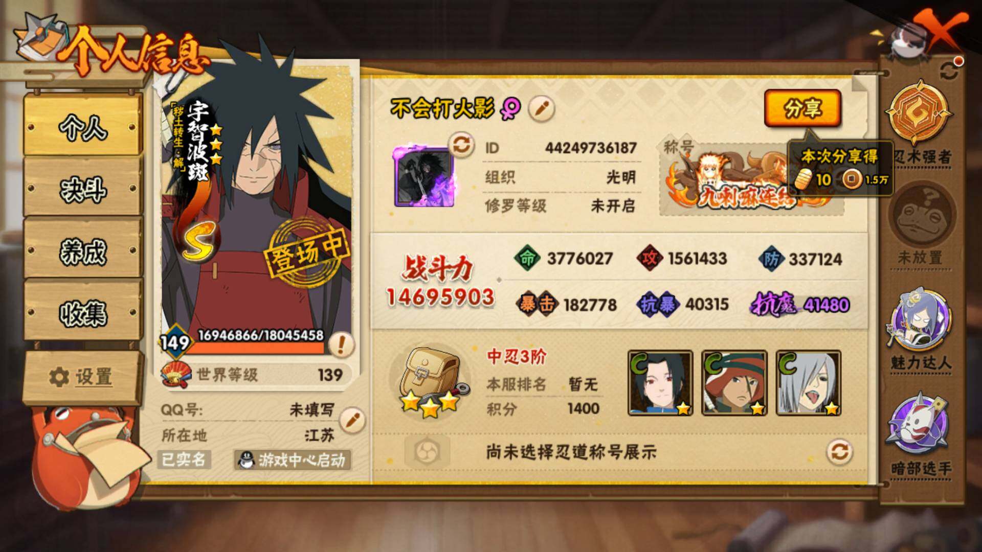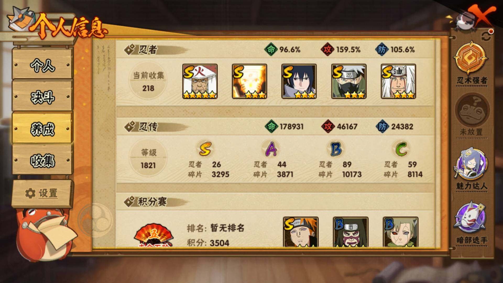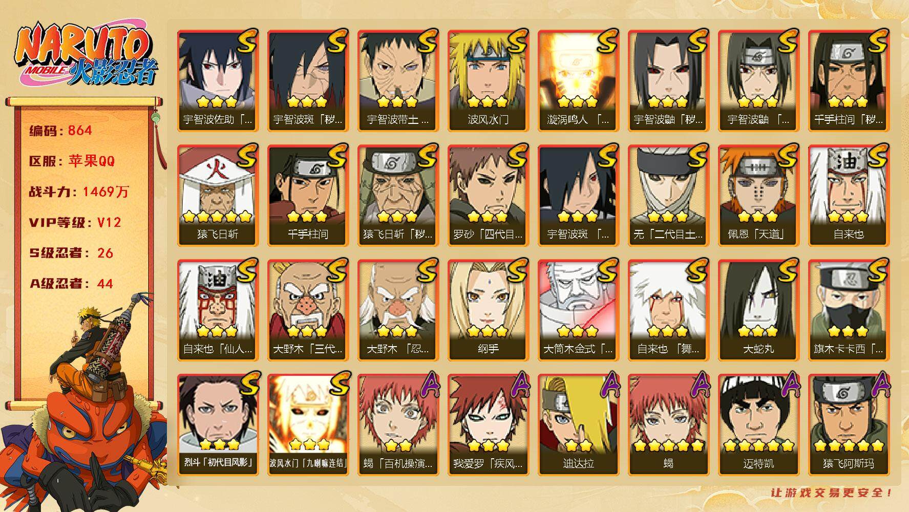 [14583103]v121469w战力,26s级忍者数-44a级忍者数,4.6w金币,350点券,34高招券,me1889 【s级忍者】:猿飞日斩「秽土转生」3星,千手柱间「秽土转生」3星,宇智波鼬「秽土转生」3星,宇智波斑「秽土转生·解」3星,大野木「忍界大战」3星,宇智波带土「忍界大战」3星,宇智波鼬「须佐能乎」3星,旗木卡卡西「须佐能乎」3星,宇智波斑「木叶创立」3星,无「二代目土影」3星,罗砂「四代目风影」3星,大野木「三代目土影」3星,烈斗「初代目风影」3星,自来也3星,自来也「仙人模式」3星,自来也「舞之豪杰」3星,大蛇丸3星,纲手3星,千手柱间3星,猿飞日斩5星,波风水门3星,漩涡鸣人「九喇嘛连结」3星,佩恩「天道」3星,宇智波佐助「永恒万花筒」3星,大筒木金式3星,波风水门「九喇嘛连结」3星 【a级忍者】:艾「青年」2星,长门「青年」2星,波风水门「青年」2星,达鲁伊「博人传」2星,迪达拉2星,大蛇丸「晓」2星,奇拉比2星,奇拉比「忍界大战」2星,飞段3星,飞段「死司凭血」2星,干柿鬼鲛5星,漩涡博人「桃式显现」2星,漩涡鸣人「仙人模式」2星,漩涡鸣人「九尾查克拉」2星,机械鸣人「初始形态」2星,迈特凯5星,旗木卡卡西「忍界大战」2星,旗木卡卡西「幻之真容」2星,桃地再不斩「秽土转生」2星,我爱罗「疾风传」3星,蝎5星,蝎「百机操演」2星,小南「夏日泳装」2星,角都「地怨虞」2星,猿飞阿斯玛5星,宇智波止水2星,宇智波鼬2星,宇智波佐助「万花筒写轮眼」2星,照美冥「五代目水影」2星,日向宁次「忍界大战」2星,长十郎「六代目水影」2星,卑留呼「火之意志继承者」2星,神秘面具男「忍者之路」2星,佩恩·六道「漂泊浪客」2星,李洛克「忍界大战」2星,猿飞木叶丸「博人传」2星,黑土「夏日限定」2星,黑土「博人传」2星,秋道丁次「忍界大战」2星,千代「近松十人卫」2星,神农「羁绊」2星,土台「忍界大战」3星,宇智波泉奈2星,迈特凯「青春爆炸」2星