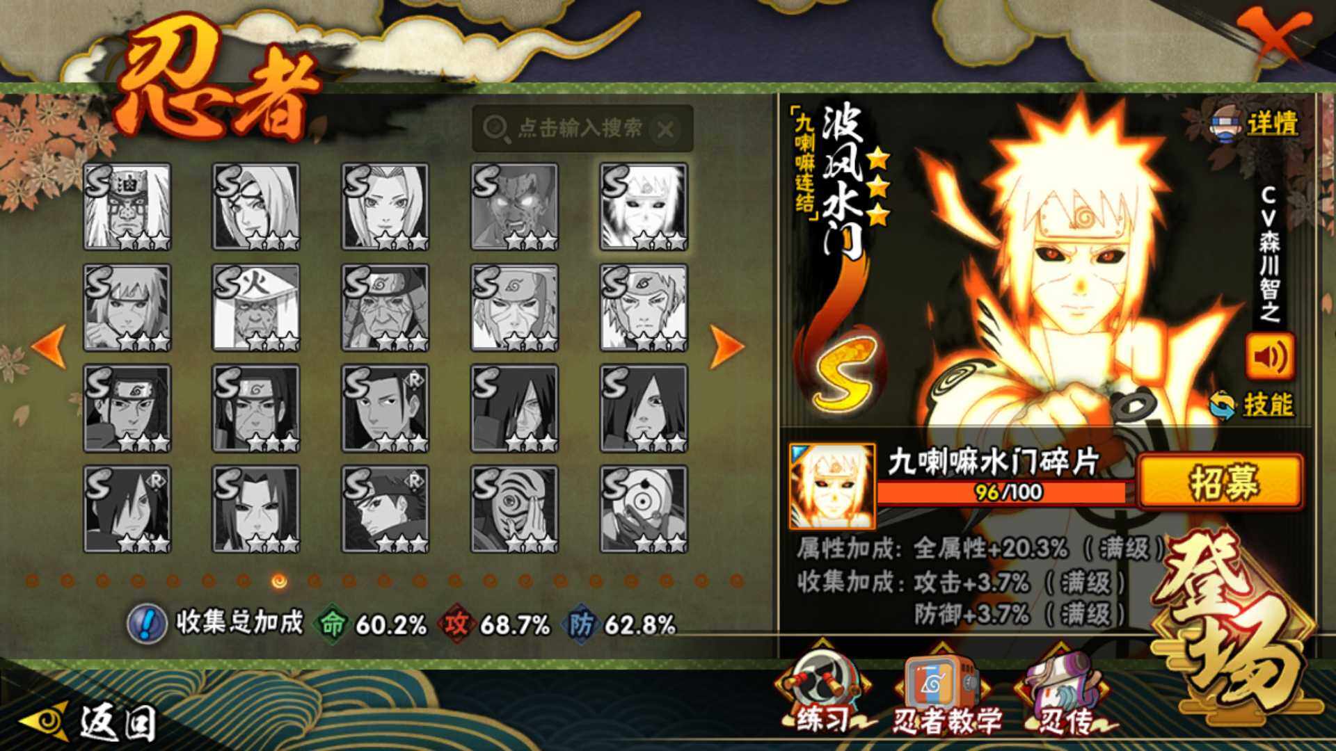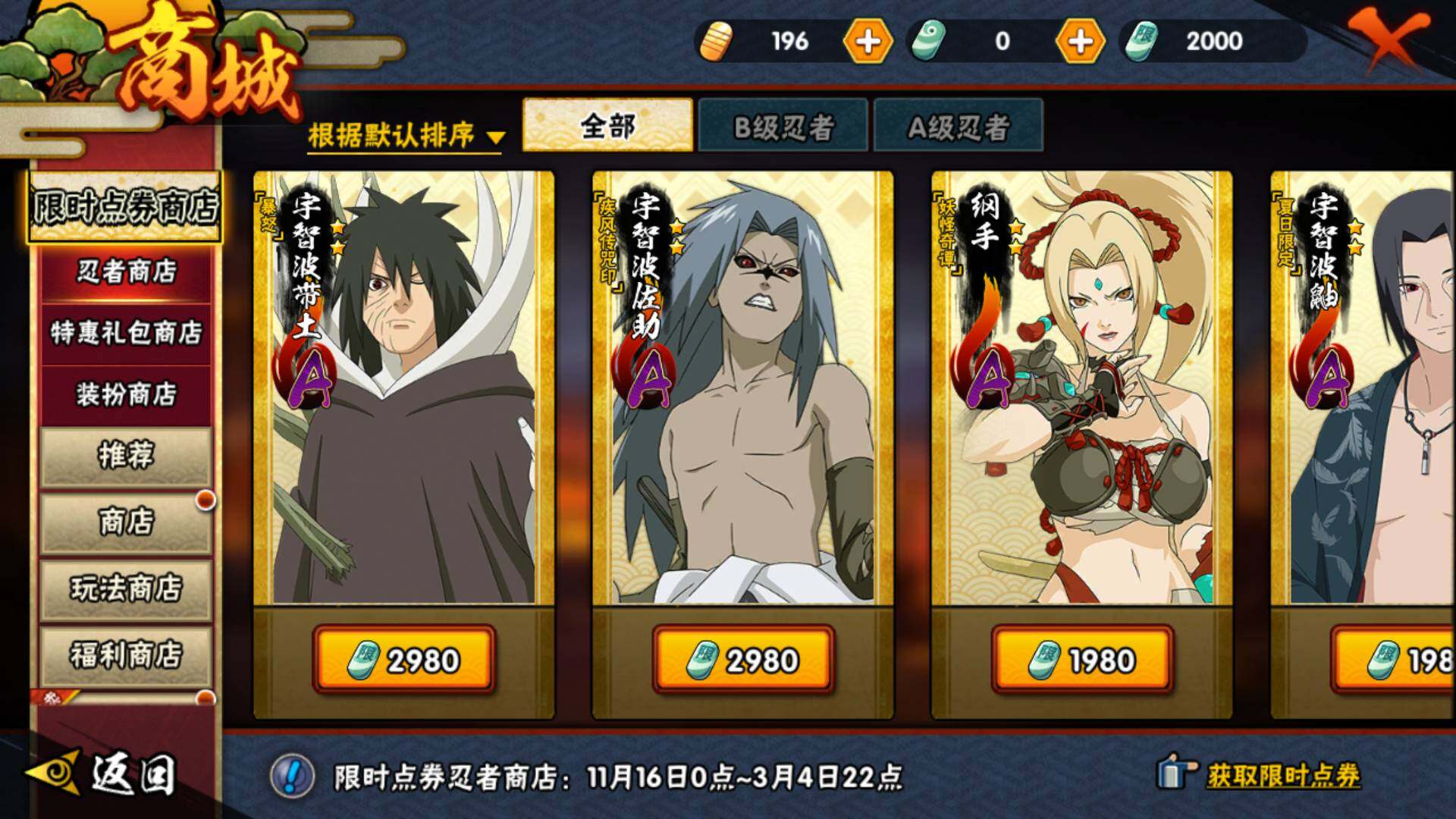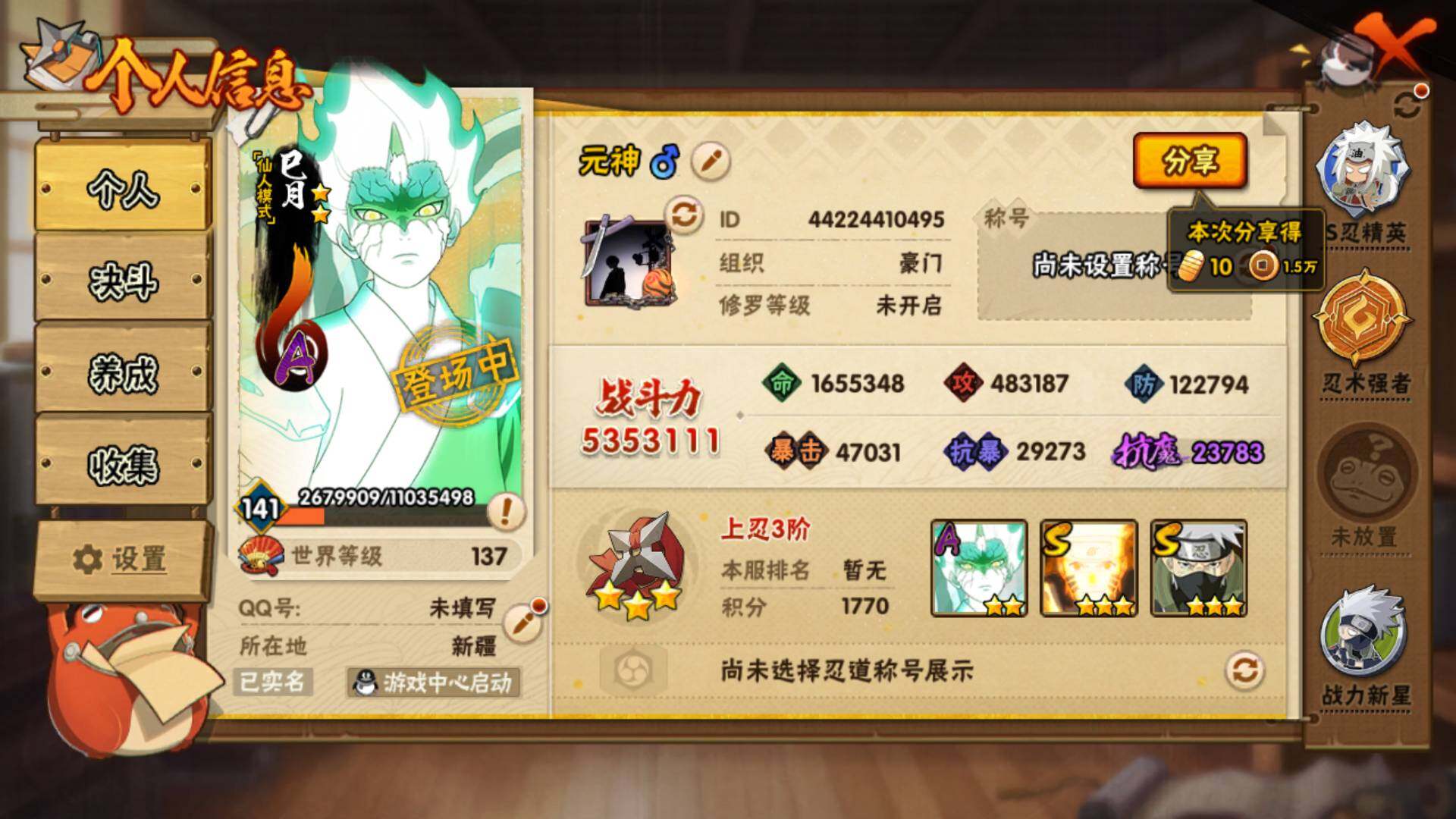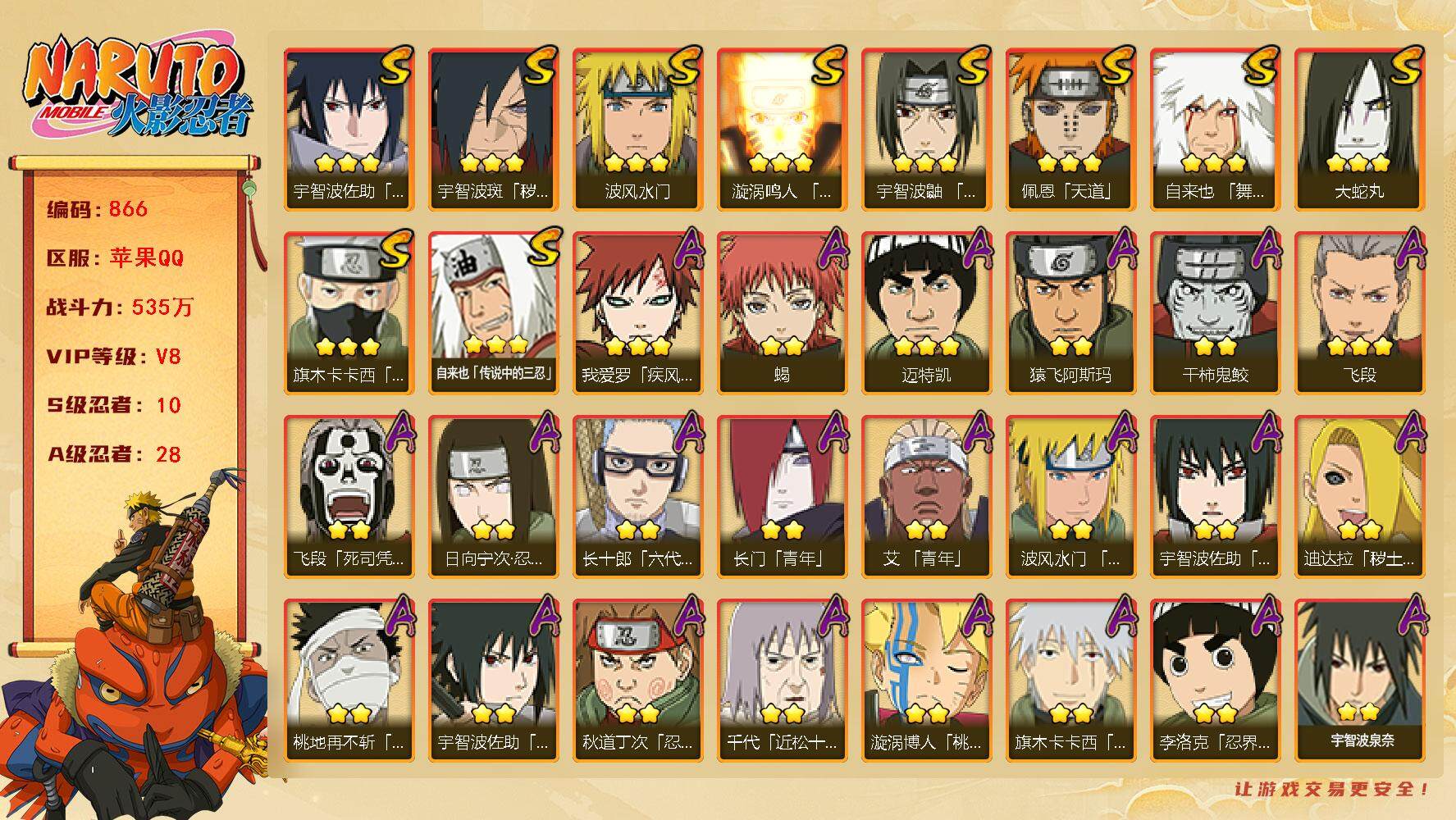 [14585353]v8 10s 28a 535万战力 限时点券2000 九水门96片 创立柱间65片 面具男75片 zp3305 【s级忍者】:宇智波斑「秽土转生·解」3星,宇智波鼬「须佐能乎」3星,旗木卡卡西「须佐能乎」3星,自来也「舞之豪杰」3星,大蛇丸3星,自来也「传说中的三忍」3星,波风水门3星,漩涡鸣人「九喇嘛连结」3星,佩恩「天道」3星,宇智波佐助「永恒万花筒」3星 【a级忍者】:艾「青年」2星,长门「青年」2星,波风水门「青年」2星,迪达拉「秽土转生」2星,飞段3星,飞段「死司凭血」2星,干柿鬼鲛2星,漩涡博人「桃式显现」2星,机械鸣人「初始形态」2星,迈特凯3星,旗木卡卡西「幻之真容」2星,桃地再不斩「漂泊武士」2星,桃地再不斩「秽土转生」2星,我爱罗「疾风传」3星,蝎2星,猿飞阿斯玛2星,宇智波佐助「须佐能乎」2星,宇智波佐助「万花筒写轮眼」2星,宇智波佐助「侠隐江湖」2星,日向宁次「忍界大战」2星,长十郎「六代目水影」2星,李洛克「忍界大战」2星,秋道丁次「忍界大战」2星,千代「近松十人卫」2星,神农「羁绊」2星,宇智波泉奈2星,大野木「侠隐江湖」2星,巳月「仙人模式」2星