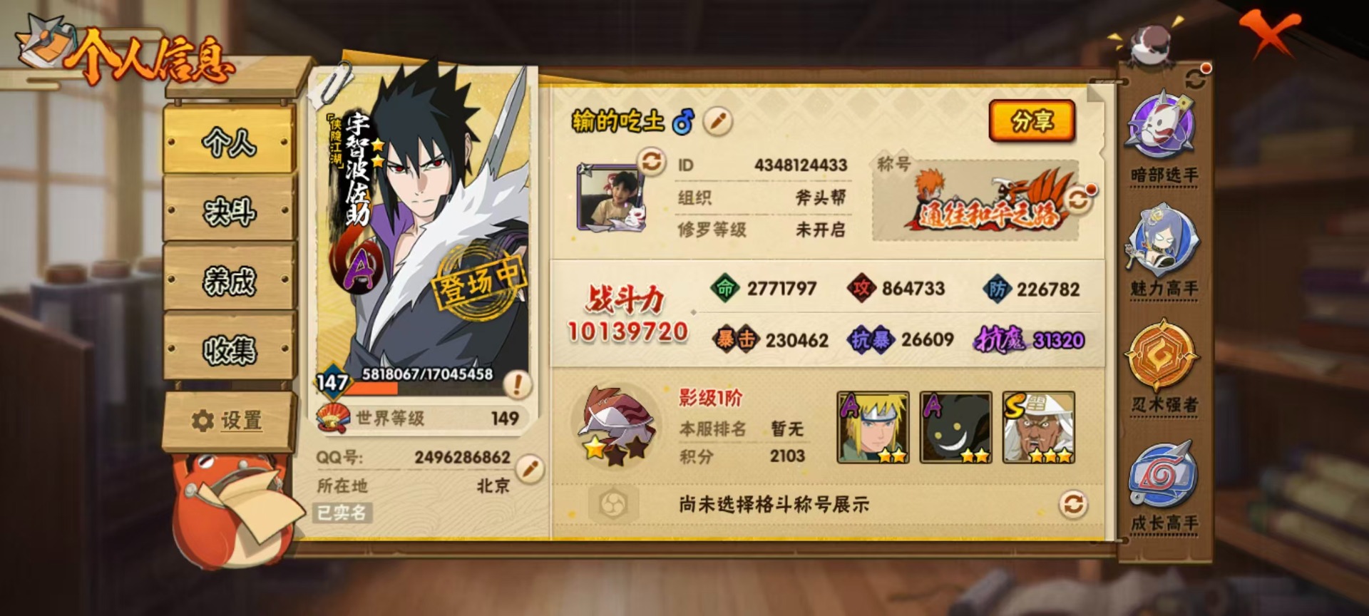 v11 20s忍 38a忍 18通灵 1013.9w战力 可二次 可修改实名 【s级忍者】:春野樱 「忍界大战」千手柱间「秽土转生」罗砂「四代目风影」自来也 「舞之豪杰」漩涡鸣人 「暴怒·第六尾」宇智波鼬「秽土转生」佩恩·天道「超」宇智波斑「白面具」纲手「百豪」宇智波斑千手柱间
