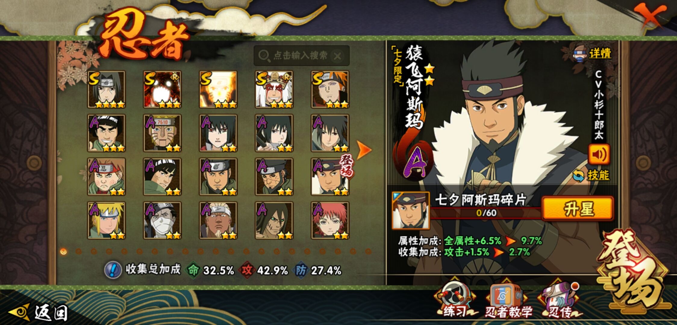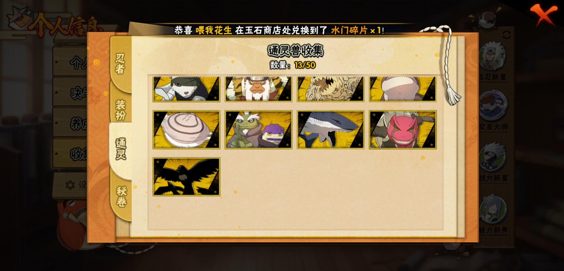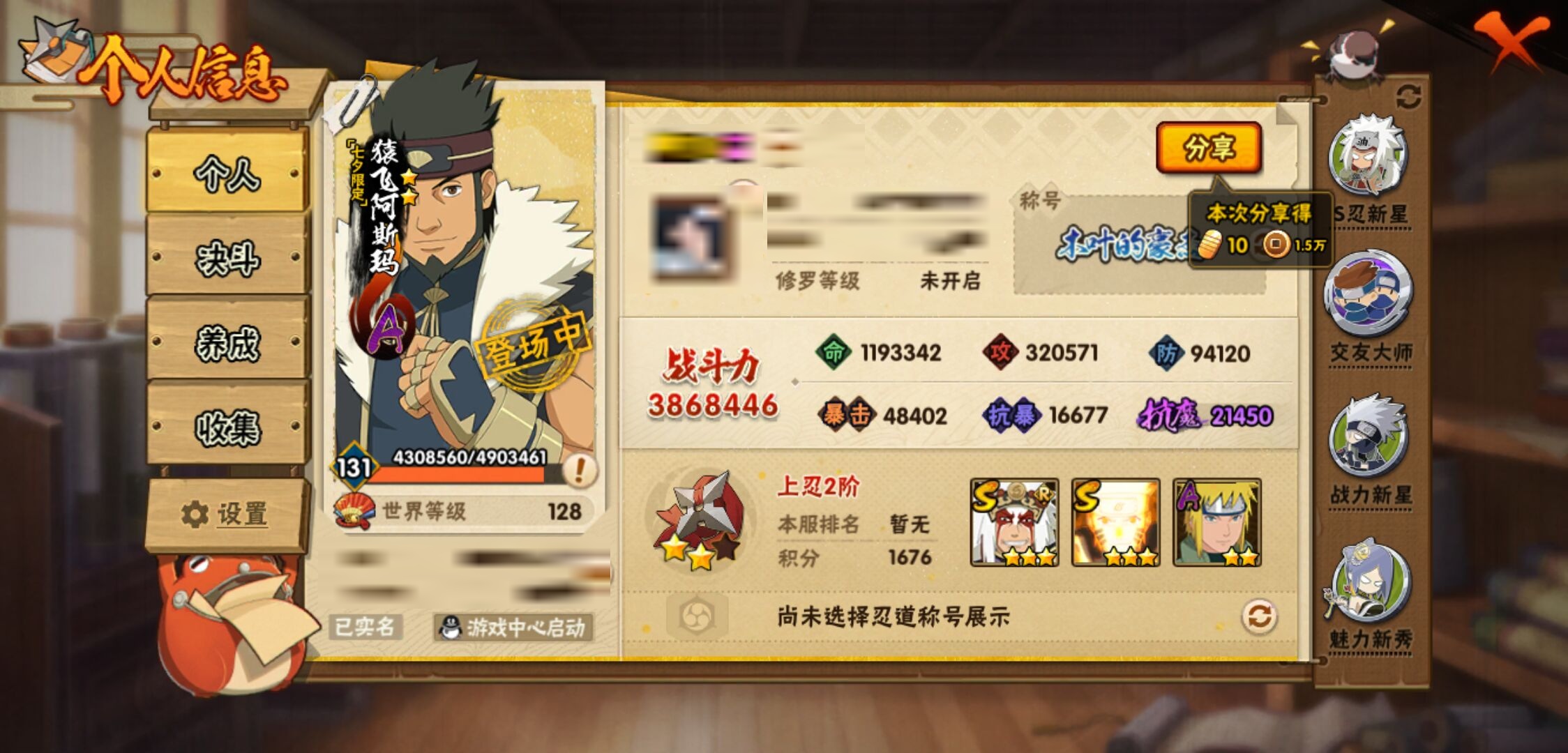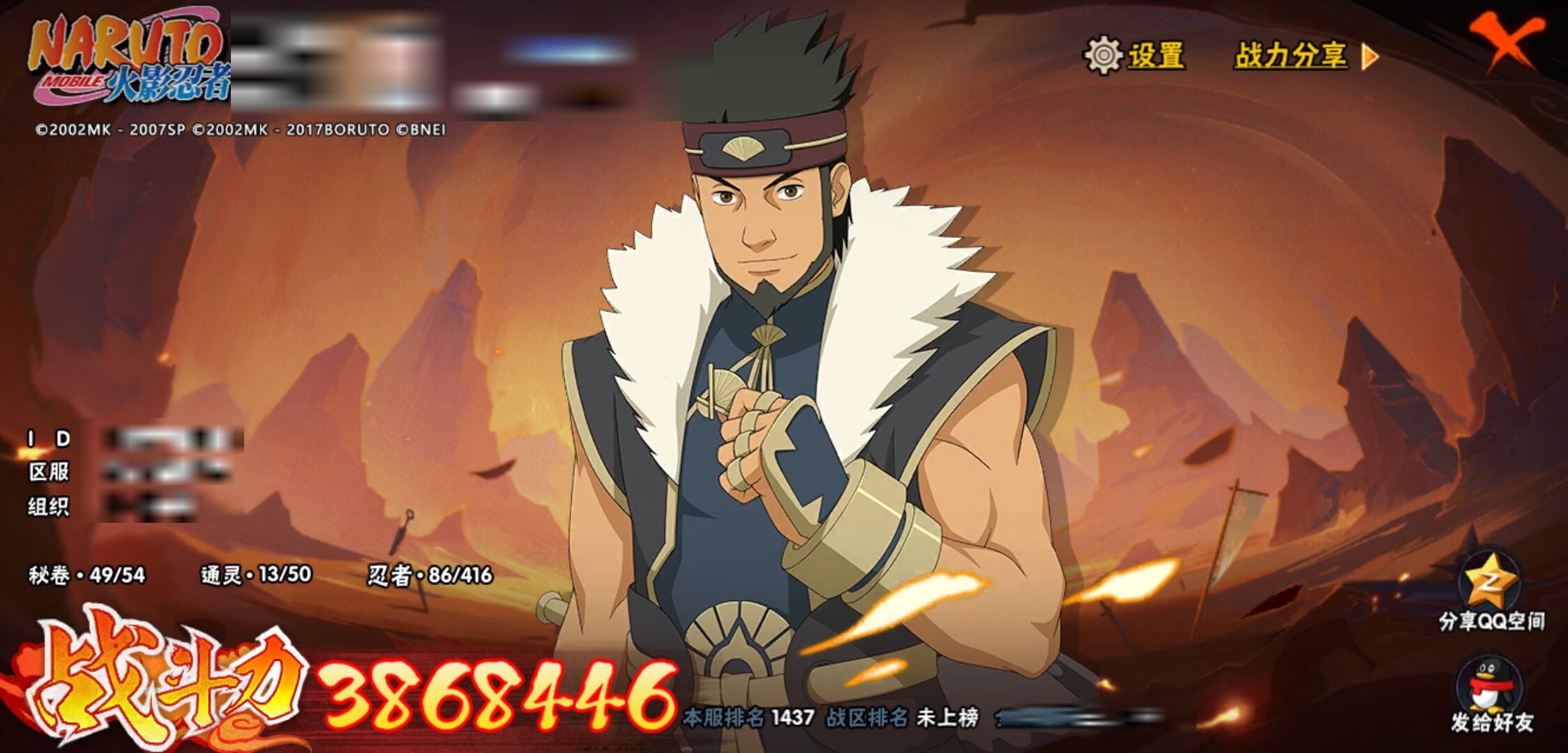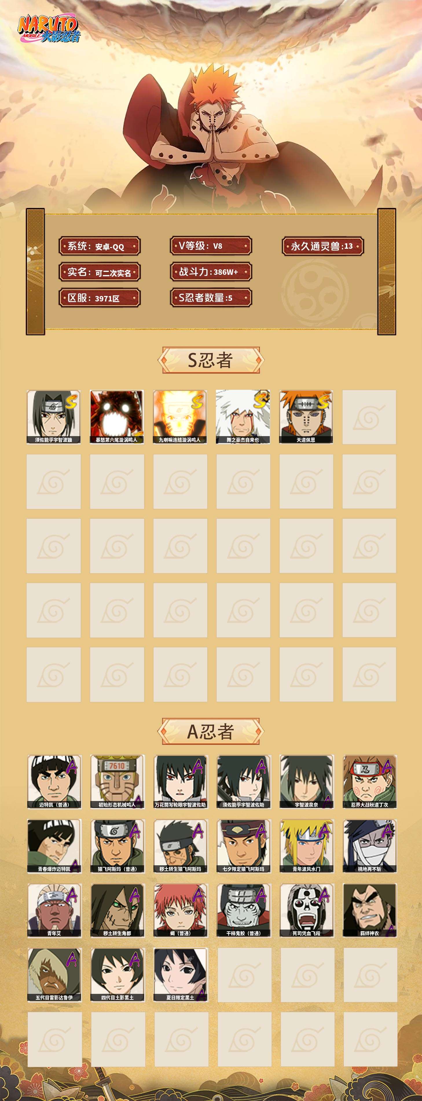 【火影忍者】【lyhy9303】战斗力:386w;段位:上忍2阶;本服排名:1437;vip:v8级;s忍:5个;a忍:21个;通灵兽:13个,s忍:须佐能乎宇智波鼬 4星|暴怒第六尾漩涡鸣人|九喇嘛连结漩涡鸣人|舞之豪杰自来也|天道佩恩__a忍:迈特凯(普通) 3星|初始形态机械鸣人|万花筒写轮眼宇智波佐助|须佐能乎宇智波佐助|宇智波泉奈|忍界大战秋道丁次|青春爆炸迈特凯|猿飞阿斯玛(普通)|秽土转生猿飞阿斯玛|七夕限定猿飞阿斯玛|青年波风水门|桃地再不斩|青年艾|秽土转生角都|蝎(普通)|干柿鬼鲛(普通)|死司凭血飞段|羁绊神农|五代目雷影达鲁伊|四代目土影黑土|夏日限定黑土__通灵兽:忍犬(普通)|蓝蛇|蛤蟆吉|忍龟|镰鼬|猿魔|砂之守鹤|山椒鱼|蜃|蛤蟆仙人|鲛鲨|蛤蟆健|乌鸦(普通)