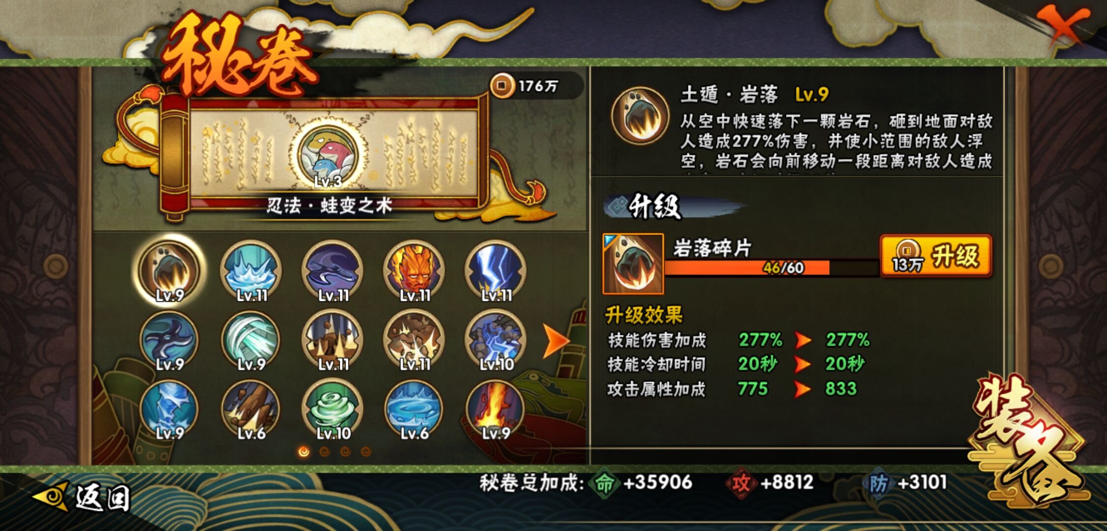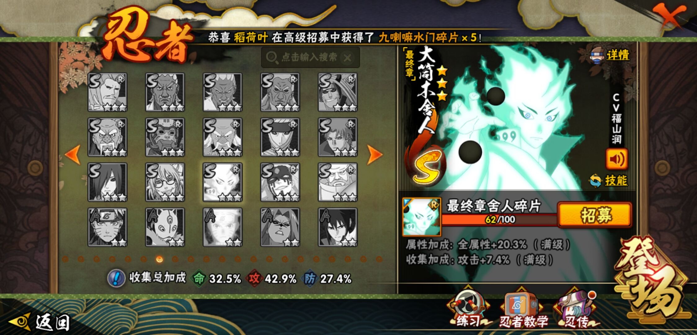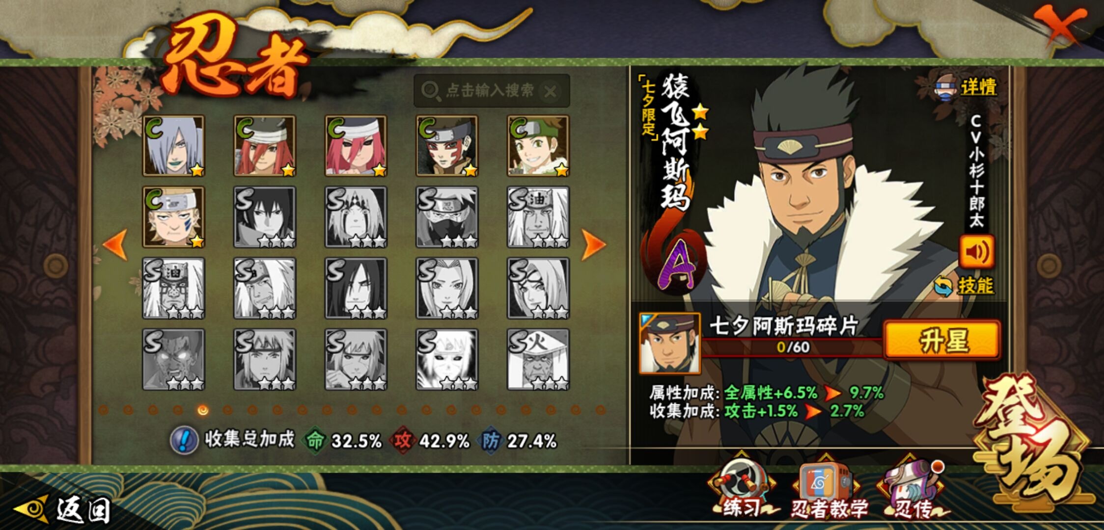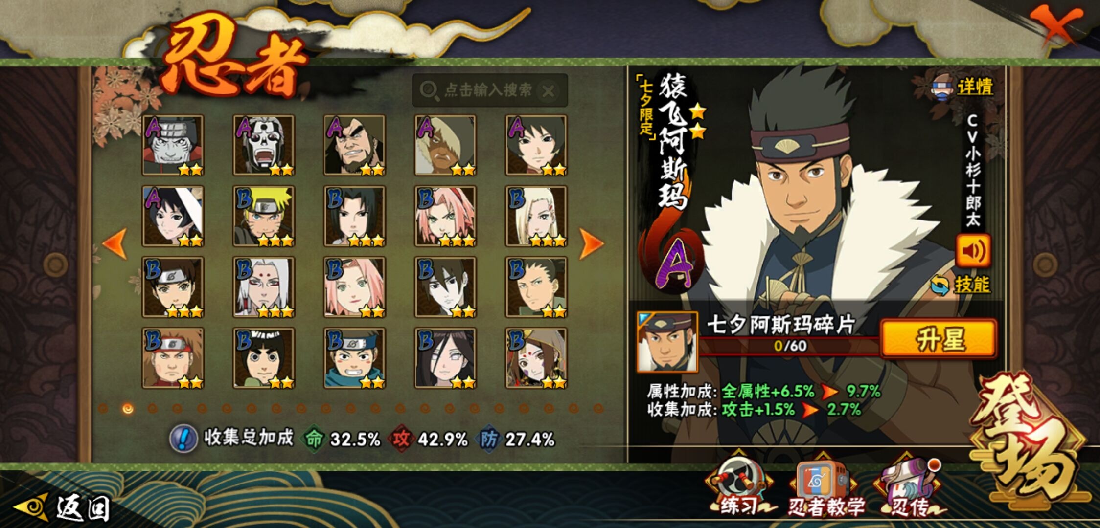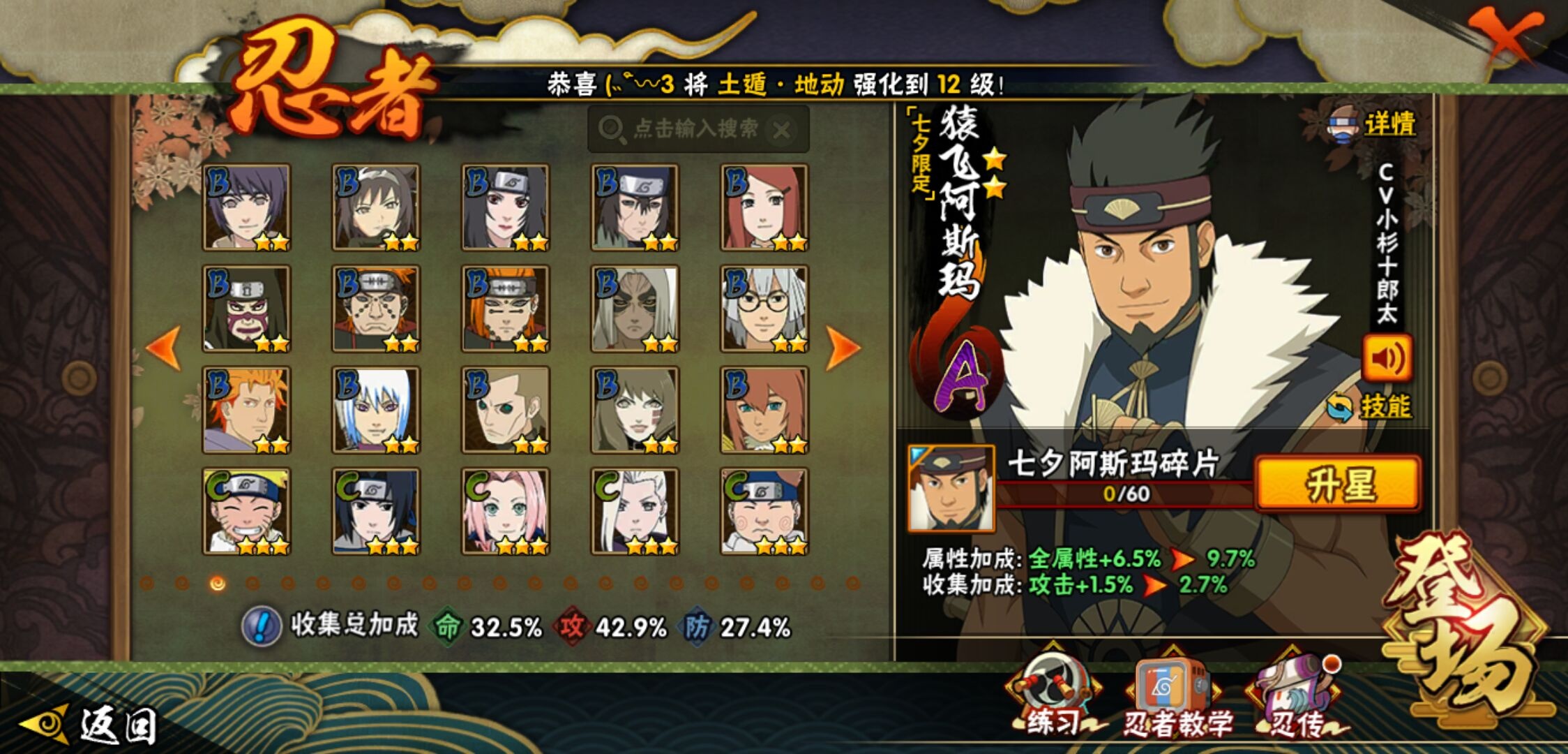 【火影忍者】【lyhy9303】战斗力:386w;段位:上忍2阶;本服排名:1437;vip:v8级;s忍:5个;a忍:21个;通灵兽:13个,s忍:须佐能乎宇智波鼬 4星|暴怒第六尾漩涡鸣人|九喇嘛连结漩涡鸣人|舞之豪杰自来也|天道佩恩__a忍:迈特凯(普通) 3星|初始形态机械鸣人|万花筒写轮眼宇智波佐助|须佐能乎宇智波佐助|宇智波泉奈|忍界大战秋道丁次|青春爆炸迈特凯|猿飞阿斯玛(普通)|秽土转生猿飞阿斯玛|七夕限定猿飞阿斯玛|青年波风水门|桃地再不斩|青年艾|秽土转生角都|蝎(普通)|干柿鬼鲛(普通)|死司凭血飞段|羁绊神农|五代目雷影达鲁伊|四代目土影黑土|夏日限定黑土__通灵兽:忍犬(普通)|蓝蛇|蛤蟆吉|忍龟|镰鼬|猿魔|砂之守鹤|山椒鱼|蜃|蛤蟆仙人|鲛鲨|蛤蟆健|乌鸦(普通)