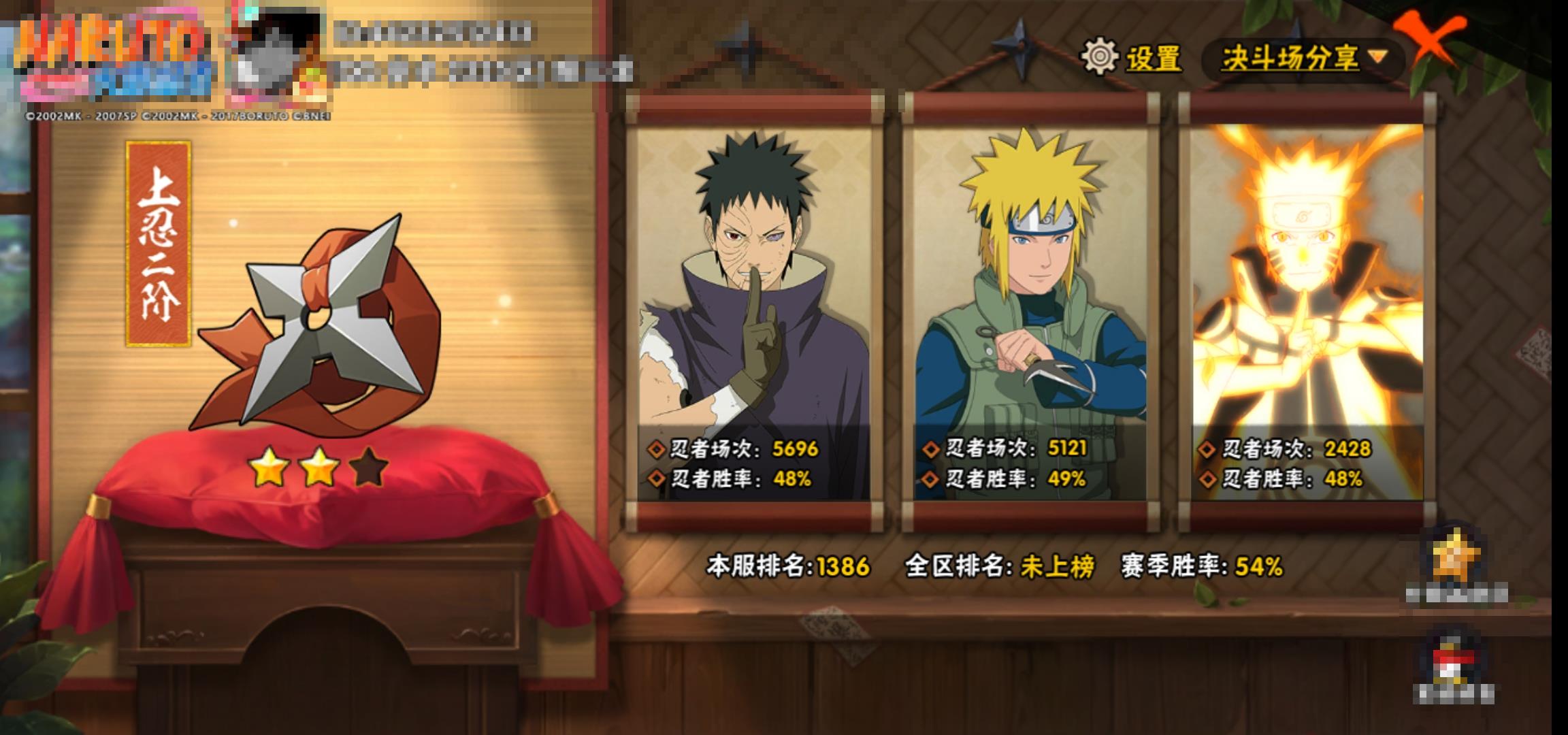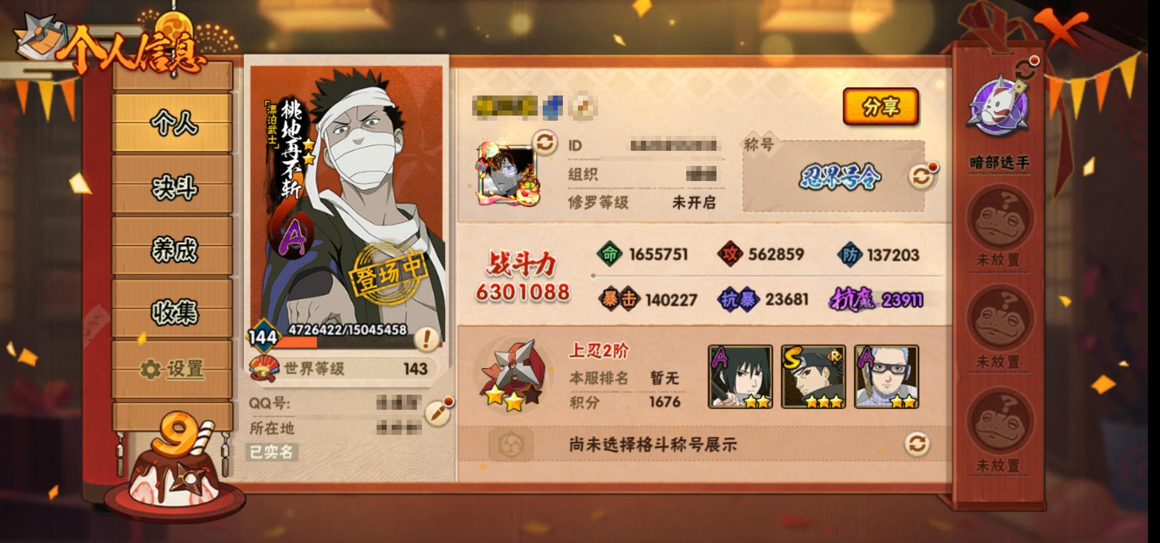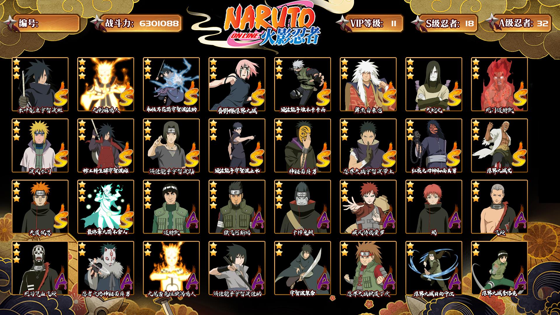 [14593567]0aq834 号 vip11,630w战力,s忍18个,a忍32个,本服排名1484,战区排名未上榜,通灵兽315个,6时装,上忍2阶,忍者星数407