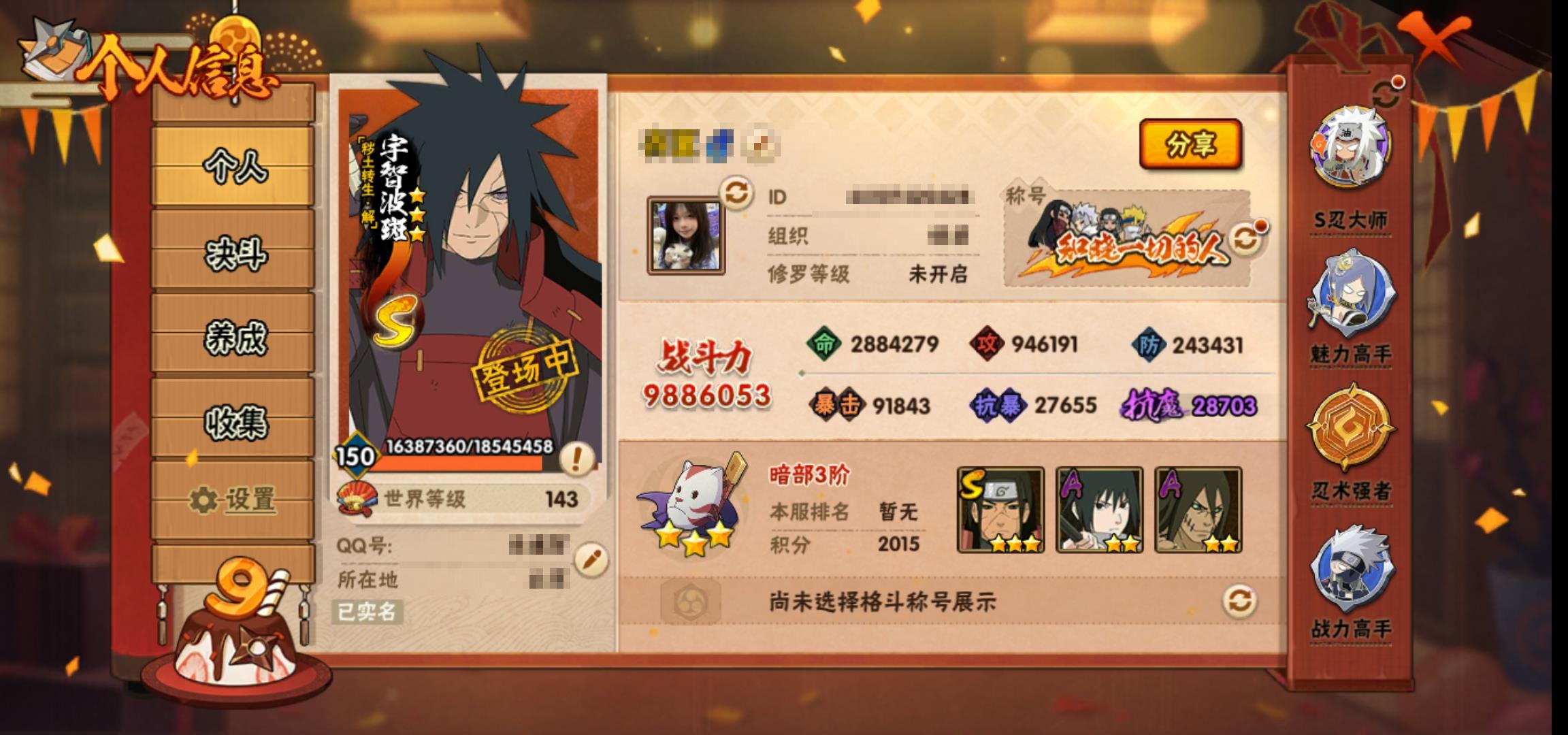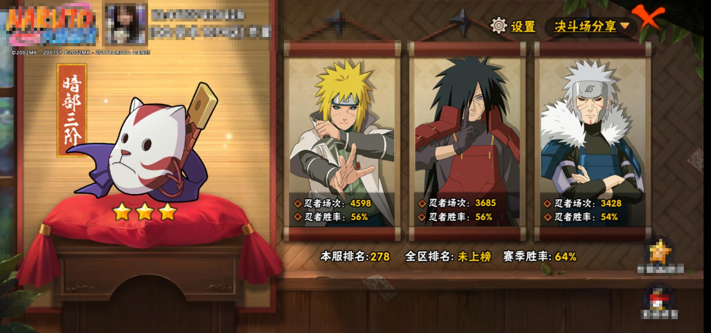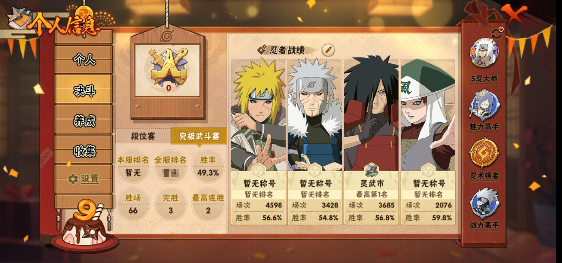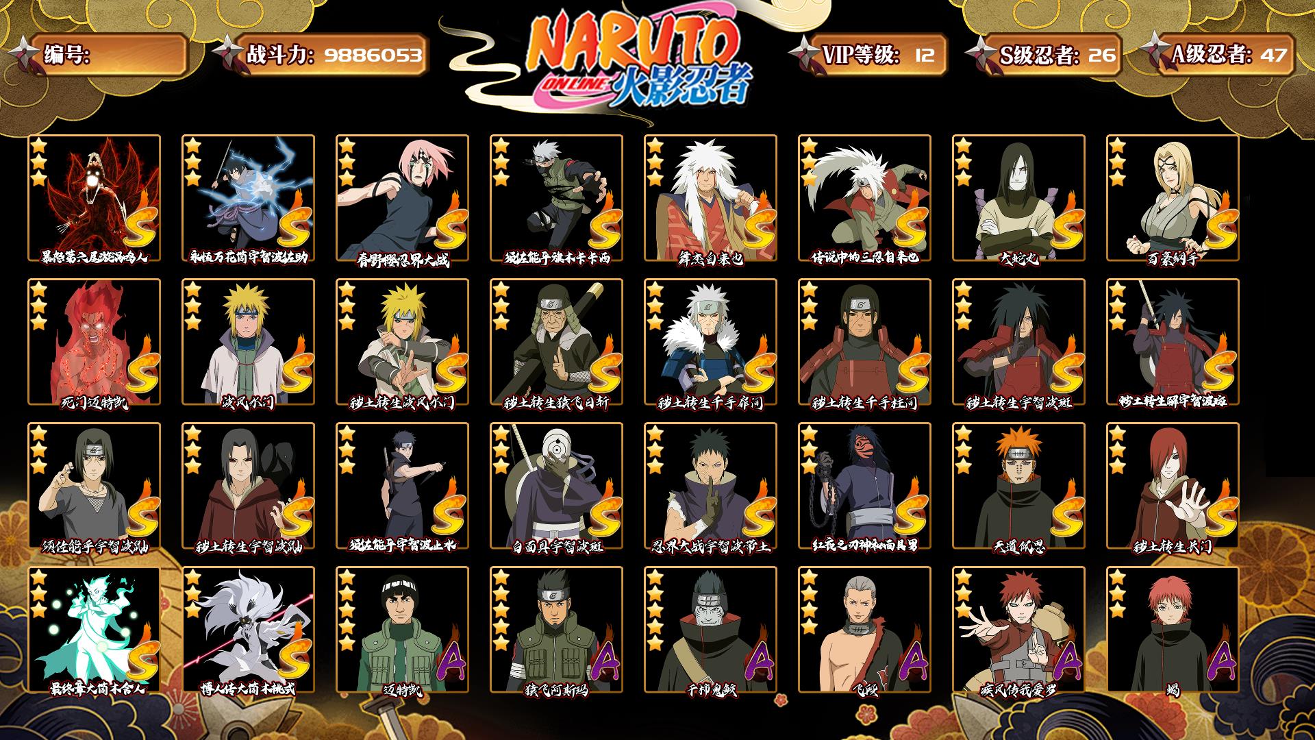 [14593590]0aq83o 号 vip12,988w战力,s忍26个,a忍47个,本服排名551,战区排名未上榜,通灵兽320个,6时装,暗部3阶,忍者星数545