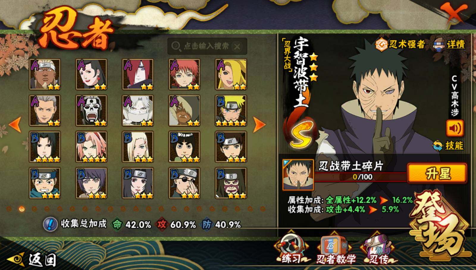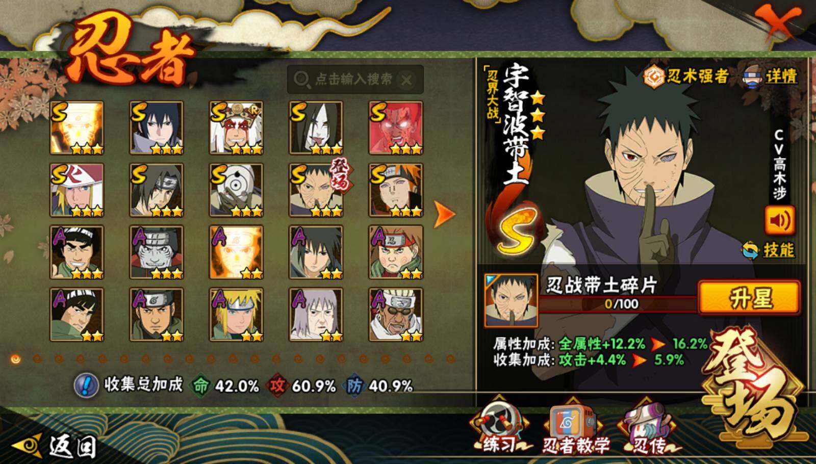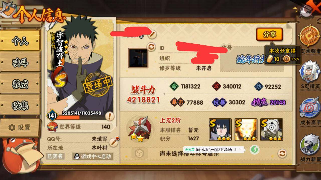 【hyyh797】v1/战力420w/s忍10/a忍19/2星达鲁伊「博人传」/2星飞段「死司凭血」/3星宇智波佐助「永恒万花筒」/2星长门「青年」/3星宇智波带土「忍界大战」/2星蝎/3星佩恩「天道」/3星波风水门/3星漩涡鸣人「九喇嘛连结」/2星秋道丁次「忍界大战」/3星干柿鬼鲛/2星卑留呼「火之意志继承者」/2星波风水门「青年」/3星自来也「舞之豪杰」/3星宇智波斑「白面具」/3星迈特凯「死门」/2星迪达拉「秽土转生」/2星奇拉比/2星飞段/2星猿飞阿斯玛/2星宇智波泉奈/3星大蛇丸/3星迈特凯/2星艾「青年」/2星漩涡鸣人「九尾查克拉」/2星不缘/2星迈特凯「青春爆炸」/2星千代「近松十人卫」/3星宇智波鼬「须佐能乎」