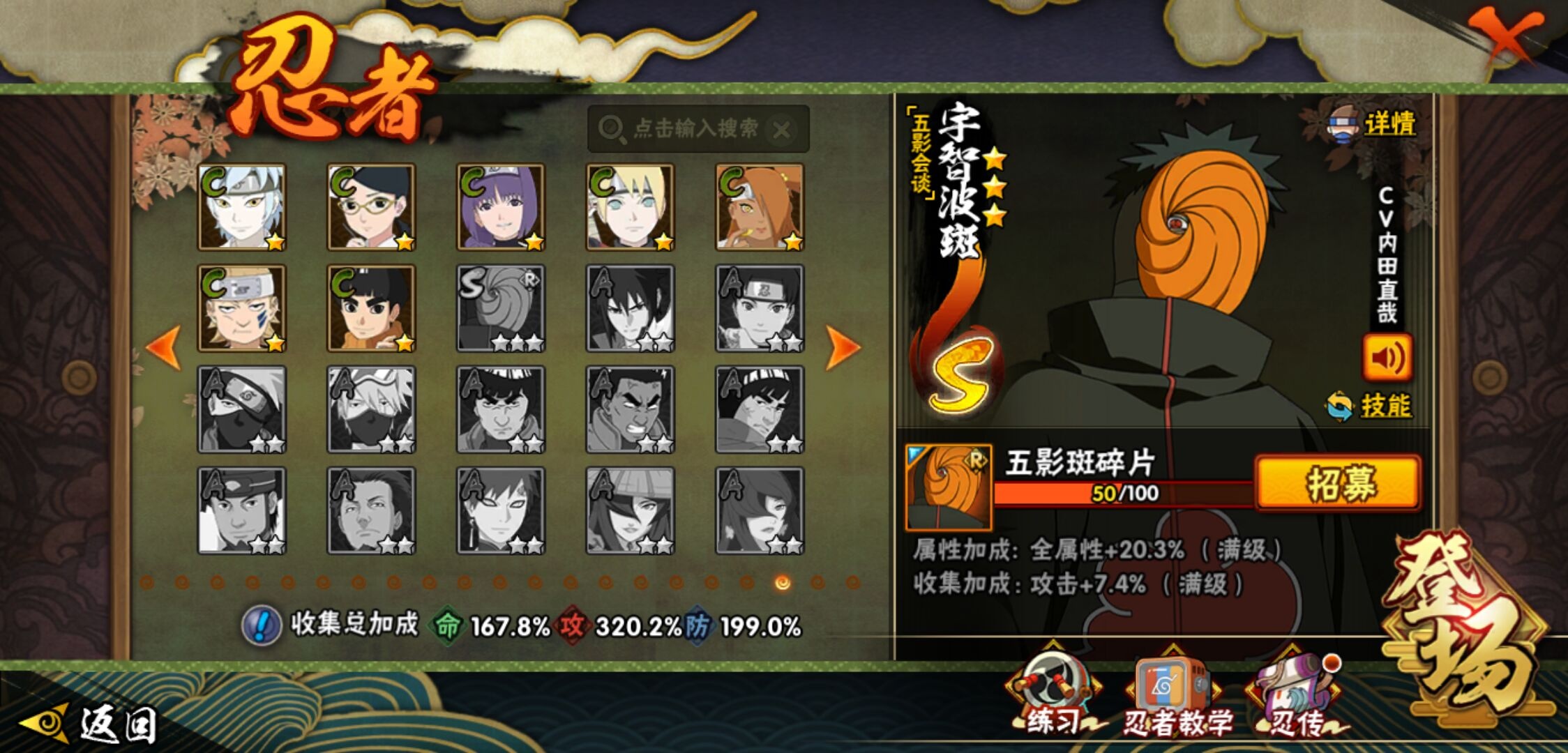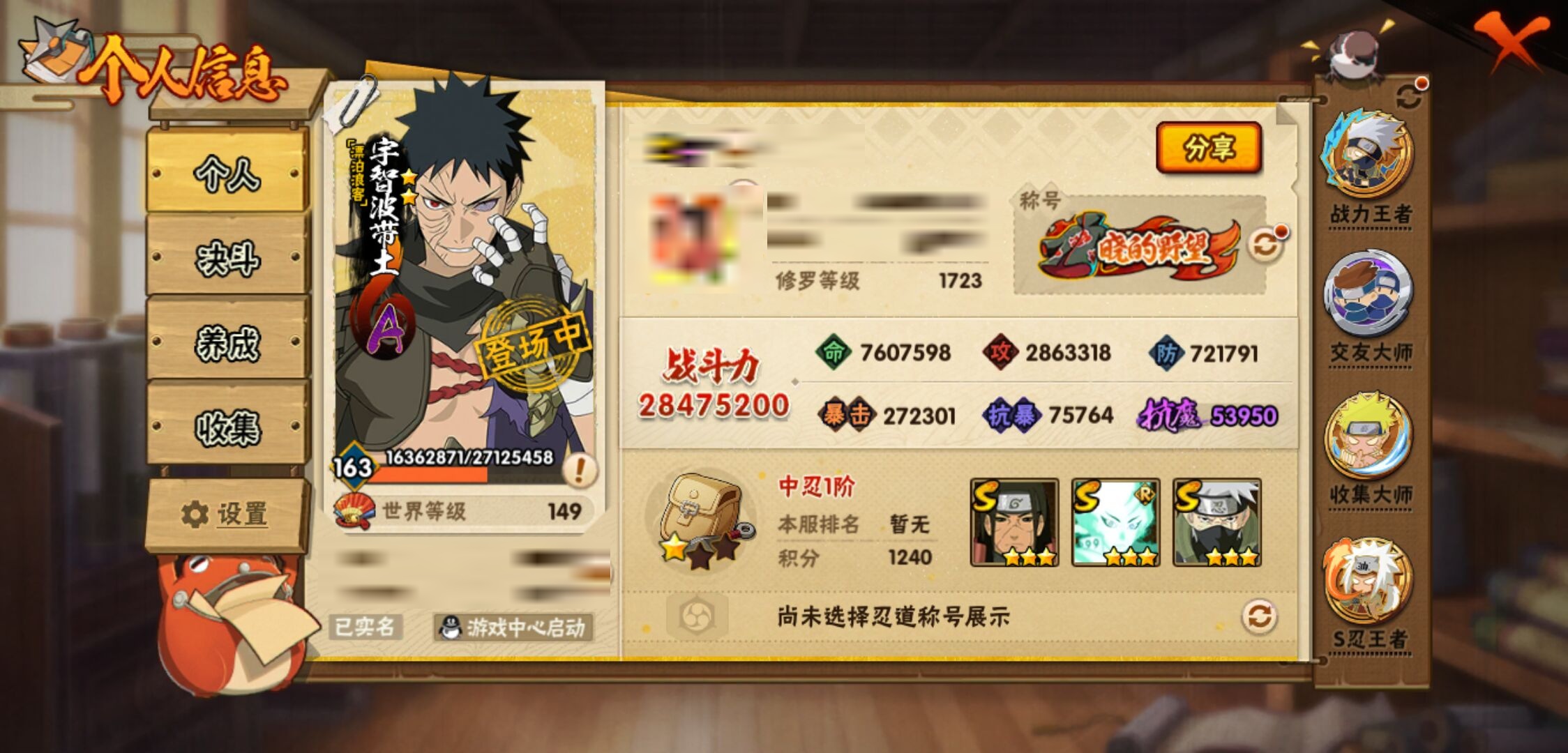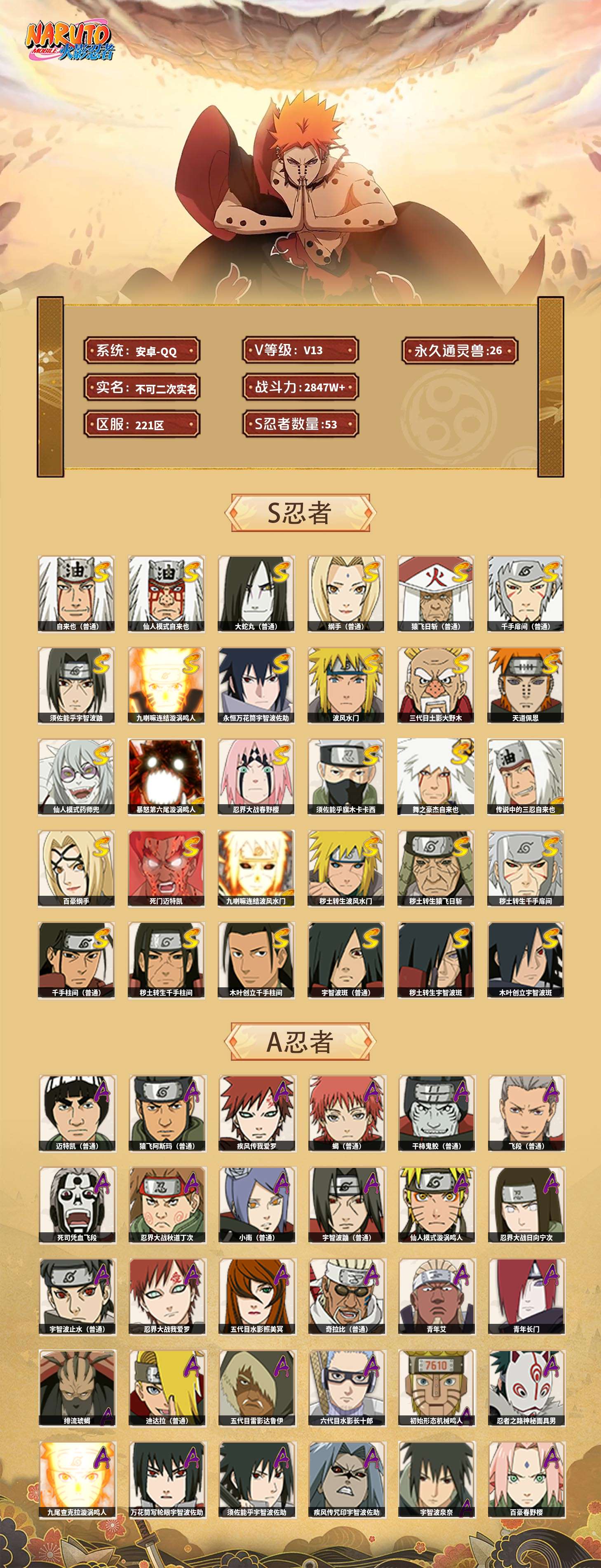 【火影忍者】【lyhy9339】战斗力:2847w;段位:中忍1阶;本服排名:59;vip:v13级;s忍:53个;a忍:71个;通灵兽:26个,s忍:自来也(普通) 5星|仙人模式自来也 5星|大蛇丸(普通) 5星|纲手(普通) 5星|猿飞日斩(普通) 5星|千手扉间(普通) 5星|须佐能乎宇智波鼬 5星|九喇嘛连结漩涡鸣人 4星|永恒万花筒宇智波佐助 4星|波风水门 4星|三代目土影大野木 4星|天道佩恩 4星|仙人模式药师兜 4星|暴怒第六尾漩涡鸣人|忍界大战春野樱|须佐能乎旗木卡卡西|舞之豪杰自来也|传说中的三忍自来也|百豪纲手|死门迈特凯|九喇嘛连结波风水门|秽土转生波风水门|秽土转生猿飞日斩|秽土转生千手扉间|千手柱间(普通)|秽土转生千手柱间|木叶创立千手柱间|宇智波斑(普通)|秽土转生宇智波斑|木叶创立宇智波斑|秽土转生解宇智波斑|秽土转生宇智波鼬|须佐能乎宇智波止水|神秘面具男(普通)|白面具宇智波斑|忍界大战宇智波带土|红夜之刃神秘面具男|四代目风影罗砂|初代目风影烈斗|秽土转生三代目风影|二代目水影鬼灯幻月|四代目雷影艾|忍界大战艾|三代目雷影艾|秽土转生金角银角|二代目土影无|秽土转生半藏|忍界大战大野木|超佩恩天道|秽土转生长门|最终章大筒木舍人|大筒木桃式|博人传大筒木金式__a忍:迈特凯(普通) 5星|猿飞阿斯玛(普通) 5星|疾风传我爱罗 5星|蝎(普通) 5星|干柿鬼鲛(普通) 5星|飞段(普通) 5星|死司凭血飞段 5星|忍界大战秋道丁次 4星|小南(普通) 4星|宇智波鼬(普通) 4星|仙人模式漩涡鸣人 3星|忍界大战日向宁次 3星|宇智波止水(普通) 3星|忍界大战我爱罗 3星|五代目水影照美冥 3星|奇拉比(普通) 3星|青年艾 3星|青年长门 3星|绯流琥蝎 3星|迪达拉(普通) 3星|五代目雷影达鲁伊 3星|六代目水影长十郎 3星|初始形态机械鸣人|忍者之路神秘面具男|九尾查克拉漩涡鸣人|万花筒写轮眼宇智波佐助|须佐能乎宇智波佐助|疾风传咒印宇智波佐助|宇智波泉奈|百豪春野樱|忍界大战李洛克|最终章日向雏田|幻之真容旗木卡卡西|万花筒写轮眼旗木卡卡西|忍界大战旗木卡卡西|秽土转生猿飞阿斯玛|地陆|新春限定宇智波止水|志村团藏|火影继承人猿飞日斩|新春限定波风水门|青年波风水门|忍界大战勘九郎|近松十人卫千代|桃地再不斩|漂泊武士桃地再不斩|秽土转生桃地再不斩|忍界大战奇拉比|半蛇斗篷药师兜|不风|不缘|不动|夏日泳装小南|新春限定小南|绝|角都(普通)|晓创生角都|地怨虞角都|秽土转生角都|晓大蛇丸|新春限定宇智波鼬|秽土转生迪达拉|新春限定迪达拉|阿飞|暴怒宇智波带土|漂泊浪客宇智波带土|加藤断|羁绊神农|木叶上忍猿飞木叶丸|桃式显现漩涡博人|四代目土影黑土__通灵兽:忍犬(普通)|蓝蛇|蛤蟆吉|忍龟|镰鼬|猿魔|山椒鱼|蜃|蛤蟆仙人|鲛鲨|蛤蟆健|乌鸦(普通)|蛞蝓(普通)|蛤蟆龙|蛤蟆广|梦貘|鹰|蜘蛛|怒鬼(普通)|砂之守鹤|怒鬼无臂|怒鬼爪|辛牙|熊猫|变色龙|万蛇