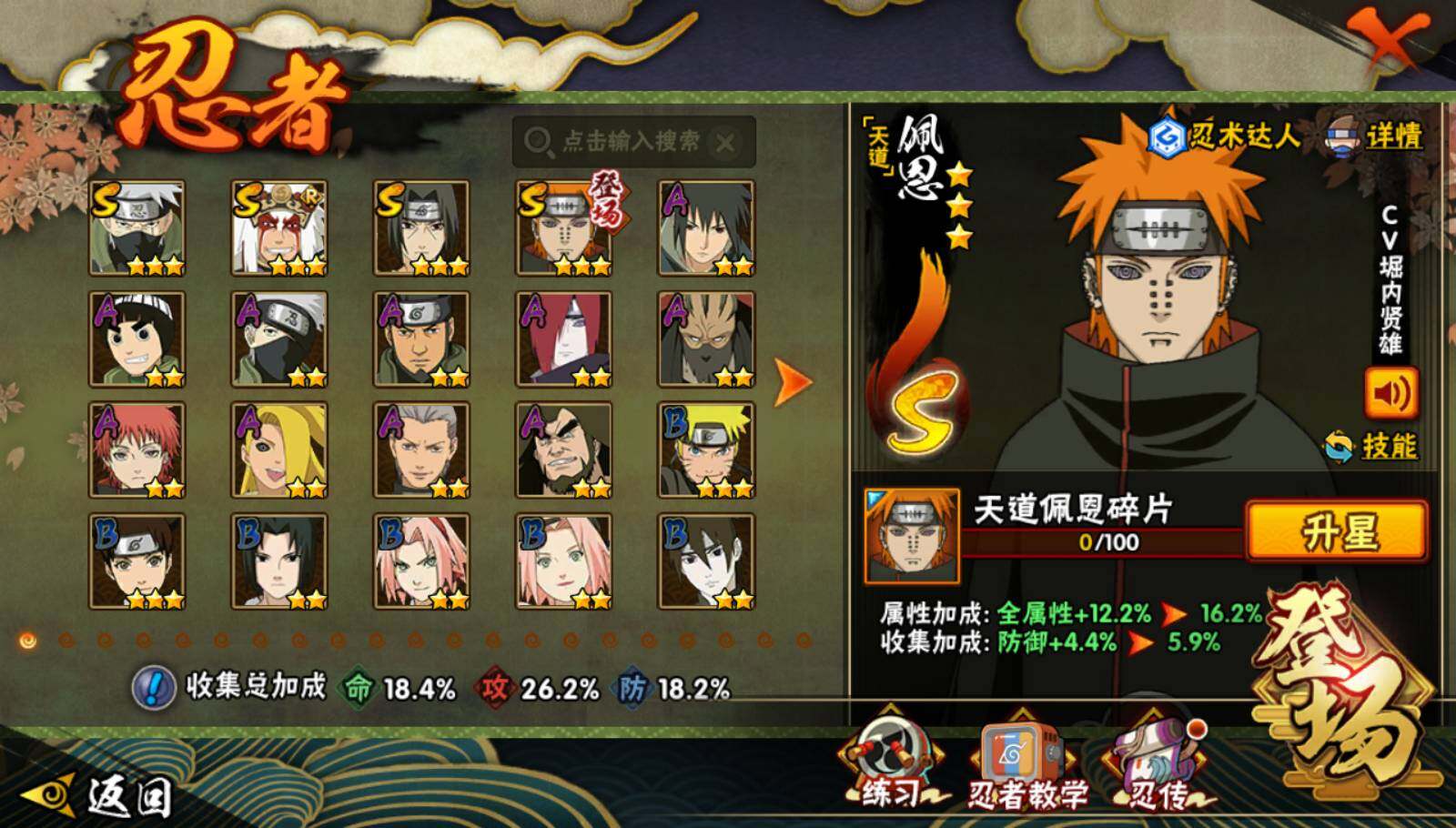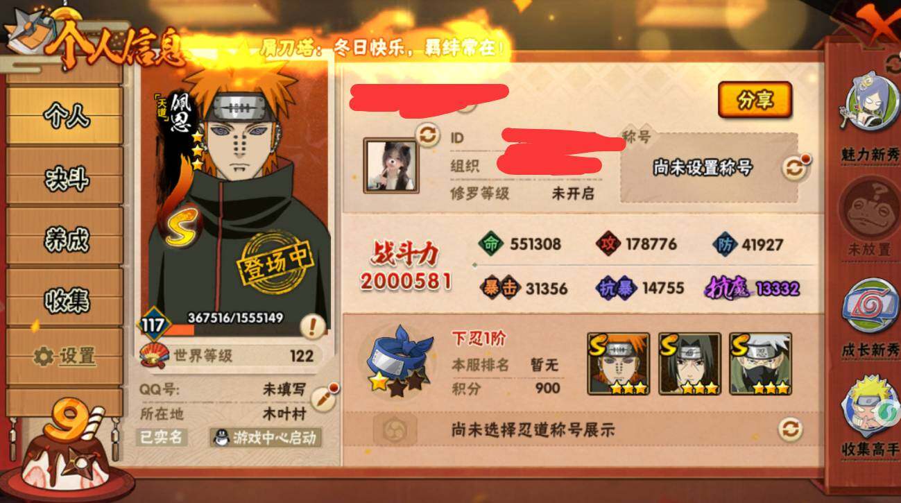 【hyyh799】v4/战力500w/s忍4/a忍10/3星自来也「舞之豪杰」/2星旗木卡卡西「忍界大战」/3星旗木卡卡西「须佐能乎」/2星长门「青年」/2星迪达拉「秽土转生」/2星蝎/3星佩恩「天道」/2星飞段/2星神农「羁绊」/2星猿飞阿斯玛/2星宇智波泉奈/2星李洛克「忍界大战」/3星宇智波鼬「须佐能乎」/2星蝎「绯流琥」