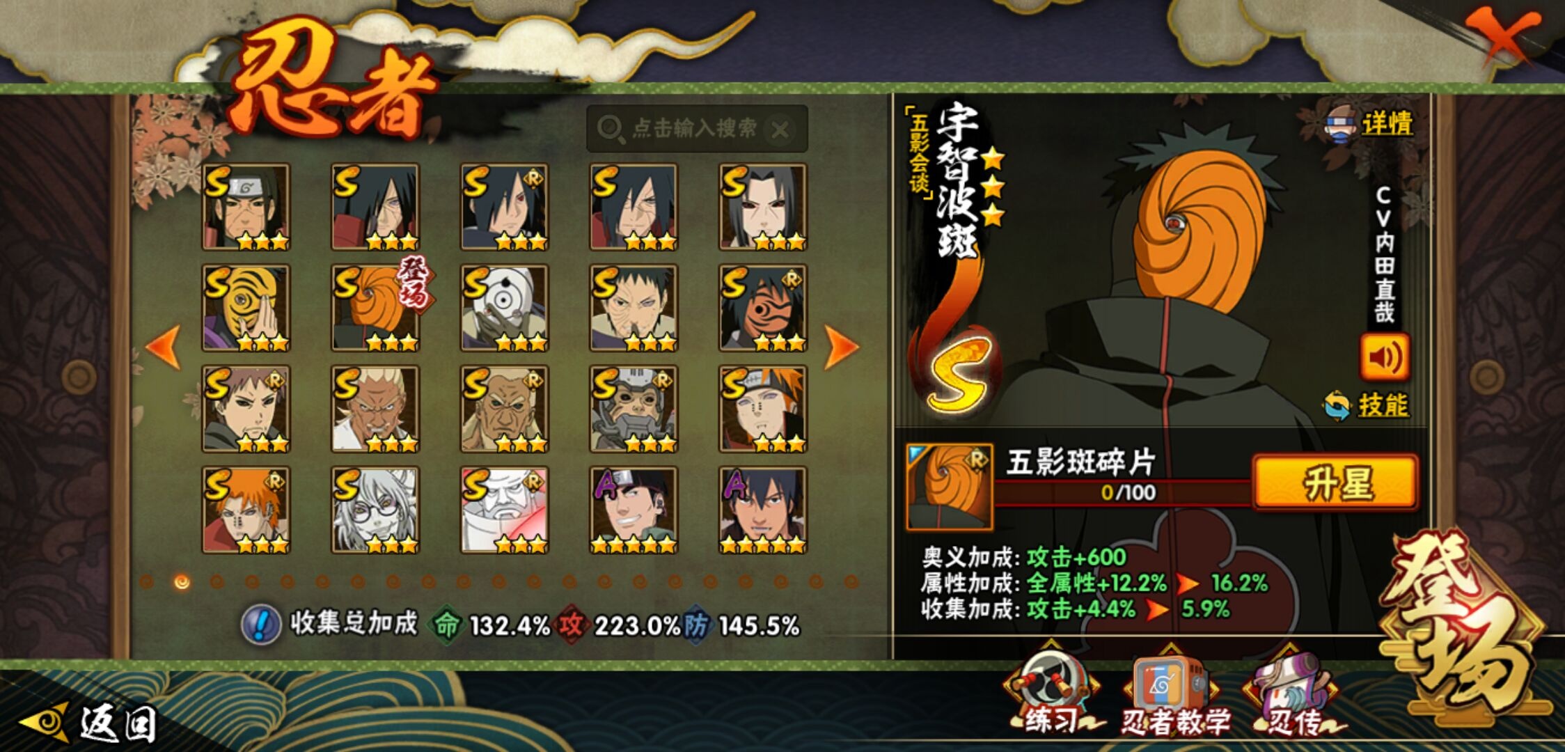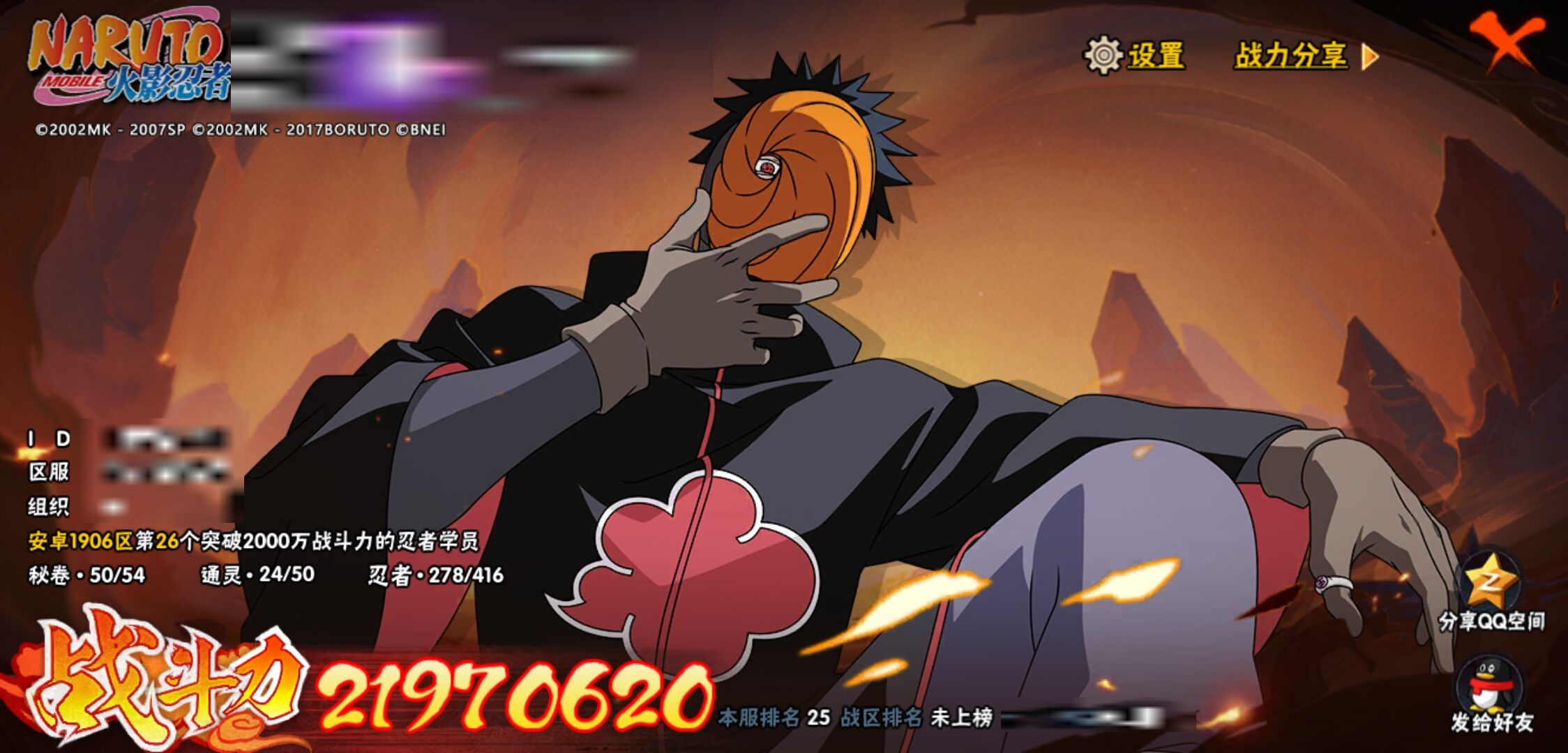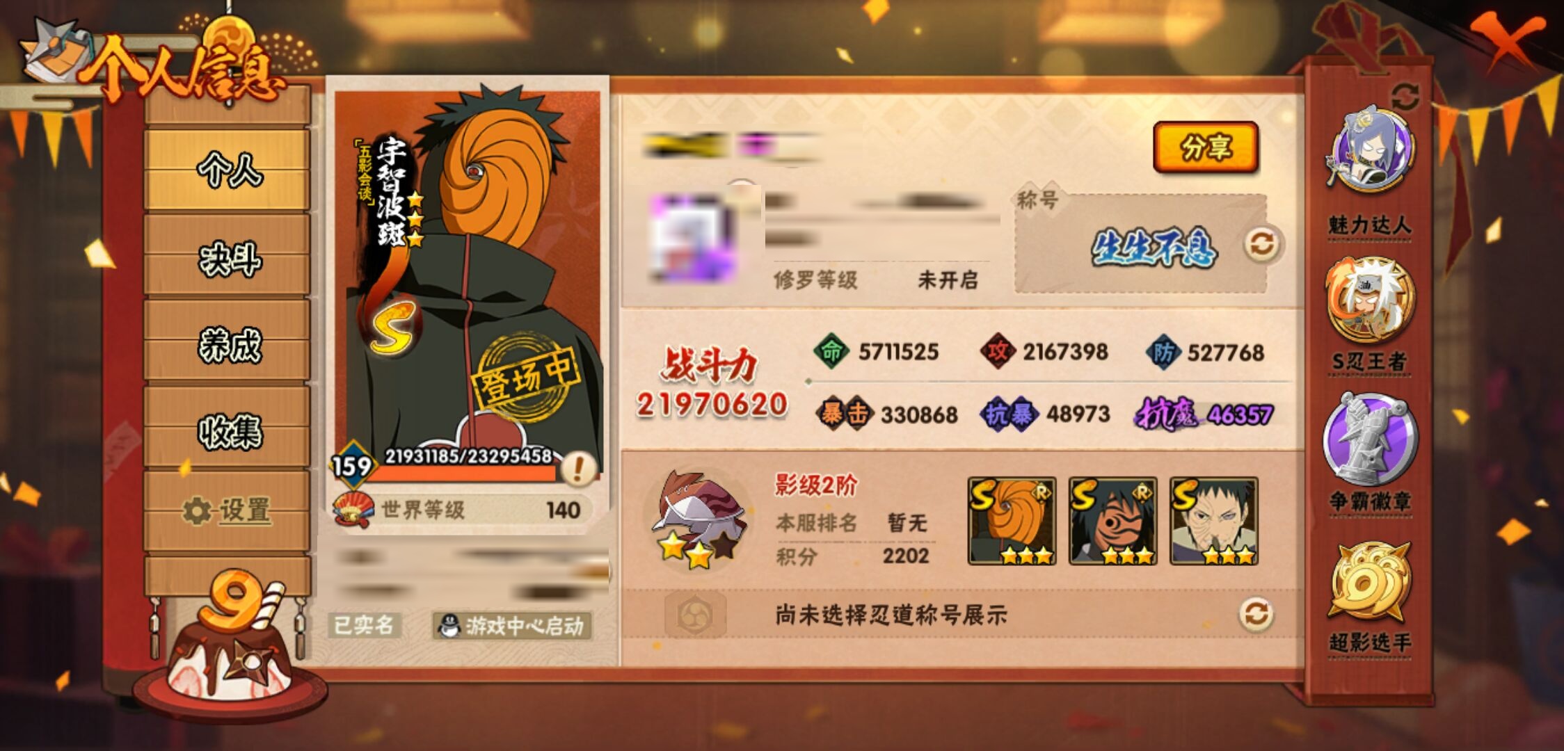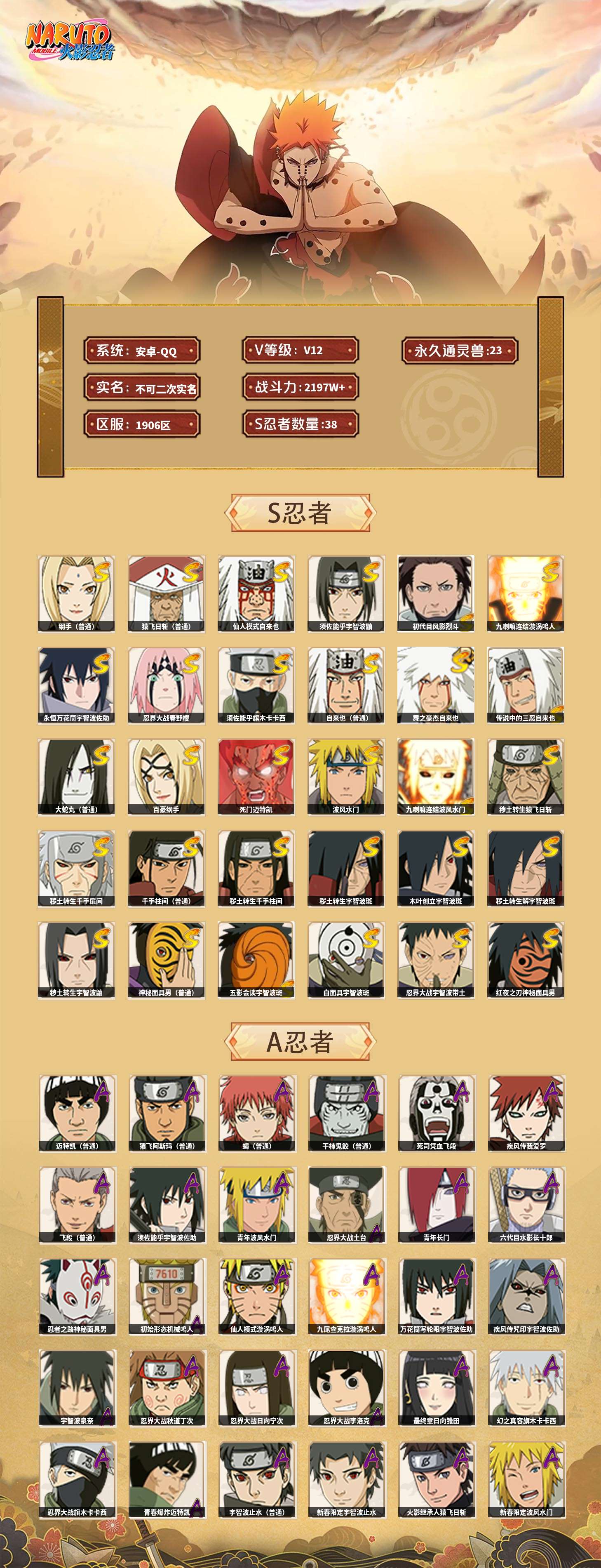 【火影忍者】【lyhy9343】战斗力:2197w;段位:影级2阶;本服排名:25;vip:v12级;s忍:38个;a忍:64个;通灵兽:23个,s忍:纲手(普通) 5星|猿飞日斩(普通) 5星|仙人模式自来也 4星|须佐能乎宇智波鼬 4星|初代目风影烈斗 4星|九喇嘛连结漩涡鸣人|永恒万花筒宇智波佐助|忍界大战春野樱|须佐能乎旗木卡卡西|自来也(普通)|舞之豪杰自来也|传说中的三忍自来也|大蛇丸(普通)|百豪纲手|死门迈特凯|波风水门|九喇嘛连结波风水门|秽土转生猿飞日斩|秽土转生千手扉间|千手柱间(普通)|秽土转生千手柱间|秽土转生宇智波斑|木叶创立宇智波斑|秽土转生解宇智波斑|秽土转生宇智波鼬|神秘面具男(普通)|五影会谈宇智波斑|白面具宇智波斑|忍界大战宇智波带土|红夜之刃神秘面具男|四代目风影罗砂|忍界大战艾|三代目雷影艾|秽土转生半藏|天道佩恩|超佩恩天道|仙人模式药师兜|博人传大筒木金式__a忍:迈特凯(普通) 5星|猿飞阿斯玛(普通) 5星|蝎(普通) 5星|干柿鬼鲛(普通) 5星|死司凭血飞段 5星|疾风传我爱罗 4星|飞段(普通) 4星|须佐能乎宇智波佐助 3星|青年波风水门 3星|忍界大战土台 3星|青年长门 3星|六代目水影长十郎 3星|忍者之路神秘面具男|初始形态机械鸣人|仙人模式漩涡鸣人|九尾查克拉漩涡鸣人|万花筒写轮眼宇智波佐助|疾风传咒印宇智波佐助|宇智波泉奈|忍界大战秋道丁次|忍界大战日向宁次|忍界大战李洛克|最终章日向雏田|幻之真容旗木卡卡西|忍界大战旗木卡卡西|青春爆炸迈特凯|宇智波止水(普通)|新春限定宇智波止水|火影继承人猿飞日斩|新春限定波风水门|忍界大战我爱罗|近松十人卫千代|夏日泳装照美冥|五代目水影照美冥|秽土转生桃地再不斩|忍界大战奇拉比|奇拉比(普通)|青年艾|三船(普通)|妖怪奇谭纲手|漂泊武士千手扉间|半蛇斗篷药师兜|不风|不缘|小南(普通)|夏日泳装小南|漂泊浪客小南|地怨虞角都|秽土转生角都|晓大蛇丸|绯流琥蝎|宇智波鼬(普通)|新春限定宇智波鼬|迪达拉(普通)|秽土转生迪达拉|恶灵之影飞段|暴怒宇智波带土|侠隐江湖大野木|火之意志继承者卑留呼|木叶上忍猿飞木叶丸|桃式显现漩涡博人|五代目雷影达鲁伊|仙人模式巳月|四代目土影黑土__通灵兽:忍犬(普通)|蓝蛇|蛤蟆吉|忍龟|熊猫|镰鼬|猿魔|蛞蝓(普通)|山椒鱼|蜃|蛤蟆仙人|鲛鲨|蛤蟆健|乌鸦(普通)|砂之守鹤|蛤蟆龙|怒鬼(普通)|怒鬼爪|蛤蟆广|梦貘|鹰|辛牙|蜘蛛