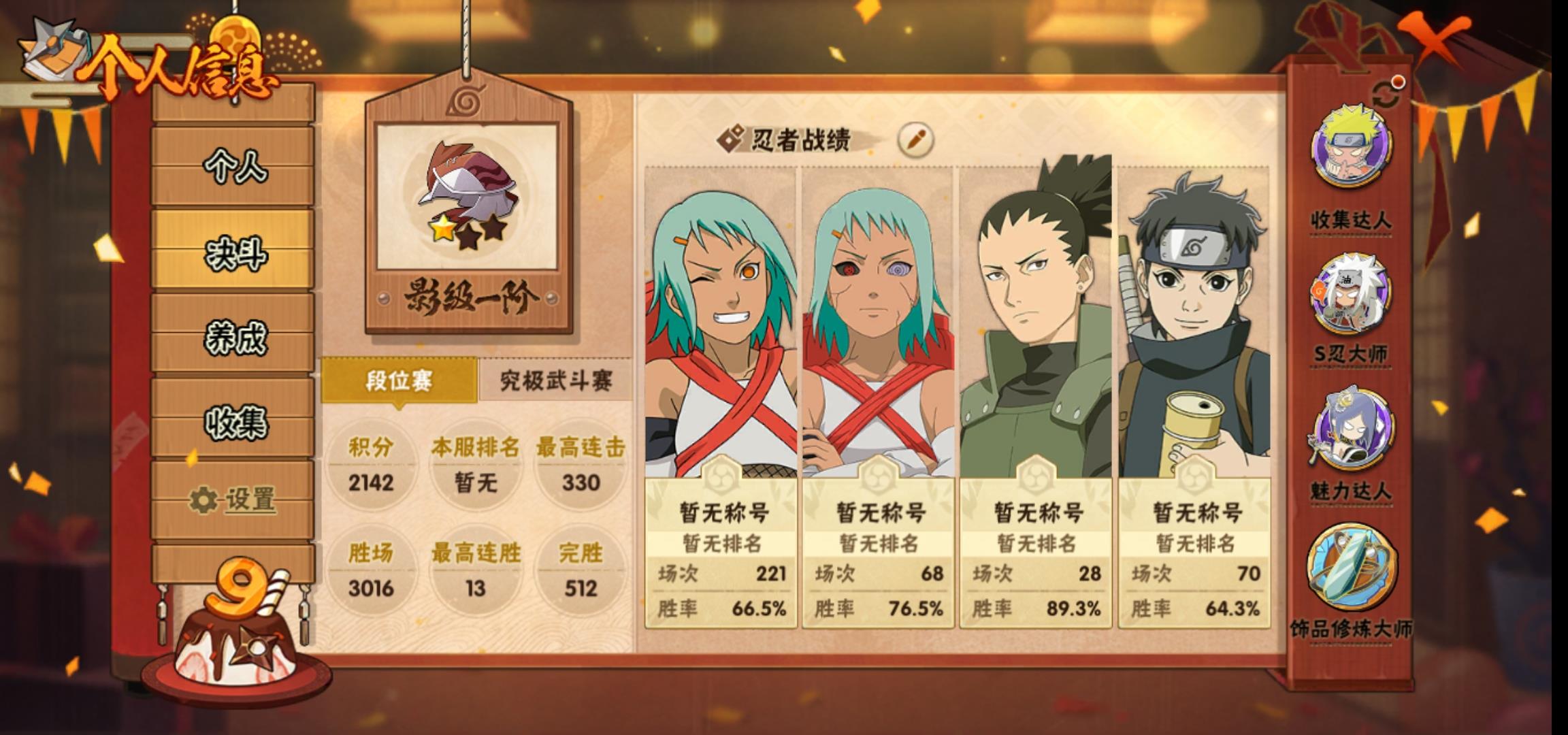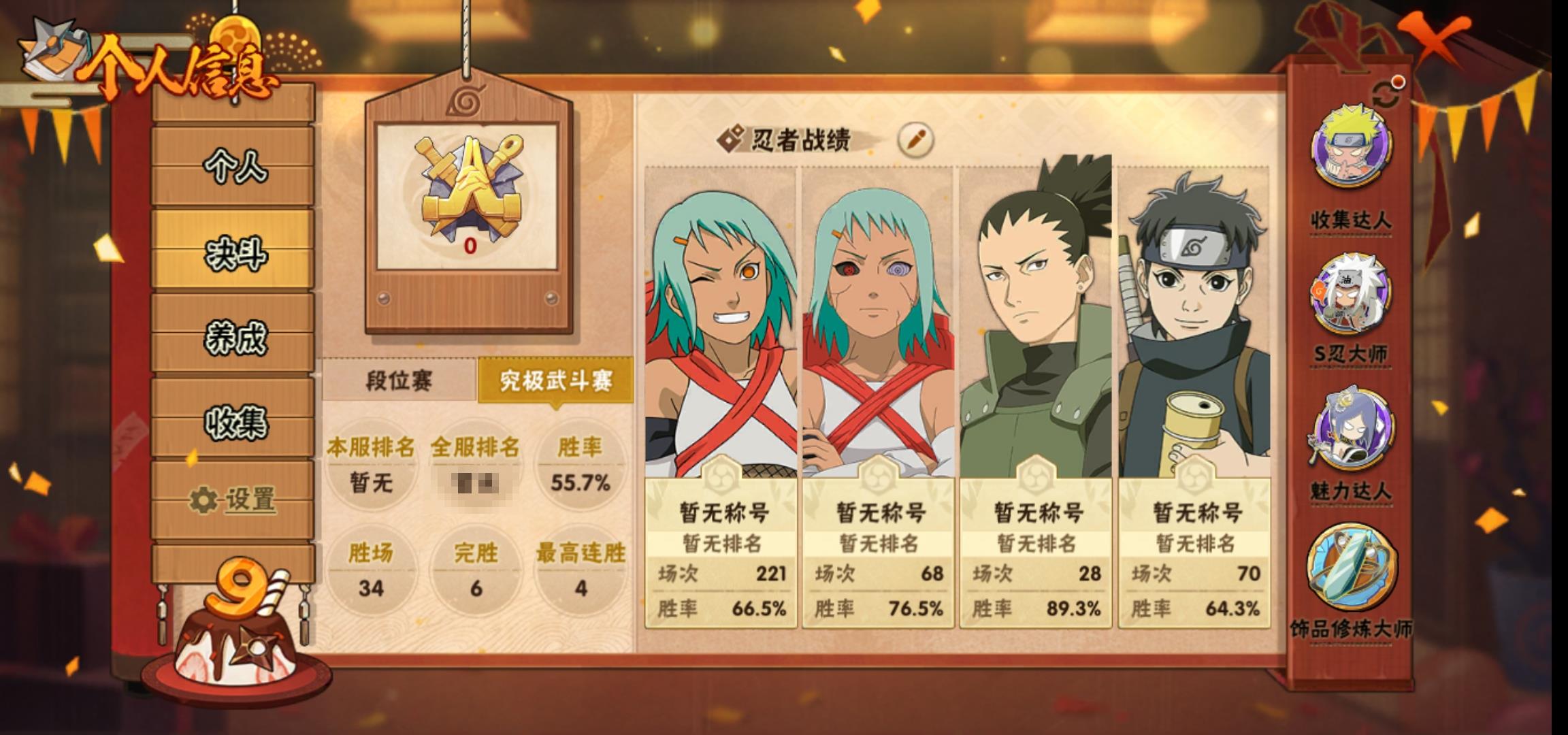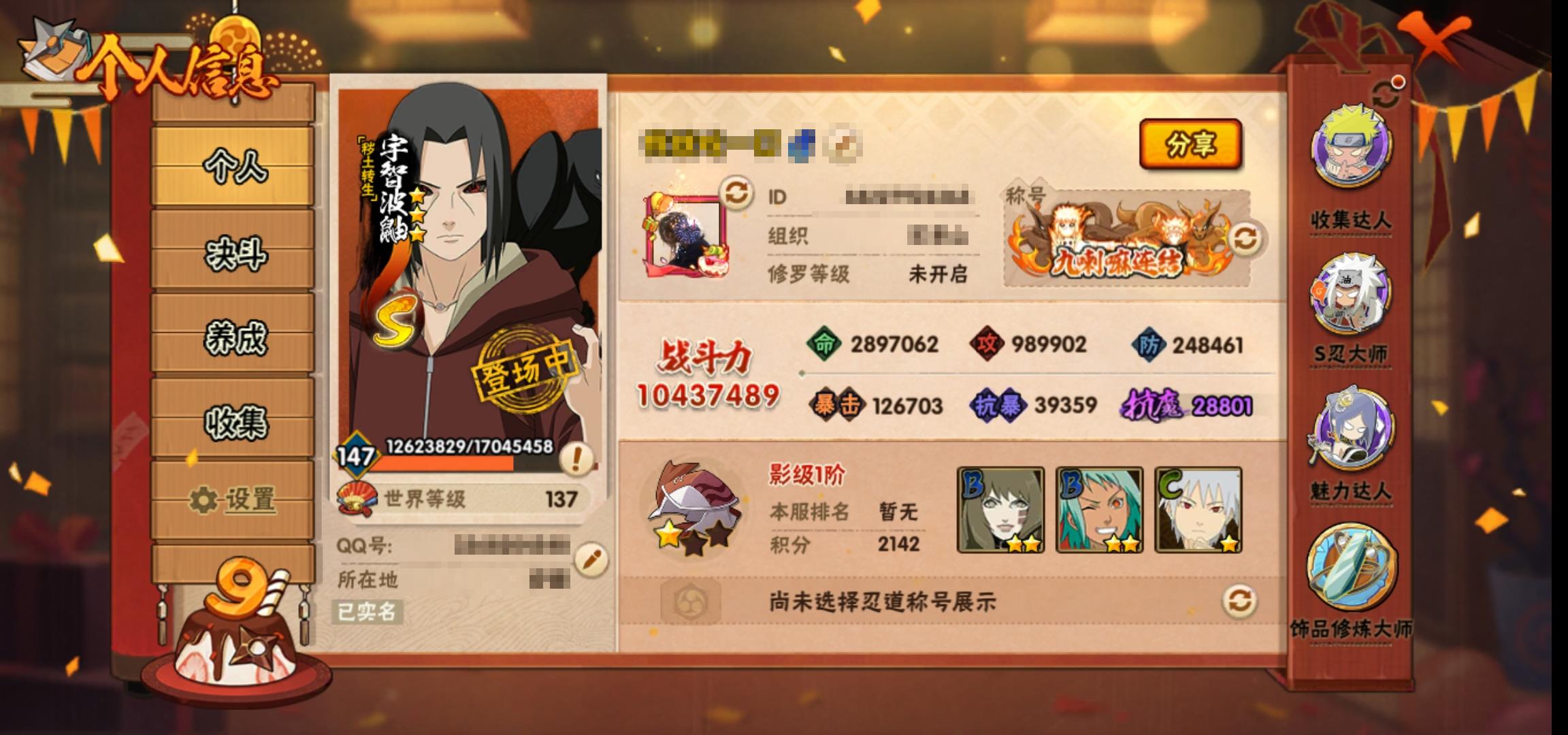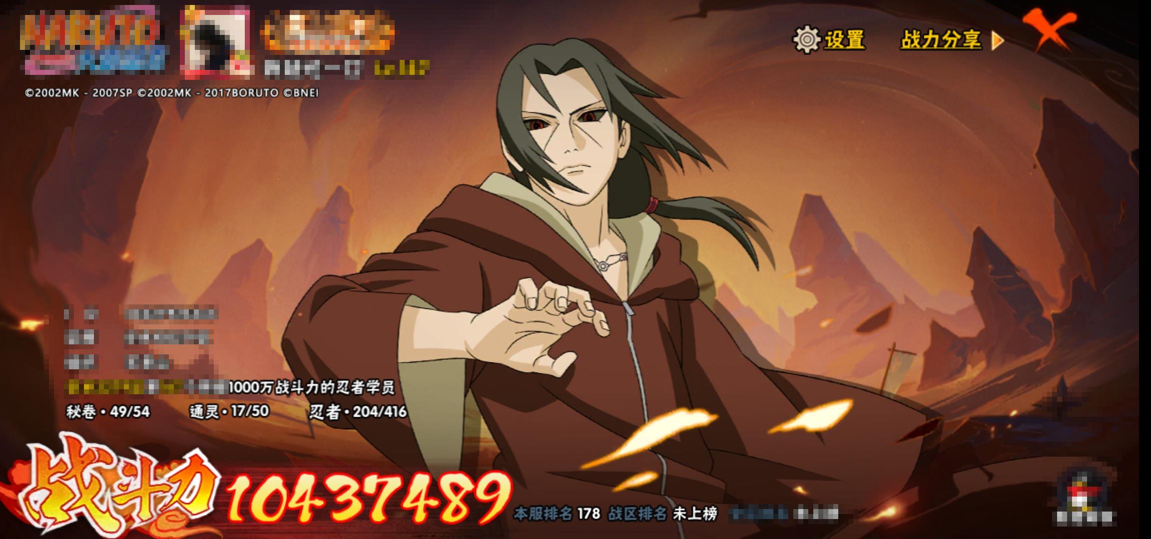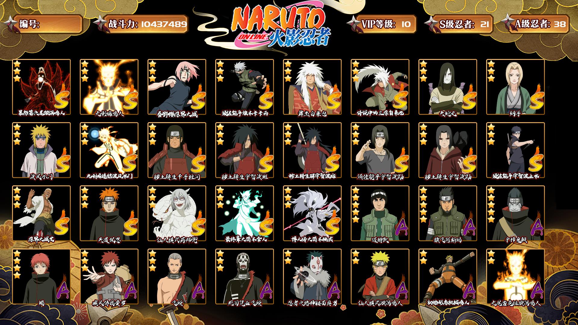 [14629213]0aqeks 号 vip10,1043w战力,s忍21个,a忍38个,本服排名178,战区排名未上榜,通灵兽317个,7时装,影级1阶,忍者星数516