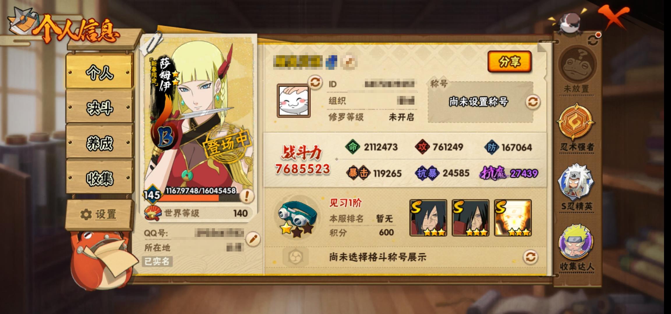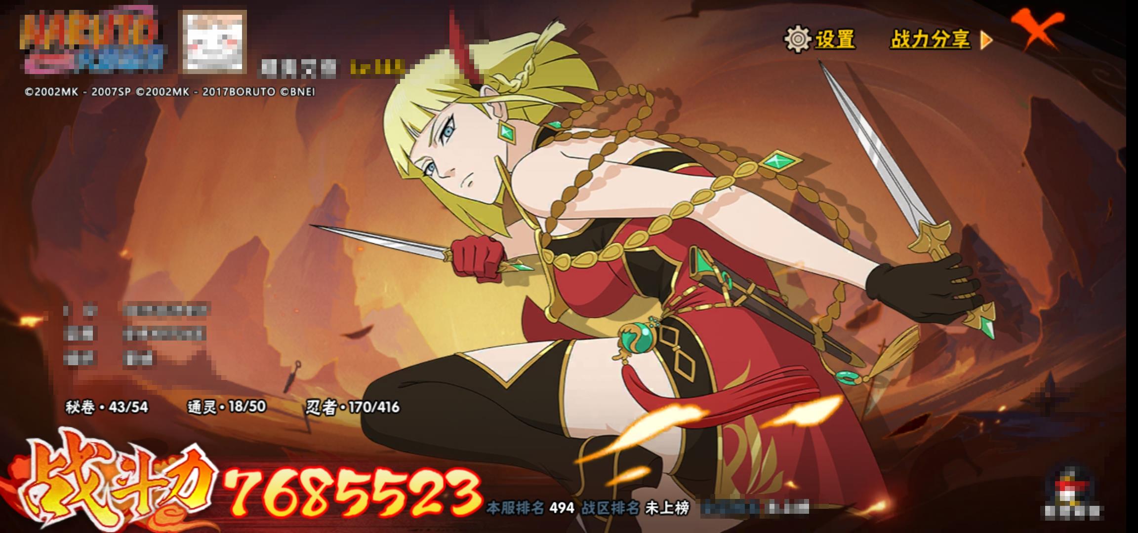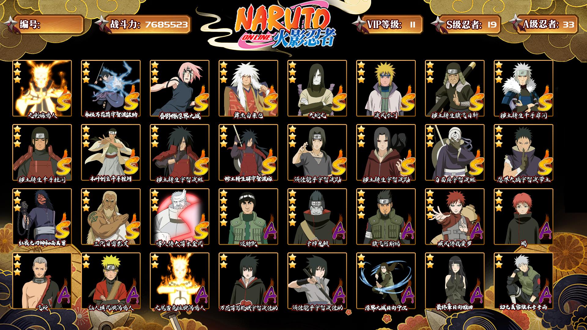 [14629245]0aqekx 号 vip11,768w战力,s忍19个,a忍33个,本服排名494,战区排名未上榜,通灵兽318个,6时装,见习1阶,忍者星数424
