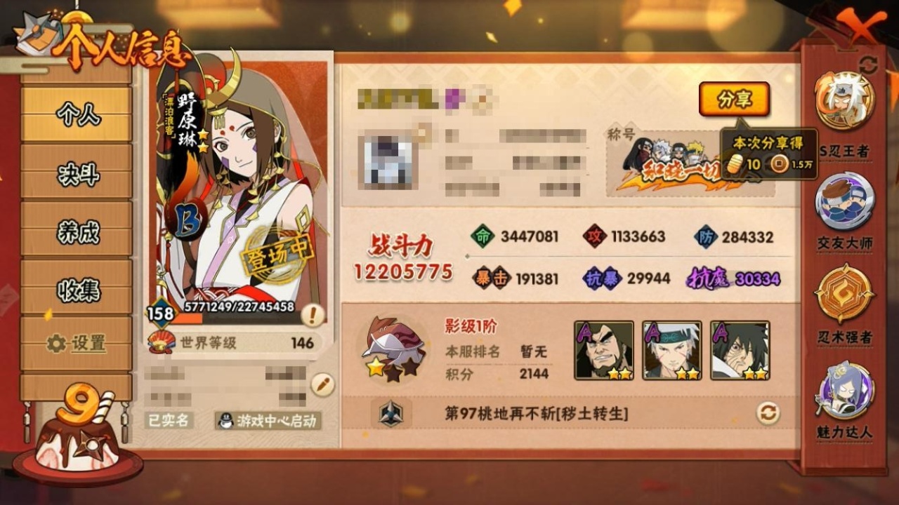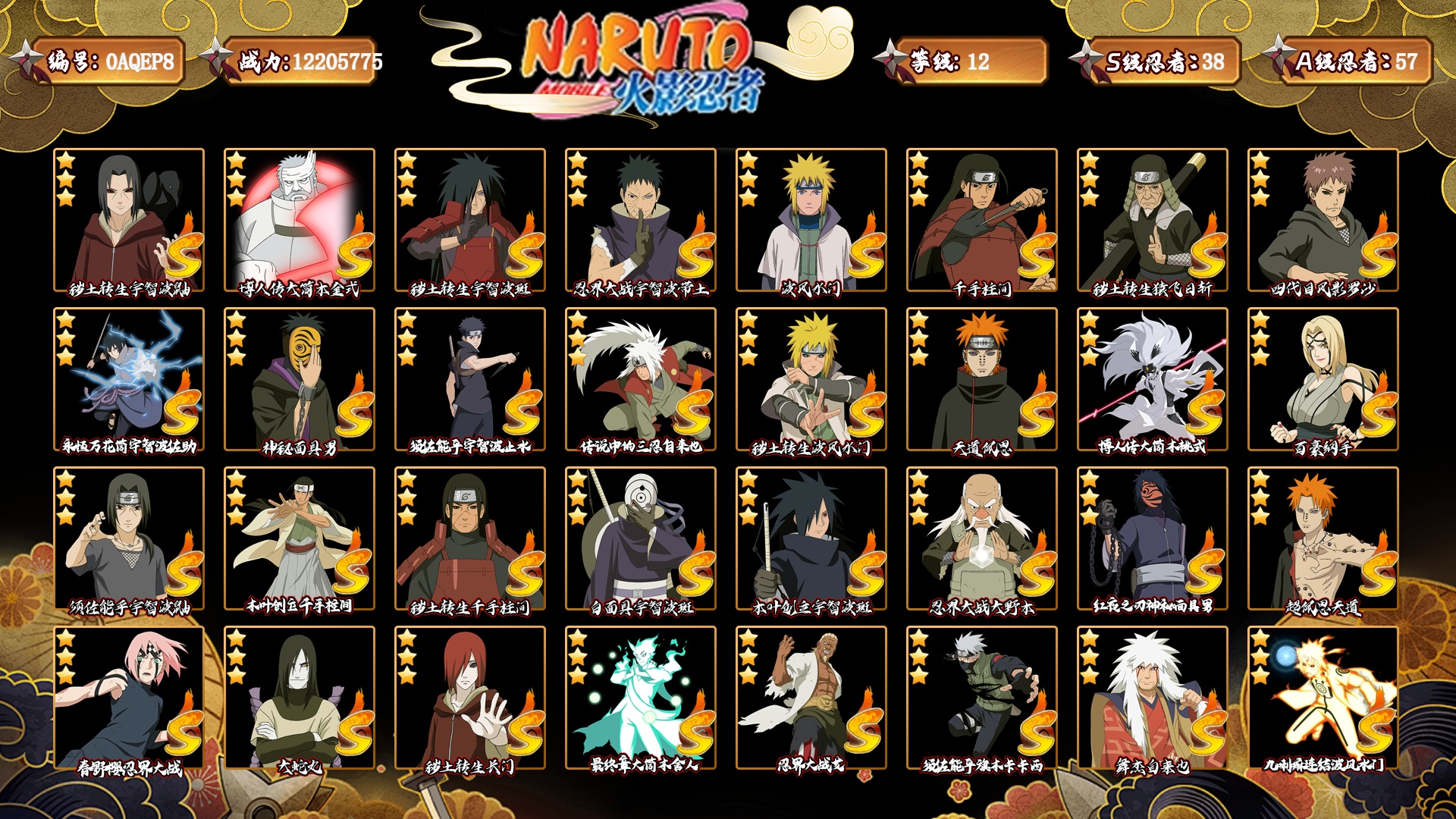 [14630379]0aqep8 号,vip12,战力:12205775,s忍者数量:38,a忍者数量:57,本服排名:372,战区排名:未上榜,通灵兽数量:22,时装数:15,段位:影级1阶,忍者星数:649