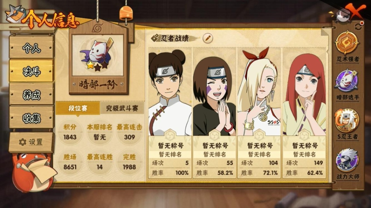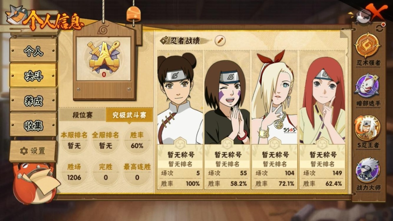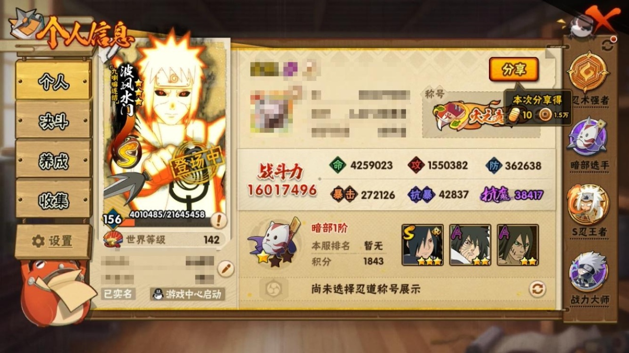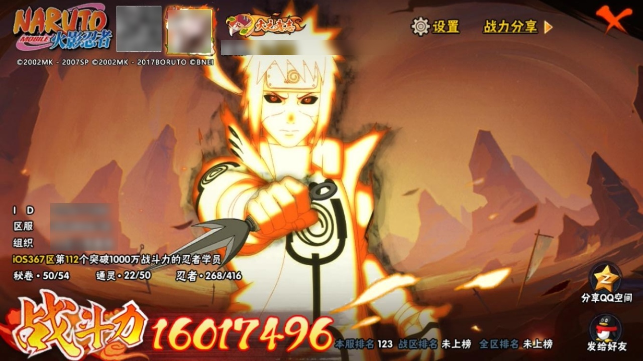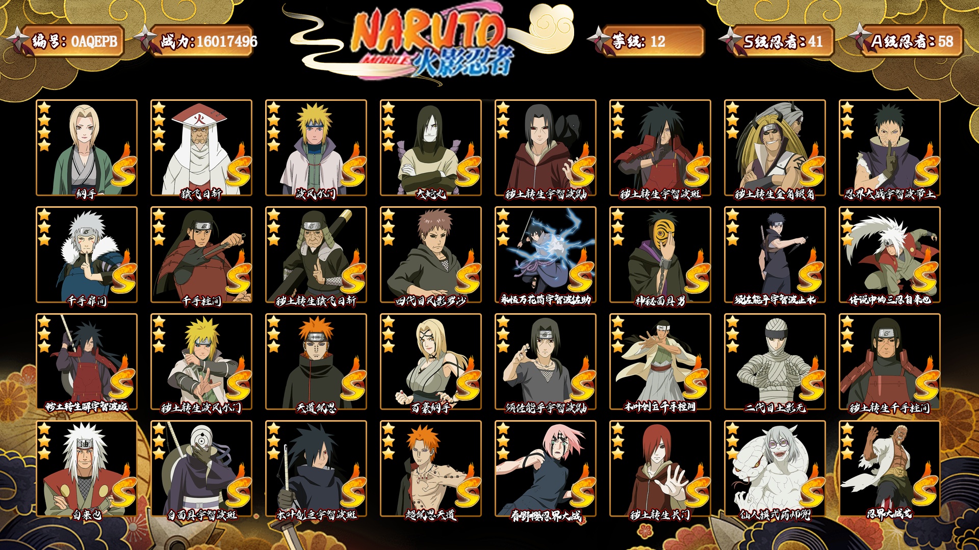 [14630411]0aqepb 号,vip12,战力:16017496,s忍者数量:41,a忍者数量:58,本服排名:123,战区排名:未上榜,通灵兽数量:22,时装数:20,段位:暗部1阶,忍者星数:708