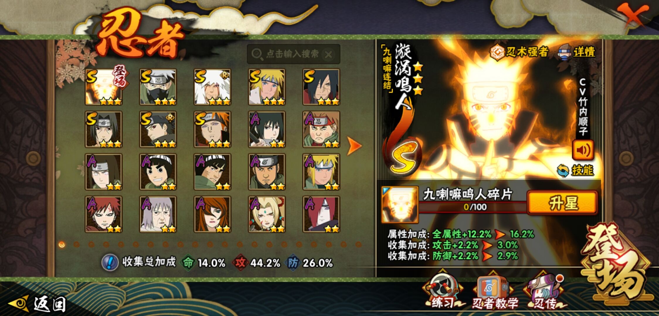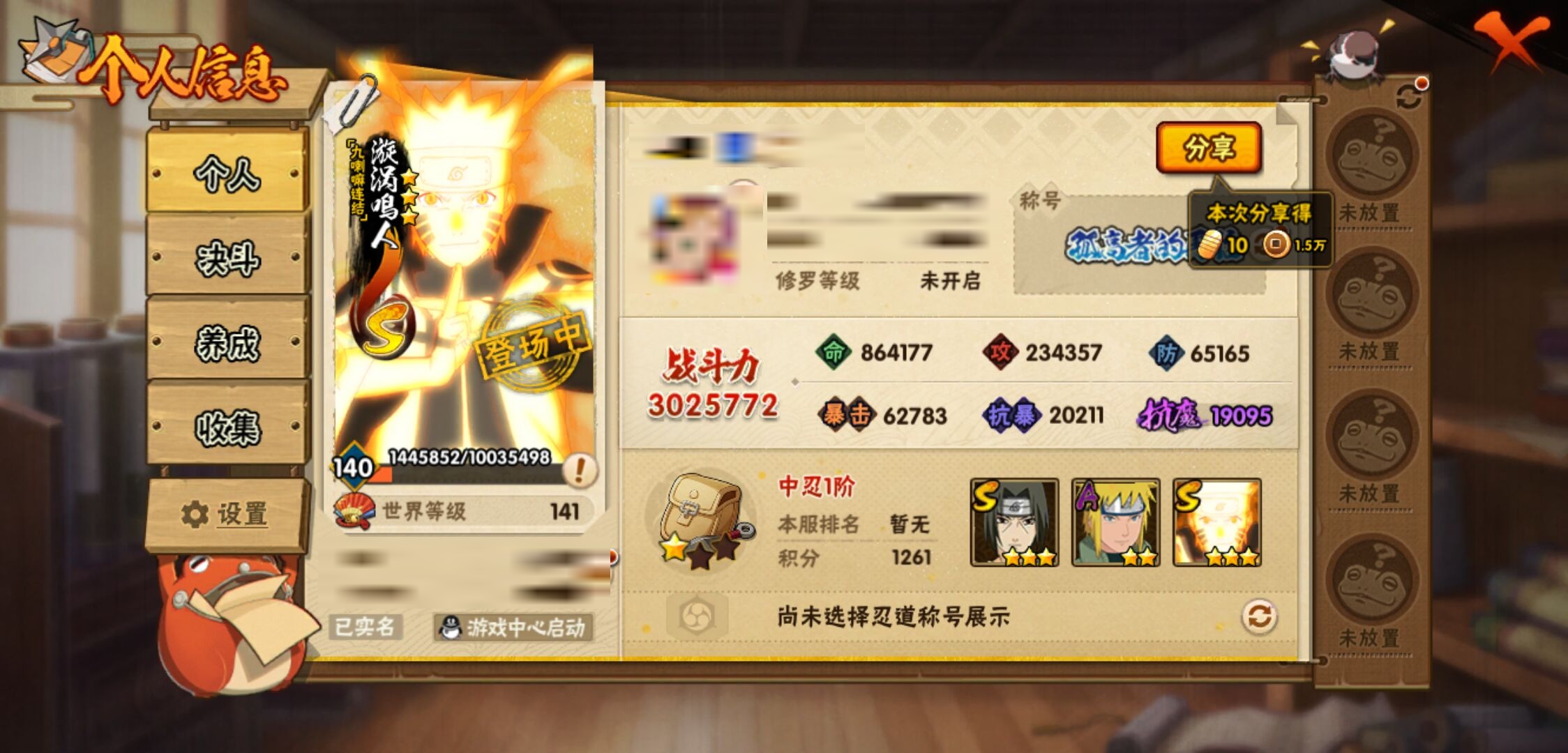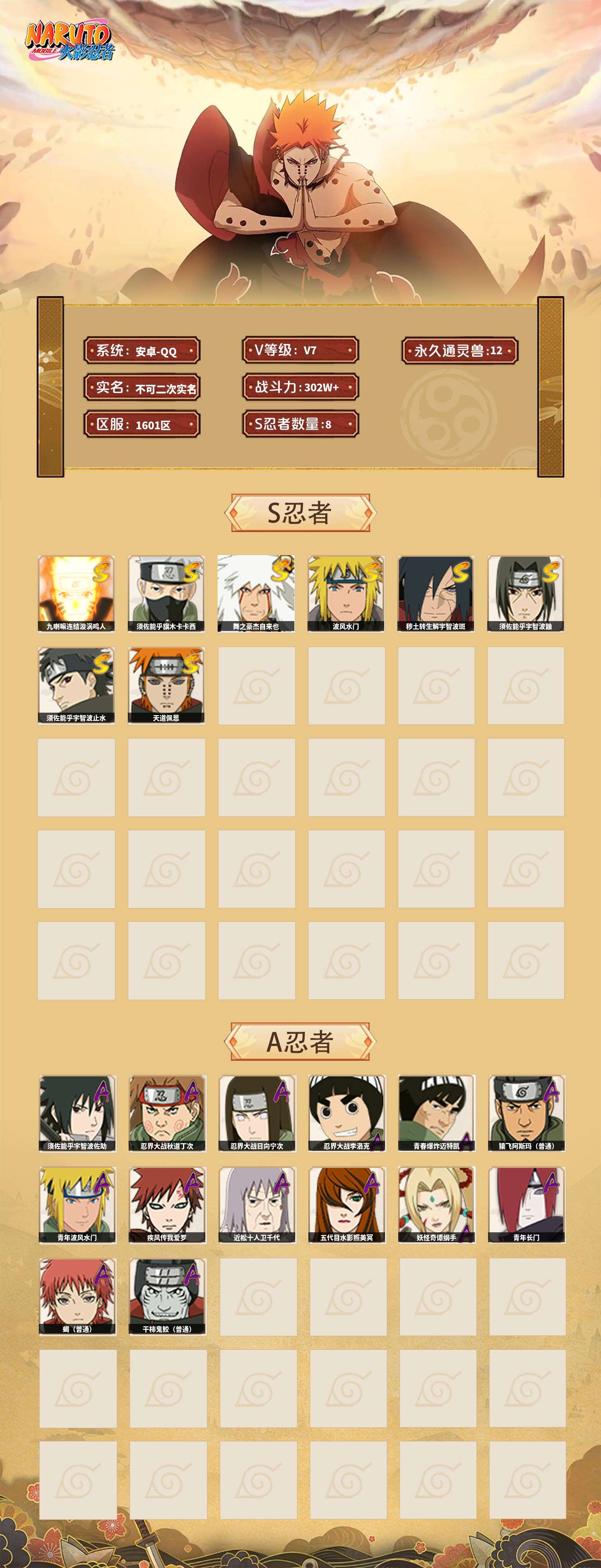 【火影忍者】【lyhy9357】战斗力:302w;段位:中忍1阶;本服排名:1663品;vip:v7级;s忍:8个;a忍:14个;通灵兽:12个,s忍:九喇嘛连结漩涡鸣人|须佐能乎旗木卡卡西|舞之豪杰自来也|波风水门|秽土转生解宇智波斑|须佐能乎宇智波鼬|须佐能乎宇智波止水|天道佩恩__a忍:须佐能乎宇智波佐助|忍界大战秋道丁次|忍界大战日向宁次|忍界大战李洛克|青春爆炸迈特凯|猿飞阿斯玛(普通)|青年波风水门|疾风传我爱罗|近松十人卫千代|五代目水影照美冥|妖怪奇谭纲手|青年长门|蝎(普通)|干柿鬼鲛(普通)__通灵兽:忍犬(普通)|蓝蛇|蛤蟆吉|忍龟|砂之守鹤|镰鼬|猿魔|山椒鱼|蜃|蛤蟆仙人|鲛鲨|蛤蟆健