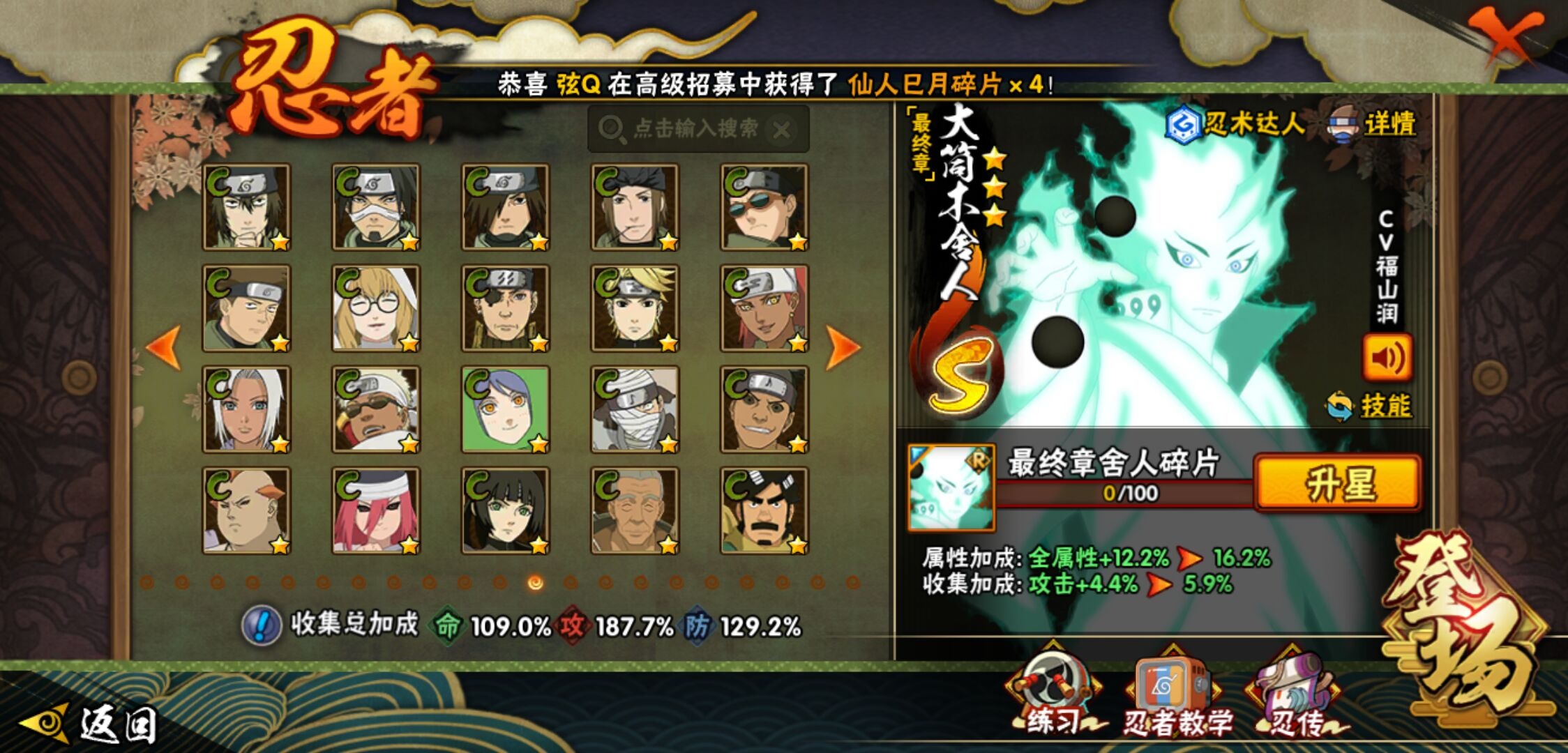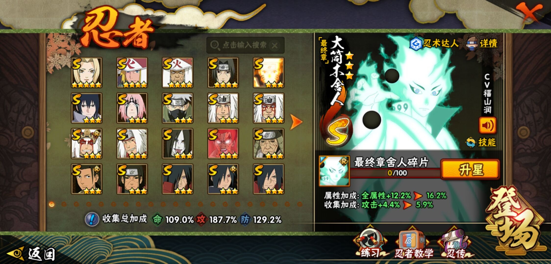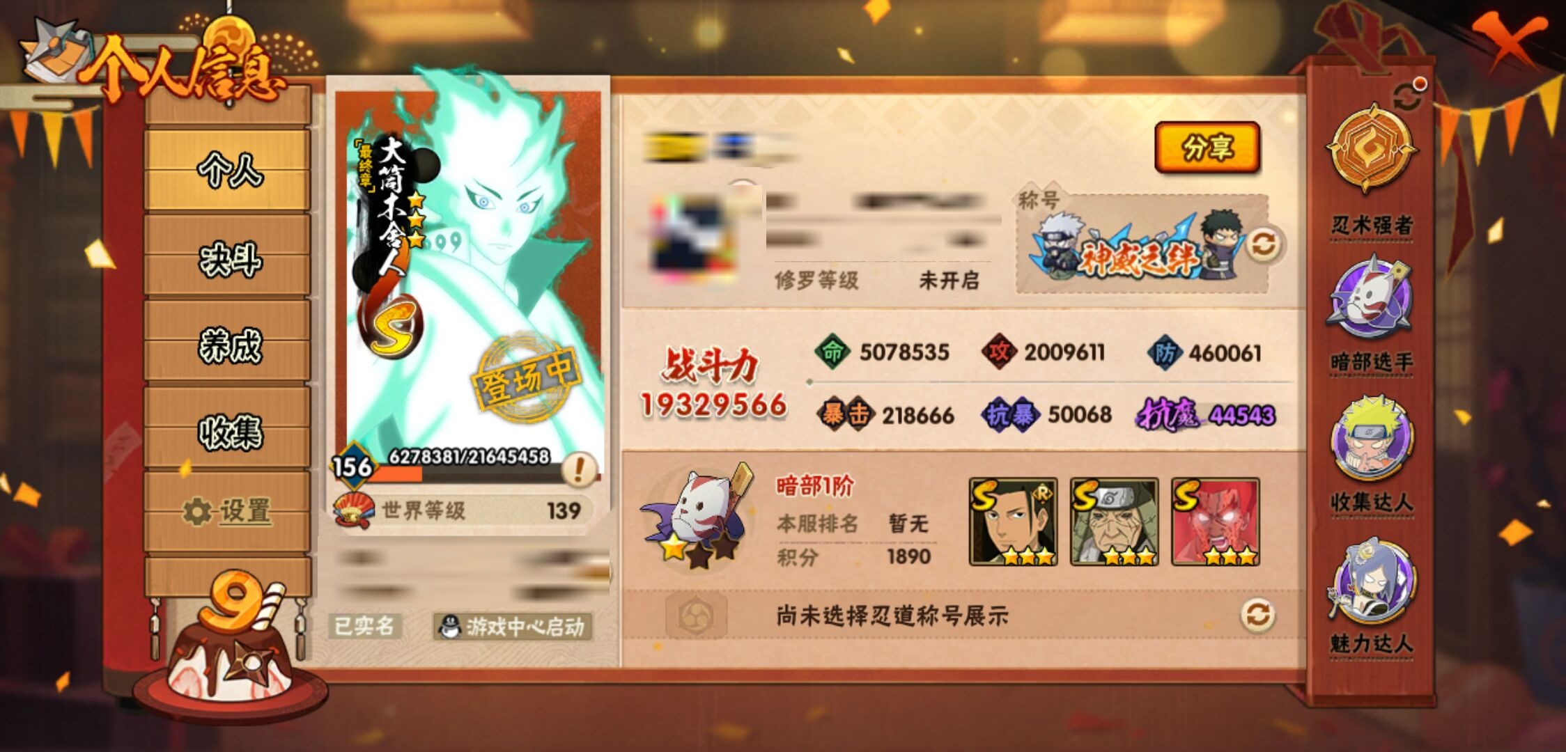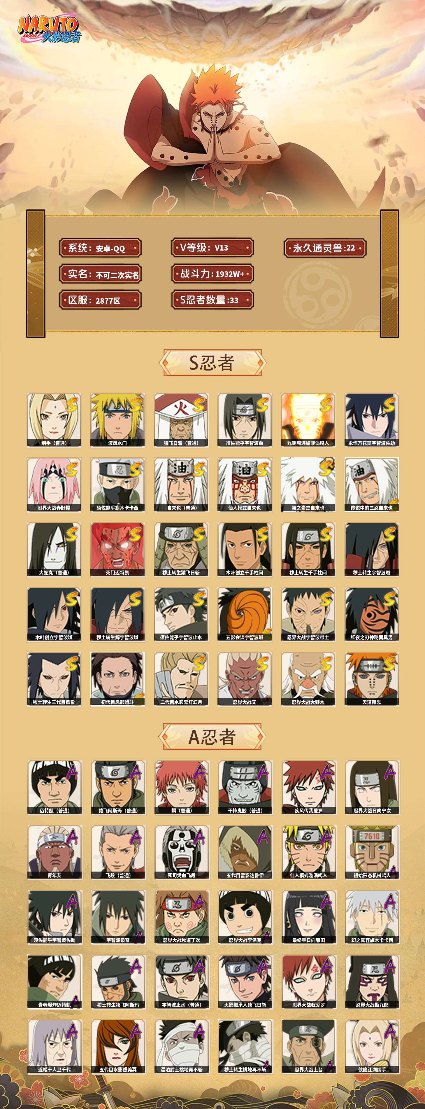 【火影忍者】【lyhy9358】战斗力:1932w;段位:暗部1阶;本服排名:24;vip:v13级;s忍:33个;a忍:50个;通灵兽:22个,s忍:纲手(普通) 5星|波风水门 4星|猿飞日斩(普通) 4星|须佐能乎宇智波鼬 4星|九喇嘛连结漩涡鸣人|永恒万花筒宇智波佐助|忍界大战春野樱|须佐能乎旗木卡卡西|自来也(普通)|仙人模式自来也|舞之豪杰自来也|传说中的三忍自来也|大蛇丸(普通)|死门迈特凯|秽土转生猿飞日斩|木叶创立千手柱间|秽土转生千手柱间|秽土转生宇智波斑|木叶创立宇智波斑|秽土转生解宇智波斑|须佐能乎宇智波止水|五影会谈宇智波斑|忍界大战宇智波带土|红夜之刃神秘面具男|秽土转生三代目风影|初代目风影烈斗|二代目水影鬼灯幻月|忍界大战艾|忍界大战大野木|天道佩恩|最终章大筒木舍人|大筒木桃式|博人传大筒木金式__a忍:迈特凯(普通) 5星|猿飞阿斯玛(普通) 5星|蝎(普通) 5星|干柿鬼鲛(普通) 5星|疾风传我爱罗 4星|忍界大战日向宁次 3星|青年艾 3星|飞段(普通) 3星|死司凭血飞段 3星|五代目雷影达鲁伊 3星|仙人模式漩涡鸣人|初始形态机械鸣人|须佐能乎宇智波佐助|宇智波泉奈|忍界大战秋道丁次|忍界大战李洛克|最终章日向雏田|幻之真容旗木卡卡西|青春爆炸迈特凯|秽土转生猿飞阿斯玛|宇智波止水(普通)|火影继承人猿飞日斩|忍界大战我爱罗|忍界大战勘九郎|近松十人卫千代|五代目水影照美冥|漂泊武士桃地再不斩|秽土转生桃地再不斩|忍界大战土台|侠隐江湖纲手|妖怪奇谭纲手|不缘|青年长门|漂泊浪客佩恩六道|小南(普通)|漂泊浪客小南|地怨虞角都|秽土转生角都|绯流琥蝎|宇智波鼬(普通)|夏日限定宇智波鼬|迪达拉(普通)|加藤断|火之意志继承者卑留呼|羁绊神农|桃式显现漩涡博人|六代目水影长十郎|仙人模式巳月|四代目土影黑土|夏日限定黑土__通灵兽:忍犬(普通)|蓝蛇|砂之守鹤|蛤蟆吉|忍龟|镰鼬|猿魔|山椒鱼|蛞蝓(普通)|蜃|蛤蟆仙人|鲛鲨|熊猫|蛤蟆健|乌鸦(普通)|蛤蟆龙|蛞蝓侠隐江湖|蛤蟆广|梦貘|辛牙|鹰|蜘蛛