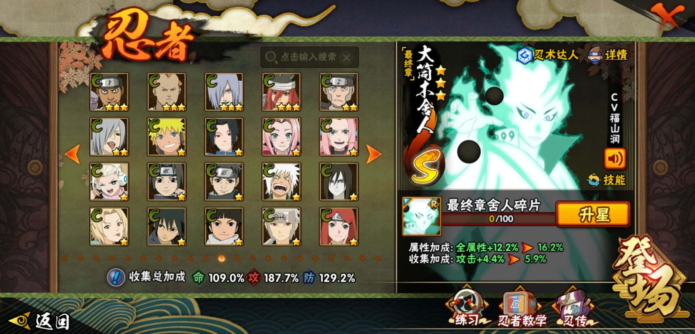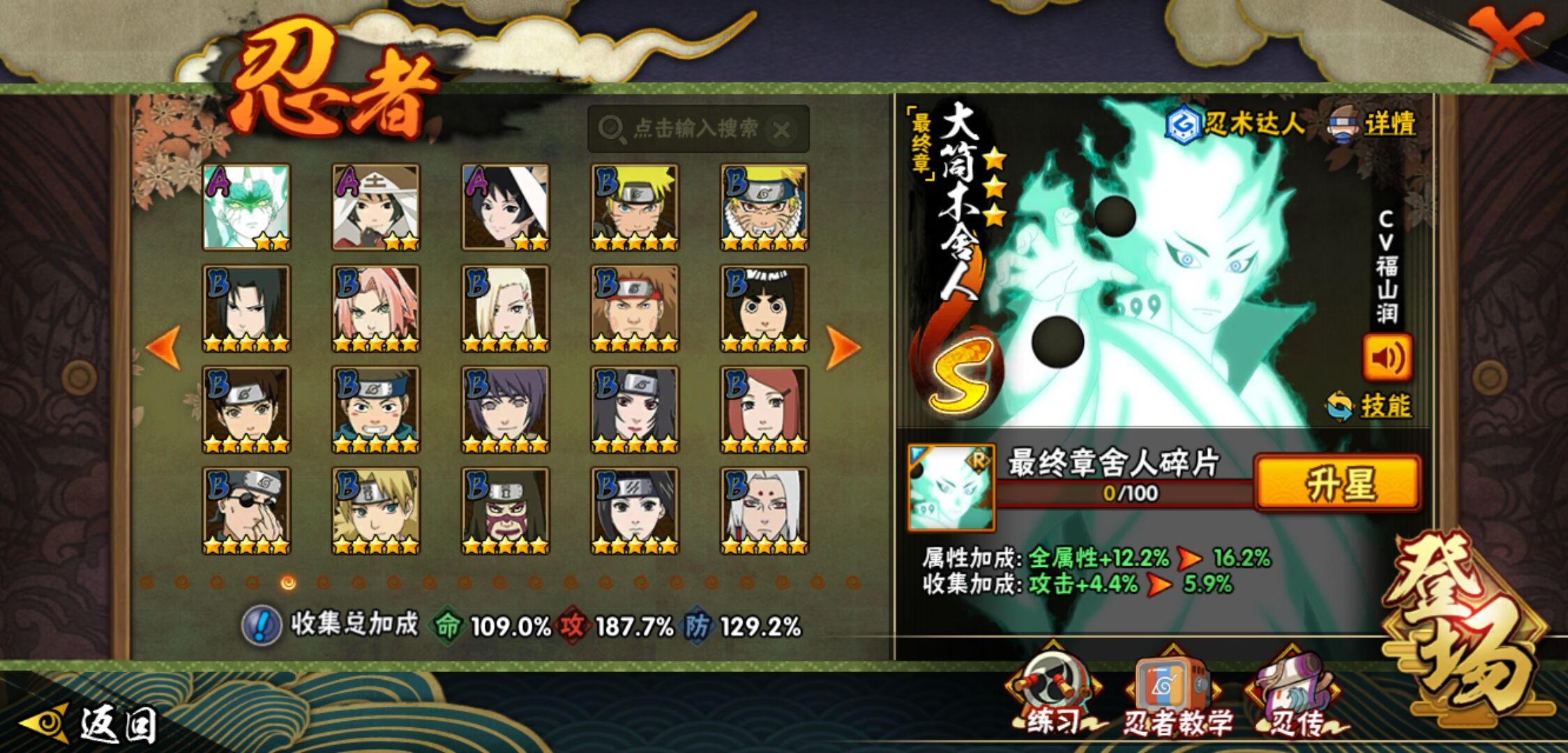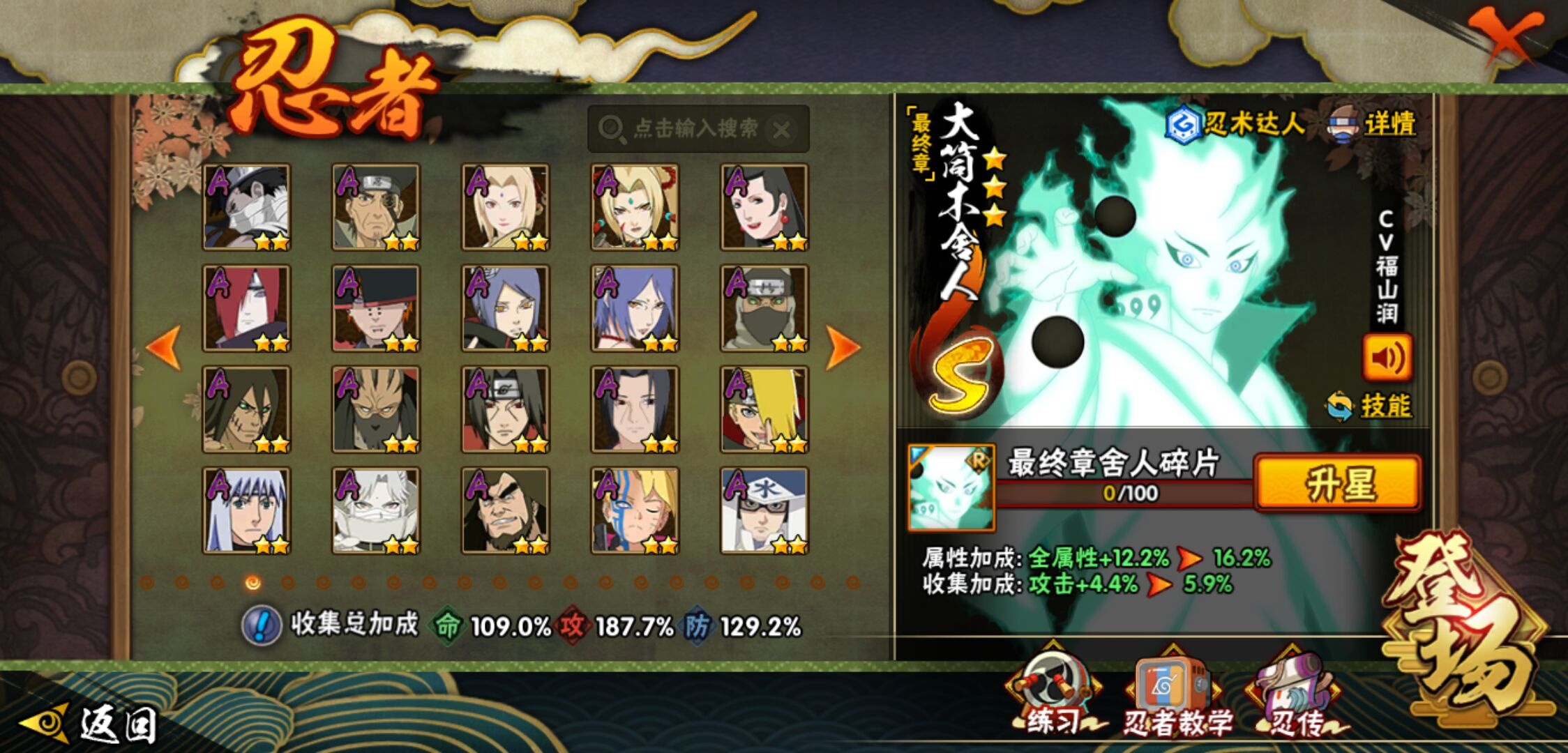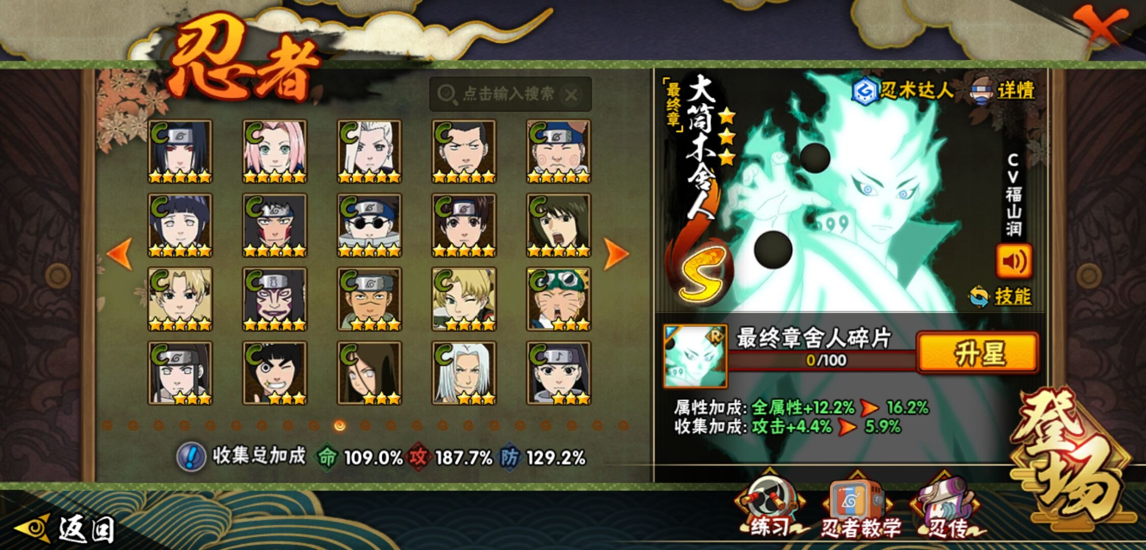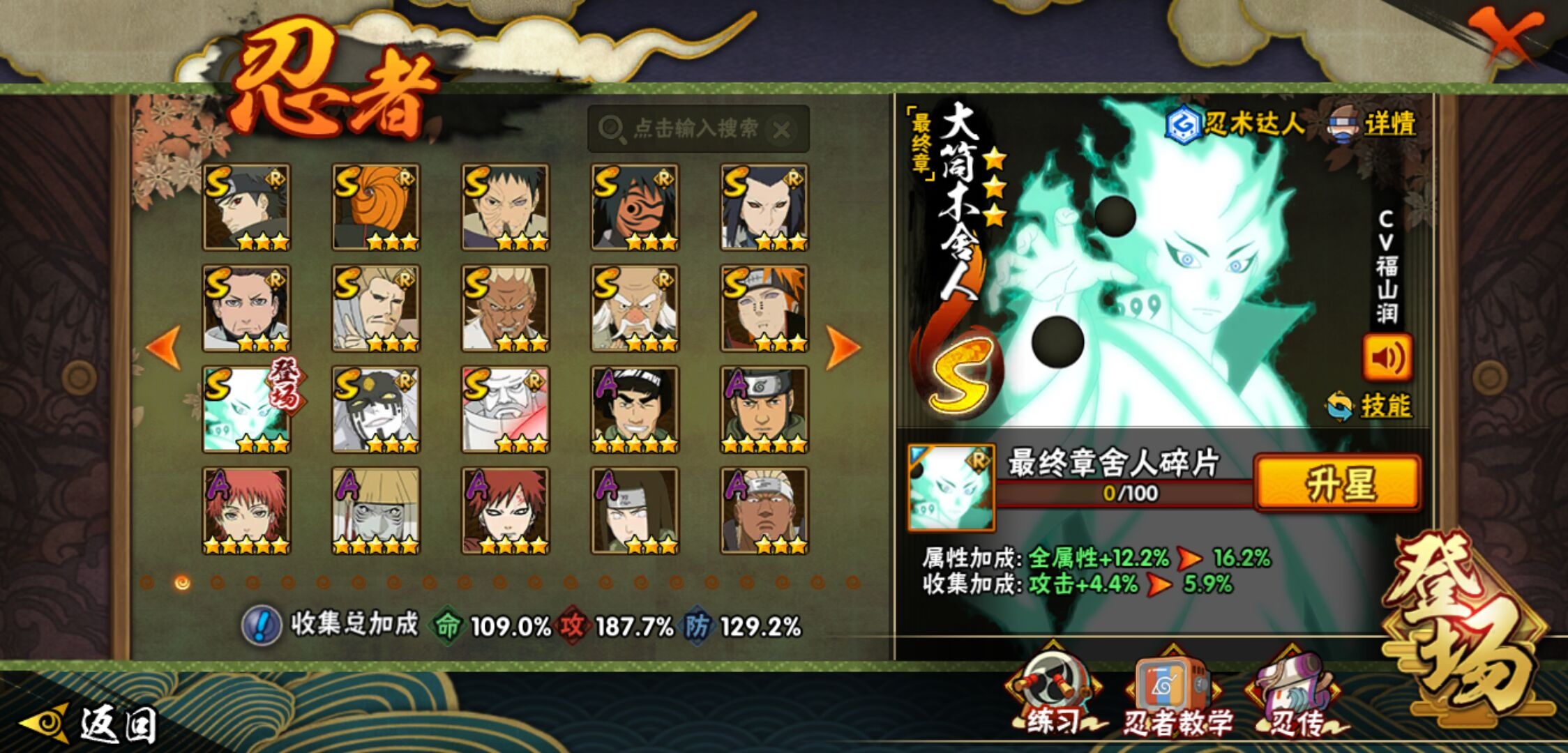 【火影忍者】【lyhy9358】战斗力:1932w;段位:暗部1阶;本服排名:24;vip:v13级;s忍:33个;a忍:50个;通灵兽:22个,s忍:纲手(普通) 5星|波风水门 4星|猿飞日斩(普通) 4星|须佐能乎宇智波鼬 4星|九喇嘛连结漩涡鸣人|永恒万花筒宇智波佐助|忍界大战春野樱|须佐能乎旗木卡卡西|自来也(普通)|仙人模式自来也|舞之豪杰自来也|传说中的三忍自来也|大蛇丸(普通)|死门迈特凯|秽土转生猿飞日斩|木叶创立千手柱间|秽土转生千手柱间|秽土转生宇智波斑|木叶创立宇智波斑|秽土转生解宇智波斑|须佐能乎宇智波止水|五影会谈宇智波斑|忍界大战宇智波带土|红夜之刃神秘面具男|秽土转生三代目风影|初代目风影烈斗|二代目水影鬼灯幻月|忍界大战艾|忍界大战大野木|天道佩恩|最终章大筒木舍人|大筒木桃式|博人传大筒木金式__a忍:迈特凯(普通) 5星|猿飞阿斯玛(普通) 5星|蝎(普通) 5星|干柿鬼鲛(普通) 5星|疾风传我爱罗 4星|忍界大战日向宁次 3星|青年艾 3星|飞段(普通) 3星|死司凭血飞段 3星|五代目雷影达鲁伊 3星|仙人模式漩涡鸣人|初始形态机械鸣人|须佐能乎宇智波佐助|宇智波泉奈|忍界大战秋道丁次|忍界大战李洛克|最终章日向雏田|幻之真容旗木卡卡西|青春爆炸迈特凯|秽土转生猿飞阿斯玛|宇智波止水(普通)|火影继承人猿飞日斩|忍界大战我爱罗|忍界大战勘九郎|近松十人卫千代|五代目水影照美冥|漂泊武士桃地再不斩|秽土转生桃地再不斩|忍界大战土台|侠隐江湖纲手|妖怪奇谭纲手|不缘|青年长门|漂泊浪客佩恩六道|小南(普通)|漂泊浪客小南|地怨虞角都|秽土转生角都|绯流琥蝎|宇智波鼬(普通)|夏日限定宇智波鼬|迪达拉(普通)|加藤断|火之意志继承者卑留呼|羁绊神农|桃式显现漩涡博人|六代目水影长十郎|仙人模式巳月|四代目土影黑土|夏日限定黑土__通灵兽:忍犬(普通)|蓝蛇|砂之守鹤|蛤蟆吉|忍龟|镰鼬|猿魔|山椒鱼|蛞蝓(普通)|蜃|蛤蟆仙人|鲛鲨|熊猫|蛤蟆健|乌鸦(普通)|蛤蟆龙|蛞蝓侠隐江湖|蛤蟆广|梦貘|辛牙|鹰|蜘蛛