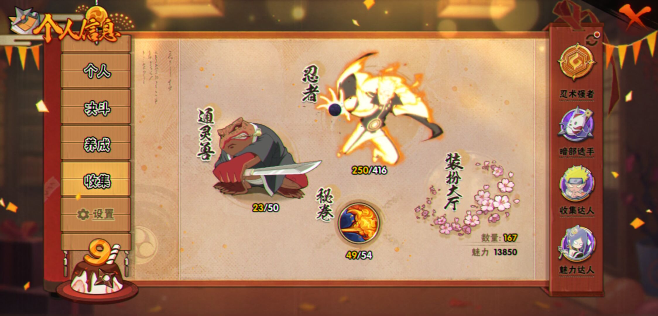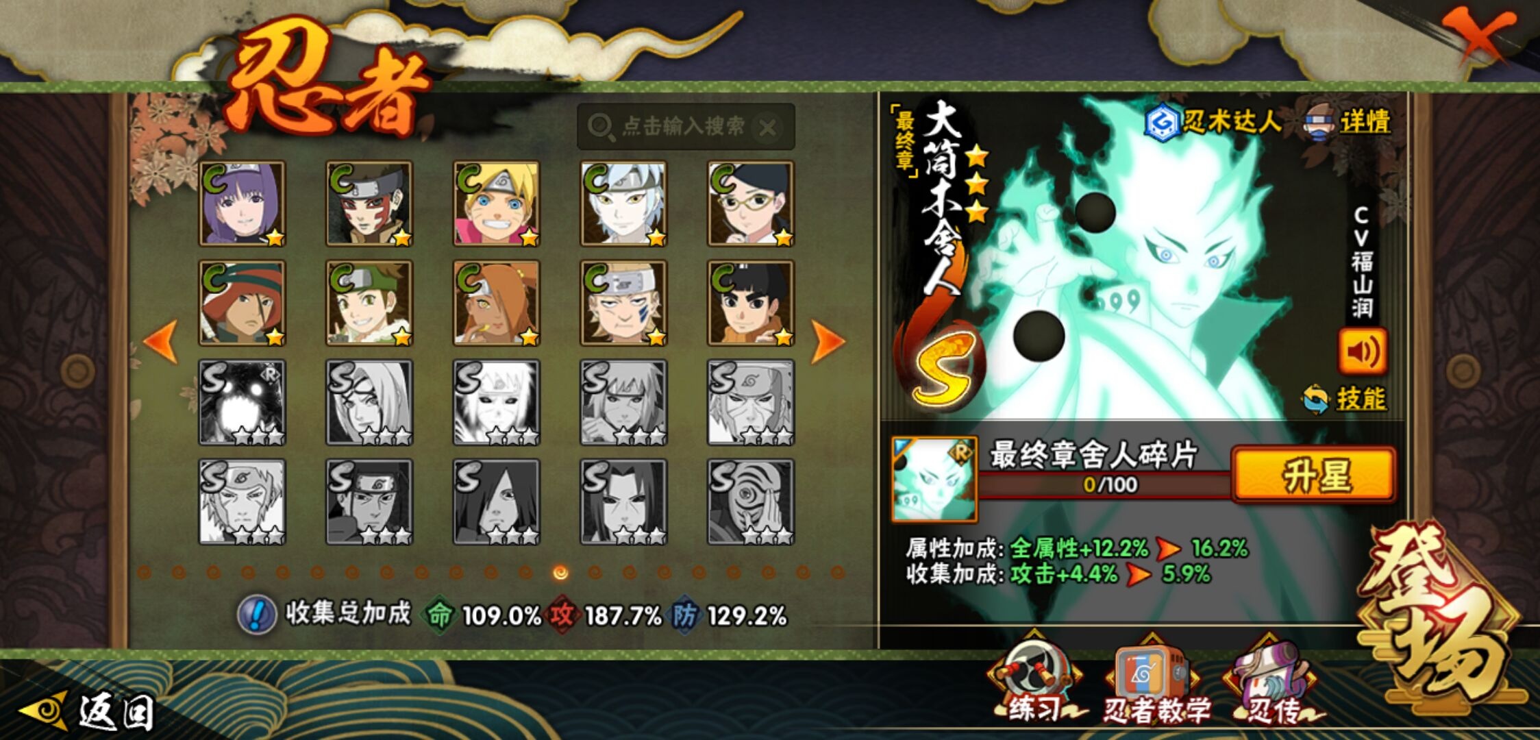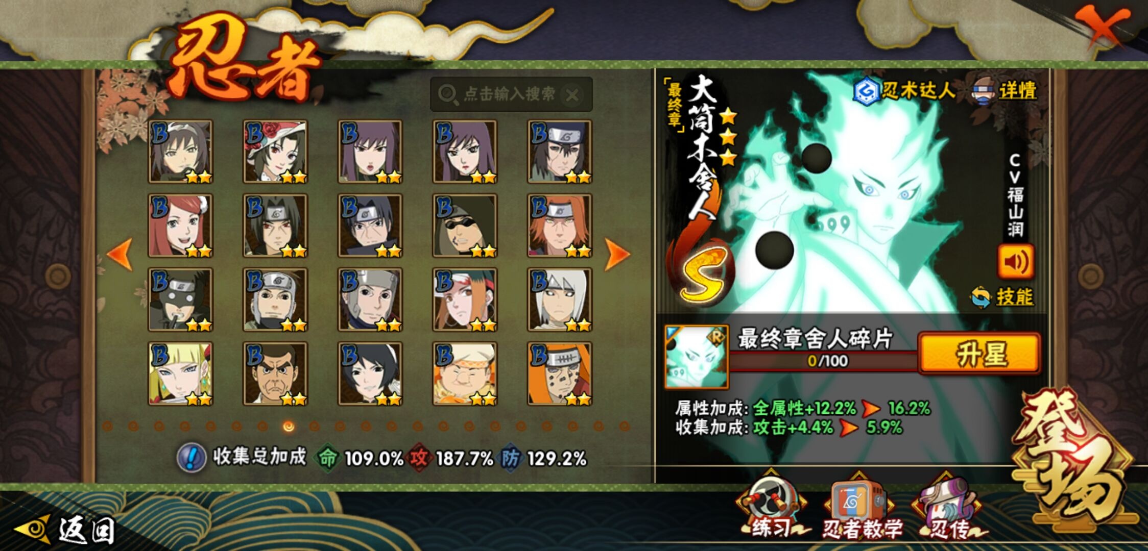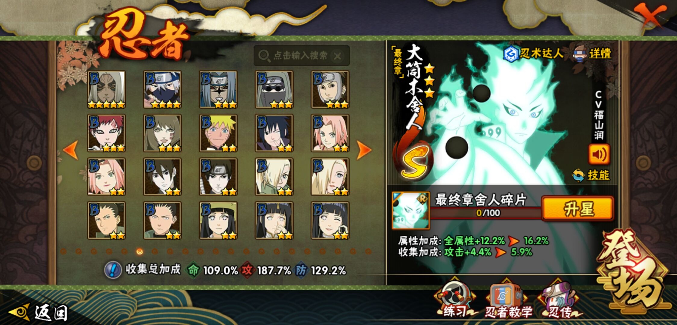 【火影忍者】【lyhy9358】战斗力:1932w;段位:暗部1阶;本服排名:24;vip:v13级;s忍:33个;a忍:50个;通灵兽:22个,s忍:纲手(普通) 5星|波风水门 4星|猿飞日斩(普通) 4星|须佐能乎宇智波鼬 4星|九喇嘛连结漩涡鸣人|永恒万花筒宇智波佐助|忍界大战春野樱|须佐能乎旗木卡卡西|自来也(普通)|仙人模式自来也|舞之豪杰自来也|传说中的三忍自来也|大蛇丸(普通)|死门迈特凯|秽土转生猿飞日斩|木叶创立千手柱间|秽土转生千手柱间|秽土转生宇智波斑|木叶创立宇智波斑|秽土转生解宇智波斑|须佐能乎宇智波止水|五影会谈宇智波斑|忍界大战宇智波带土|红夜之刃神秘面具男|秽土转生三代目风影|初代目风影烈斗|二代目水影鬼灯幻月|忍界大战艾|忍界大战大野木|天道佩恩|最终章大筒木舍人|大筒木桃式|博人传大筒木金式__a忍:迈特凯(普通) 5星|猿飞阿斯玛(普通) 5星|蝎(普通) 5星|干柿鬼鲛(普通) 5星|疾风传我爱罗 4星|忍界大战日向宁次 3星|青年艾 3星|飞段(普通) 3星|死司凭血飞段 3星|五代目雷影达鲁伊 3星|仙人模式漩涡鸣人|初始形态机械鸣人|须佐能乎宇智波佐助|宇智波泉奈|忍界大战秋道丁次|忍界大战李洛克|最终章日向雏田|幻之真容旗木卡卡西|青春爆炸迈特凯|秽土转生猿飞阿斯玛|宇智波止水(普通)|火影继承人猿飞日斩|忍界大战我爱罗|忍界大战勘九郎|近松十人卫千代|五代目水影照美冥|漂泊武士桃地再不斩|秽土转生桃地再不斩|忍界大战土台|侠隐江湖纲手|妖怪奇谭纲手|不缘|青年长门|漂泊浪客佩恩六道|小南(普通)|漂泊浪客小南|地怨虞角都|秽土转生角都|绯流琥蝎|宇智波鼬(普通)|夏日限定宇智波鼬|迪达拉(普通)|加藤断|火之意志继承者卑留呼|羁绊神农|桃式显现漩涡博人|六代目水影长十郎|仙人模式巳月|四代目土影黑土|夏日限定黑土__通灵兽:忍犬(普通)|蓝蛇|砂之守鹤|蛤蟆吉|忍龟|镰鼬|猿魔|山椒鱼|蛞蝓(普通)|蜃|蛤蟆仙人|鲛鲨|熊猫|蛤蟆健|乌鸦(普通)|蛤蟆龙|蛞蝓侠隐江湖|蛤蟆广|梦貘|辛牙|鹰|蜘蛛
