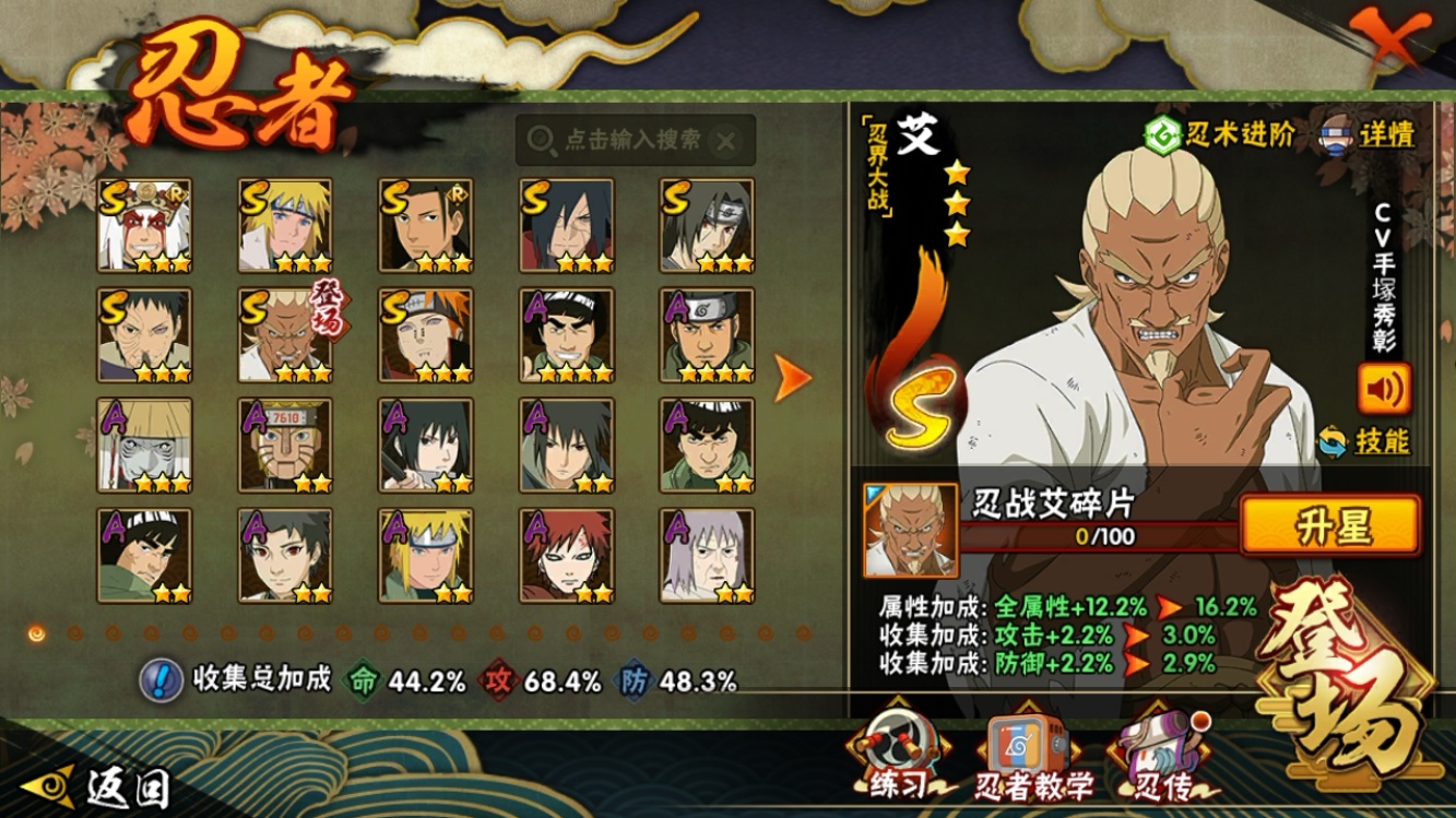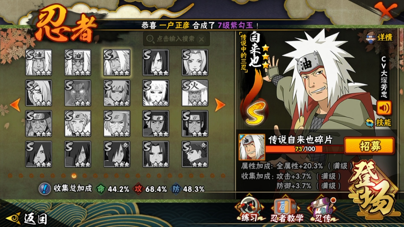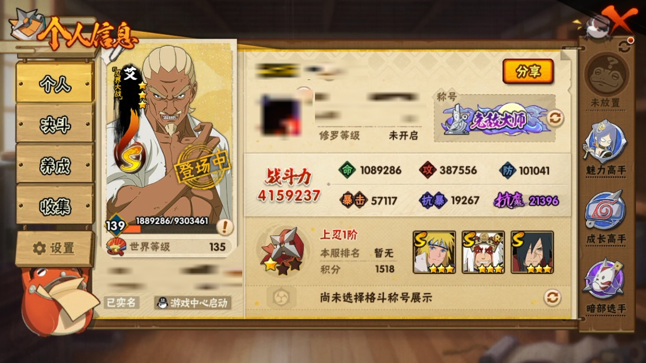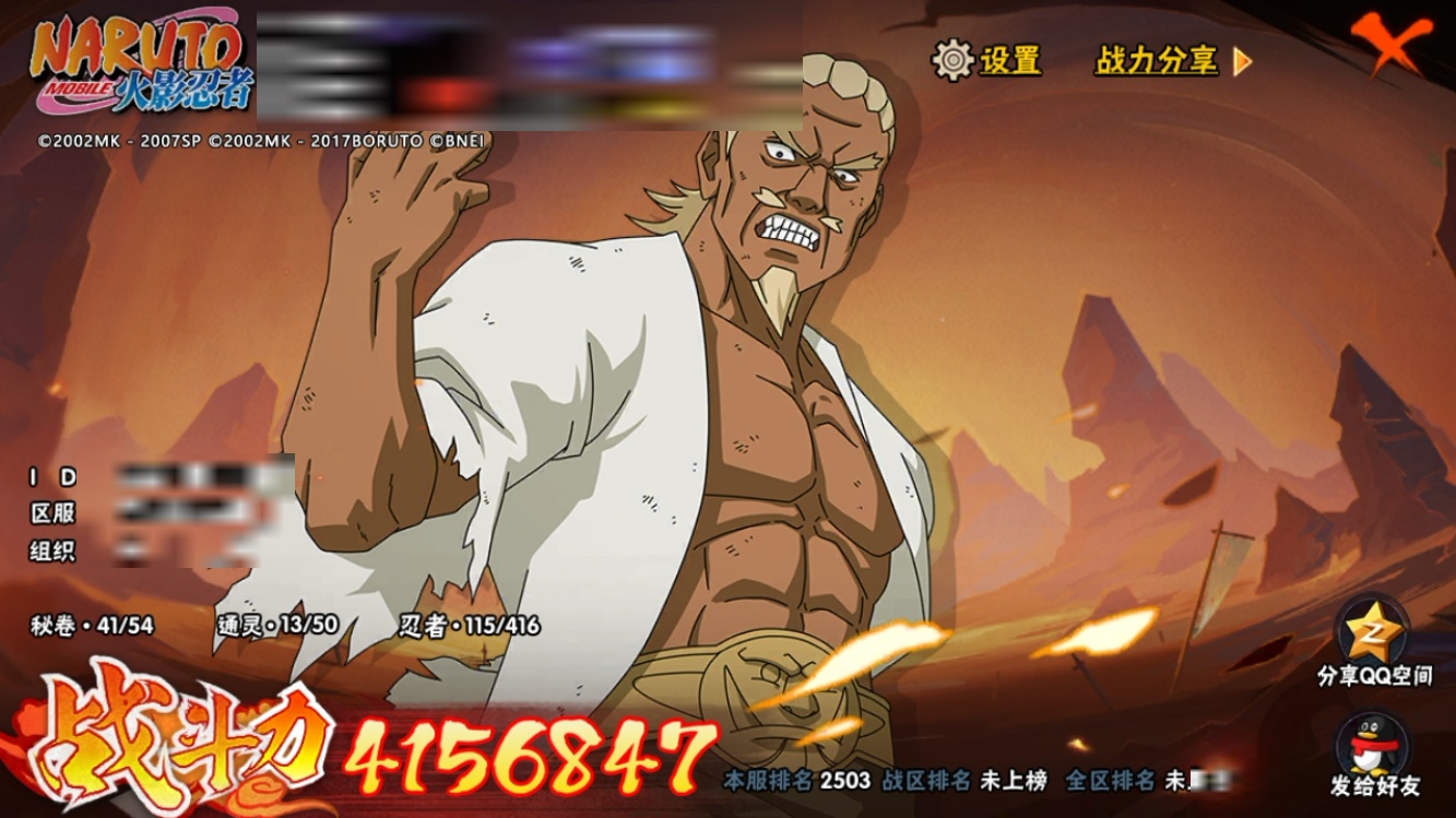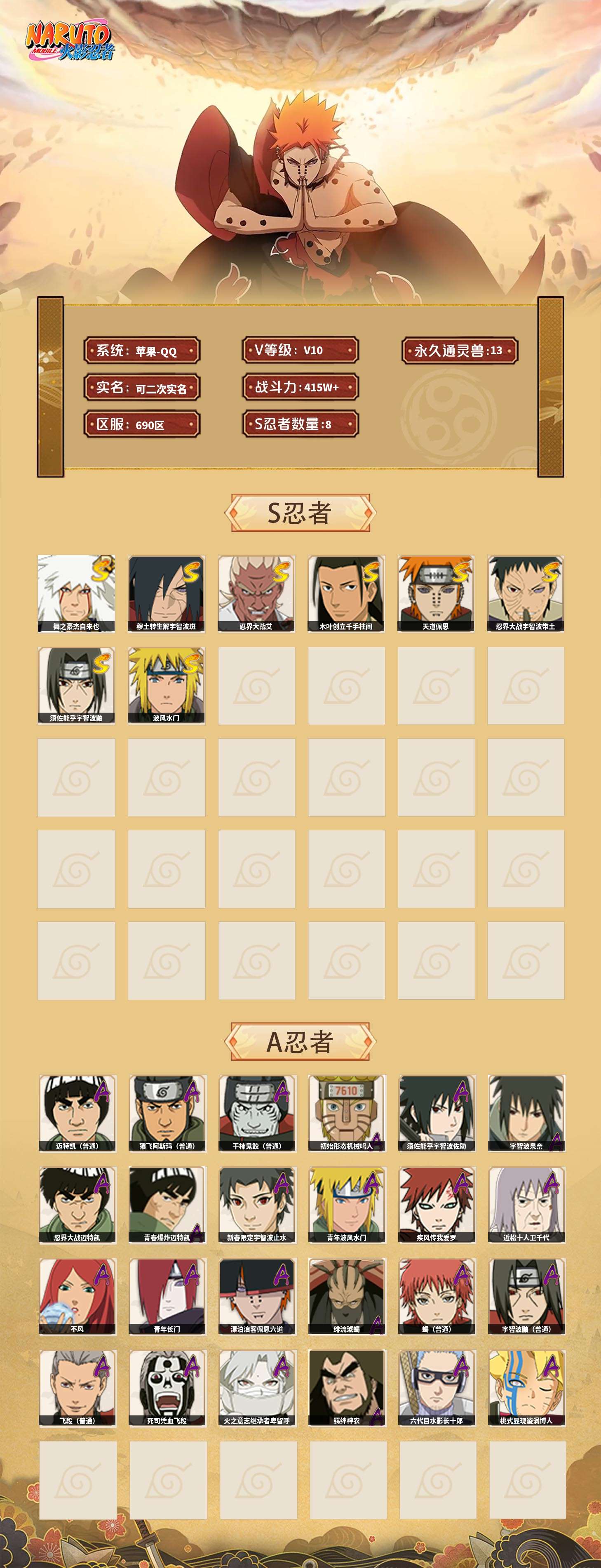 【火影忍者】【lyhy9359】战斗力:415w;段位:上忍1阶;本服排名:2503;vip:v10级;s忍:8个;a忍:24个;通灵兽:13个,s忍:舞之豪杰自来也|秽土转生解宇智波斑|忍界大战艾|木叶创立千手柱间|天道佩恩|忍界大战宇智波带土|须佐能乎宇智波鼬|波风水门__a忍:迈特凯(普通)|猿飞阿斯玛(普通)|干柿鬼鲛(普通)|初始形态机械鸣人|须佐能乎宇智波佐助|宇智波泉奈|忍界大战迈特凯|青春爆炸迈特凯|新春限定宇智波止水|青年波风水门|疾风传我爱罗|近松十人卫千代|不风|青年长门|漂泊浪客佩恩六道|绯流琥蝎|蝎(普通)|宇智波鼬(普通)|飞段(普通)|死司凭血飞段|火之意志继承者卑留呼|羁绊神农|六代目水影长十郎|桃式显现漩涡博人__通灵兽:忍犬(普通)|蓝蛇|蛤蟆吉|砂之守鹤|忍龟|镰鼬|猿魔|山椒鱼|蜃|蛤蟆仙人|鲛鲨|蛤蟆健|乌鸦(普通)