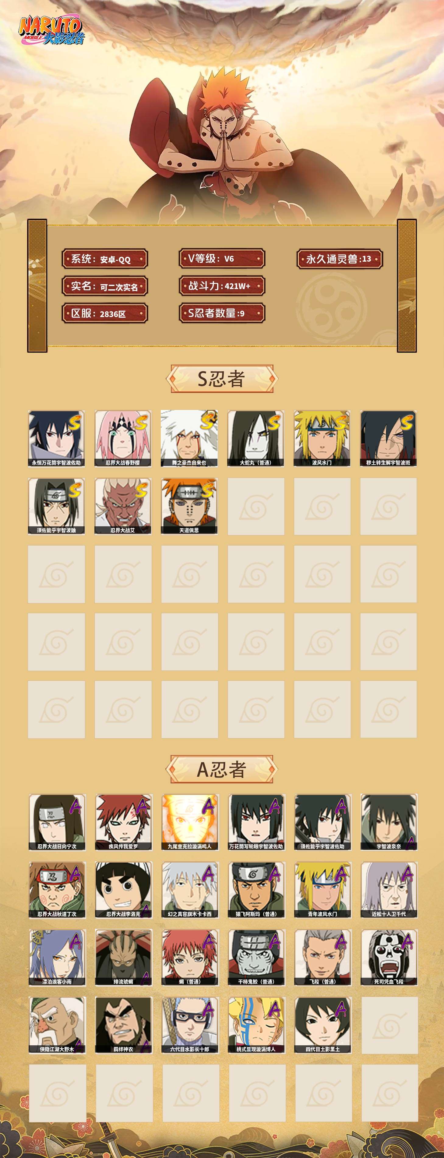 【火影忍者】【lyhy9363】战斗力:421w;段位:见习1阶;本服排名:2061;vip:v6级;s忍:9个;a忍:23个;通灵兽:13个,s忍:永恒万花筒宇智波佐助|忍界大战春野樱|舞之豪杰自来也|大蛇丸(普通)|波风水门|秽土转生解宇智波斑|须佐能乎宇智波鼬|忍界大战艾|天道佩恩__a忍:忍界大战日向宁次 3星|疾风传我爱罗 3星|九尾查克拉漩涡鸣人 3星|万花筒写轮眼宇智波佐助|须佐能乎宇智波佐助|宇智波泉奈|忍界大战秋道丁次|忍界大战李洛克|幻之真容旗木卡卡西|猿飞阿斯玛(普通)|青年波风水门|近松十人卫千代|漂泊浪客小南|绯流琥蝎|蝎(普通)|干柿鬼鲛(普通)|飞段(普通)|死司凭血飞段|侠隐江湖大野木|羁绊神农|六代目水影长十郎|桃式显现漩涡博人|四代目土影黑土__通灵兽:忍犬(普通)|蓝蛇|蛤蟆吉|砂之守鹤|忍龟|镰鼬|猿魔|山椒鱼|蜃|蛤蟆仙人|鲛鲨|蛤蟆健|乌鸦(普通)