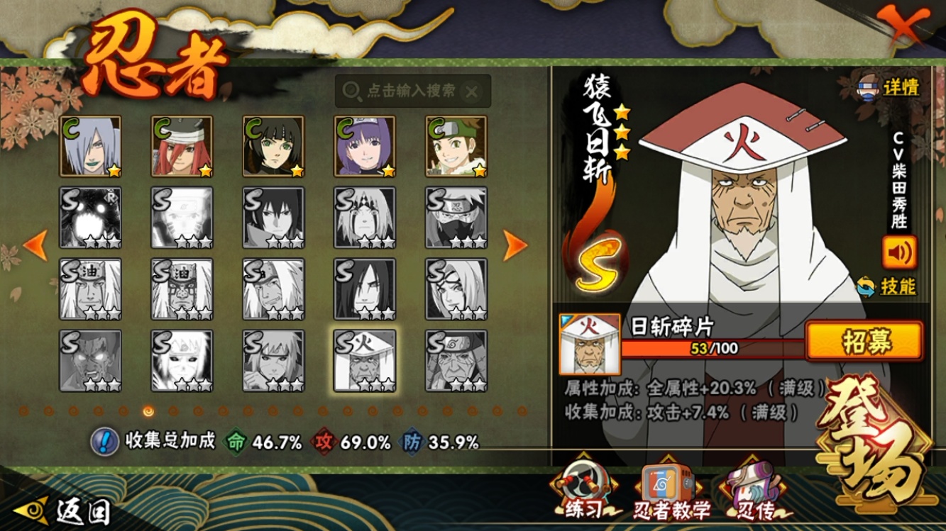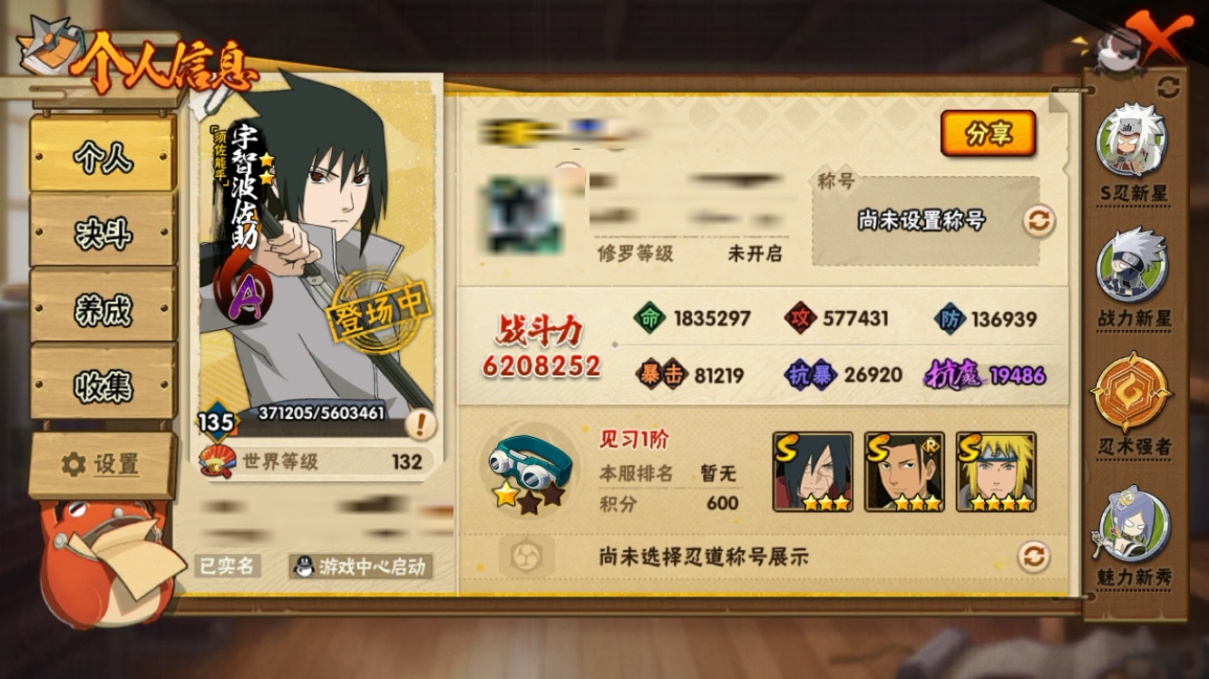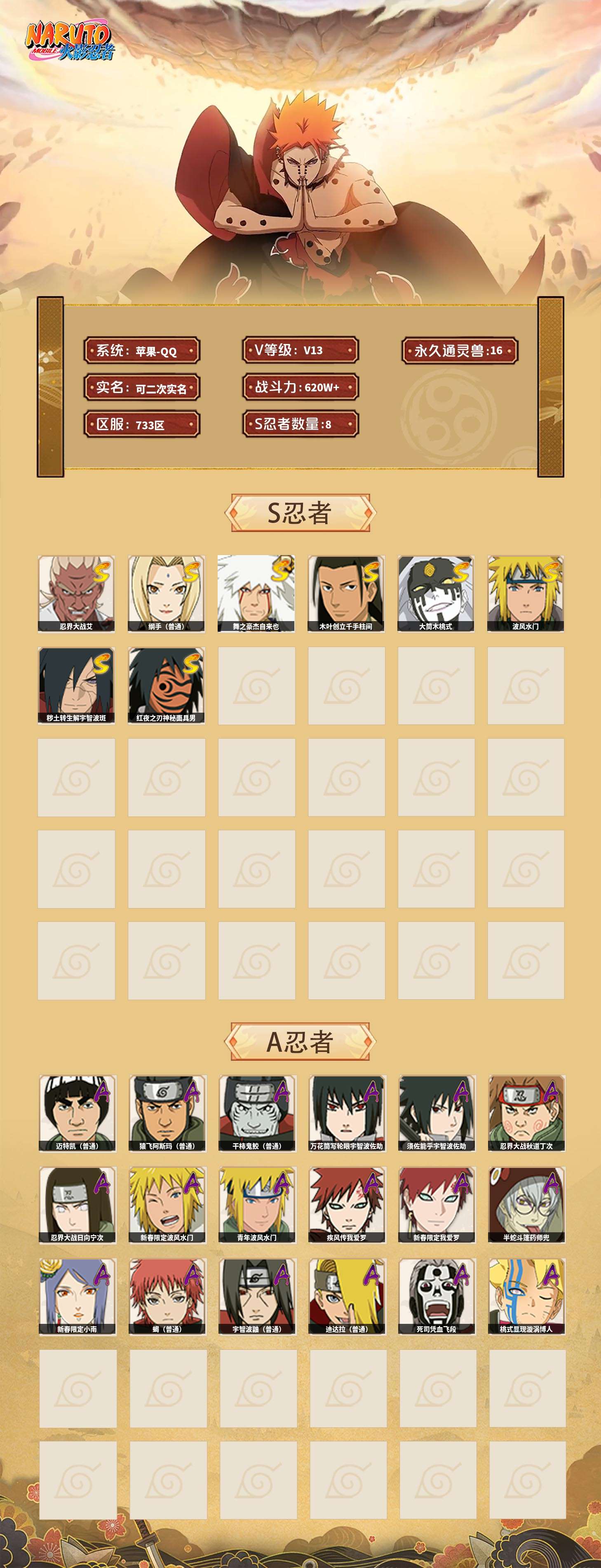 【火影忍者】【lyhy9373】战斗力:620w;段位:见习1阶;本服排名:585;vip:v13级;s忍:8个;a忍:18个;通灵兽:16个,s忍:忍界大战艾|纲手(普通)|舞之豪杰自来也|木叶创立千手柱间|大筒木桃式|波风水门|秽土转生解宇智波斑|红夜之刃神秘面具男__a忍:迈特凯(普通)|猿飞阿斯玛(普通)|干柿鬼鲛(普通)|万花筒写轮眼宇智波佐助|须佐能乎宇智波佐助|忍界大战秋道丁次|忍界大战日向宁次|新春限定波风水门|青年波风水门|疾风传我爱罗|新春限定我爱罗|半蛇斗篷药师兜|新春限定小南|蝎(普通)|宇智波鼬(普通)|迪达拉(普通)|死司凭血飞段|桃式显现漩涡博人__通灵兽:忍犬(普通)|蓝蛇|蛤蟆吉|忍龟|蛞蝓(普通)|镰鼬|猿魔|砂之守鹤|山椒鱼|熊猫|蜃|蛤蟆仙人|鲛鲨|蛤蟆健|乌鸦(普通)|蛤蟆龙