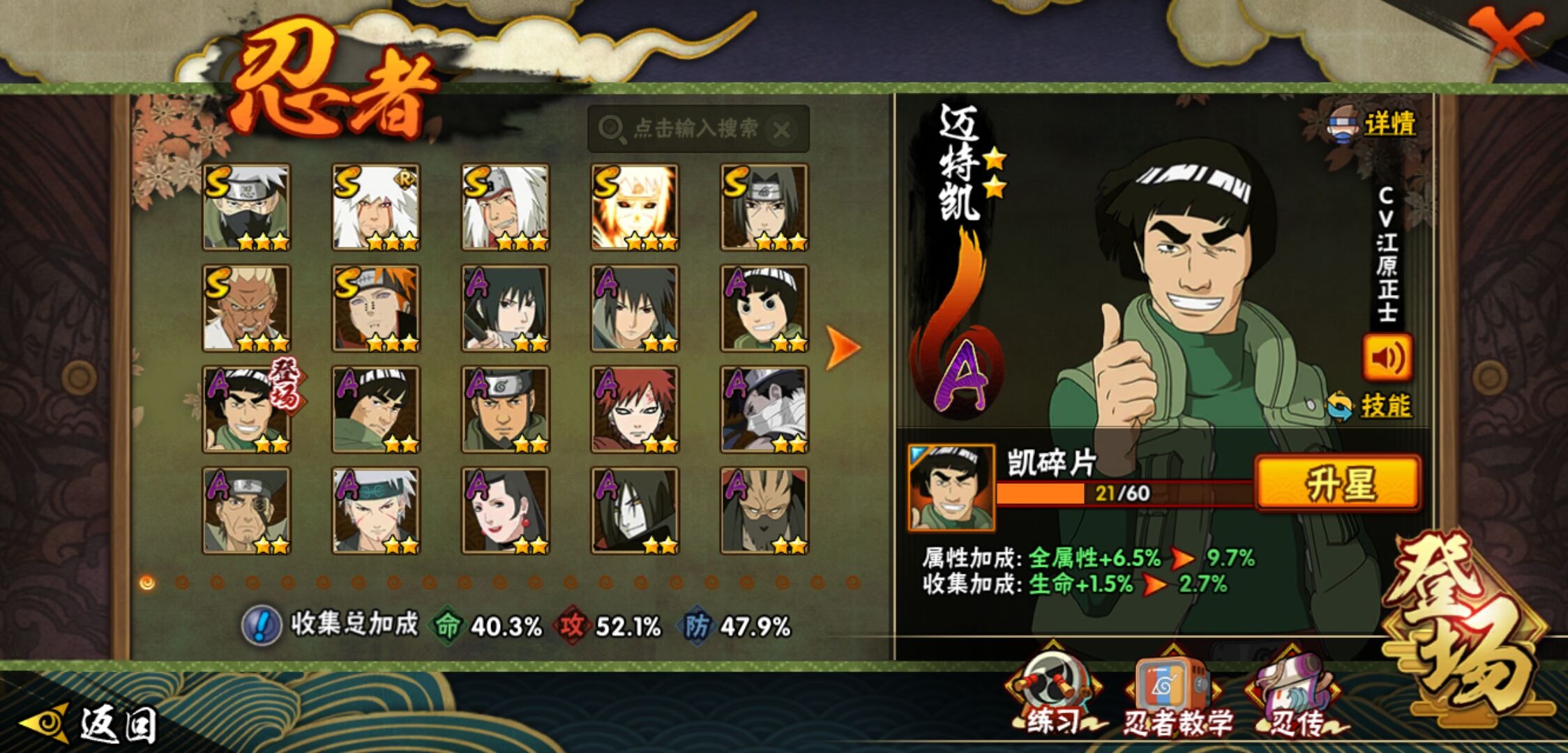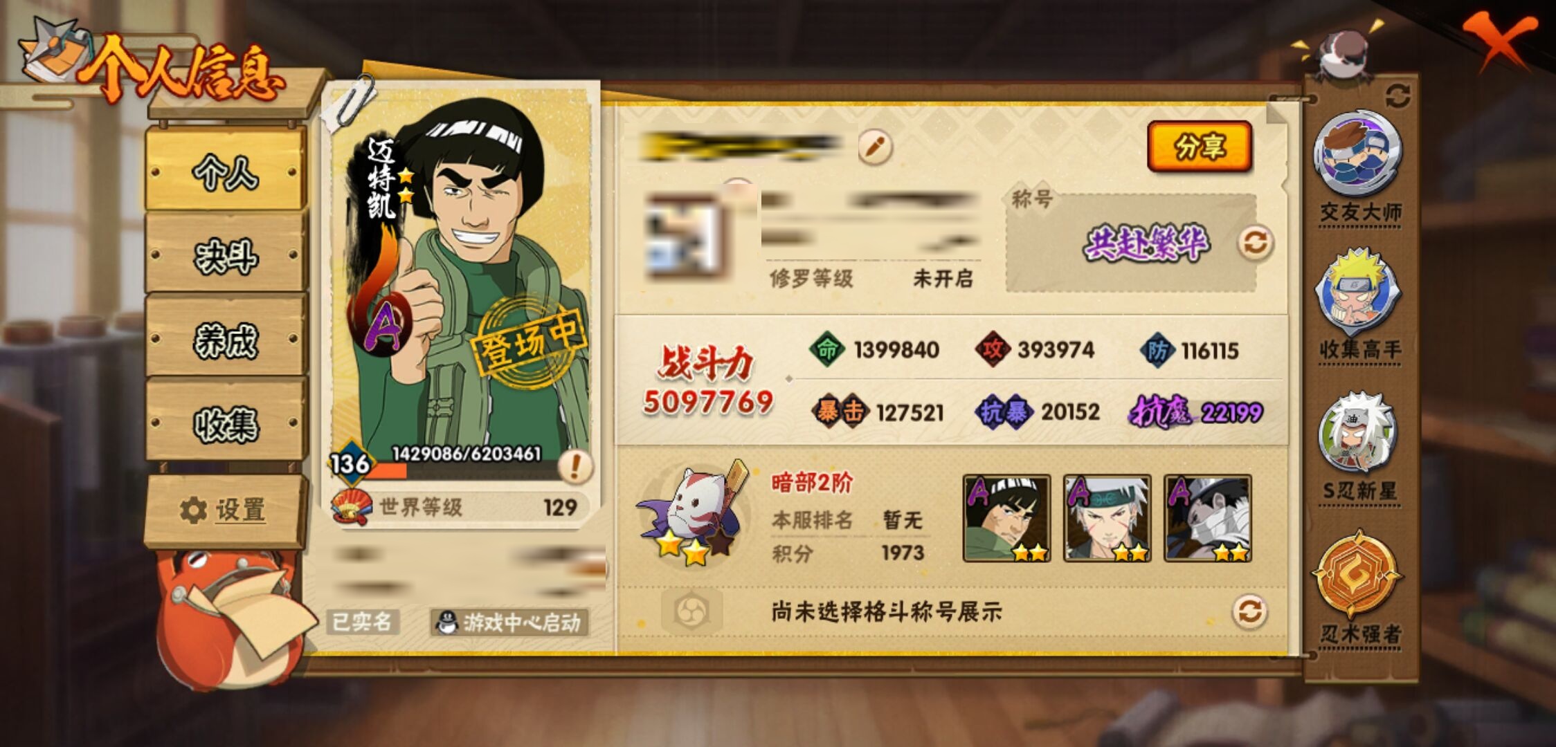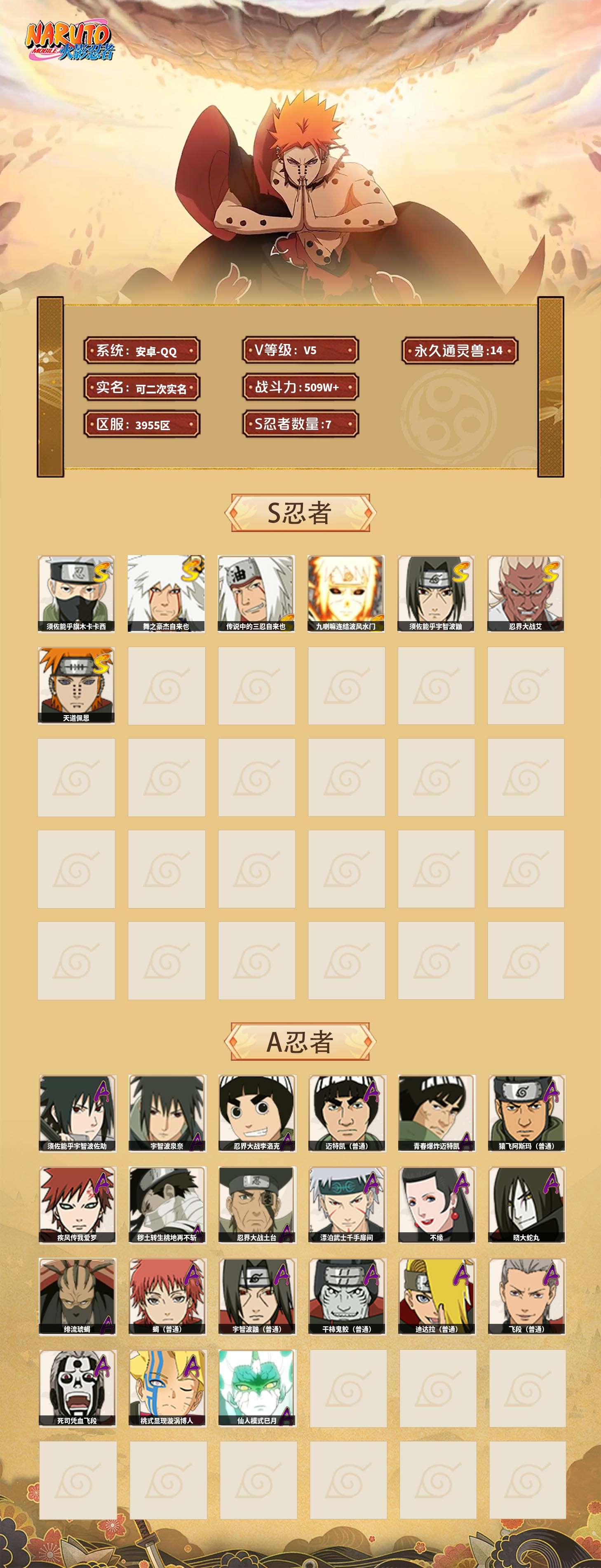 【火影忍者】【lyhy9385】战斗力:509w;段位:暗部2阶;本服排名:771;vip:v5级;s忍:7个;a忍:21个;通灵兽:14个,s忍:须佐能乎旗木卡卡西|舞之豪杰自来也|传说中的三忍自来也|九喇嘛连结波风水门|须佐能乎宇智波鼬|忍界大战艾|天道佩恩__a忍:须佐能乎宇智波佐助|宇智波泉奈|忍界大战李洛克|迈特凯(普通)|青春爆炸迈特凯|猿飞阿斯玛(普通)|疾风传我爱罗|秽土转生桃地再不斩|忍界大战土台|漂泊武士千手扉间|不缘|晓大蛇丸|绯流琥蝎|蝎(普通)|宇智波鼬(普通)|干柿鬼鲛(普通)|迪达拉(普通)|飞段(普通)|死司凭血飞段|桃式显现漩涡博人|仙人模式巳月__通灵兽:忍犬(普通)|蓝蛇|蛤蟆吉|忍龟|镰鼬|猿魔|砂之守鹤|山椒鱼|蜃|蛤蟆仙人|鲛鲨|蛤蟆健|乌鸦(普通)|蛤蟆龙