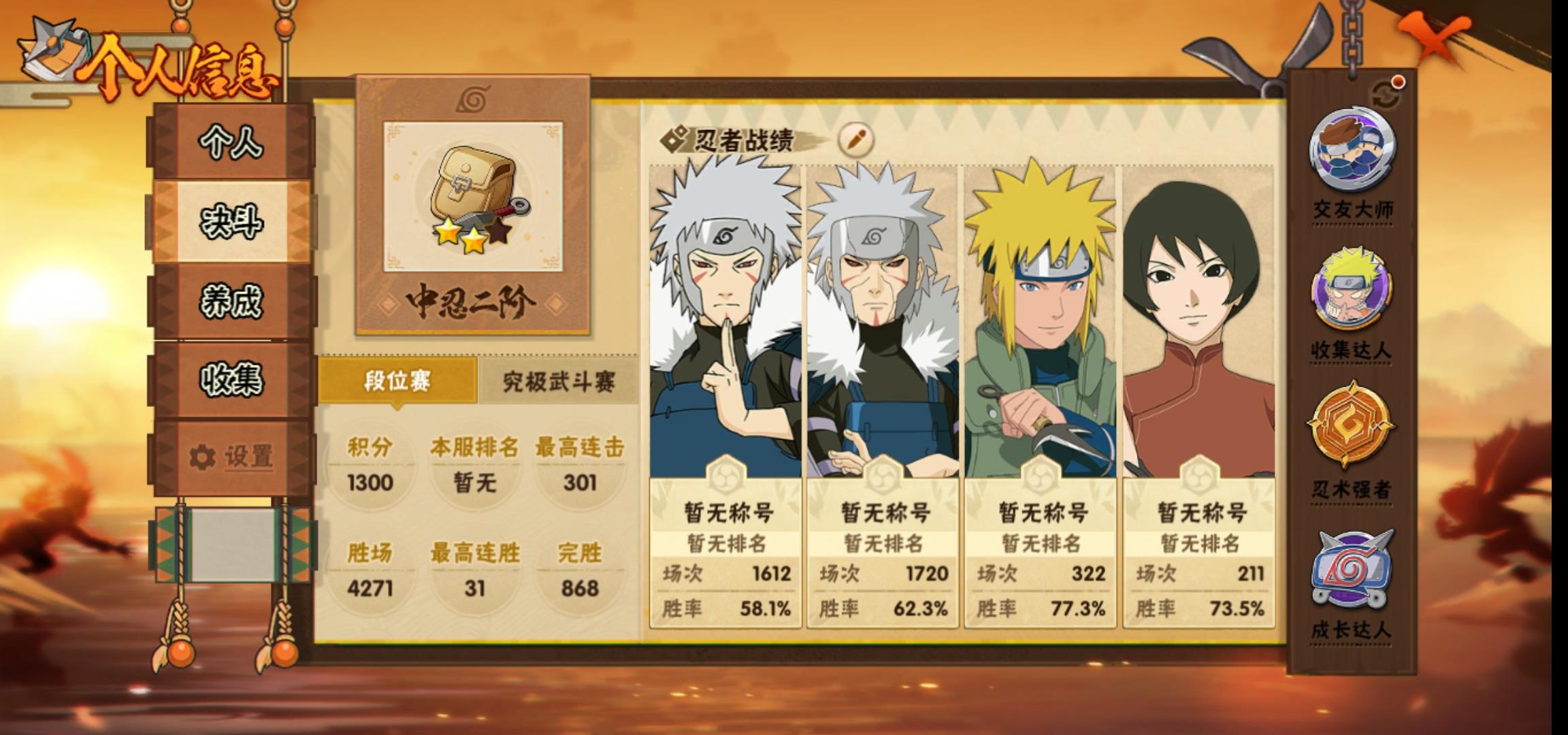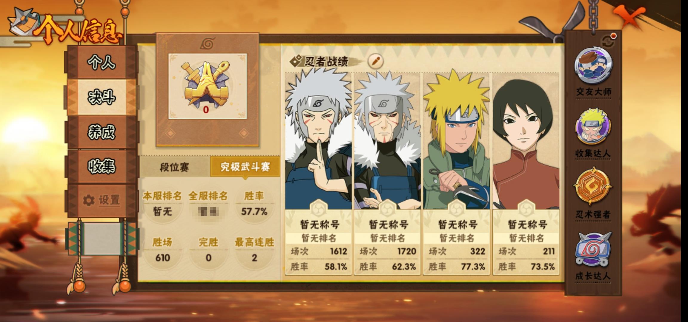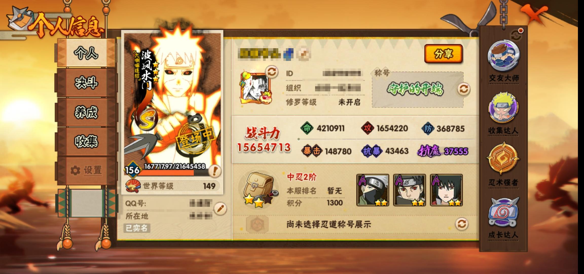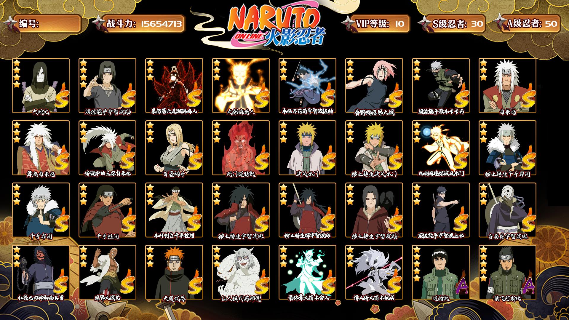 [14659163]0aqksi 号 vip10,1565w战力,s忍30个,a忍50个,本服排名319,战区排名未上榜,通灵兽319个,6时装,中忍2阶,忍者星数615