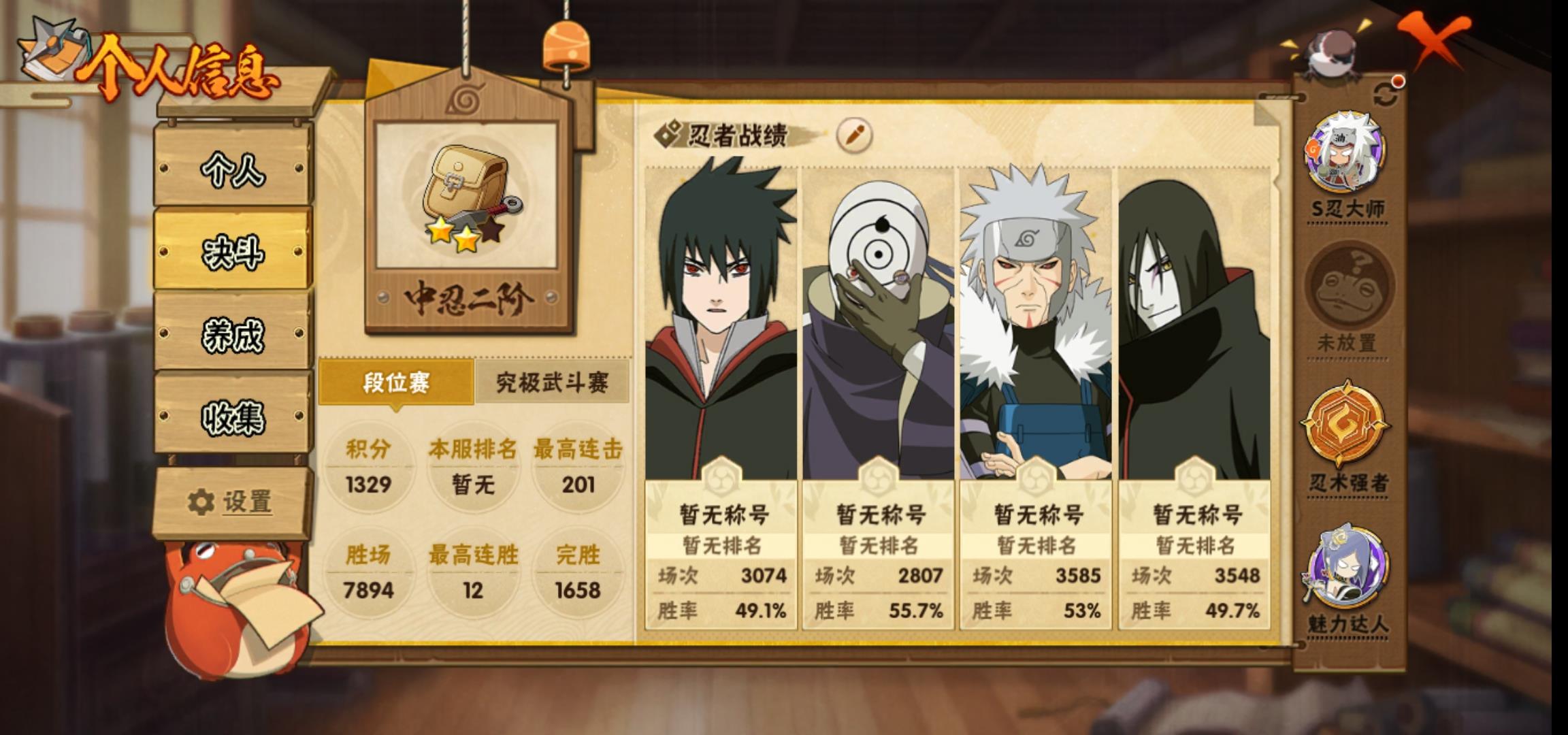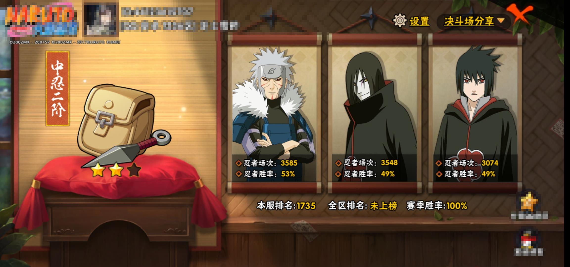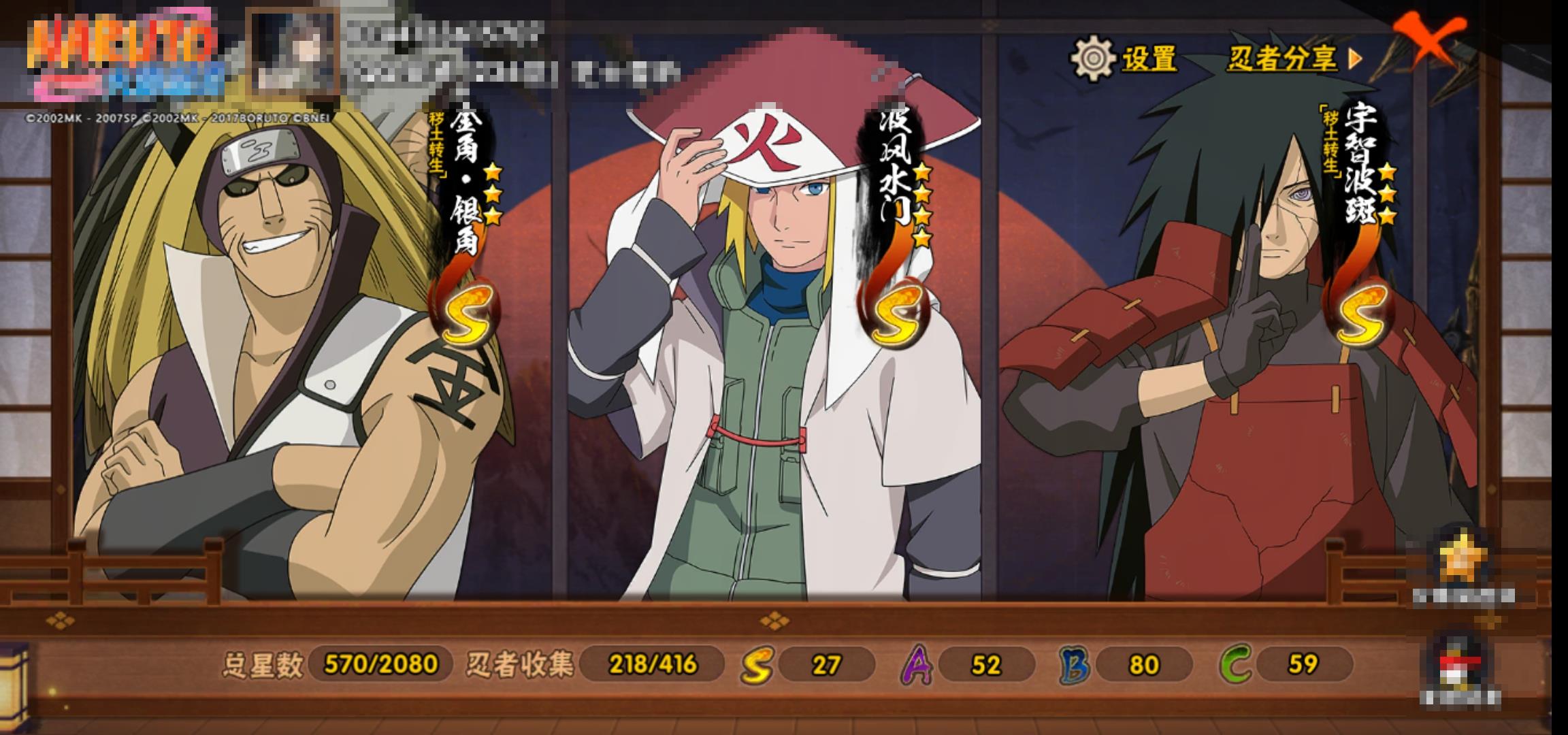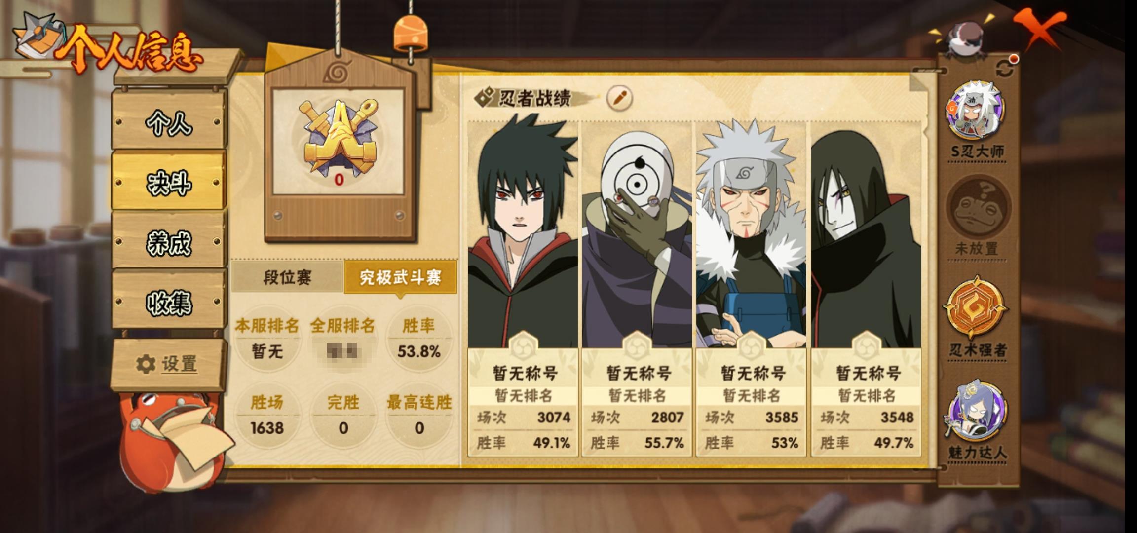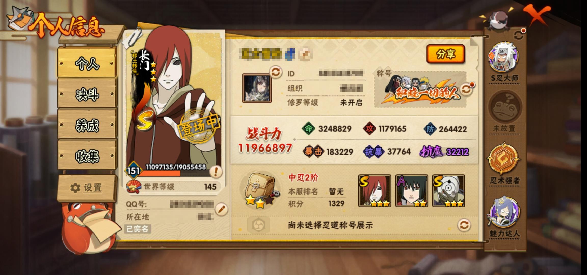 [14659416]0aqkp0 号 vip12,1196w战力,s忍27个,a忍52个,本服排名376,战区排名未上榜,通灵兽320个,7时装,中忍2阶,忍者星数570