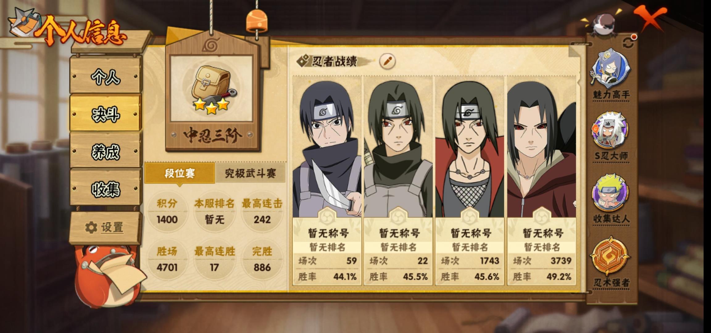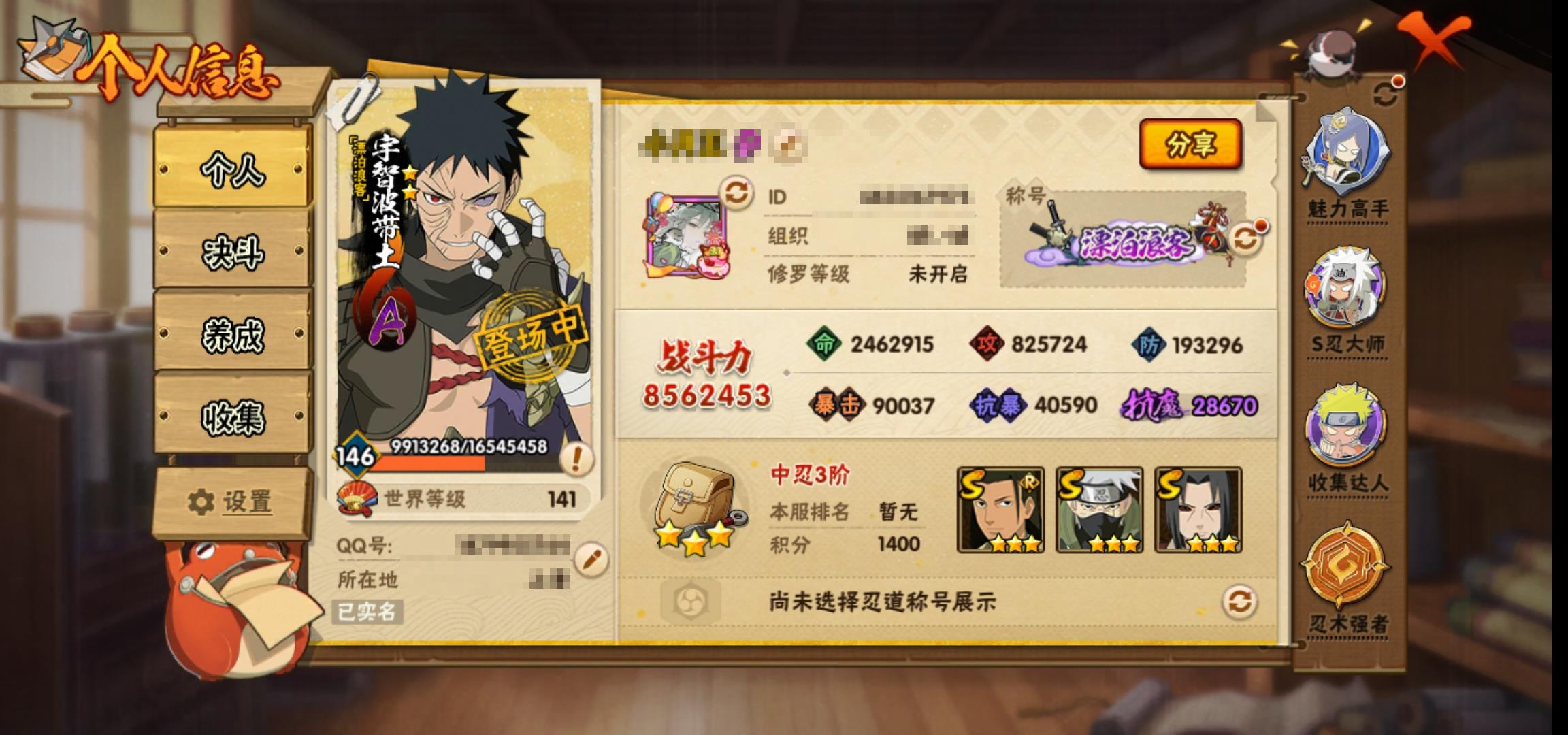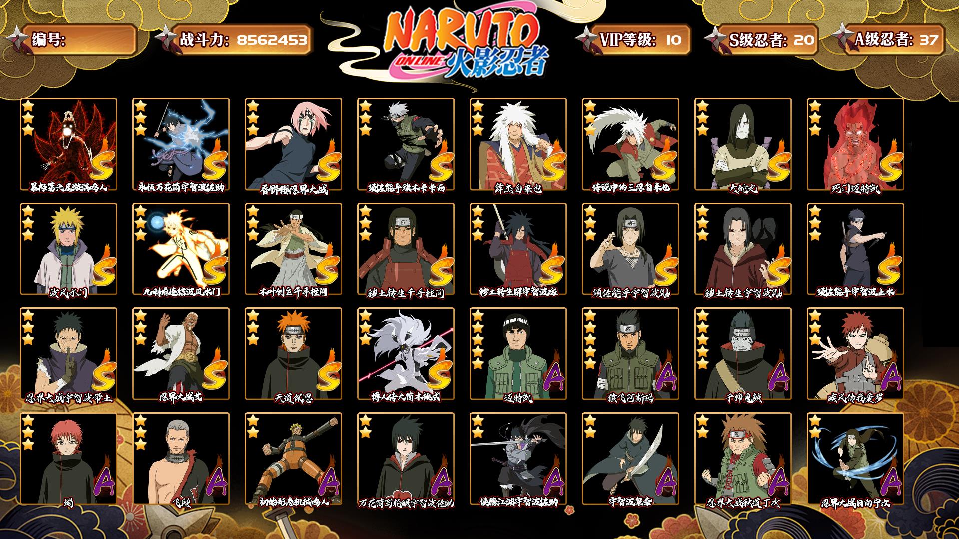[14659437]0aqksd 号 vip10,856w战力,s忍20个,a忍37个,本服排名606,战区排名未上榜,通灵兽318个,6时装,中忍3阶,忍者星数451