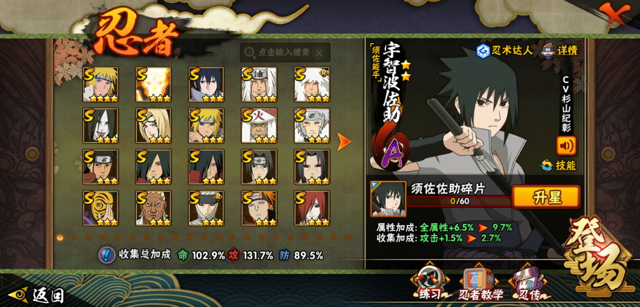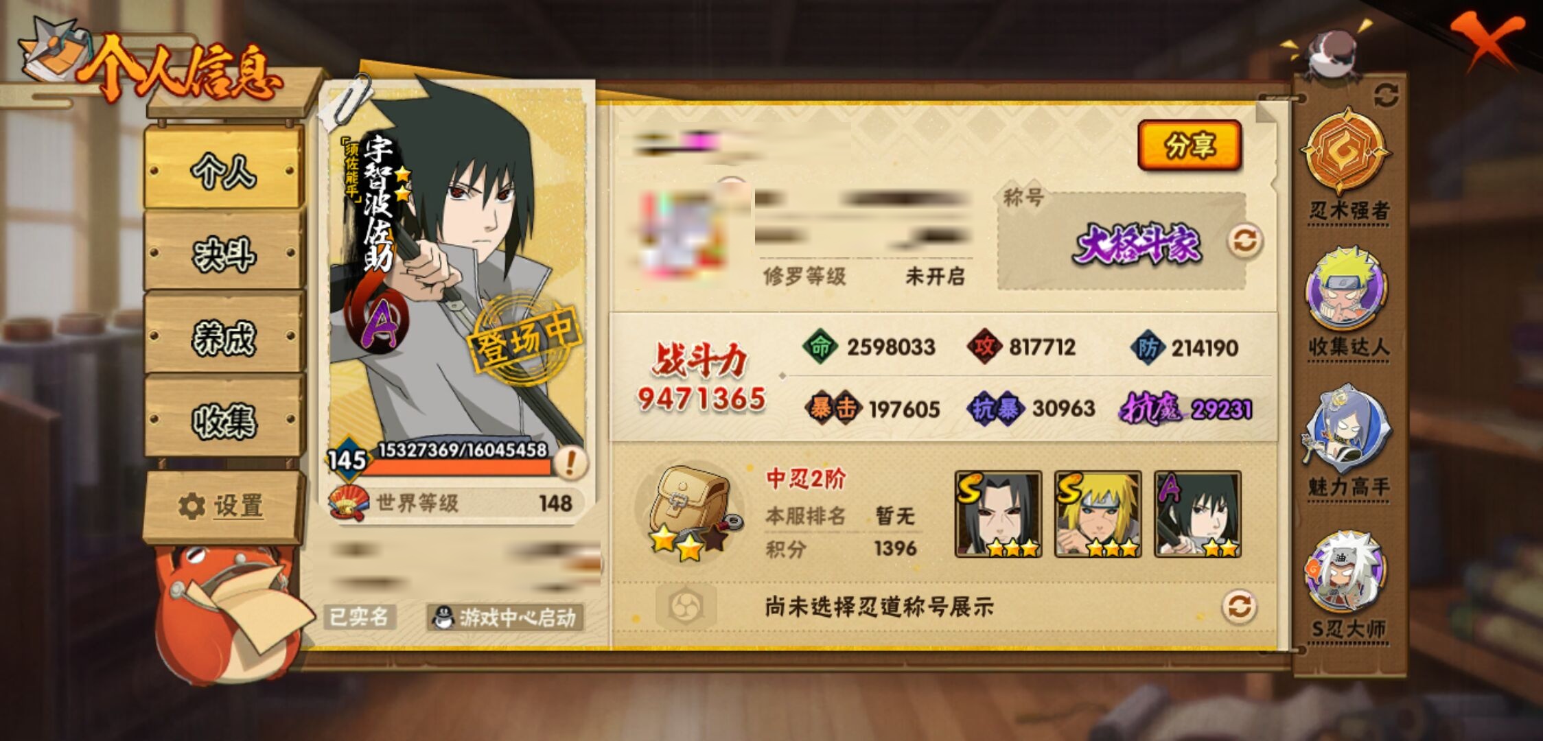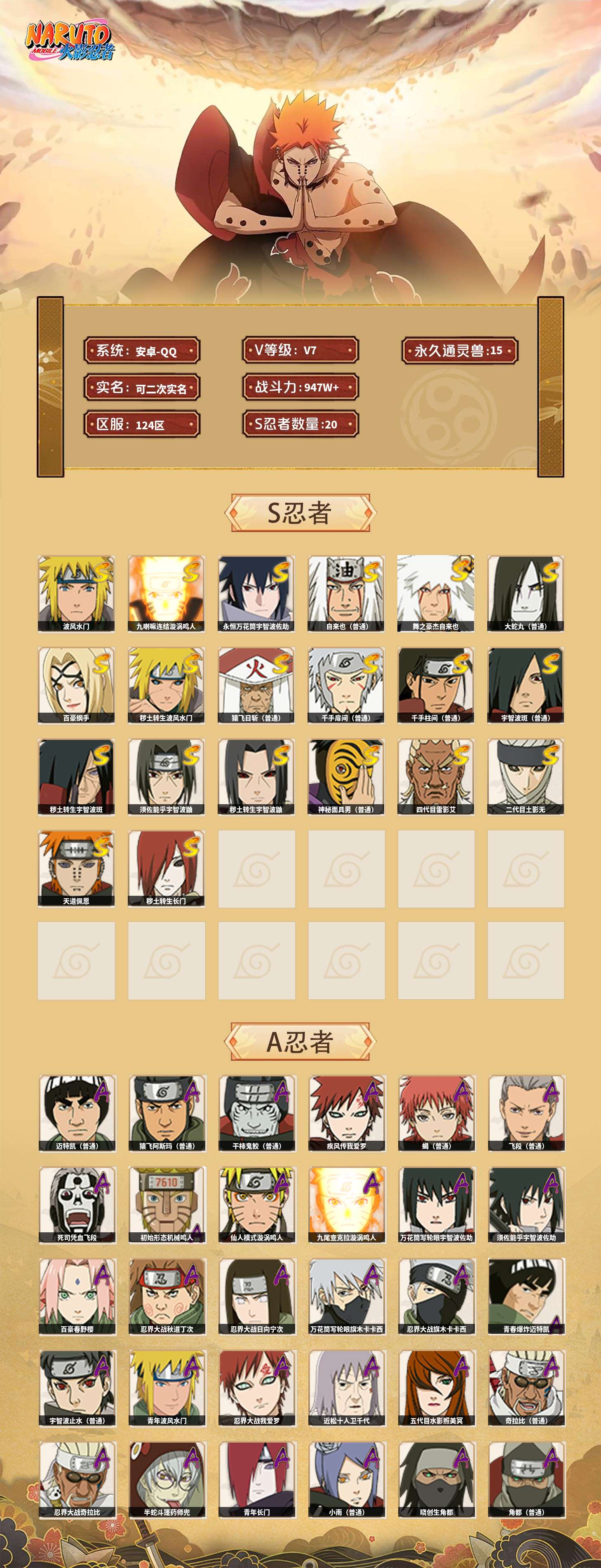 【火影忍者】【lyhy9382】战斗力:947w;段位:中忍2阶;本服排名:848;vip:v7级;s忍:20个;a忍:38个;通灵兽:15个,s忍:波风水门 4星|九喇嘛连结漩涡鸣人|永恒万花筒宇智波佐助|自来也(普通)|舞之豪杰自来也|大蛇丸(普通)|百豪纲手|秽土转生波风水门|猿飞日斩(普通)|千手扉间(普通)|千手柱间(普通)|宇智波斑(普通)|秽土转生宇智波斑|须佐能乎宇智波鼬|秽土转生宇智波鼬|神秘面具男(普通)|四代目雷影艾|二代目土影无|天道佩恩|秽土转生长门__a忍:迈特凯(普通) 5星|猿飞阿斯玛(普通) 5星|干柿鬼鲛(普通) 5星|疾风传我爱罗 4星|蝎(普通) 4星|飞段(普通) 4星|死司凭血飞段 3星|初始形态机械鸣人|仙人模式漩涡鸣人|九尾查克拉漩涡鸣人|万花筒写轮眼宇智波佐助|须佐能乎宇智波佐助|百豪春野樱|忍界大战秋道丁次|忍界大战日向宁次|万花筒写轮眼旗木卡卡西|忍界大战旗木卡卡西|青春爆炸迈特凯|宇智波止水(普通)|青年波风水门|忍界大战我爱罗|近松十人卫千代|五代目水影照美冥|奇拉比(普通)|忍界大战奇拉比|半蛇斗篷药师兜|青年长门|小南(普通)|晓创生角都|角都(普通)|地怨虞角都|晓大蛇丸|宇智波鼬(普通)|迪达拉(普通)|秽土转生迪达拉|侠隐江湖大野木|六代目水影长十郎|四代目土影黑土__通灵兽:忍犬(普通)|蓝蛇|蛤蟆吉|忍龟|镰鼬|猿魔|山椒鱼|蜃|蛤蟆仙人|鲛鲨|蛤蟆健|乌鸦(普通)|蛤蟆龙|砂之守鹤|蛤蟆广
