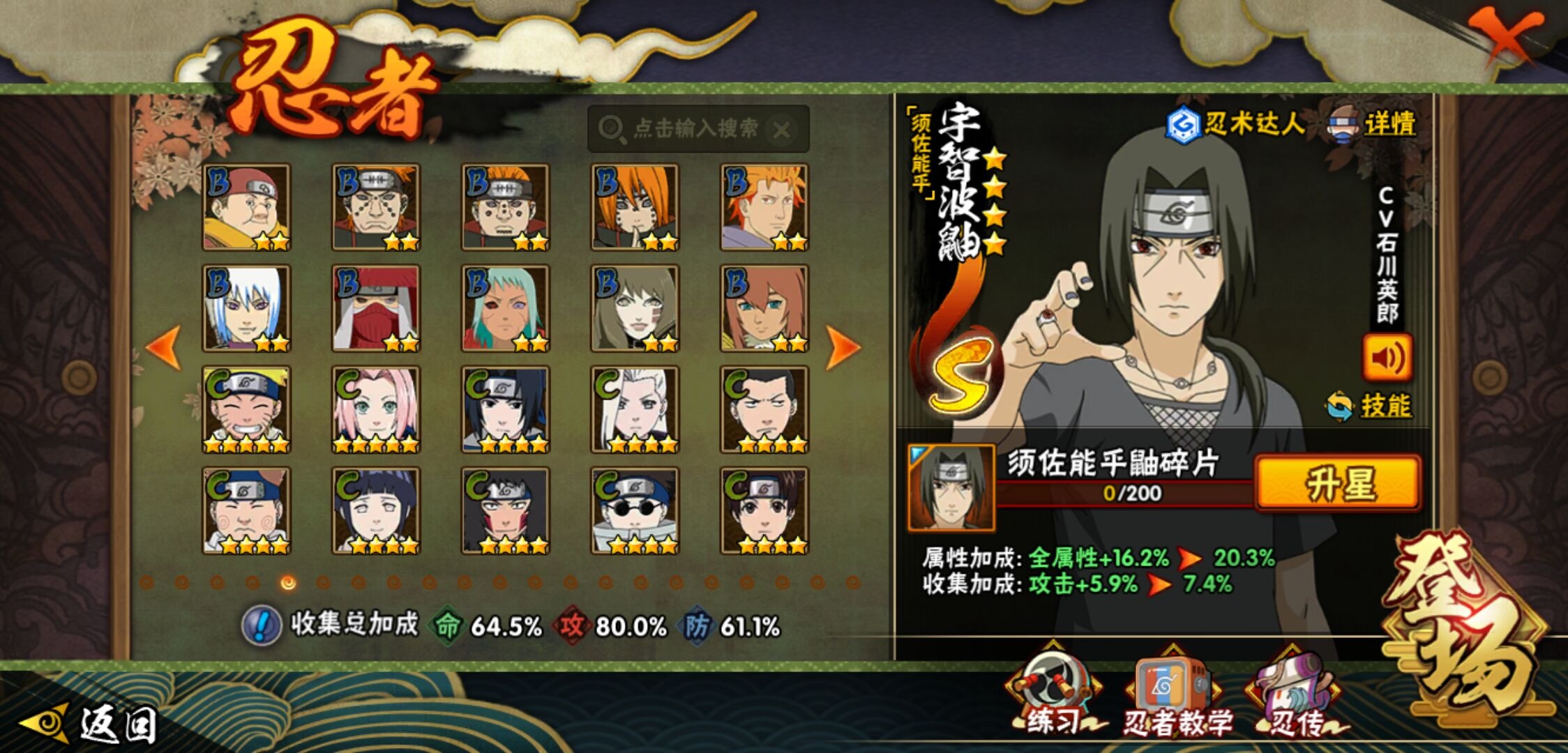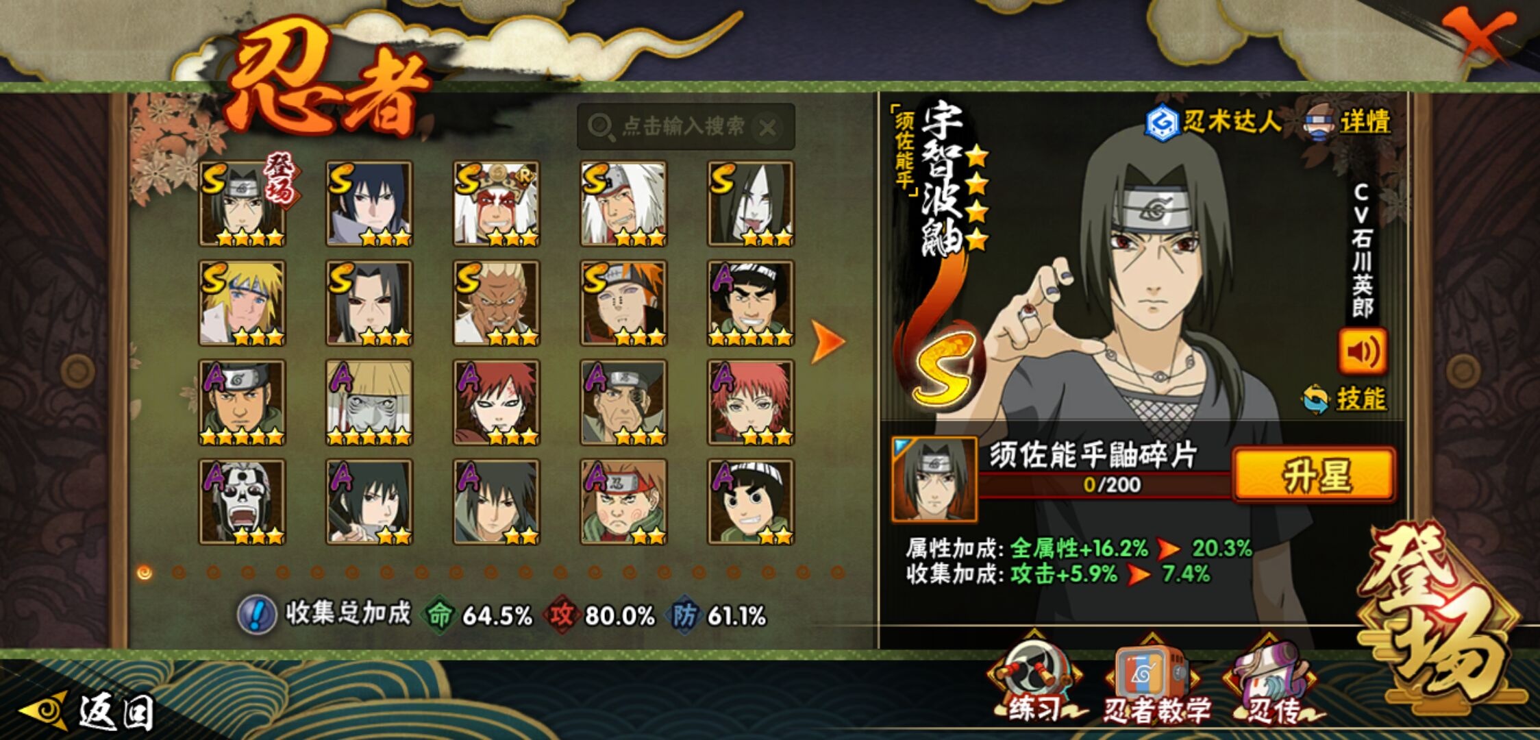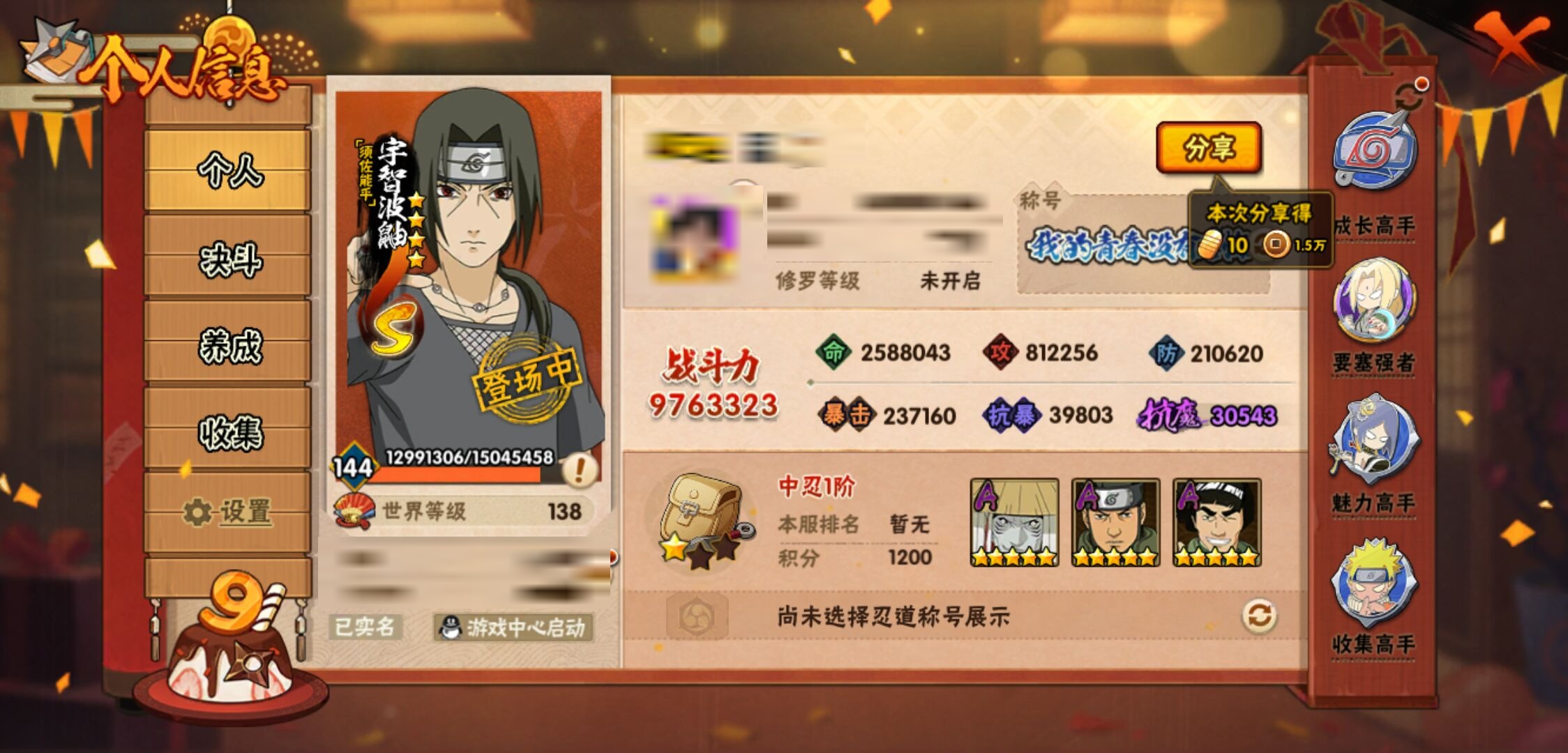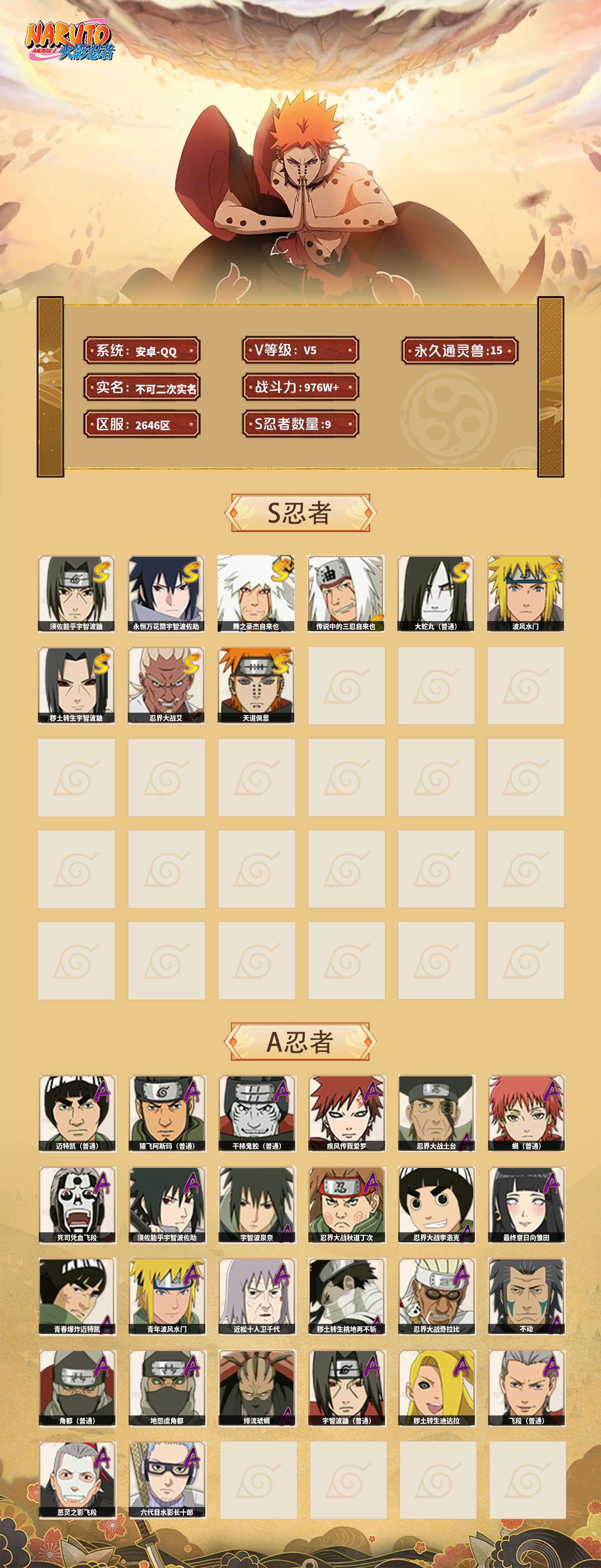 【火影忍者】【lyhy9384】战斗力:976w;段位:中忍1阶;本服排名:265;vip:v5级;s忍:9个;a忍:26个;通灵兽:15个,s忍:须佐能乎宇智波鼬 4星|永恒万花筒宇智波佐助|舞之豪杰自来也|传说中的三忍自来也|大蛇丸(普通)|波风水门|秽土转生宇智波鼬|忍界大战艾|天道佩恩__a忍:迈特凯(普通) 5星|猿飞阿斯玛(普通) 5星|干柿鬼鲛(普通) 5星|疾风传我爱罗 3星|忍界大战土台 3星|蝎(普通) 3星|死司凭血飞段 3星|须佐能乎宇智波佐助|宇智波泉奈|忍界大战秋道丁次|忍界大战李洛克|最终章日向雏田|青春爆炸迈特凯|青年波风水门|近松十人卫千代|秽土转生桃地再不斩|忍界大战奇拉比|不动|角都(普通)|地怨虞角都|绯流琥蝎|宇智波鼬(普通)|秽土转生迪达拉|飞段(普通)|恶灵之影飞段|六代目水影长十郎__通灵兽:忍犬(普通)|蓝蛇|砂之守鹤|蛤蟆吉|忍龟|镰鼬|猿魔|山椒鱼|蜃|蛤蟆仙人|鲛鲨|蛤蟆健|乌鸦(普通)|蛤蟆龙|蛤蟆广