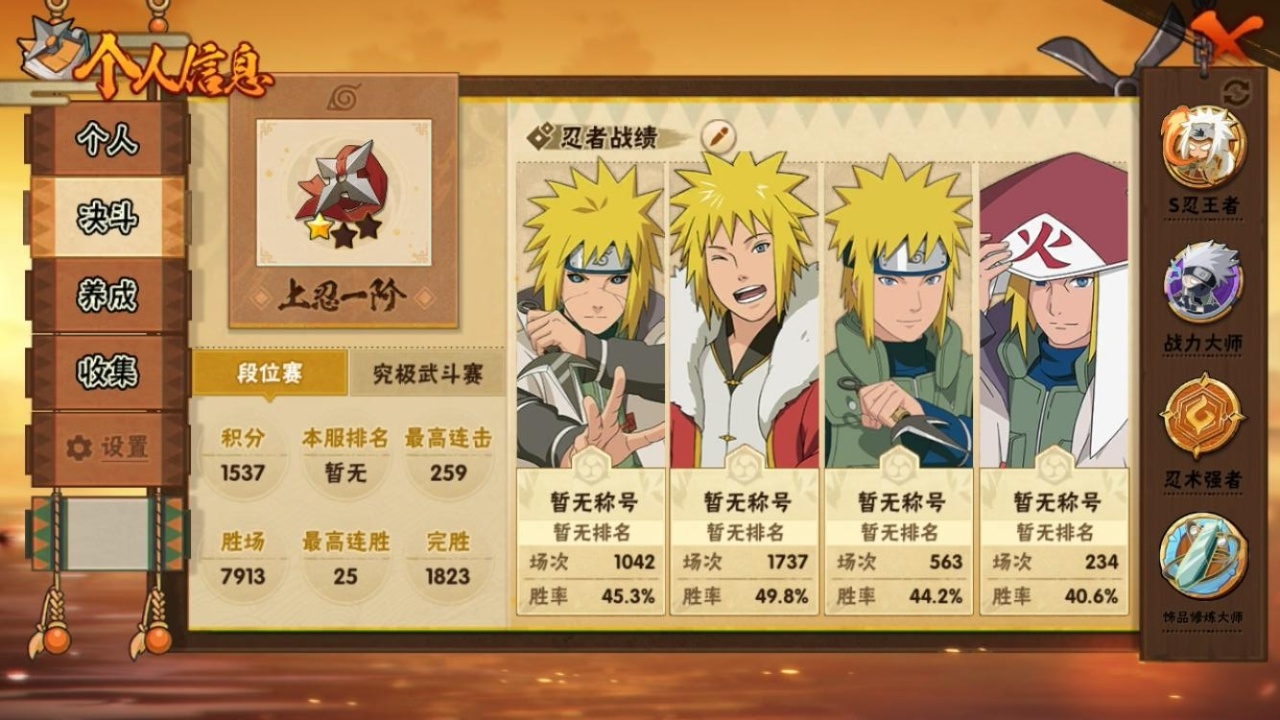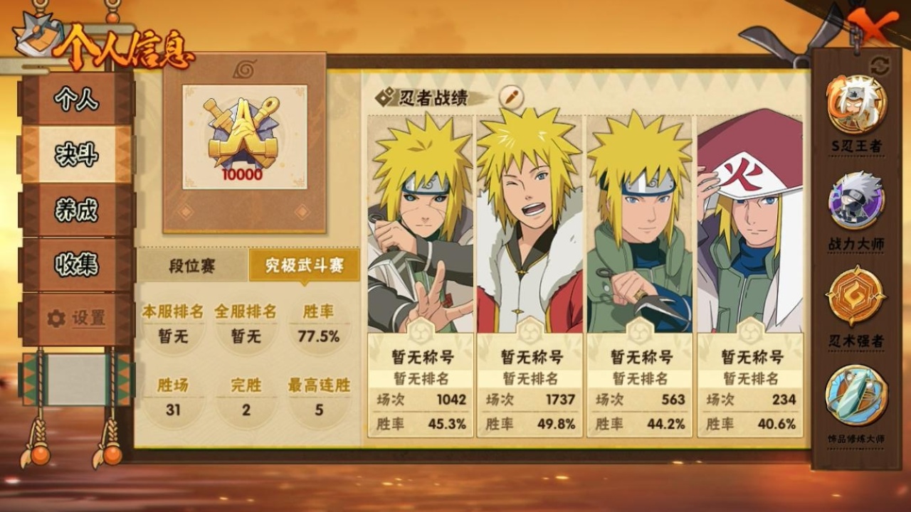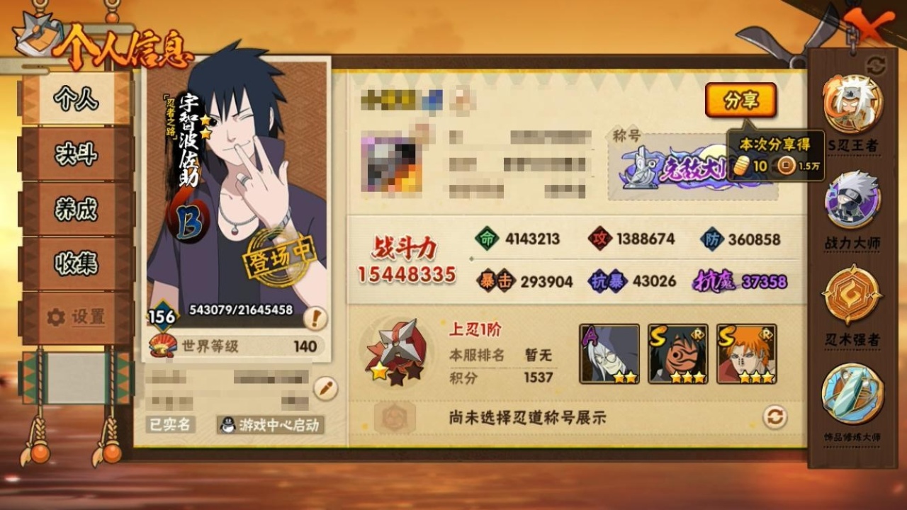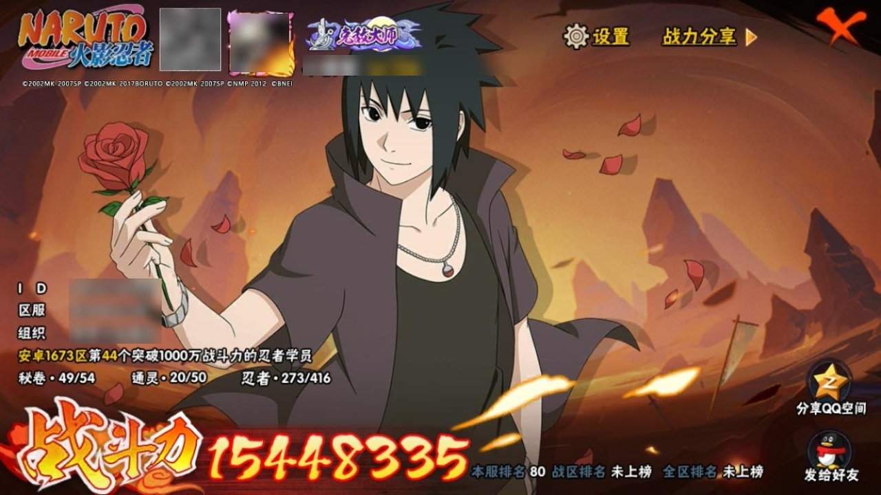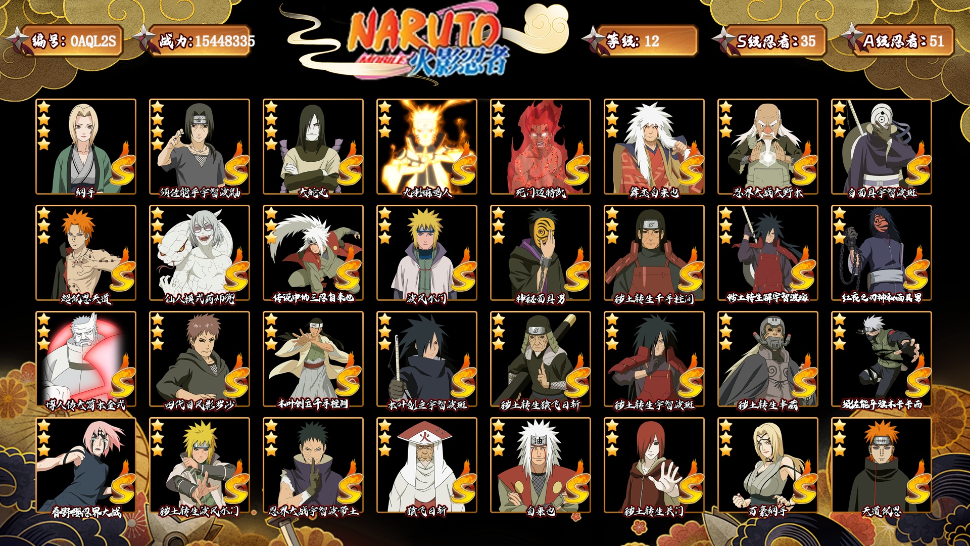 [14661694]0aql2s 号,vip12,战力:15448335,s忍者数量:35,a忍者数量:51,本服排名:80,战区排名:未上榜,通灵兽数量:20,时装数:20,段位:上忍1阶,忍者星数:688
