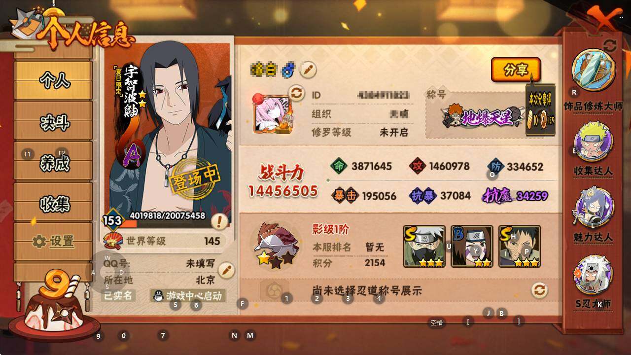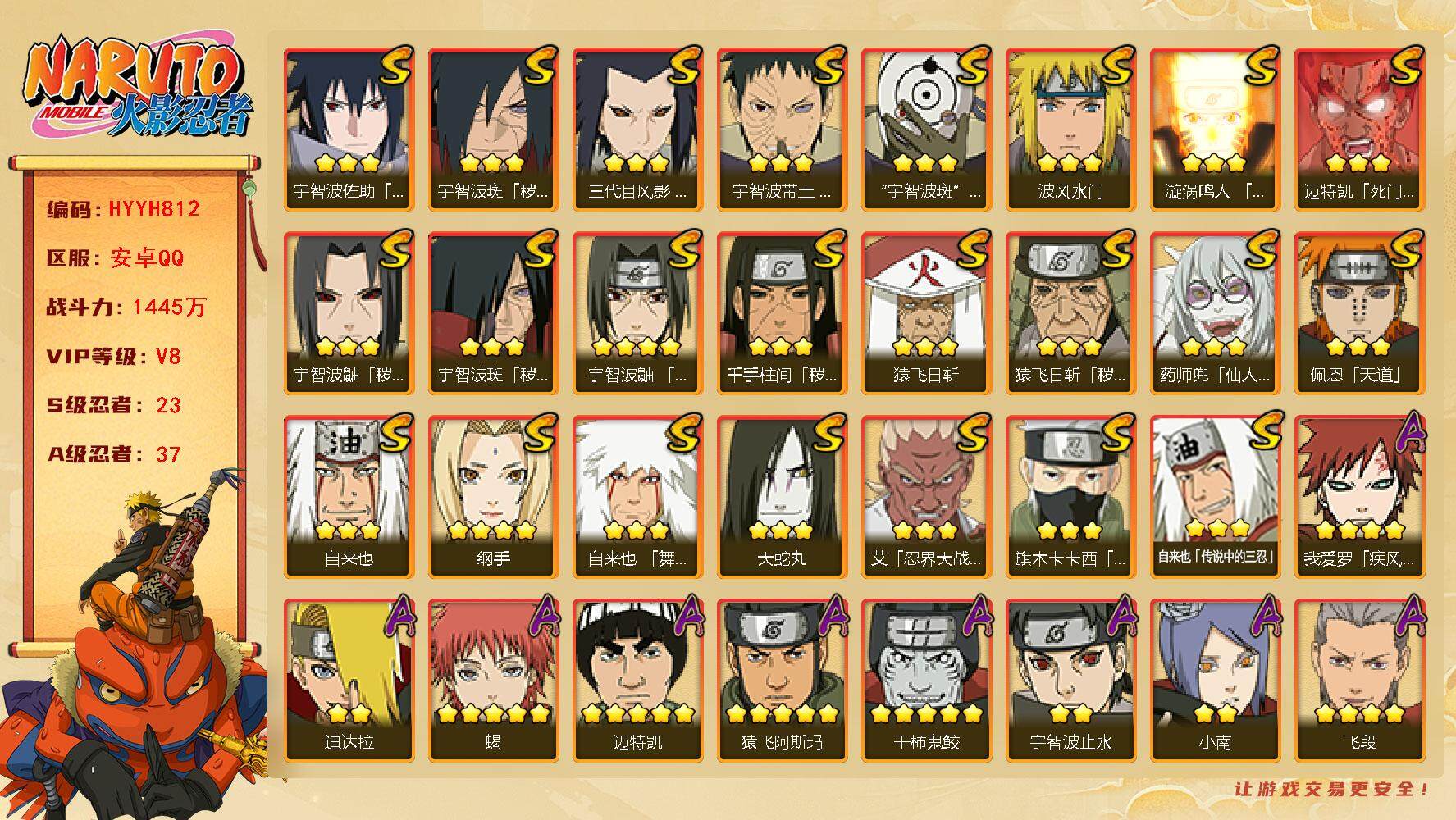 【hyyh812】v8/战力1445w/s忍23/a忍37/秽土斑/达鲁伊/止水/5星猿飞阿斯玛/须佐能乎旗木卡卡西/5星蝎/我爱罗「新春限定」/秽土三代目风影/秽土日斩/照美冥/5星迈特凯/自来也/忍战奇拉比/仙人兜/长十郎/蝎「绯流琥」/2星桃地再不斩「秽土转生」/白面具/4星纲手/死门凯/自来也「传说中的三忍」/猿飞日斩/博人传黑土/神农「羁绊」/3星飞段「死司凭血」/永恒万花筒佐助/迪