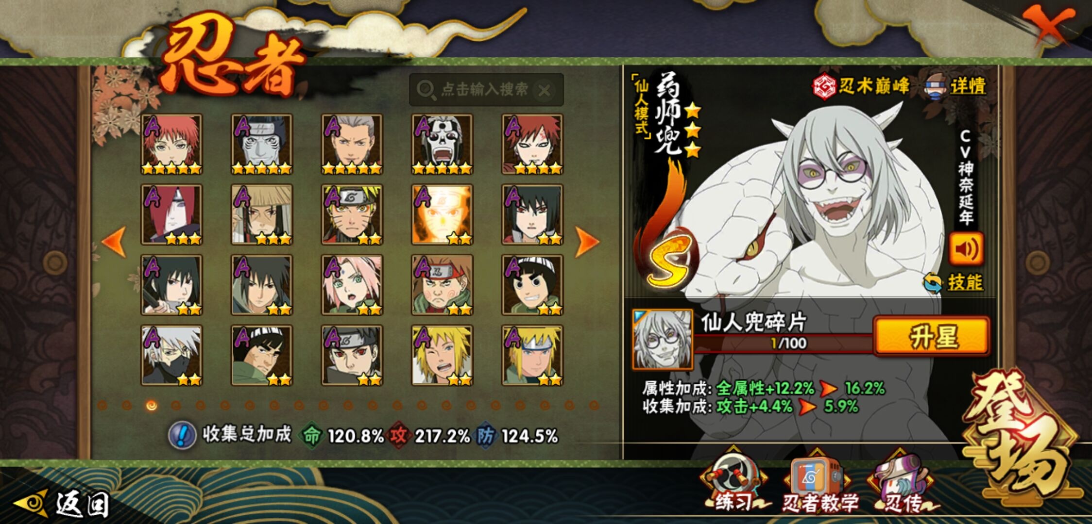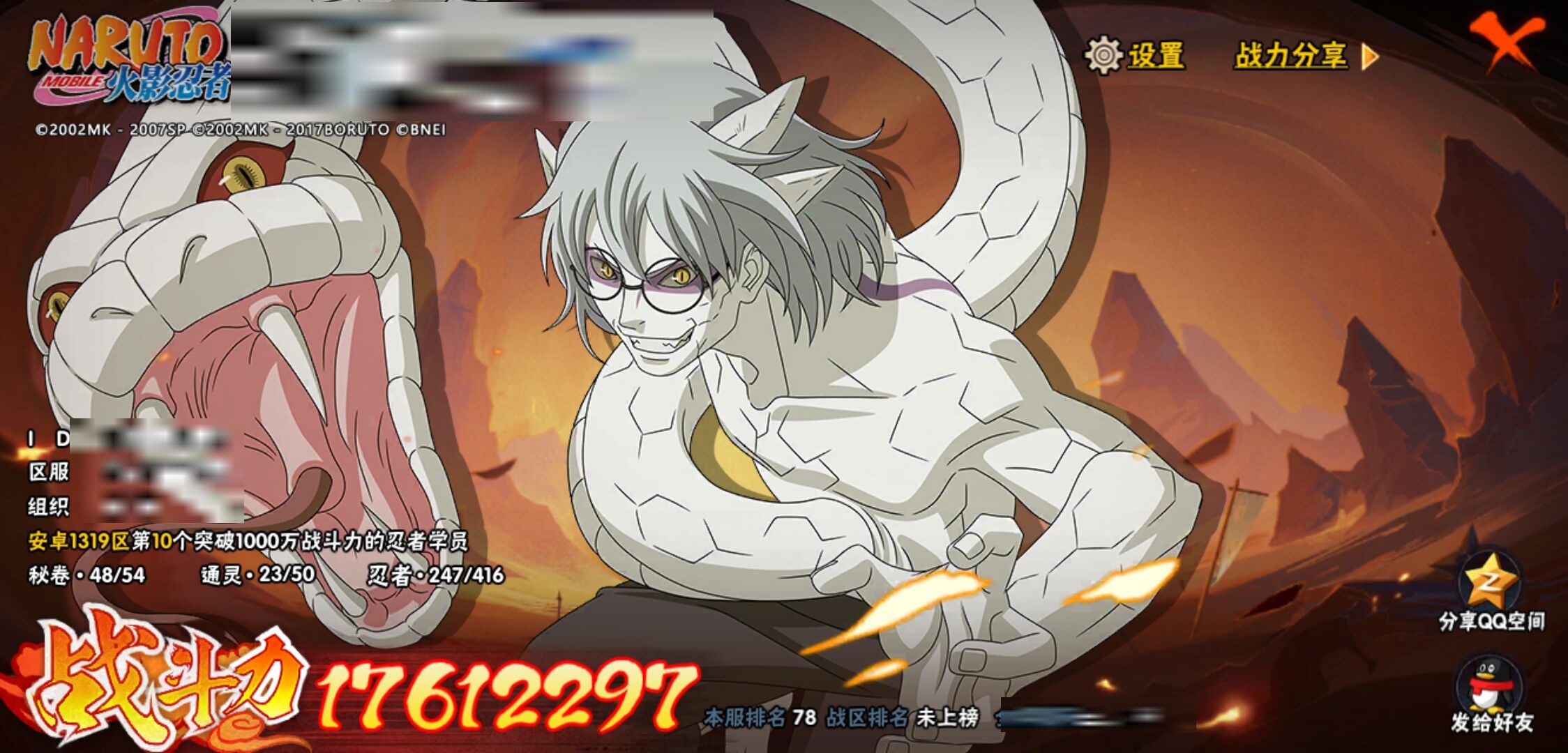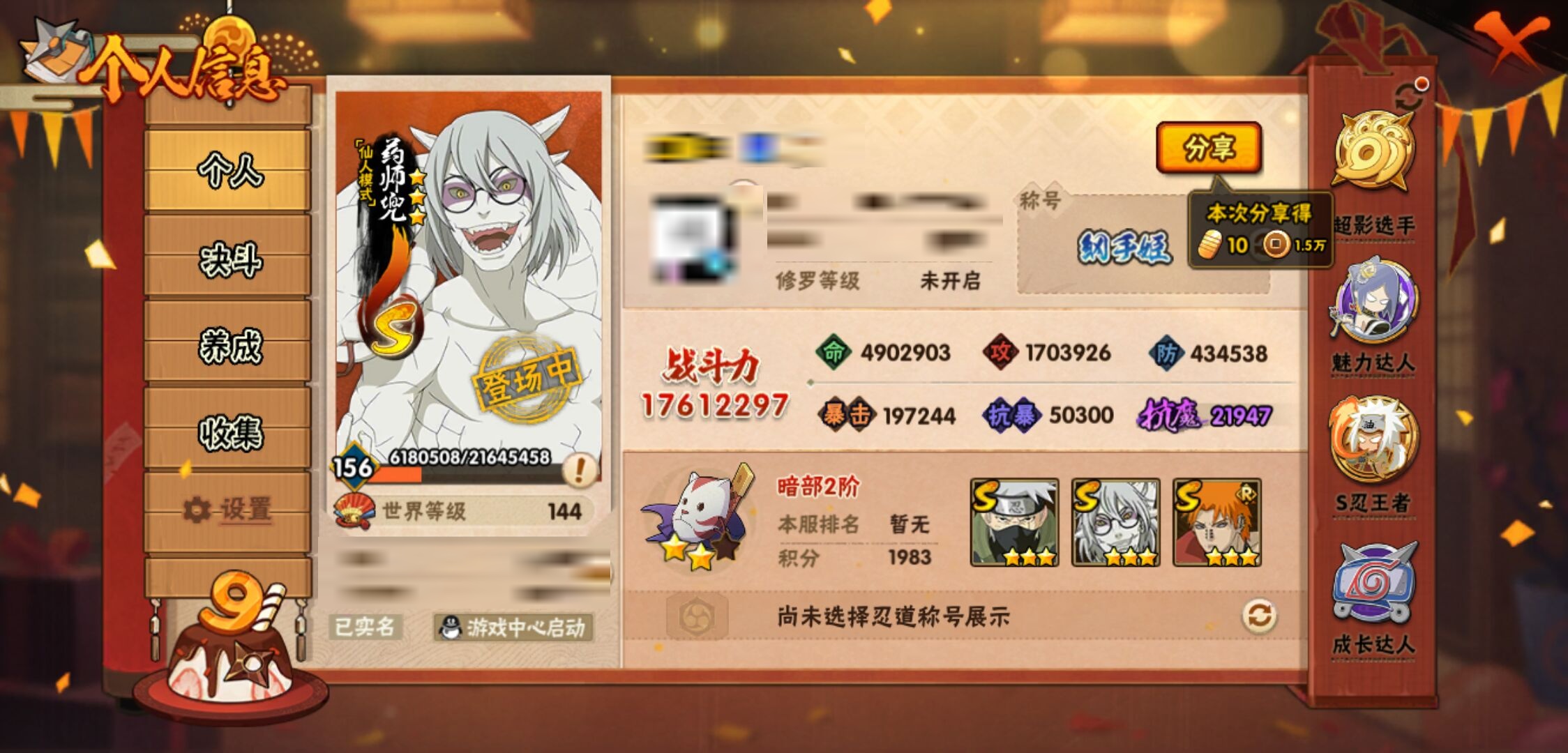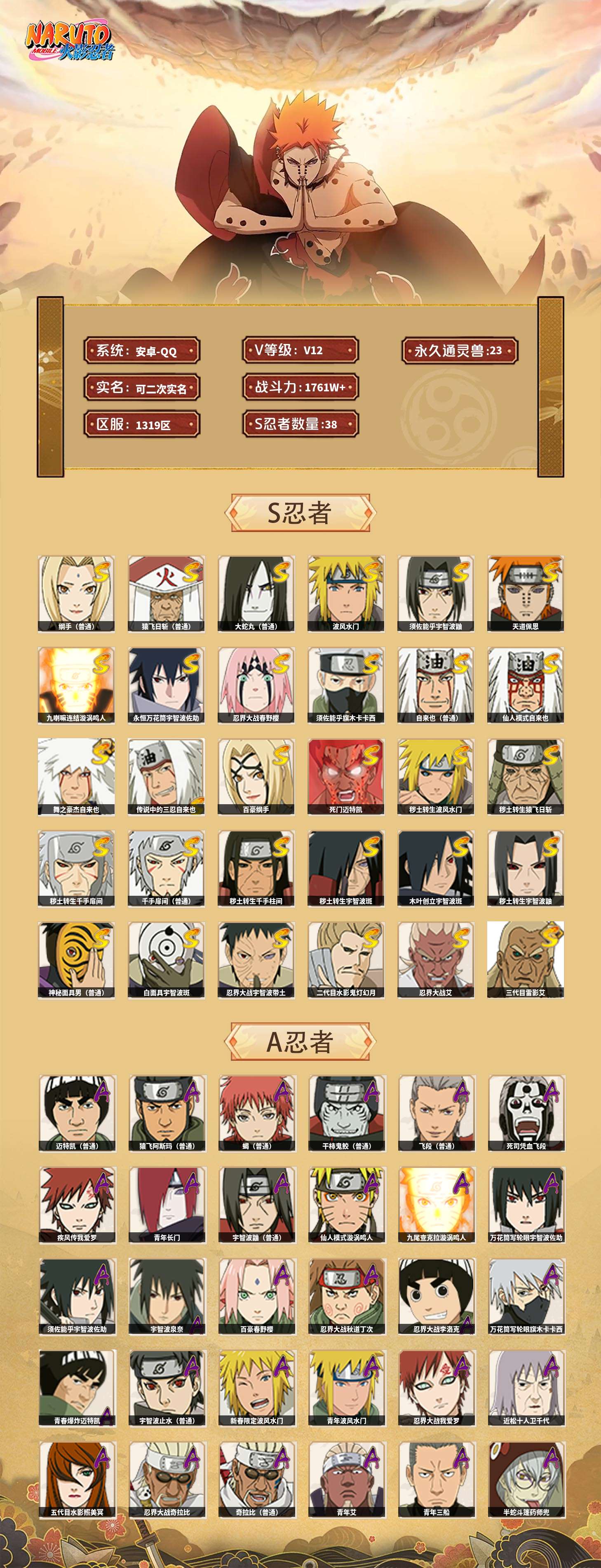 【火影忍者】【lyhy9390】战斗力:1761w;段位:暗部2阶;本服排名:78;vip:v12级;s忍:38个;a忍:44个;通灵兽:23个,s忍:纲手(普通) 5星|猿飞日斩(普通) 5星|大蛇丸(普通) 4星|波风水门 4星|须佐能乎宇智波鼬 4星|天道佩恩 4星|九喇嘛连结漩涡鸣人|永恒万花筒宇智波佐助|忍界大战春野樱|须佐能乎旗木卡卡西|自来也(普通)|仙人模式自来也|舞之豪杰自来也|传说中的三忍自来也|百豪纲手|死门迈特凯|秽土转生波风水门|秽土转生猿飞日斩|秽土转生千手扉间|千手扉间(普通)|秽土转生千手柱间|秽土转生宇智波斑|木叶创立宇智波斑|秽土转生宇智波鼬|神秘面具男(普通)|白面具宇智波斑|忍界大战宇智波带土|二代目水影鬼灯幻月|忍界大战艾|三代目雷影艾|秽土转生金角银角|三代目土影大野木|忍界大战大野木|二代目土影无|秽土转生半藏|超佩恩天道|仙人模式药师兜|博人传大筒木金式__a忍:迈特凯(普通) 5星|猿飞阿斯玛(普通) 5星|蝎(普通) 5星|干柿鬼鲛(普通) 5星|飞段(普通) 5星|死司凭血飞段 5星|疾风传我爱罗 4星|青年长门 3星|宇智波鼬(普通) 3星|仙人模式漩涡鸣人|九尾查克拉漩涡鸣人|万花筒写轮眼宇智波佐助|须佐能乎宇智波佐助|宇智波泉奈|百豪春野樱|忍界大战秋道丁次|忍界大战李洛克|万花筒写轮眼旗木卡卡西|青春爆炸迈特凯|宇智波止水(普通)|新春限定波风水门|青年波风水门|忍界大战我爱罗|近松十人卫千代|五代目水影照美冥|忍界大战奇拉比|奇拉比(普通)|青年艾|青年三船|半蛇斗篷药师兜|小南(普通)|新春限定小南|晓大蛇丸|绯流琥蝎|新春限定宇智波鼬|迪达拉(普通)|秽土转生迪达拉|侠隐江湖大野木|木叶上忍猿飞木叶丸|桃式显现漩涡博人|五代目雷影达鲁伊|六代目水影长十郎|仙人模式巳月|四代目土影黑土__通灵兽:忍犬(普通)|蓝蛇|蛤蟆吉|忍龟|镰鼬|猿魔|山椒鱼|蜃|熊猫|蛤蟆仙人|鲛鲨|蛤蟆健|乌鸦(普通)|蛞蝓(普通)|蛤蟆龙|蛤蟆广|二尾又旅|砂之守鹤|梦貘|螃蟹|鹰|蜘蛛|辛牙