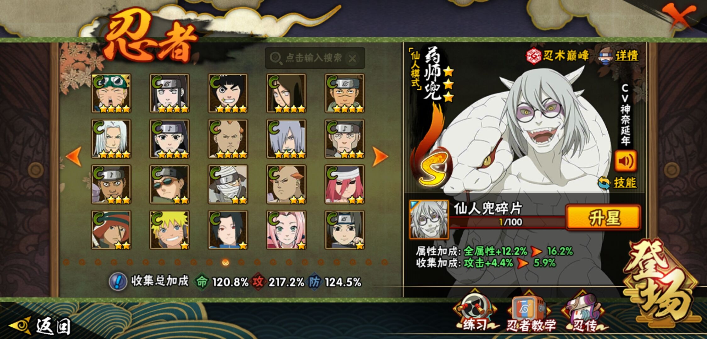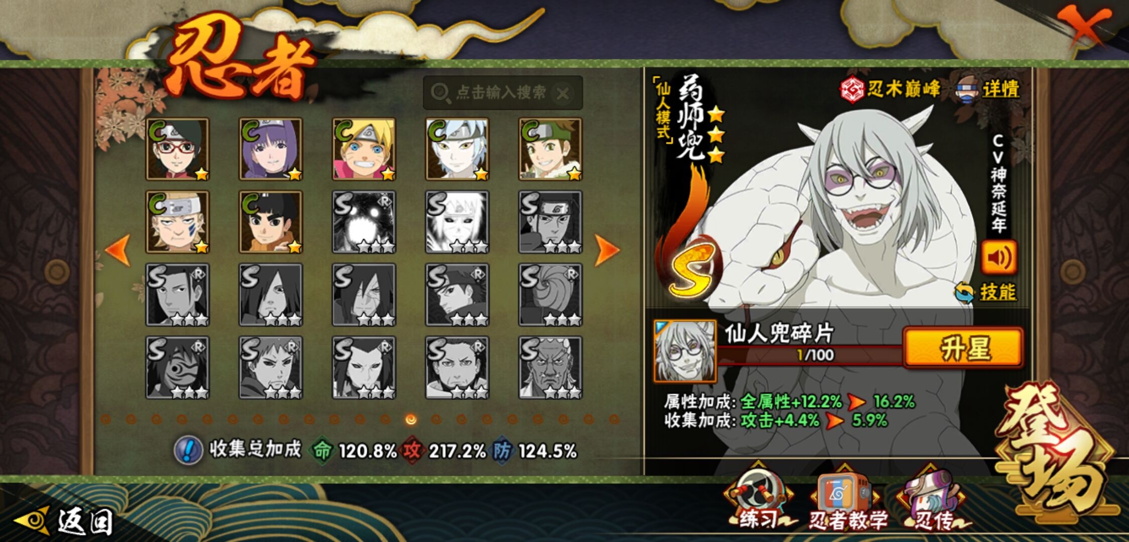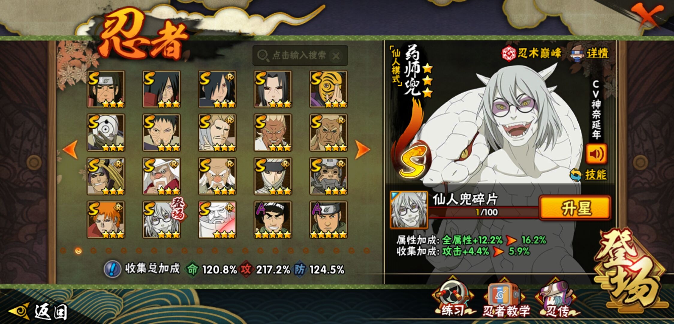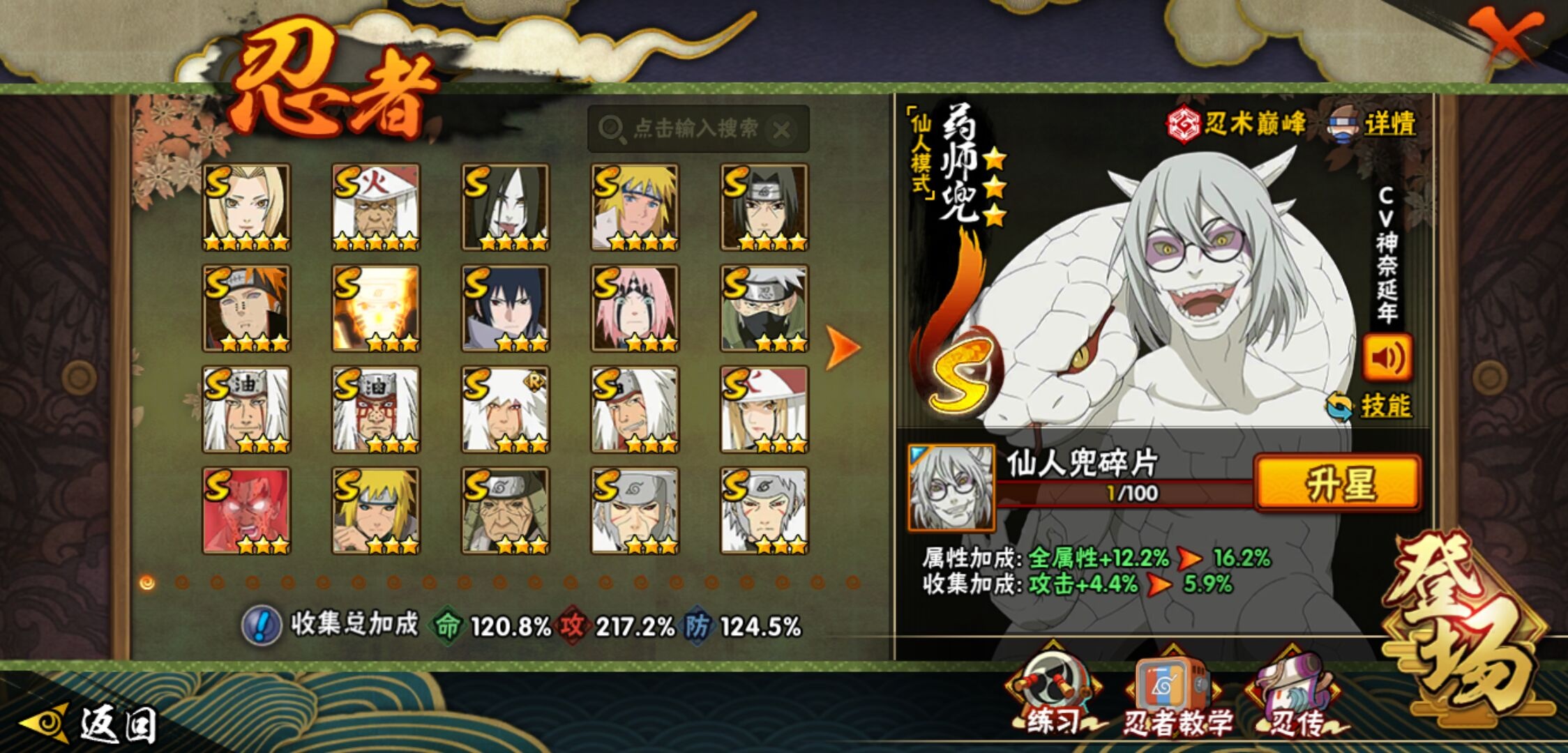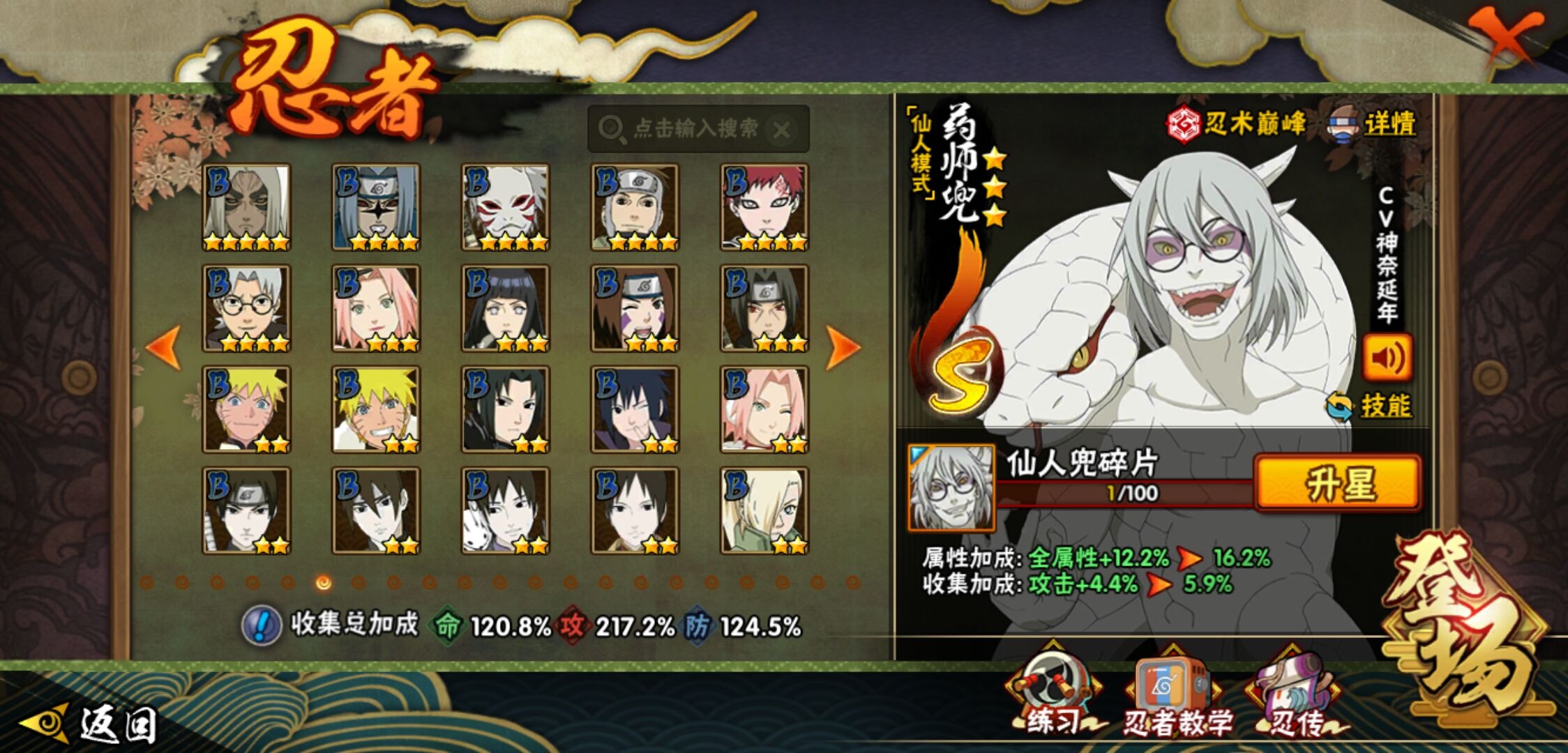 【火影忍者】【lyhy9390】战斗力:1761w;段位:暗部2阶;本服排名:78;vip:v12级;s忍:38个;a忍:44个;通灵兽:23个,s忍:纲手(普通) 5星|猿飞日斩(普通) 5星|大蛇丸(普通) 4星|波风水门 4星|须佐能乎宇智波鼬 4星|天道佩恩 4星|九喇嘛连结漩涡鸣人|永恒万花筒宇智波佐助|忍界大战春野樱|须佐能乎旗木卡卡西|自来也(普通)|仙人模式自来也|舞之豪杰自来也|传说中的三忍自来也|百豪纲手|死门迈特凯|秽土转生波风水门|秽土转生猿飞日斩|秽土转生千手扉间|千手扉间(普通)|秽土转生千手柱间|秽土转生宇智波斑|木叶创立宇智波斑|秽土转生宇智波鼬|神秘面具男(普通)|白面具宇智波斑|忍界大战宇智波带土|二代目水影鬼灯幻月|忍界大战艾|三代目雷影艾|秽土转生金角银角|三代目土影大野木|忍界大战大野木|二代目土影无|秽土转生半藏|超佩恩天道|仙人模式药师兜|博人传大筒木金式__a忍:迈特凯(普通) 5星|猿飞阿斯玛(普通) 5星|蝎(普通) 5星|干柿鬼鲛(普通) 5星|飞段(普通) 5星|死司凭血飞段 5星|疾风传我爱罗 4星|青年长门 3星|宇智波鼬(普通) 3星|仙人模式漩涡鸣人|九尾查克拉漩涡鸣人|万花筒写轮眼宇智波佐助|须佐能乎宇智波佐助|宇智波泉奈|百豪春野樱|忍界大战秋道丁次|忍界大战李洛克|万花筒写轮眼旗木卡卡西|青春爆炸迈特凯|宇智波止水(普通)|新春限定波风水门|青年波风水门|忍界大战我爱罗|近松十人卫千代|五代目水影照美冥|忍界大战奇拉比|奇拉比(普通)|青年艾|青年三船|半蛇斗篷药师兜|小南(普通)|新春限定小南|晓大蛇丸|绯流琥蝎|新春限定宇智波鼬|迪达拉(普通)|秽土转生迪达拉|侠隐江湖大野木|木叶上忍猿飞木叶丸|桃式显现漩涡博人|五代目雷影达鲁伊|六代目水影长十郎|仙人模式巳月|四代目土影黑土__通灵兽:忍犬(普通)|蓝蛇|蛤蟆吉|忍龟|镰鼬|猿魔|山椒鱼|蜃|熊猫|蛤蟆仙人|鲛鲨|蛤蟆健|乌鸦(普通)|蛞蝓(普通)|蛤蟆龙|蛤蟆广|二尾又旅|砂之守鹤|梦貘|螃蟹|鹰|蜘蛛|辛牙