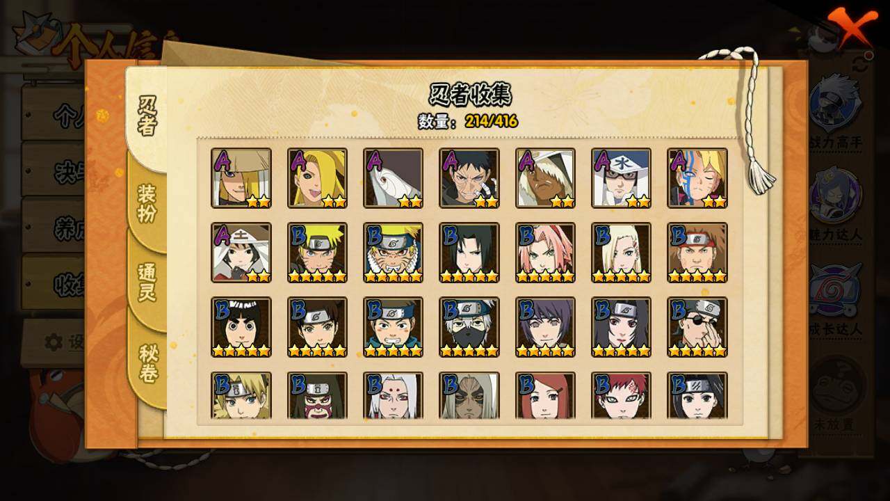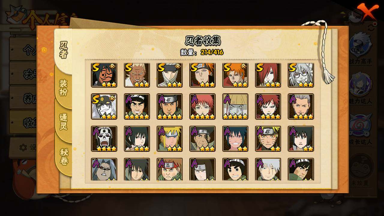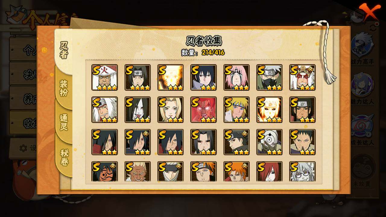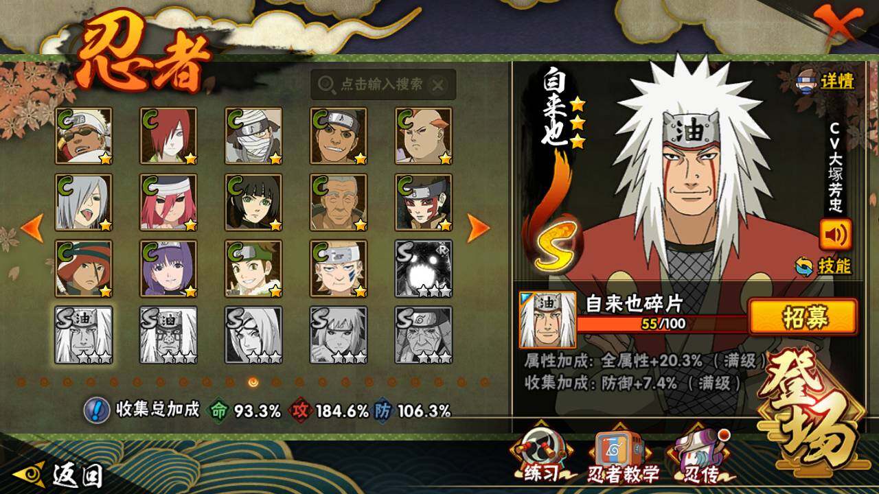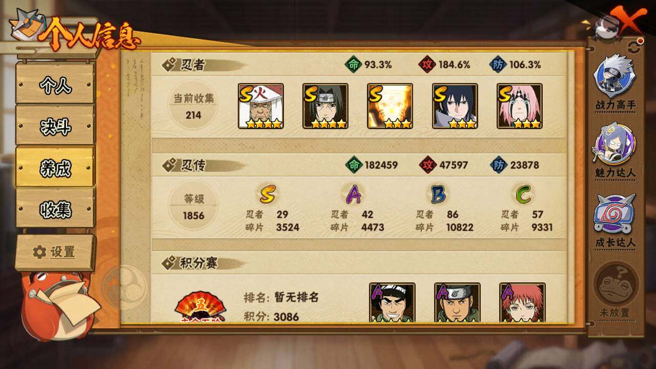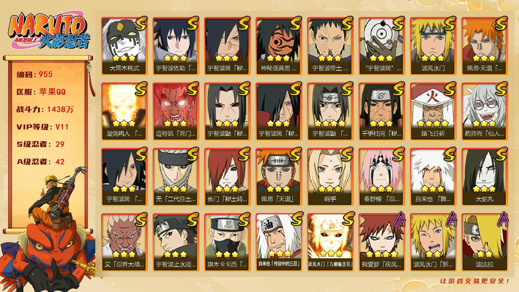 [14672746]v11 1438万战力 29s-42a 金币4.5万 有熊猫 自来也55片 烈斗50片 ll5545 【s级忍者】:长门「秽土转生」3星,千手柱间「秽土转生」3星,宇智波鼬「秽土转生」3星,宇智波斑「秽土转生」3星,宇智波斑「秽土转生·解」3星,春野樱「忍界大战」3星,宇智波带土「忍界大战」3星,艾「忍界大战」3星,宇智波鼬「须佐能乎」4星,宇智波止水「须佐能乎」3星,旗木卡卡西「须佐能乎」3星,宇智波斑「木叶创立」3星,无「二代目土影」3星,自来也「舞之豪杰」3星,大蛇丸3星,自来也「传说中的三忍」3星,纲手3星,猿飞日斩4星,波风水门3星,药师兜「仙人模式」3星,神秘面具男「红夜之刃」3星,漩涡鸣人「九喇嘛连结」3星,迈特凯「死门」3星,佩恩「天道」3星,佩恩·天道「超」3星,宇智波佐助「永恒万花筒」3星,宇智波斑 「白面具」3星宇智波斑「白面具」,大筒木桃式3星,波风水门「九喇嘛连结」3星 【a级忍者】:艾「青年」2星,长门「青年」2星,波风水门「青年」3星,波风水门「新春限定」2星,达鲁伊「博人传」2星,迪达拉2星,迪达拉「秽土转生」2星,大蛇丸「晓」2星,奇拉比「忍界大战」2星,飞段4星,飞段「死司凭血」4星,干柿鬼鲛5星,漩涡博人「桃式显现」2星,漩涡鸣人「仙人模式」2星,迈特凯5星,旗木卡卡西「幻之真容」2星,桃地再不斩「秽土转生」2星,我爱罗「疾风传」4星,蝎5星,蝎「绯流琥」2星,小南2星,猿飞阿斯玛5星,宇智波止水「新春限定」2星,宇智波鼬2星,宇智波佐助「须佐能乎」3星,宇智波佐助「疾风传咒印」2星,宇智波佐助「万花筒写轮眼」2星,照美冥「五代目水影」2星,日向宁次「忍界大战」2星,宇智波带土「暴怒」2星,宇智波带土「漂泊浪客」2星,长十郎「六代目水影」2星,神秘面具男「忍者之路」2星,李洛克「忍界大战」2星,黑土「博人传」2星,千手扉间「漂泊武士」2星,秋道丁次「忍界大战」2星,千代「近松十人卫」2星,土台「忍界大战」3星,不缘2星,宇智波泉奈2星,迈特凯「青春爆炸