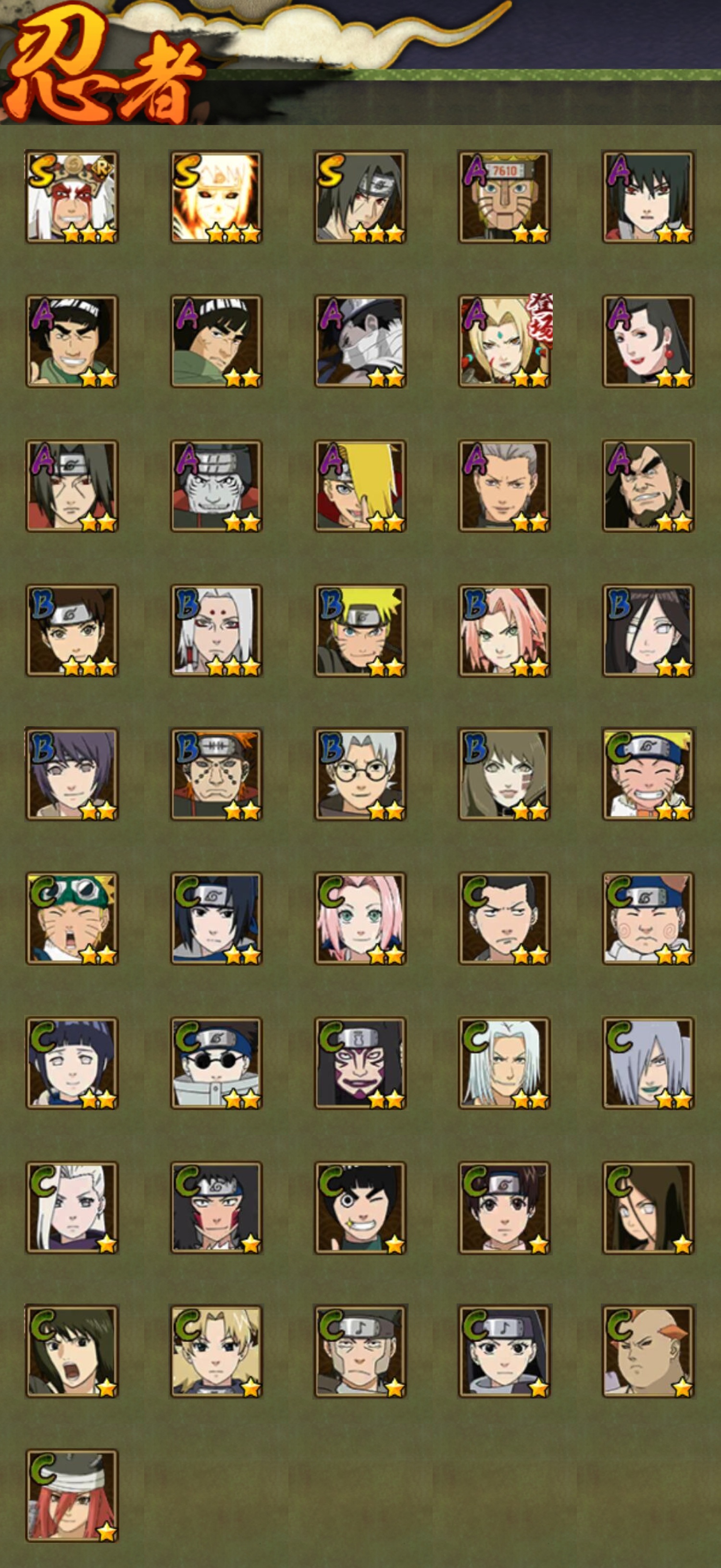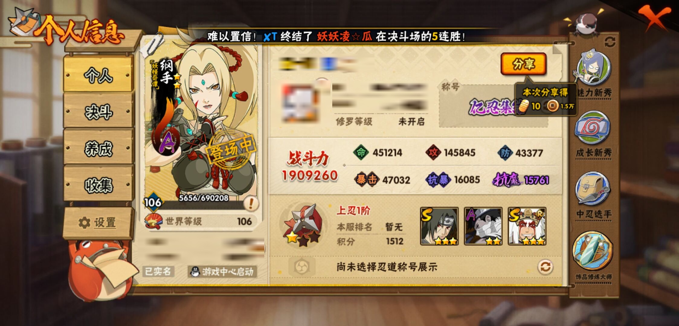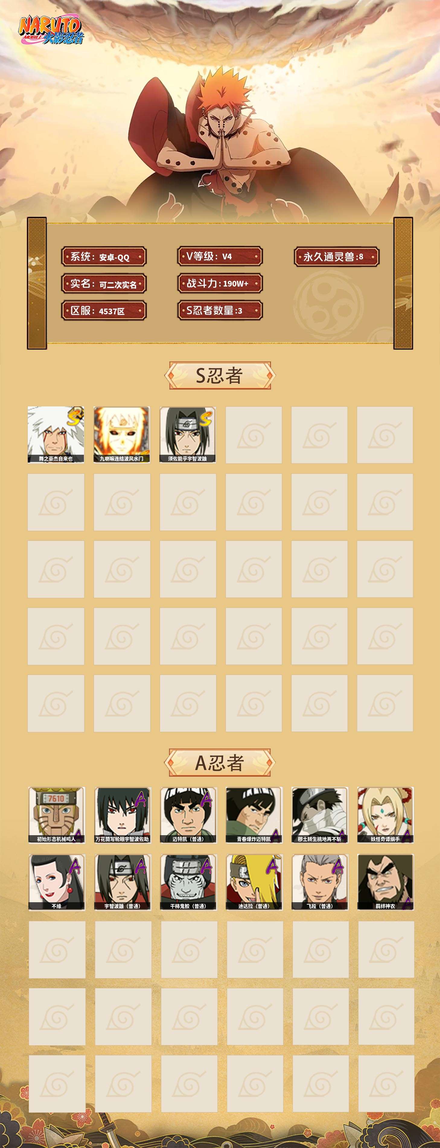 【火影忍者】【lyhy9406】战斗力:190w;段位:上忍1阶;本服排名:1011;vip:v4级;s忍:3个;a忍:12个;通灵兽:8个,s忍:舞之豪杰自来也|九喇嘛连结波风水门|须佐能乎宇智波鼬__a忍:初始形态机械鸣人|万花筒写轮眼宇智波佐助|迈特凯(普通)|青春爆炸迈特凯|秽土转生桃地再不斩|妖怪奇谭纲手|不缘|宇智波鼬(普通)|干柿鬼鲛(普通)|迪达拉(普通)|飞段(普通)|羁绊神农__通灵兽:忍犬(普通)|蓝蛇|蛤蟆吉|忍龟|镰鼬|猿魔|砂之守鹤|山椒鱼