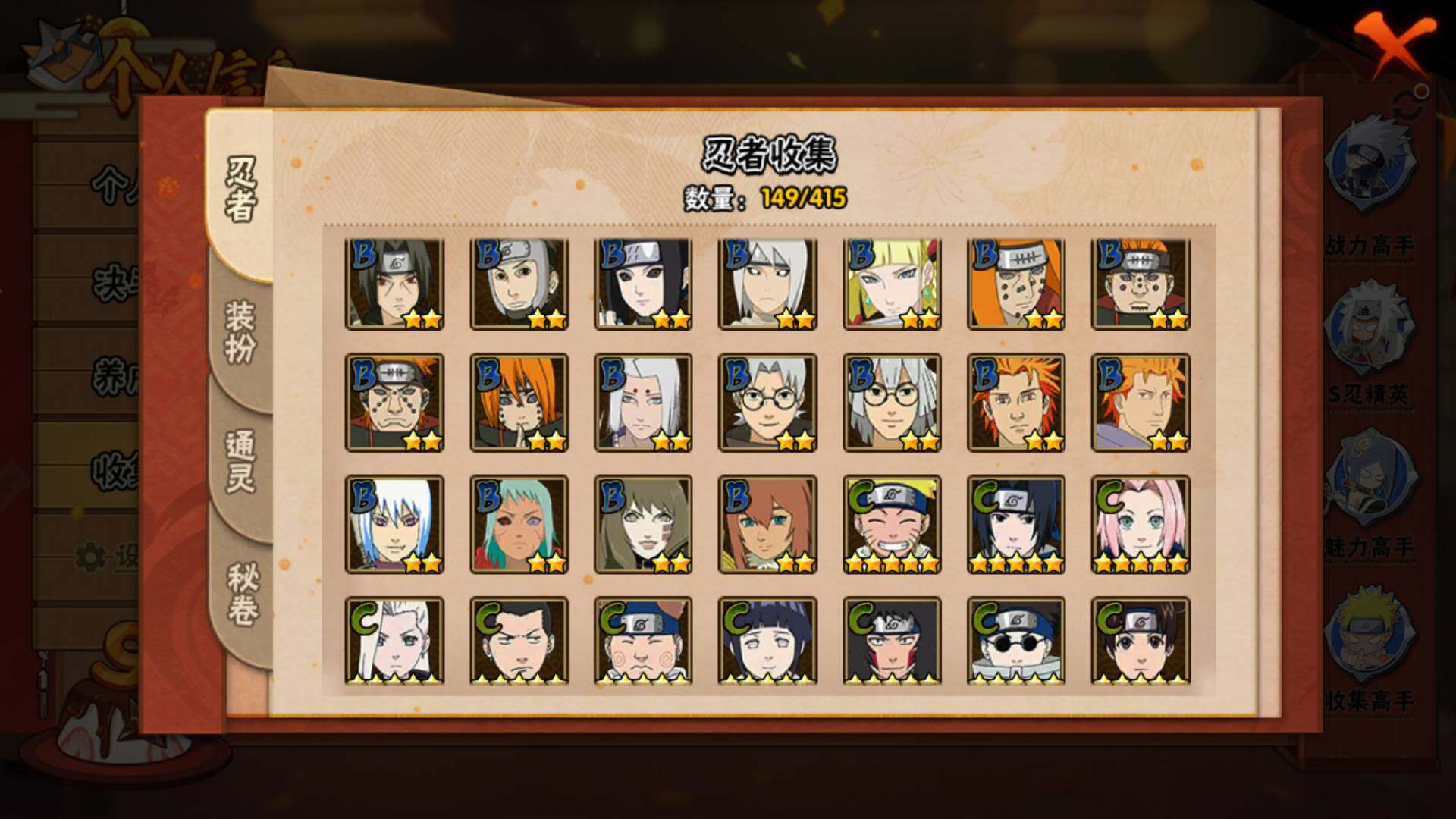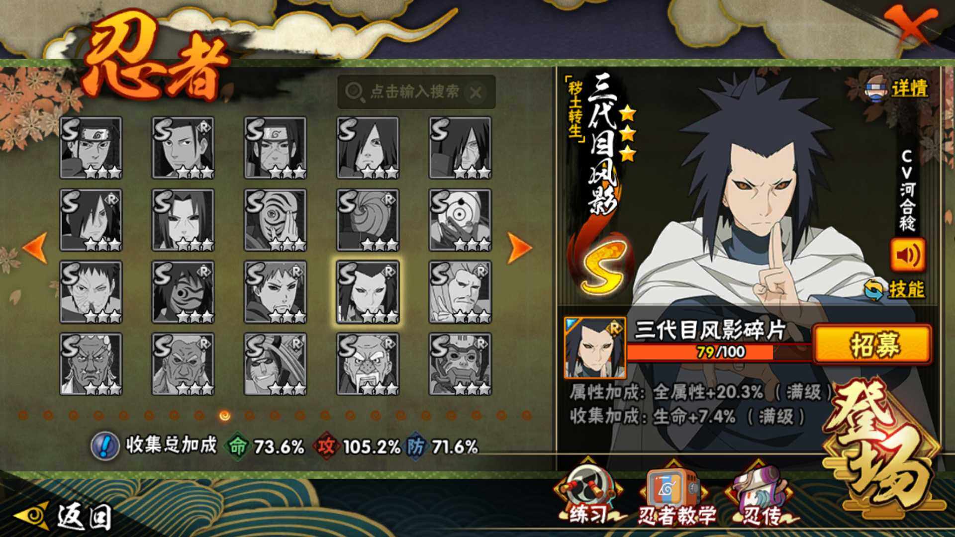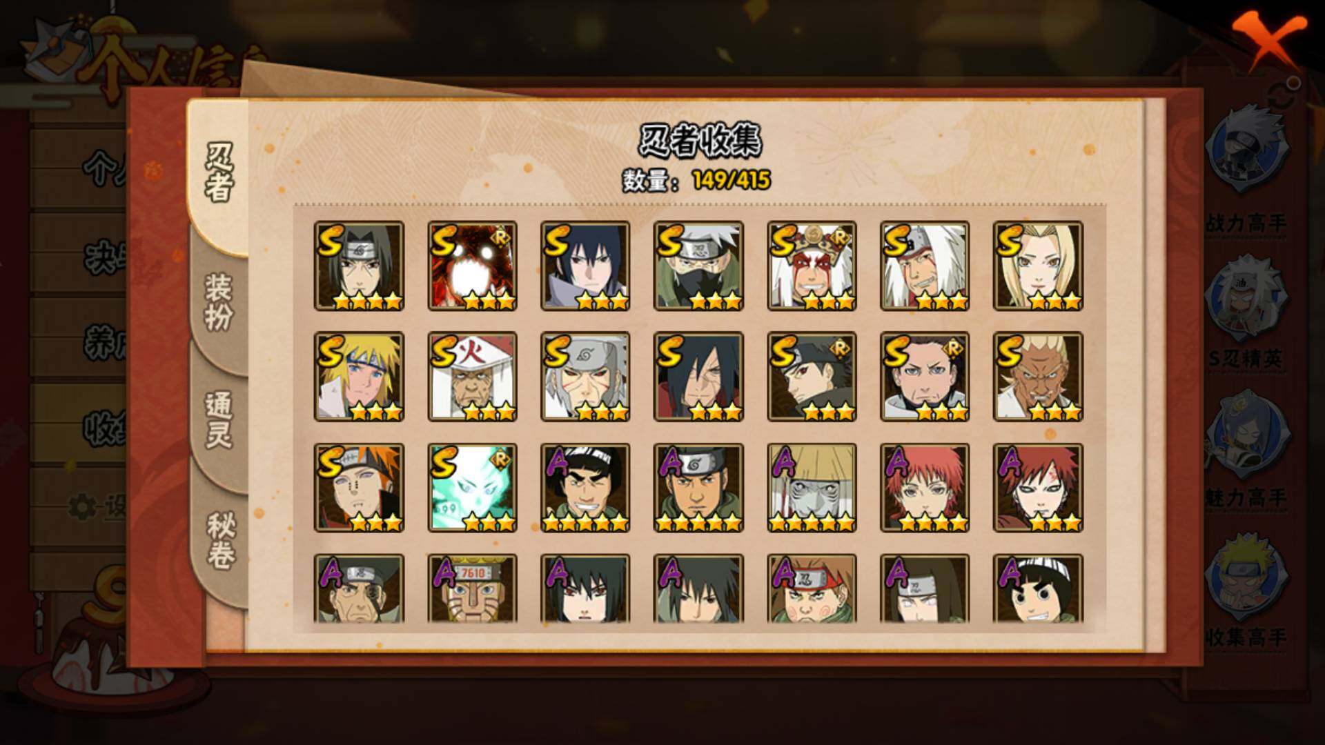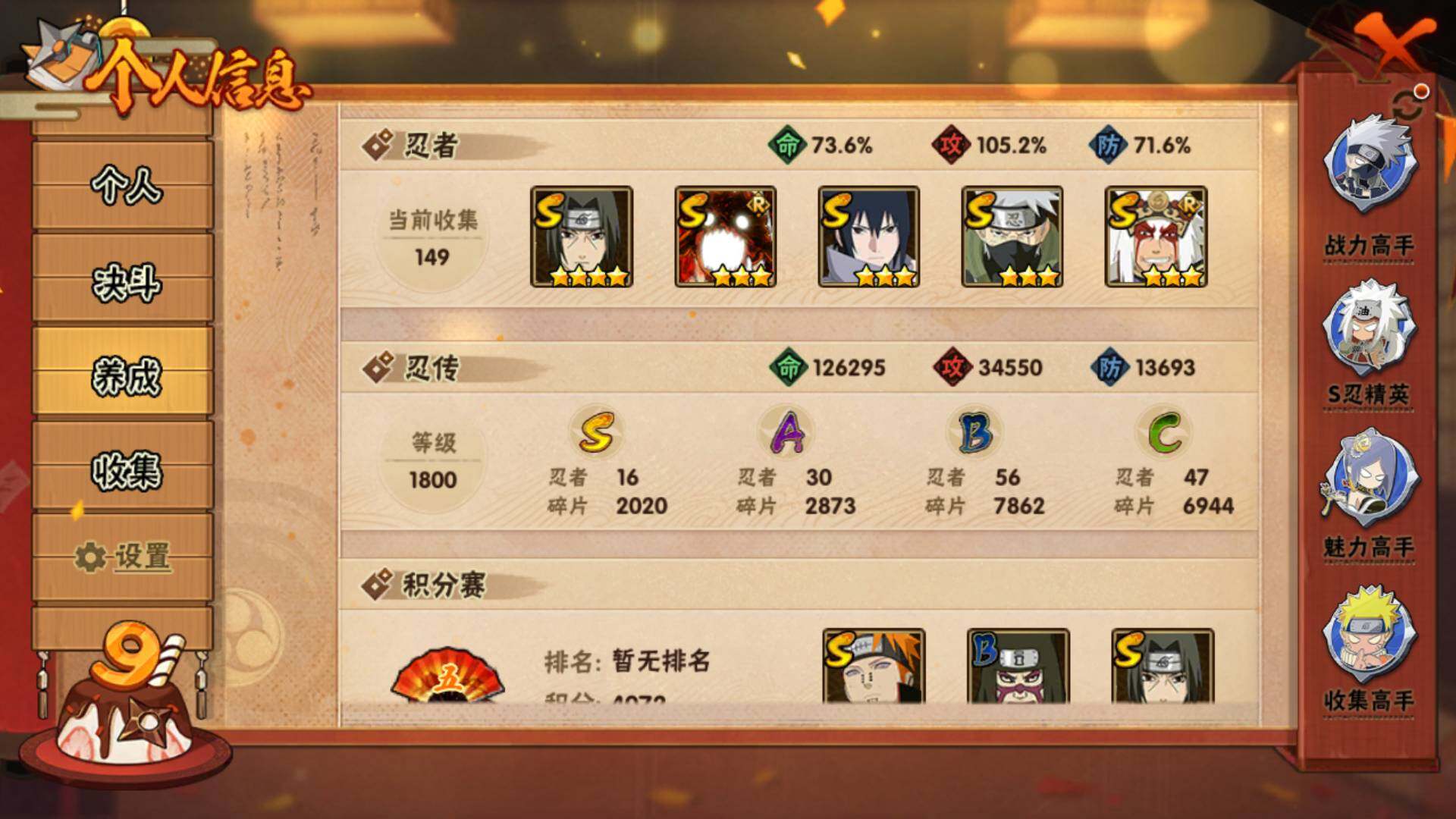 [14681546]v9 1235万战力 16s-30a 三代目风影79片 tt1542 【s级忍者】:千手扉间「秽土转生」3星,宇智波斑「秽土转生·解」3星,艾「忍界大战」3星,宇智波鼬「须佐能乎」4星,宇智波止水「须佐能乎」3星,旗木卡卡西「须佐能乎」3星,烈斗「初代目风影」3星,自来也「舞之豪杰」3星,自来也「传说中的三忍」3星,纲手3星,猿飞日斩3星,波风水门3星,佩恩「天道」3星,宇智波佐助「永恒万花筒」3星,大筒木舍人「最终章」3星,漩涡鸣人「暴怒·第六尾」3星 【a级忍者】:波风水门「青年」2星,迪达拉2星,飞段2星,飞段「死司凭血」2星,干柿鬼鲛5星,漩涡博人「桃式显现」2星,机械鸣人「初始形态」2星,迈特凯5星,旗木卡卡西「幻之真容」2星,桃地再不斩「秽土转生」2星,我爱罗「疾风传」3星,蝎4星,蝎「绯流琥」2星,角都「秽土转生」2星,猿飞阿斯玛5星,猿飞阿斯玛「秽土转生」2星,宇智波鼬2星,宇智波佐助「万花筒写轮眼」2星,日向宁次「忍界大战」2星,日向雏田「最终章」2星,长十郎「六代目水影」2星,李洛克「忍界大战」2星,秋道丁次「忍界大战」2星,千代「近松十人卫」2星,神农「羁绊」2星,土台「忍界大战」3星,不缘2星,宇智波泉奈2星,不动2星,迈特凯「青春爆炸」2星