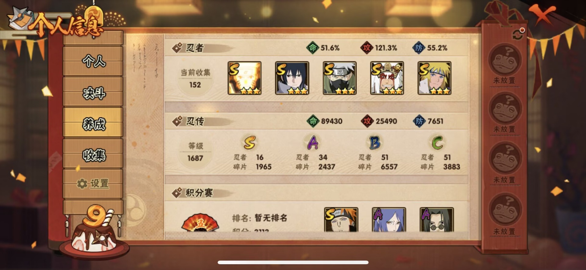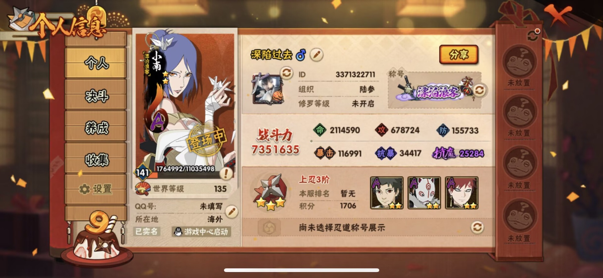 v13 16s忍 34a忍 20通灵 735.1w战力 可二次 可修改实名 【s级忍者】:宇智波止水「须佐能乎」大筒木桃式千手柱间·木叶创立宇智波佐助「永恒万花筒」神秘面具男 「红夜之刃」漩涡鸣人 「九喇嘛连结」宇智波带土 「忍界大战」自来也 「舞之豪杰」旗木卡卡西「须佐能乎」大