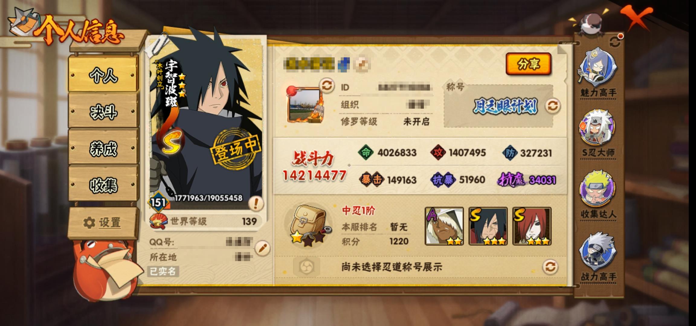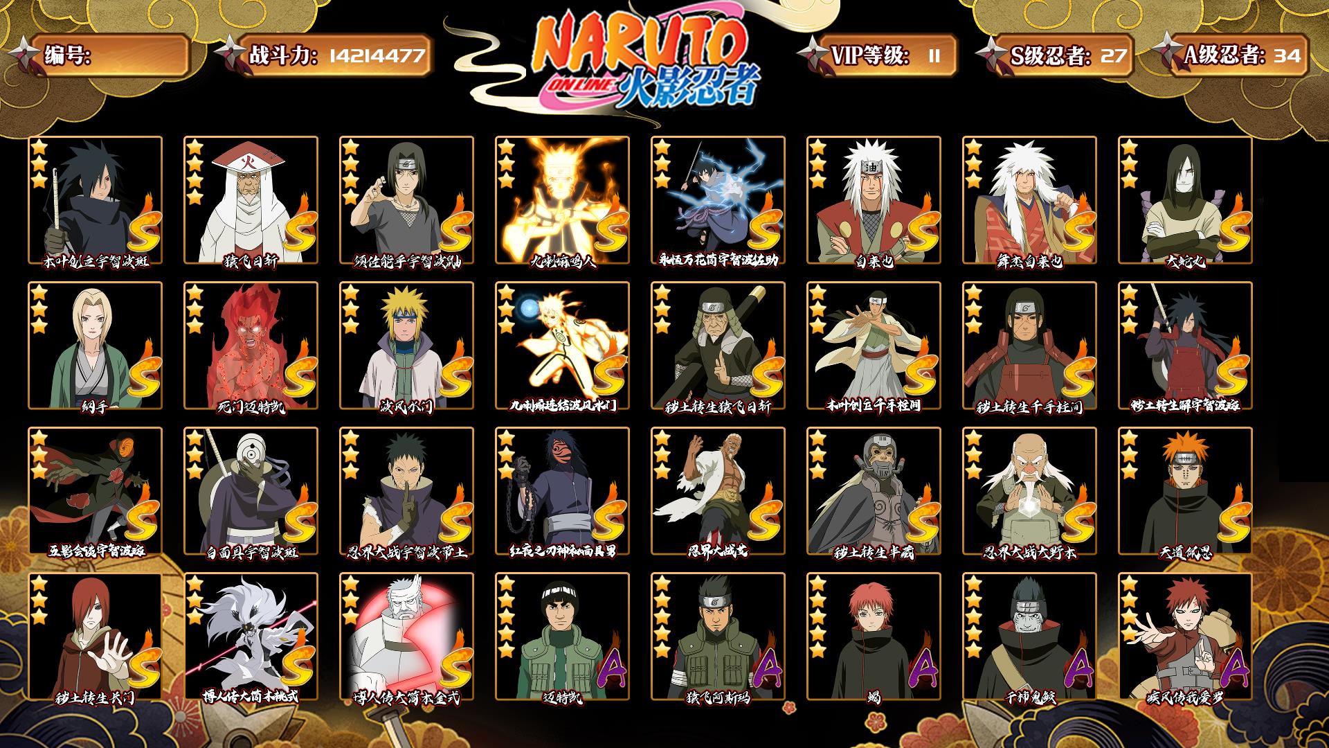 [14686193]0aqs6w 号 vip11,1421w战力,s忍27个,a忍34个,本服排名92,战区排名未上榜,通灵兽319个,6时装,中忍1阶,忍者星数516
