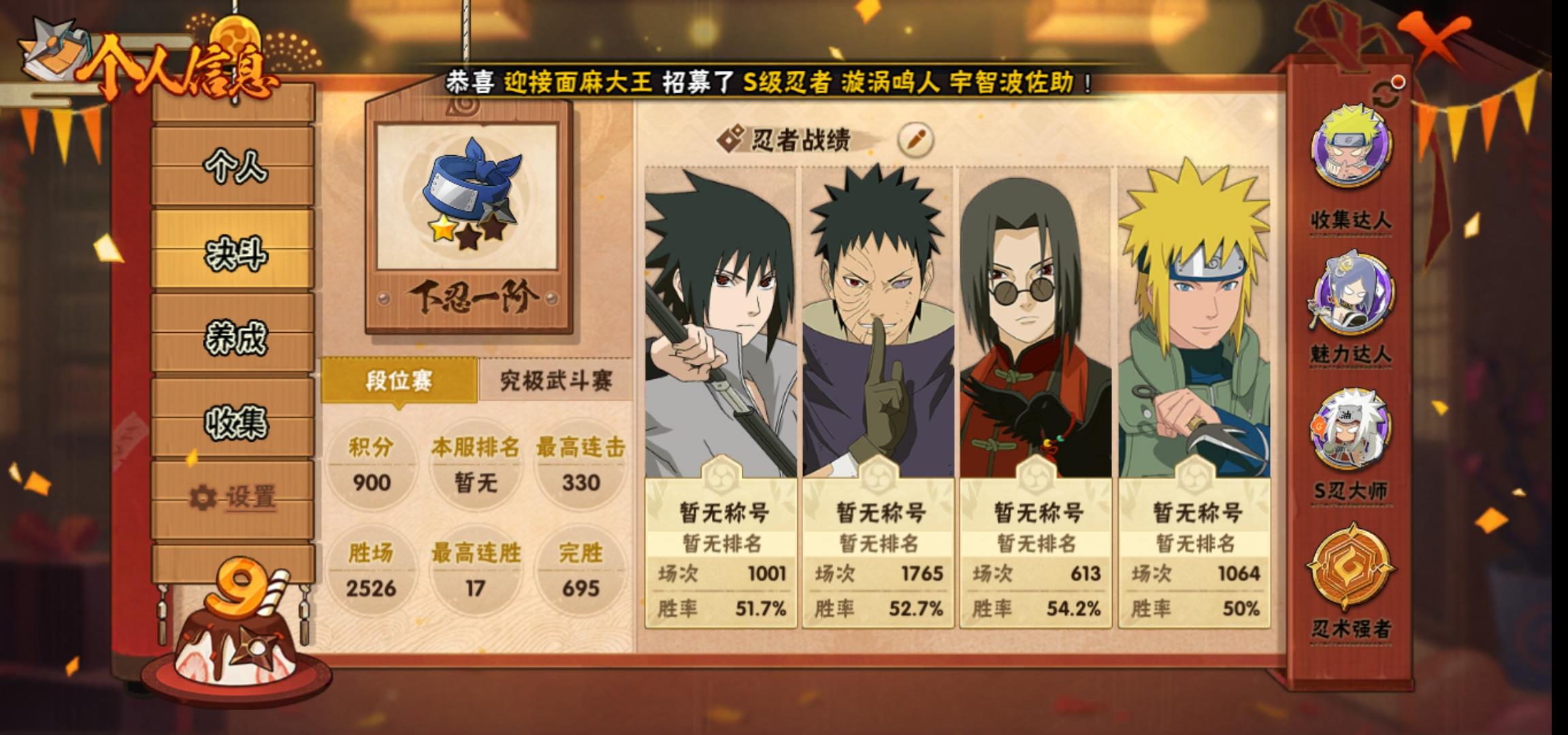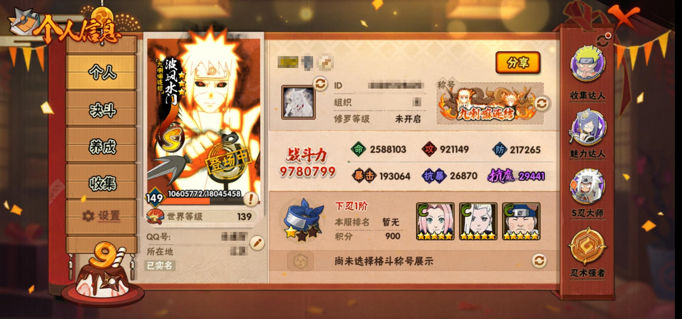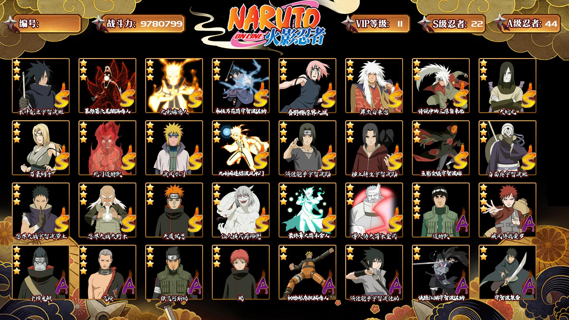 [14686198]0aqs74 号 vip11,978w战力,s忍22个,a忍44个,本服排名406,战区排名未上榜,通灵兽320个,7时装,下忍1阶,忍者星数471
